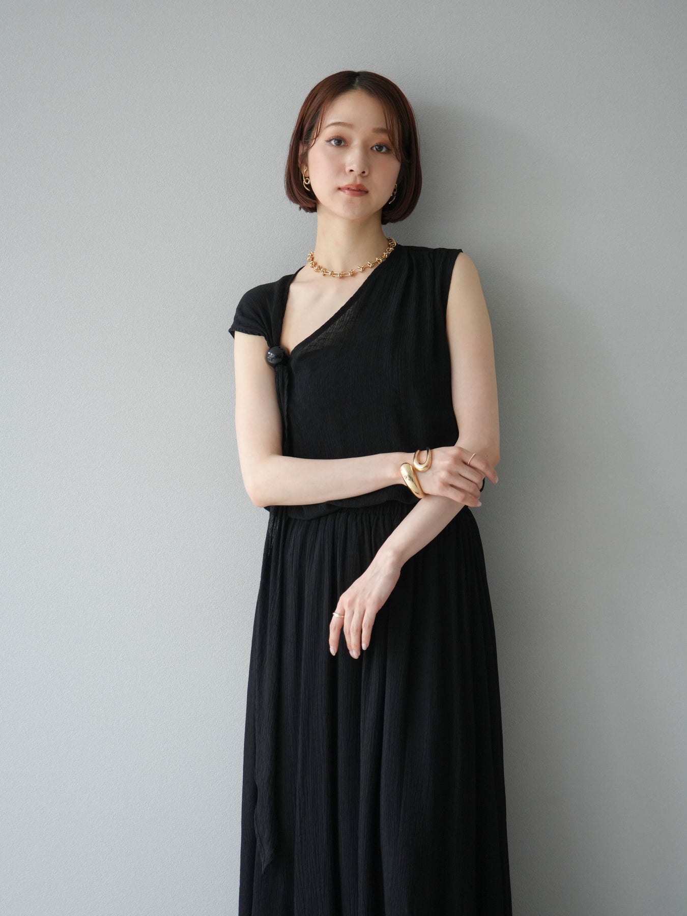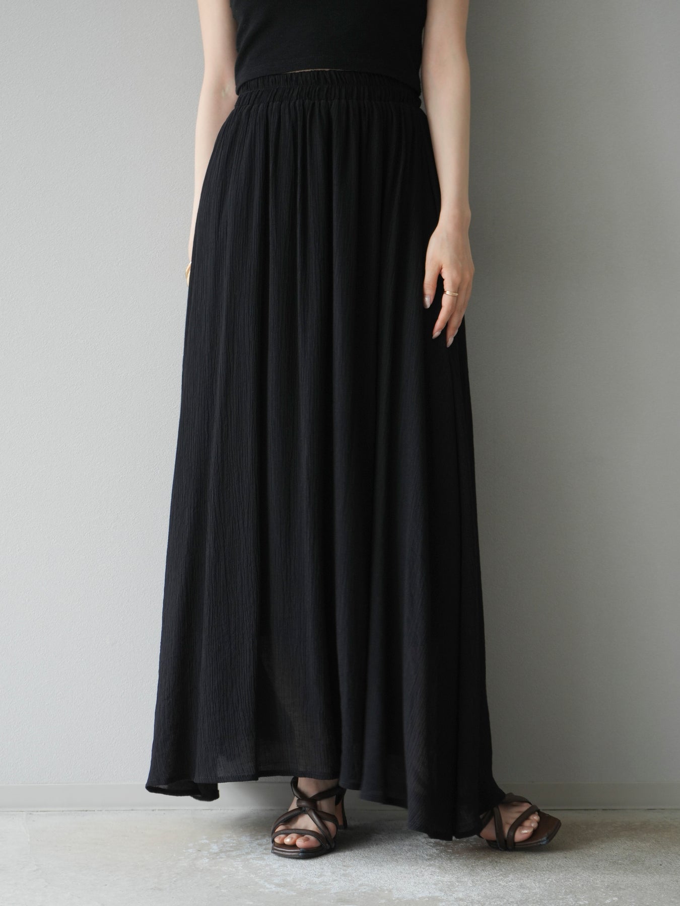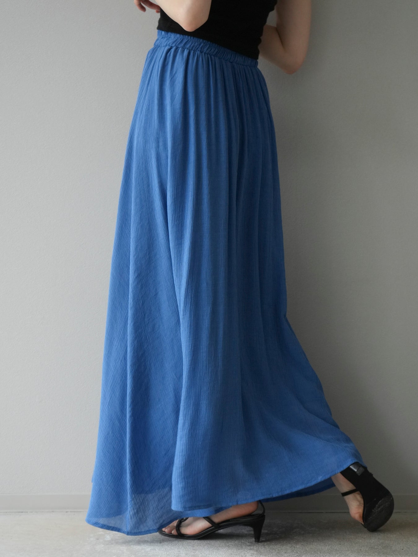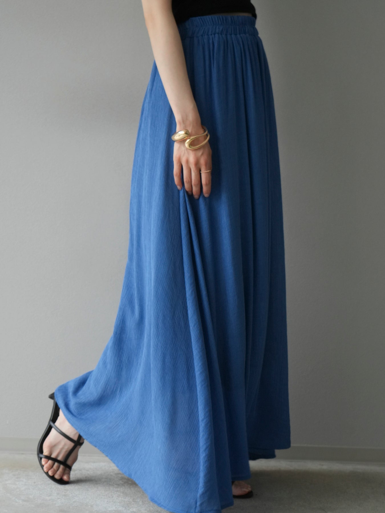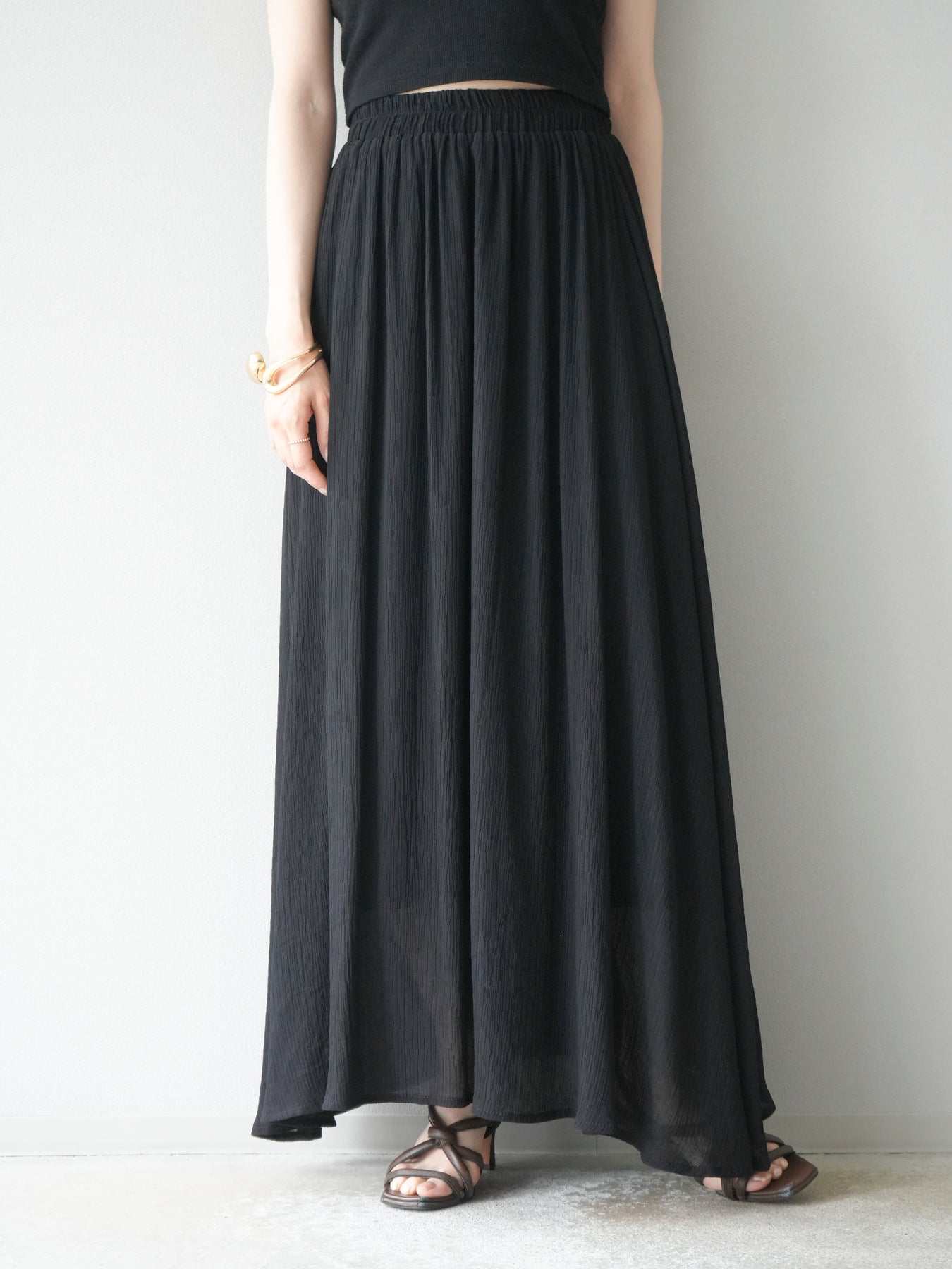 涼しげな楊柳素材を使用した、ビーズモチーフ付きアシンメトリーブラウスとフレアスカートのセットアップ。ブラウスは片側に寄せたドレープとビーズディテールがアクセントになり、1枚で立体感と動きを演出します。 スカートはウエストゴム仕様のストレスフリーな穿き心地で、揺れ感のあるフレアシルエットが女性らしさを引き立てます。軽やかな素材感が夏のムードにぴったりで、セットでも単品でも着回し力の高いアイテムです。 旅行やリゾートはもちろん、デイリーコーデにも映える大人のリラックススタイルに。 ※ボトムス、キャミソール(インナー)以外の商品は一律でインナーは付属していません。