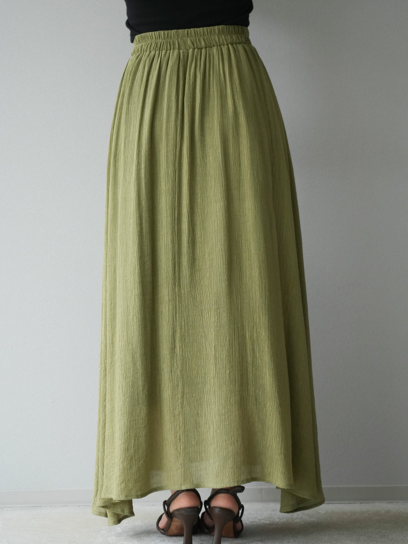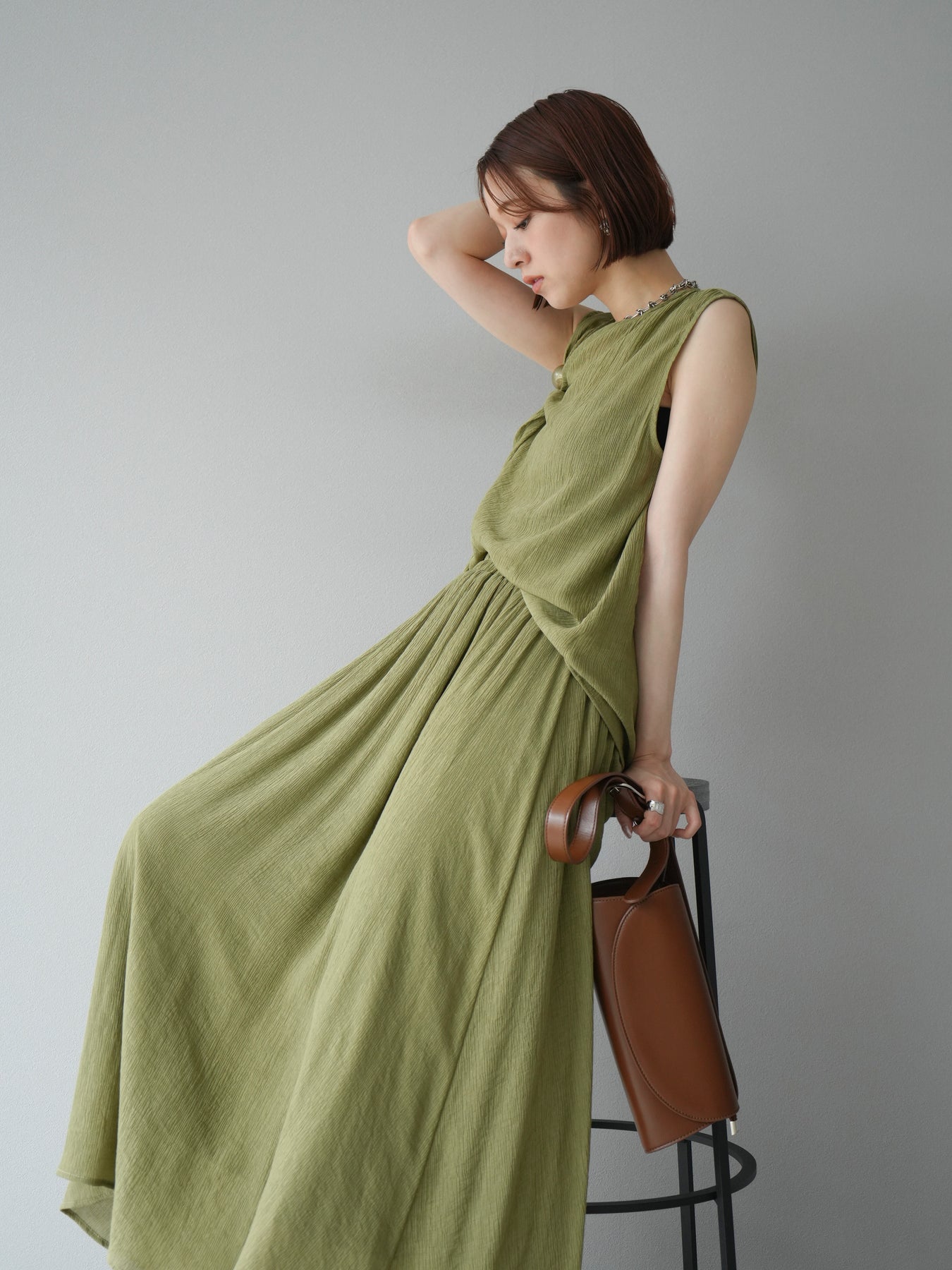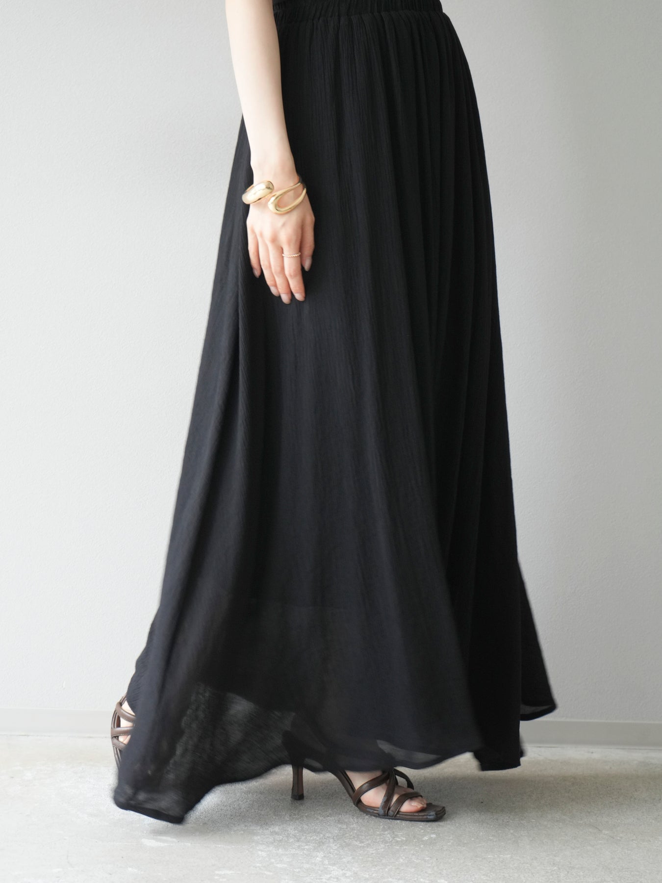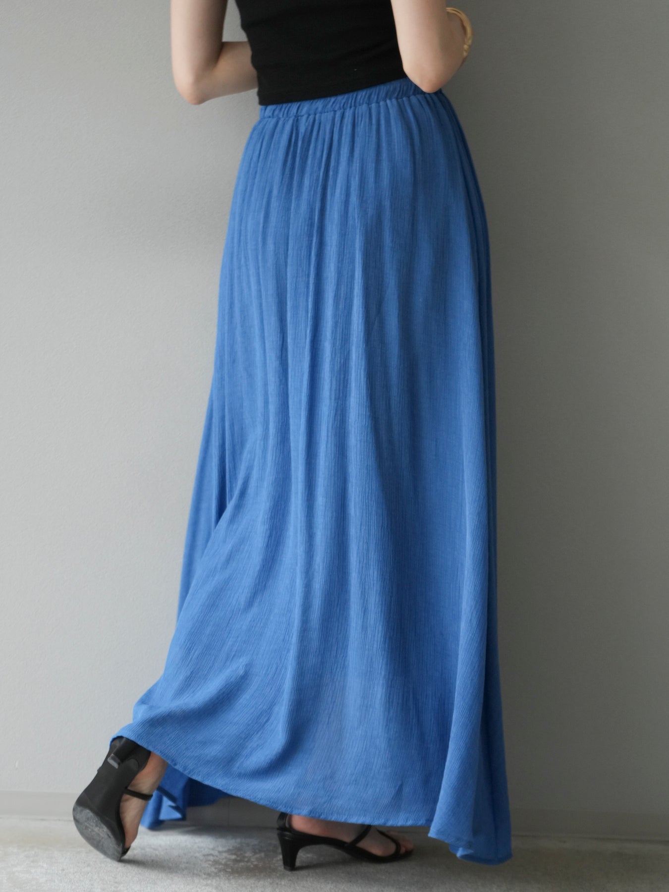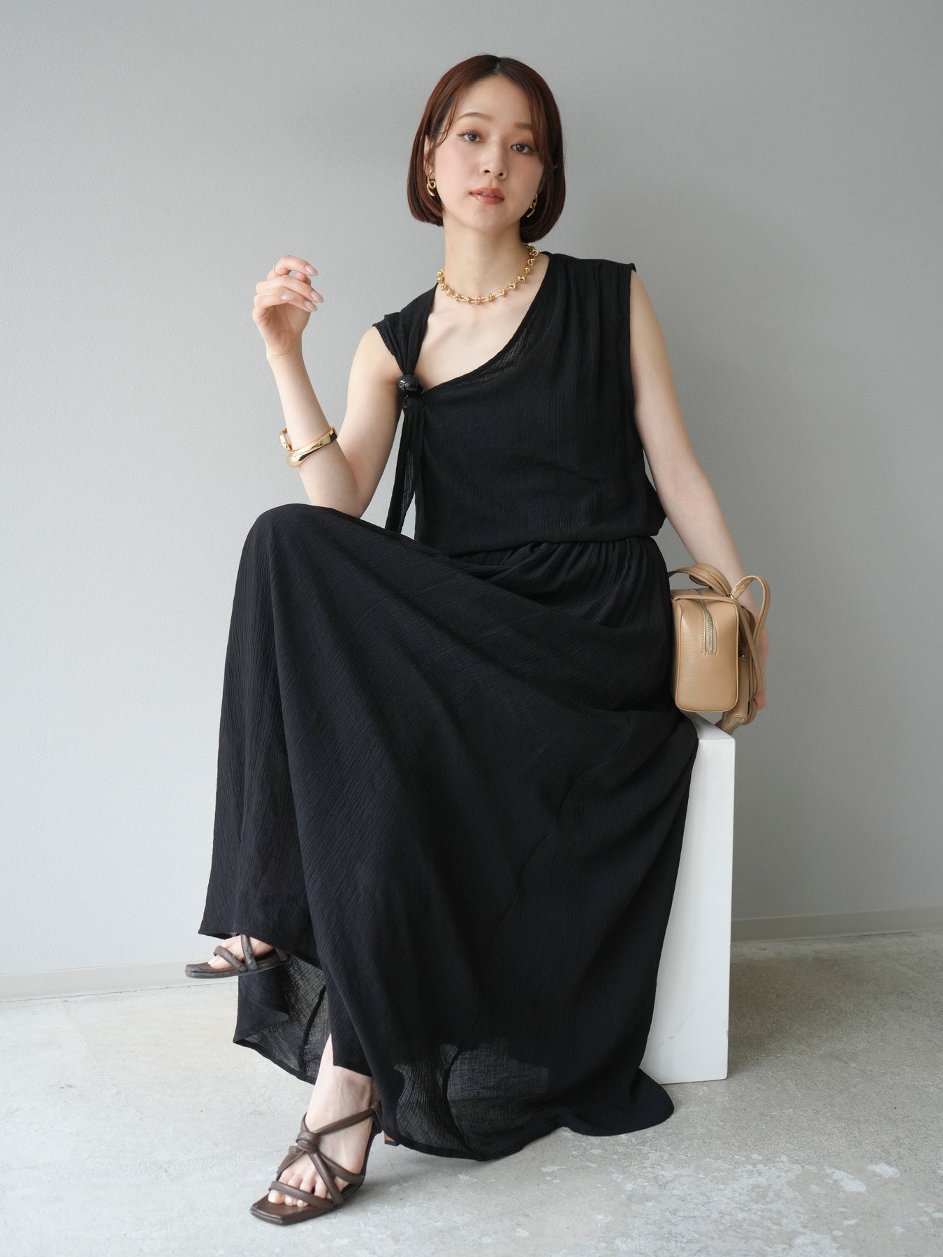 涼しげな楊柳素材を使用した、ビーズモチーフ付きアシンメトリーブラウスとフレアスカートのセットアップ。ブラウスは片側に寄せたドレープとビーズディテールがアクセントになり、1枚で立体感と動きを演出します。 スカートはウエストゴム仕様のストレスフリーな穿き心地で、揺れ感のあるフレアシルエットが女性らしさを引き立てます。軽やかな素材感が夏のムードにぴったりで、セットでも単品でも着回し力の高いアイテムです。 旅行やリゾートはもちろん、デイリーコーデにも映える大人のリラックススタイルに。 ※ボトムス、キャミソール(インナー)以外の商品は一律でインナーは付属していません。
