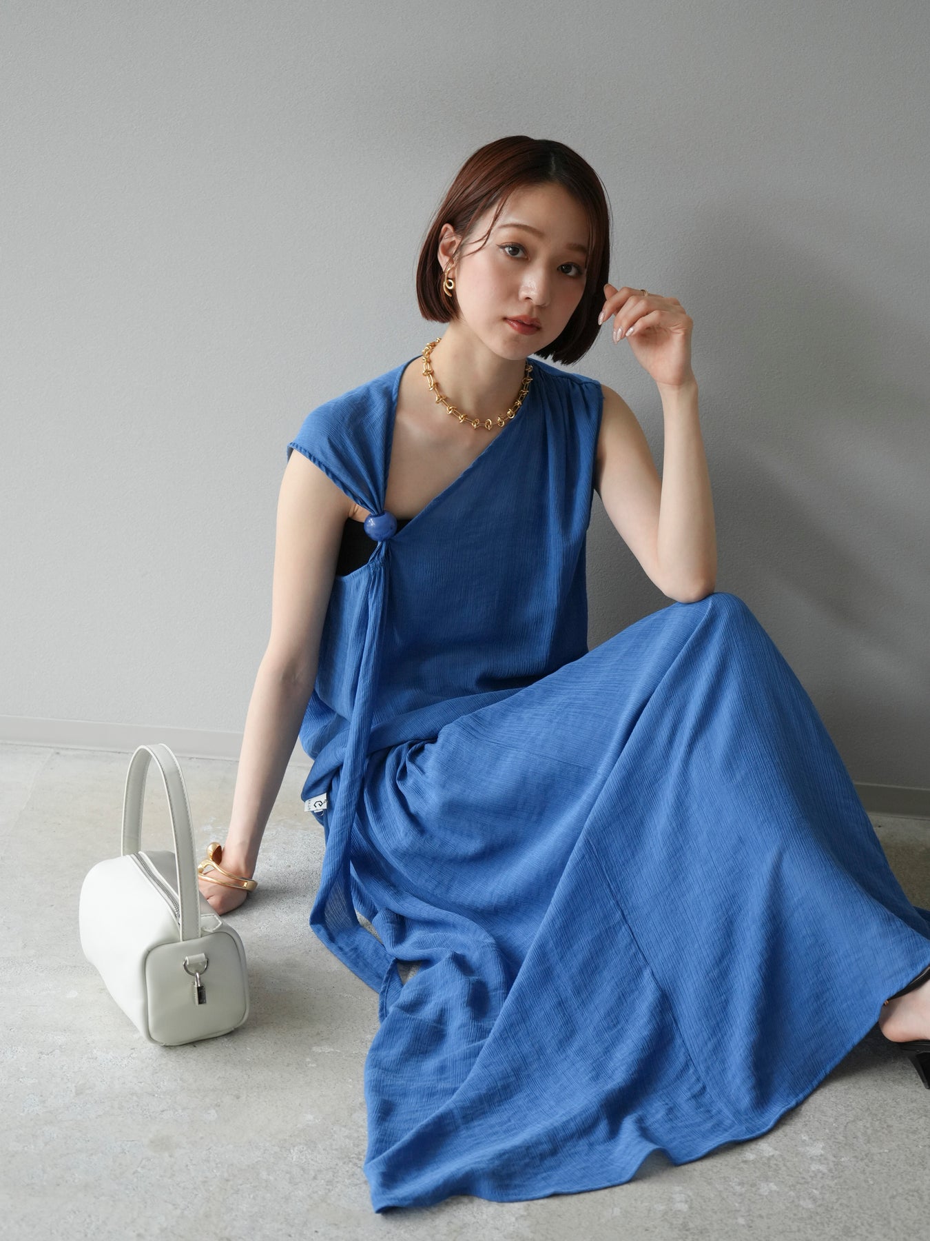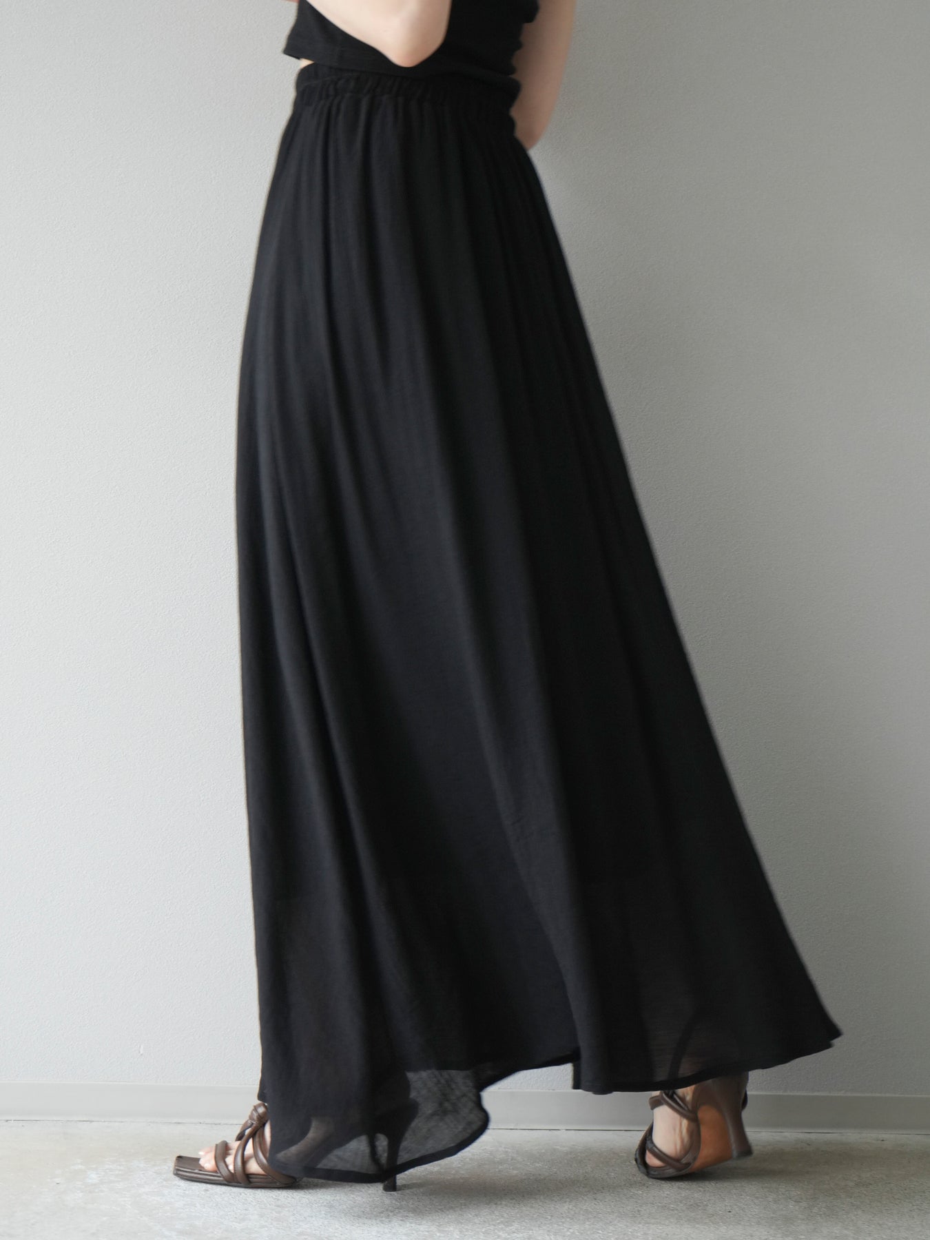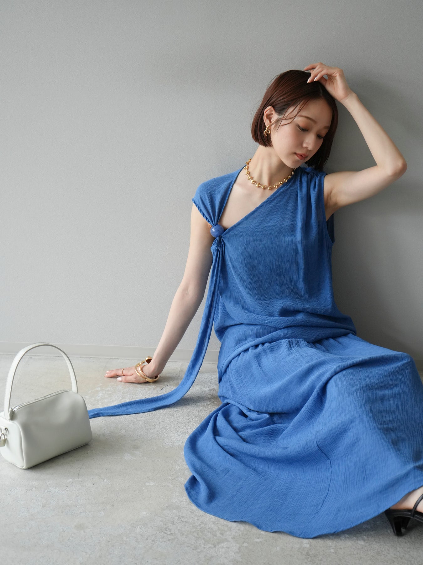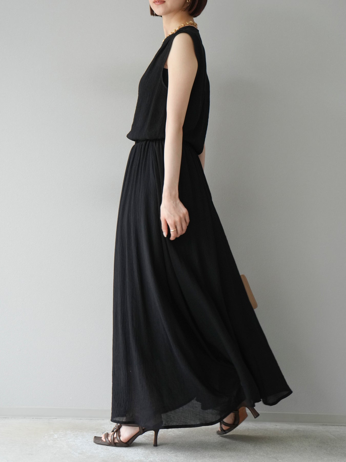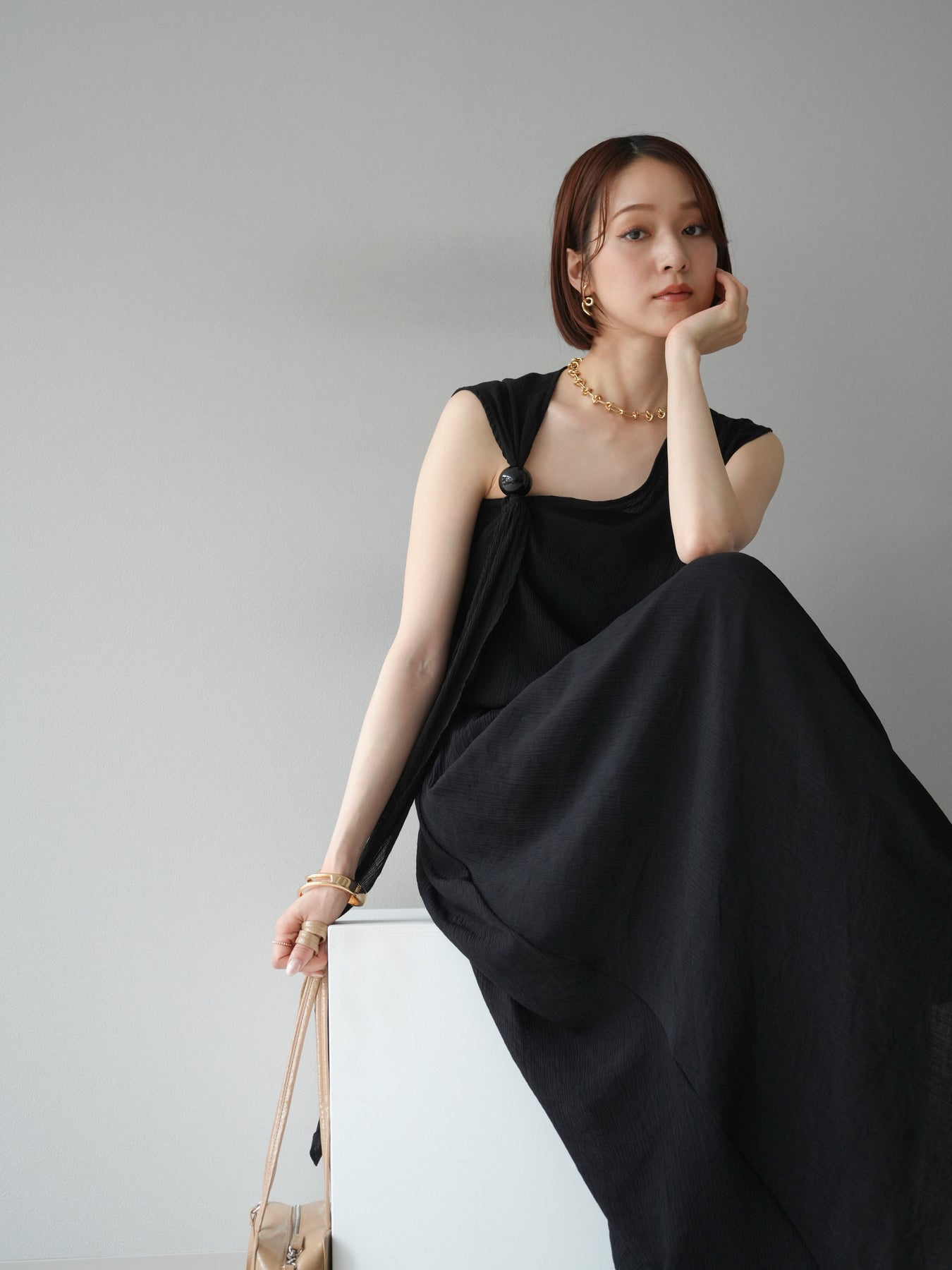 涼しげな楊柳素材を使用した、ビーズモチーフ付きアシンメトリーブラウスとフレアスカートのセットアップ。ブラウスは片側に寄せたドレープとビーズディテールがアクセントになり、1枚で立体感と動きを演出します。 スカートはウエストゴム仕様のストレスフリーな穿き心地で、揺れ感のあるフレアシルエットが女性らしさを引き立てます。軽やかな素材感が夏のムードにぴったりで、セットでも単品でも着回し力の高いアイテムです。 旅行やリゾートはもちろん、デイリーコーデにも映える大人のリラックススタイルに。 ※ボトムス、キャミソール(インナー)以外の商品は一律でインナーは付属していません。
