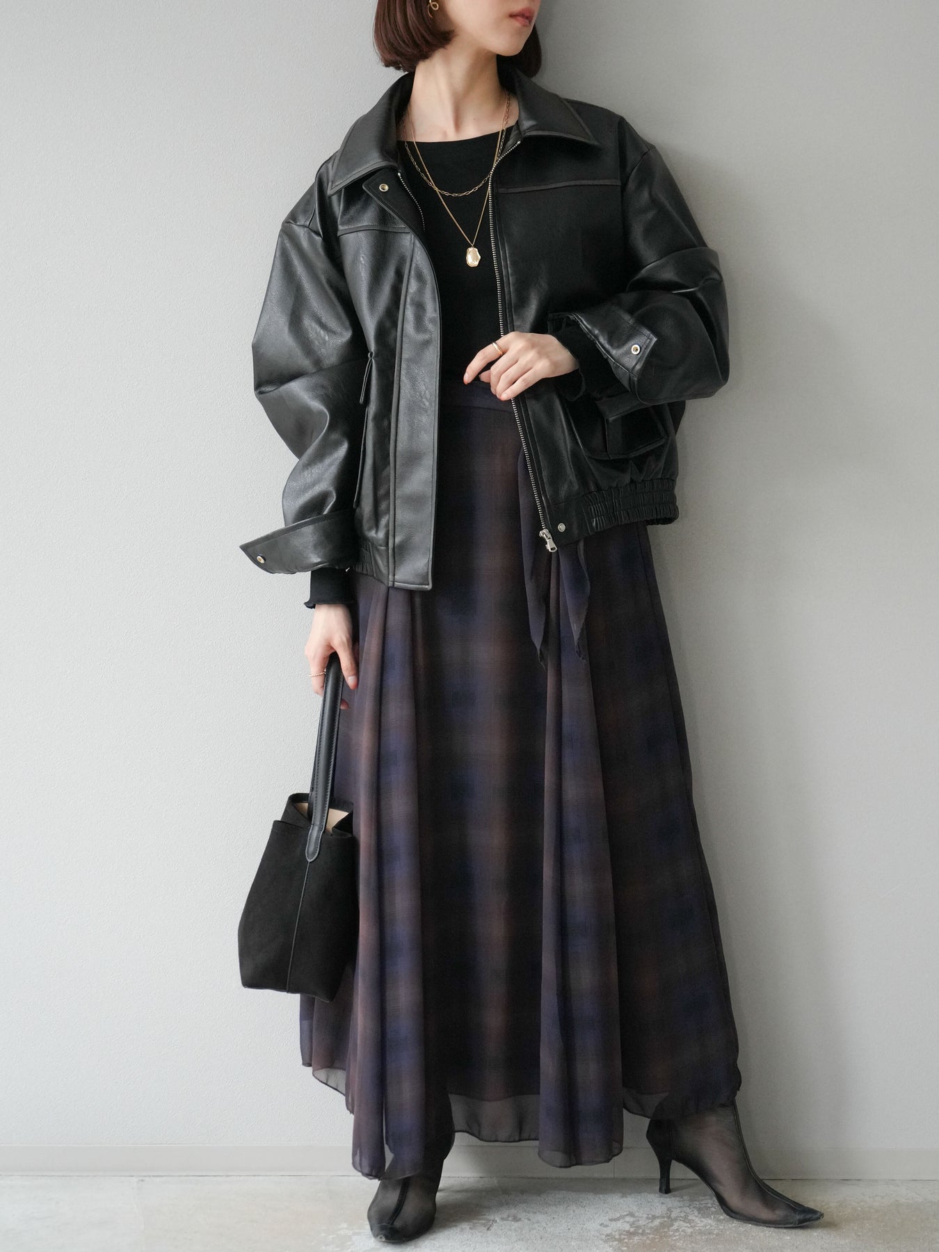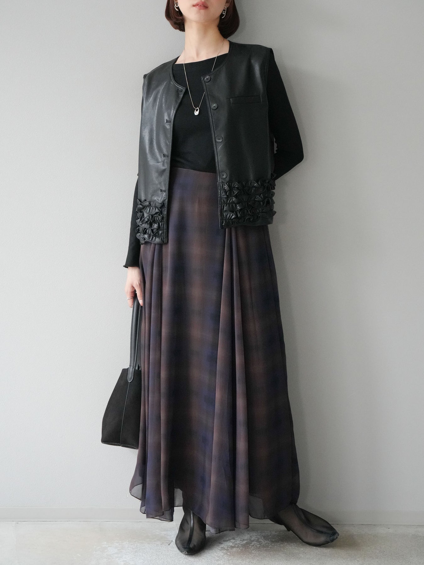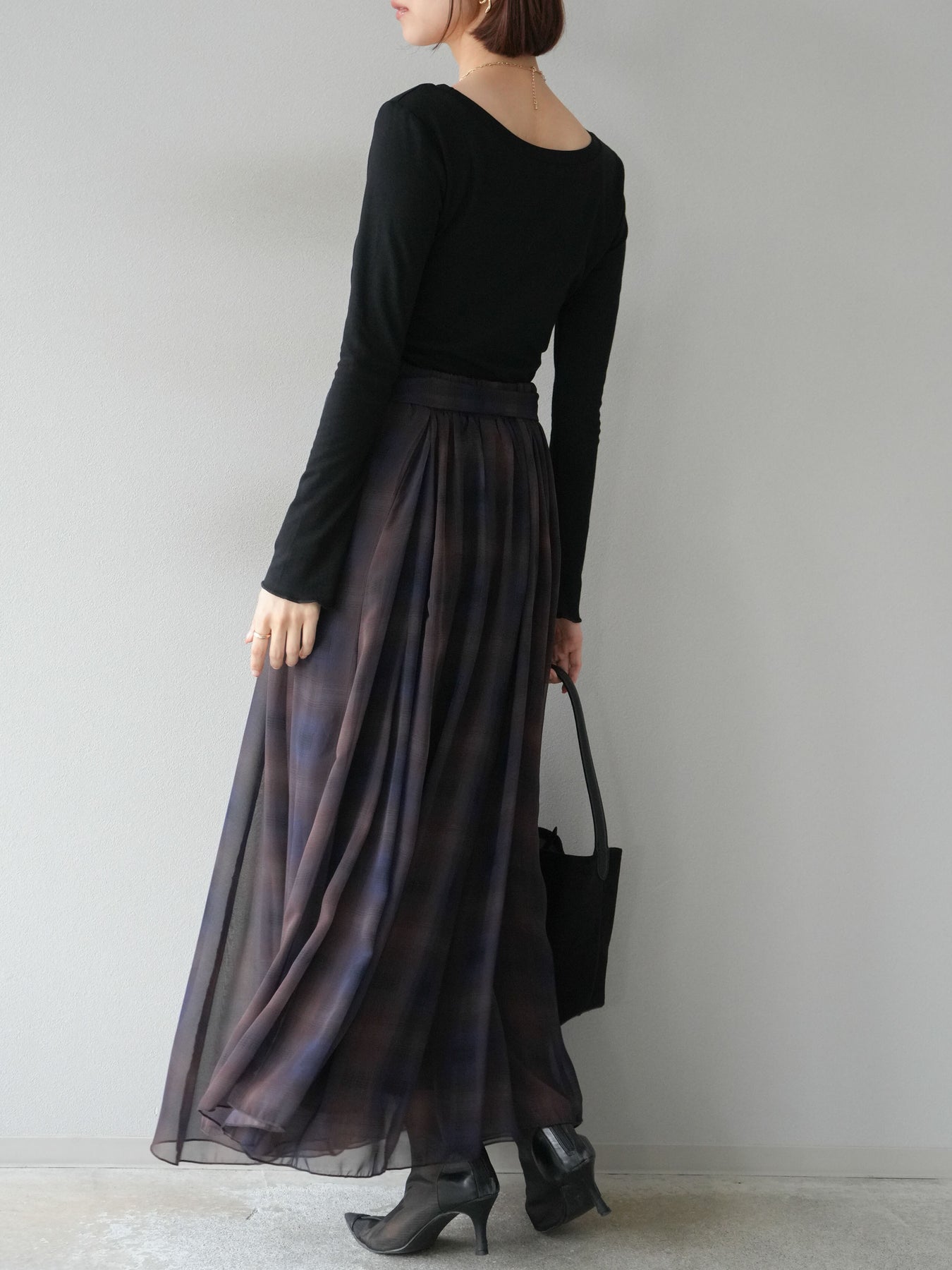 軽やかなシアー素材にチェック柄をのせたフレアタックスカート。歩くたびに揺れる透け感のある生地が女性らしい雰囲気を演出し、上品で華やかな印象に仕上げます。ウエストにはタックを施し、腰回りをすっきりと見せながら自然なフレアシルエットを実現。付属のカットソーを合わせればトータルコーディネートが完成し、セットアップ感覚で着用できるのも嬉しいポイントです。単品でも使いやすく、ニットやシャツと合わせてオンオフ問わず活躍する万能なアイテムです。