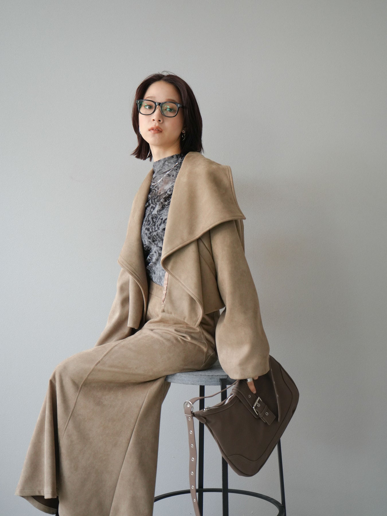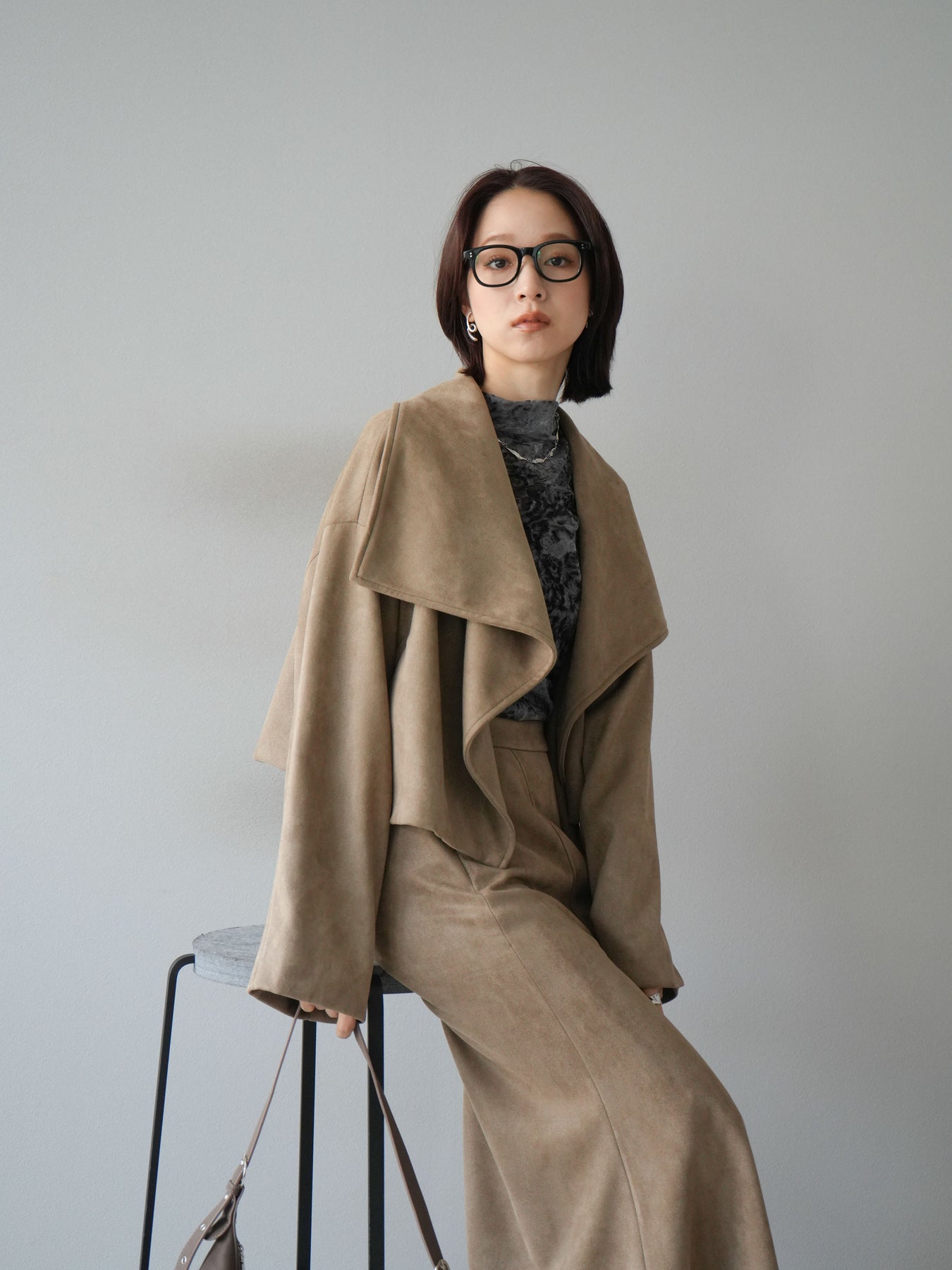 滑らかなスエード調素材で仕立てたショートジャケットとロングスカートのセットアップ。柔らかく上品な質感が女性らしさを引き立て、シーズンムードを高めます。ジャケットは大きめのラペルが印象的で、羽織るだけでこなれた雰囲気に。スカートは美しいフレアシルエットが広がり、動くたびに上品な揺れ感を演出します。セットでの着用はもちろん、単品でもスタイリングの幅が広がる万能アイテムです。 ※ボトムス、キャミソール(インナー)以外の商品は一律でインナーは付属していません。