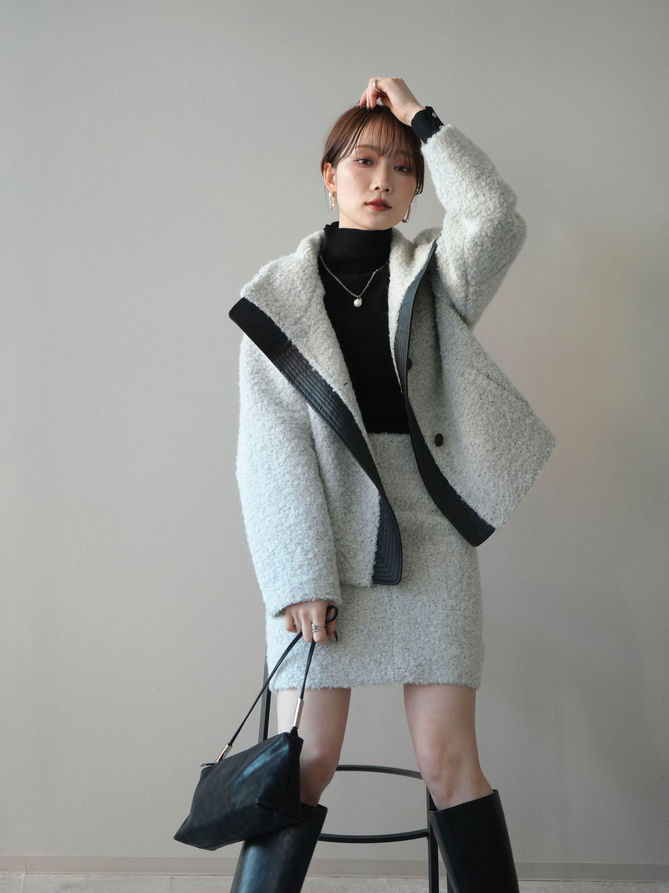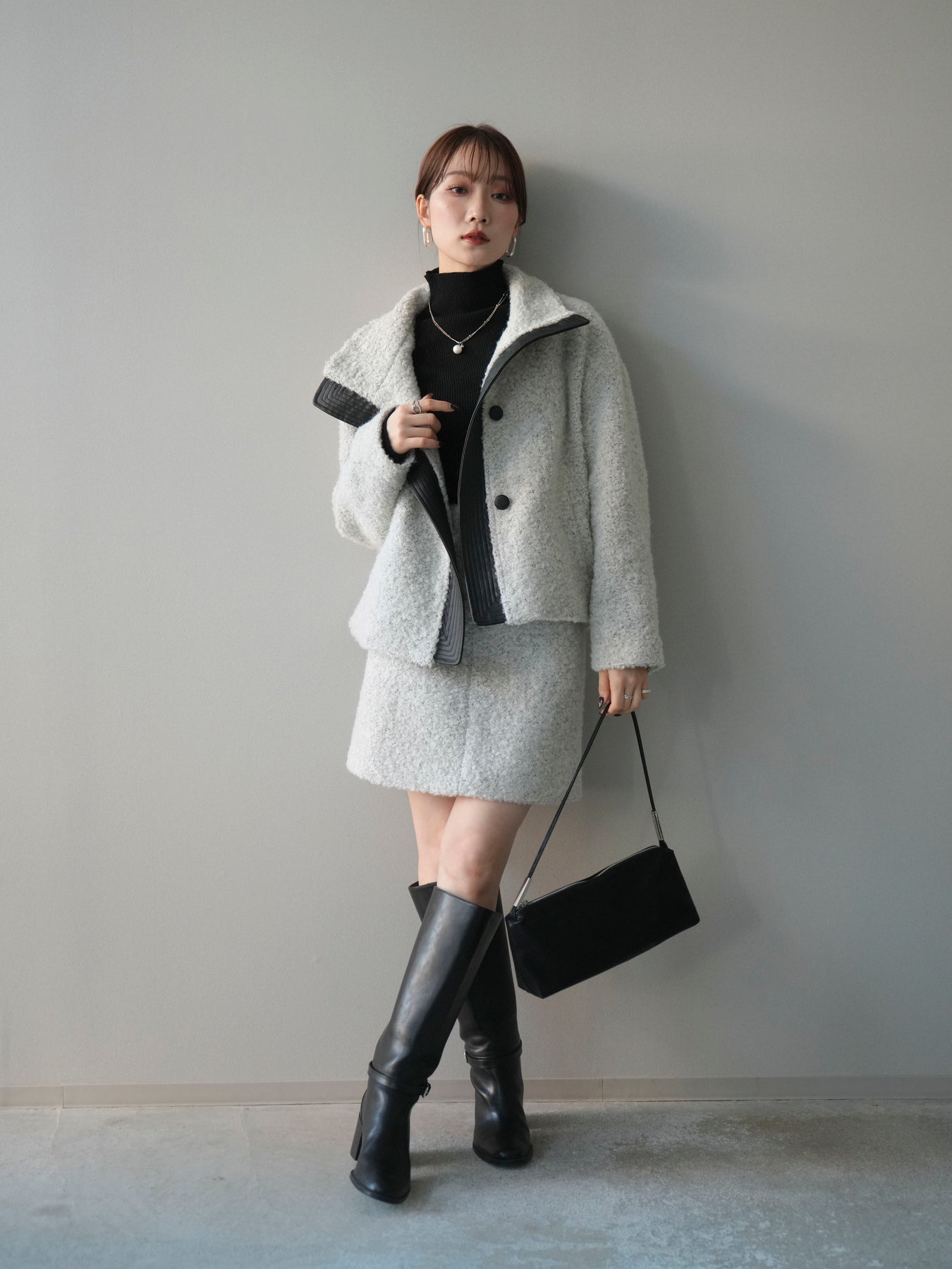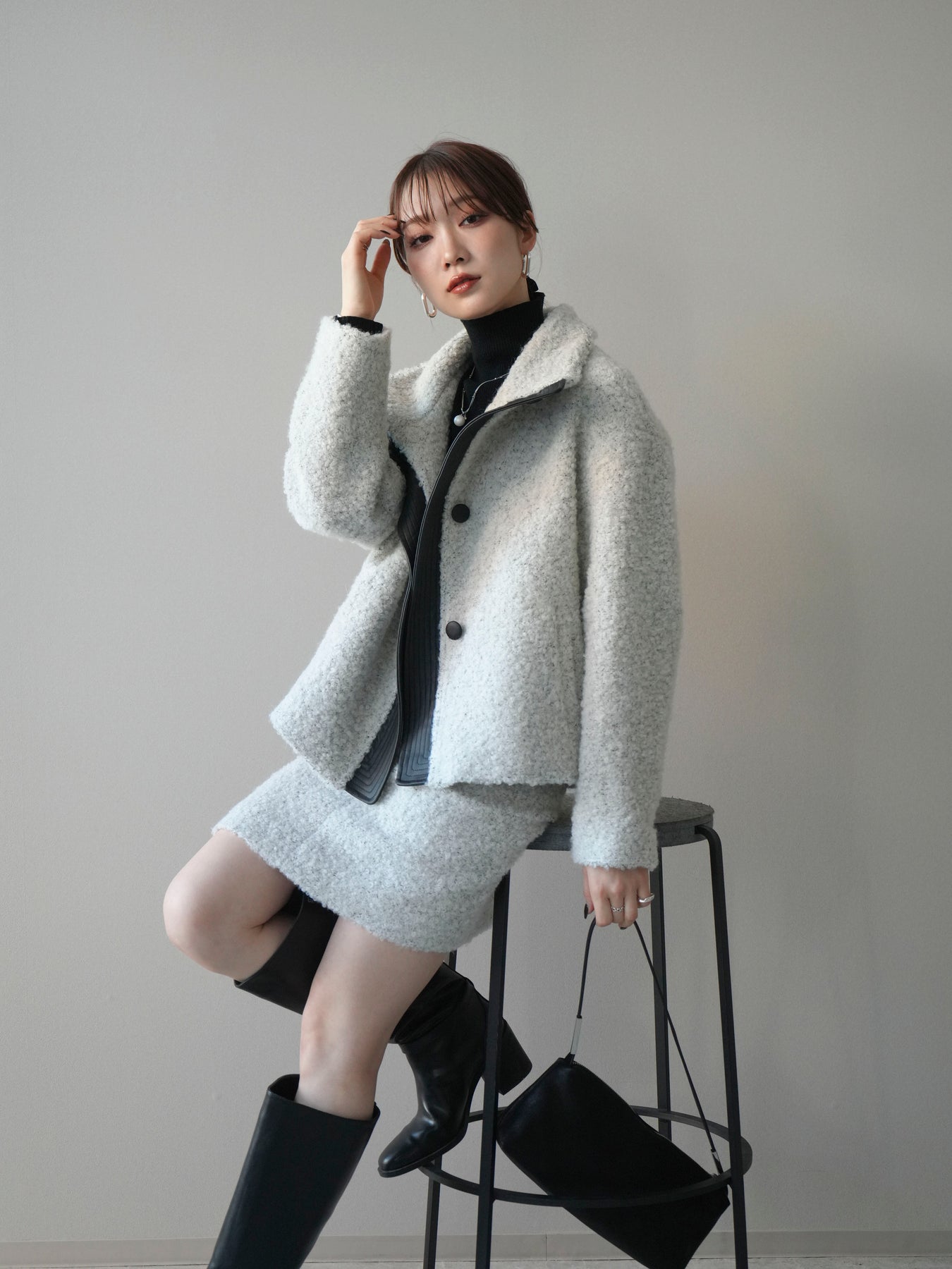 ふんわりとしたブークレ素材で仕立てたミニスカートは、秋冬らしい暖かみと柔らかな印象を演出。シンプルながらも素材の表情が際立ち、コーディネートに季節感をプラスします。すっきりとしたIラインシルエットで美脚効果も◎。同素材のジャケットとのセットアップスタイルもおすすめ。