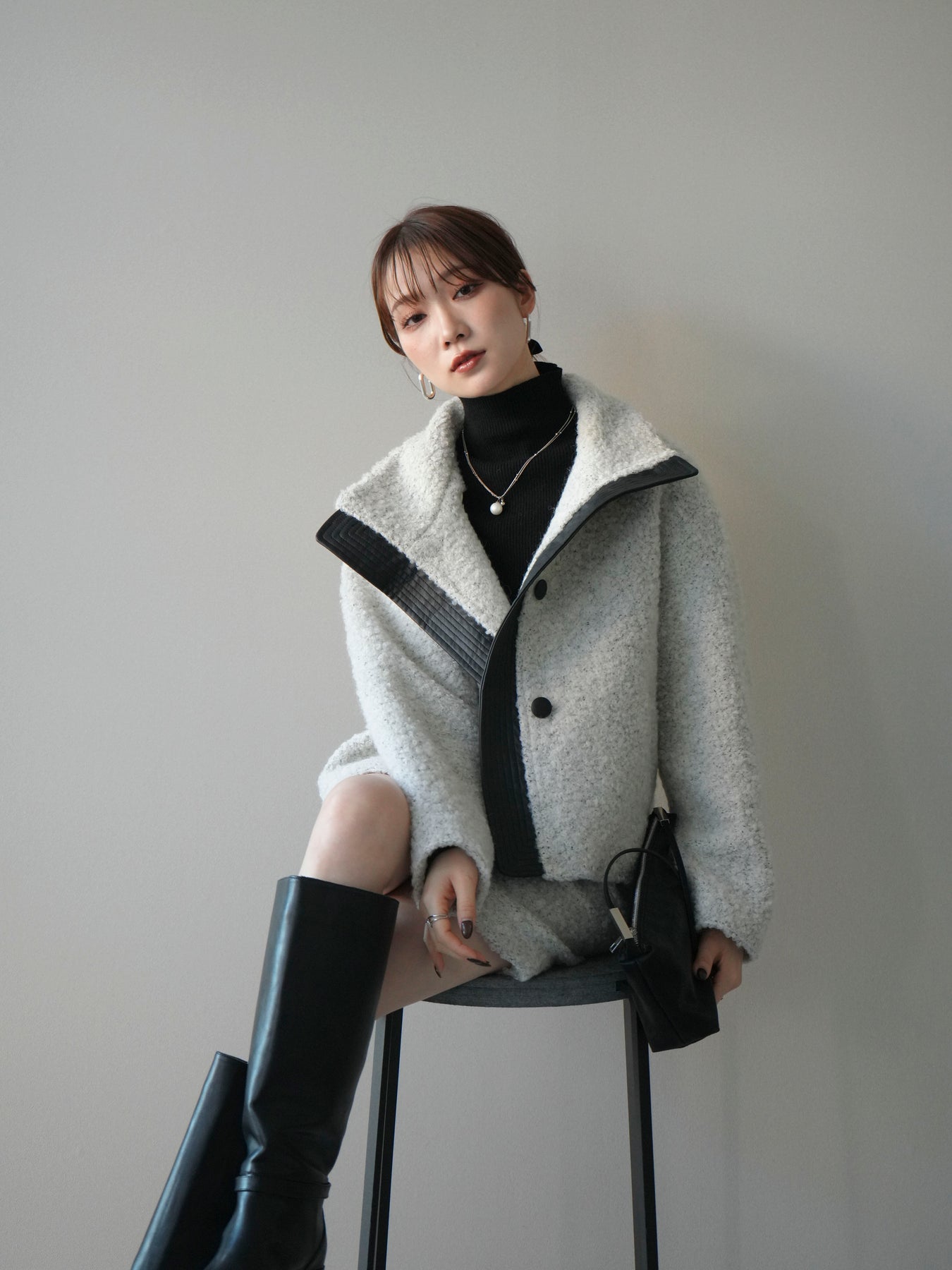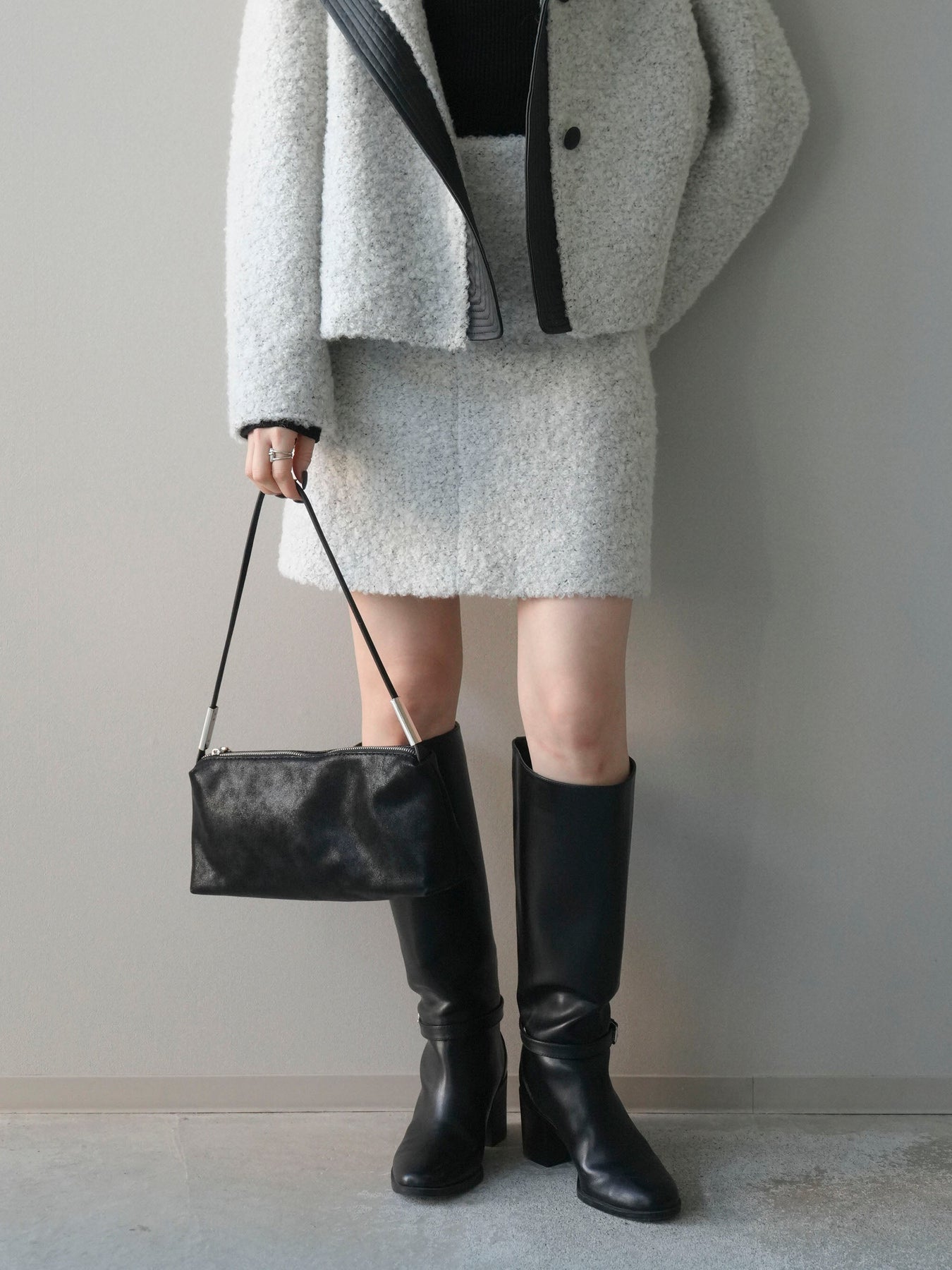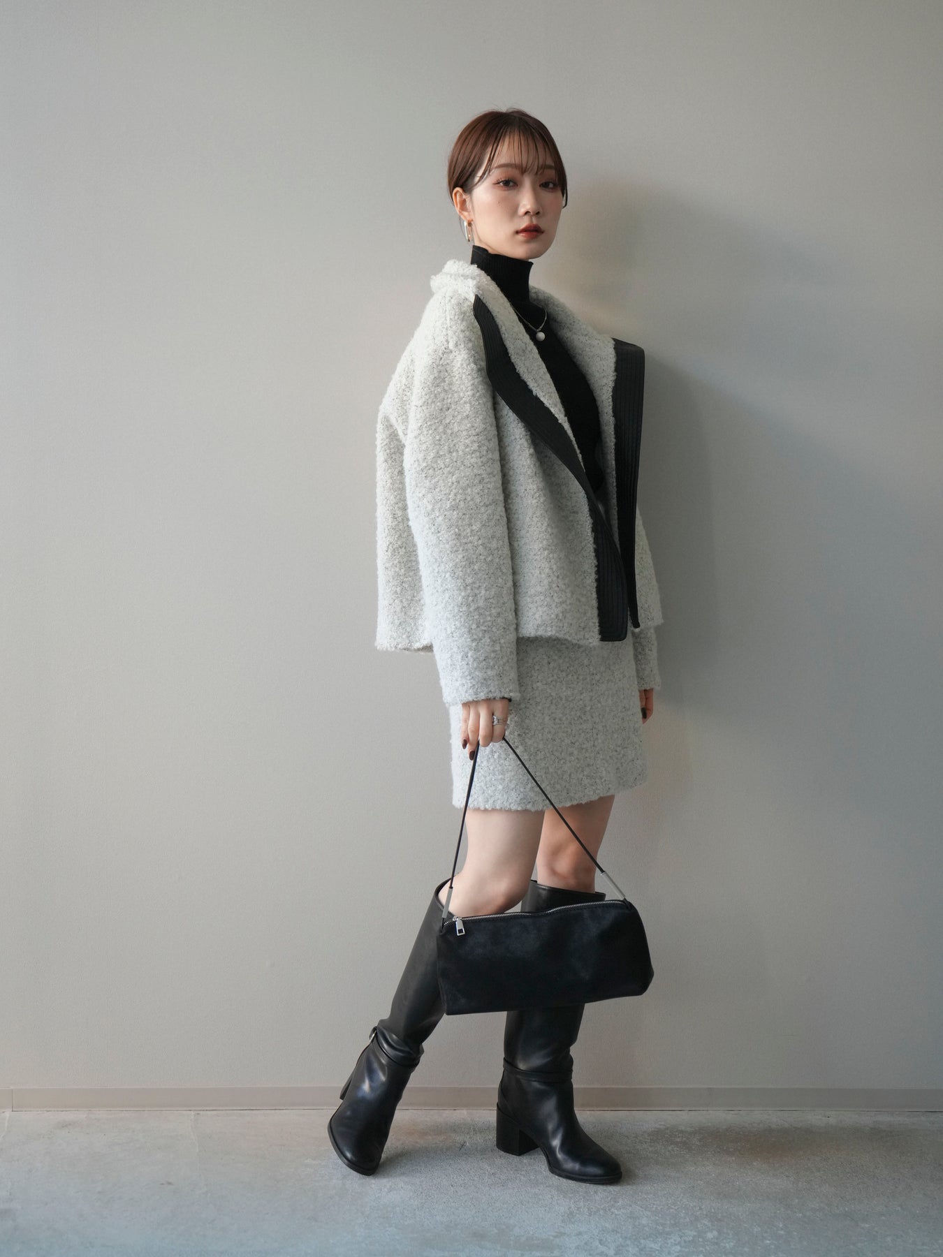 ふんわりとしたブークレ素材で仕立てたミニスカートは、秋冬らしい暖かみと柔らかな印象を演出。シンプルながらも素材の表情が際立ち、コーディネートに季節感をプラスします。すっきりとしたIラインシルエットで美脚効果も◎。同素材のジャケットとのセットアップスタイルもおすすめ。