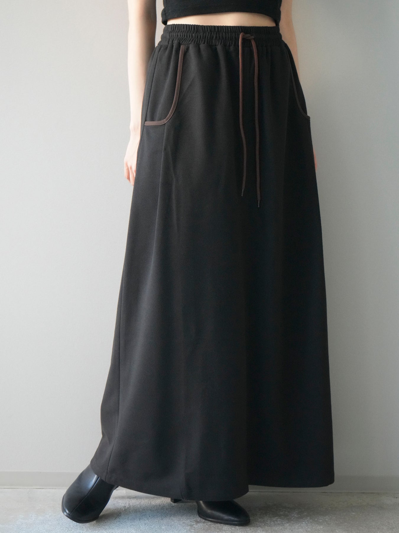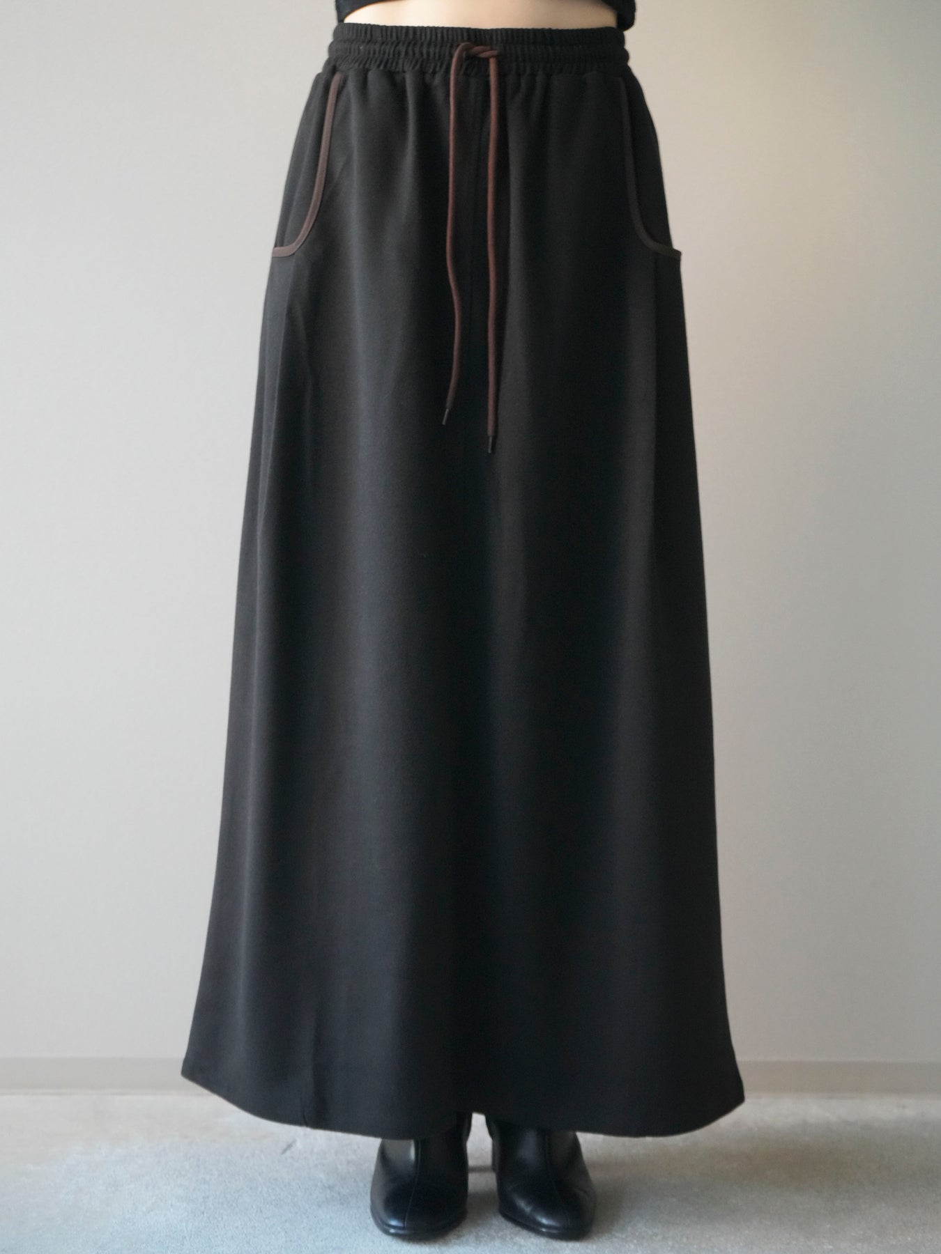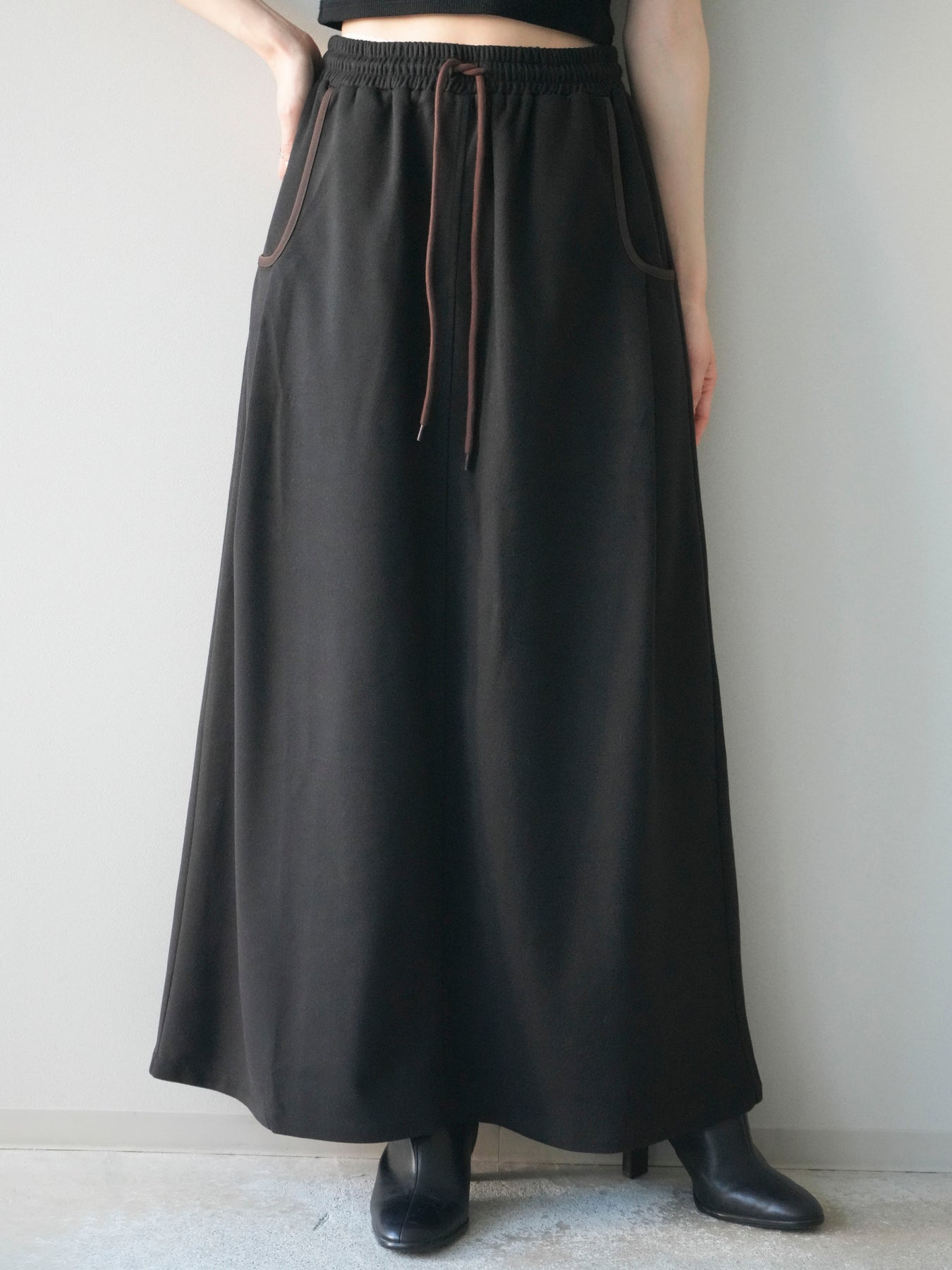 すっきりとしたIラインシルエットに、配色パイピングがアクセントとして映えるスカート。落ち感のある柔らかな素材が体のラインを拾いすぎず、縦のラインを強調することでスタイルアップ効果も期待できます。ウエストは総ゴム×ドローストリング仕様で、快適な穿き心地ときちんと感を両立。カジュアルなトップスと合わせても上品にまとまり、デイリーからお出かけまで幅広いシーンで活躍する万能アイテムです。