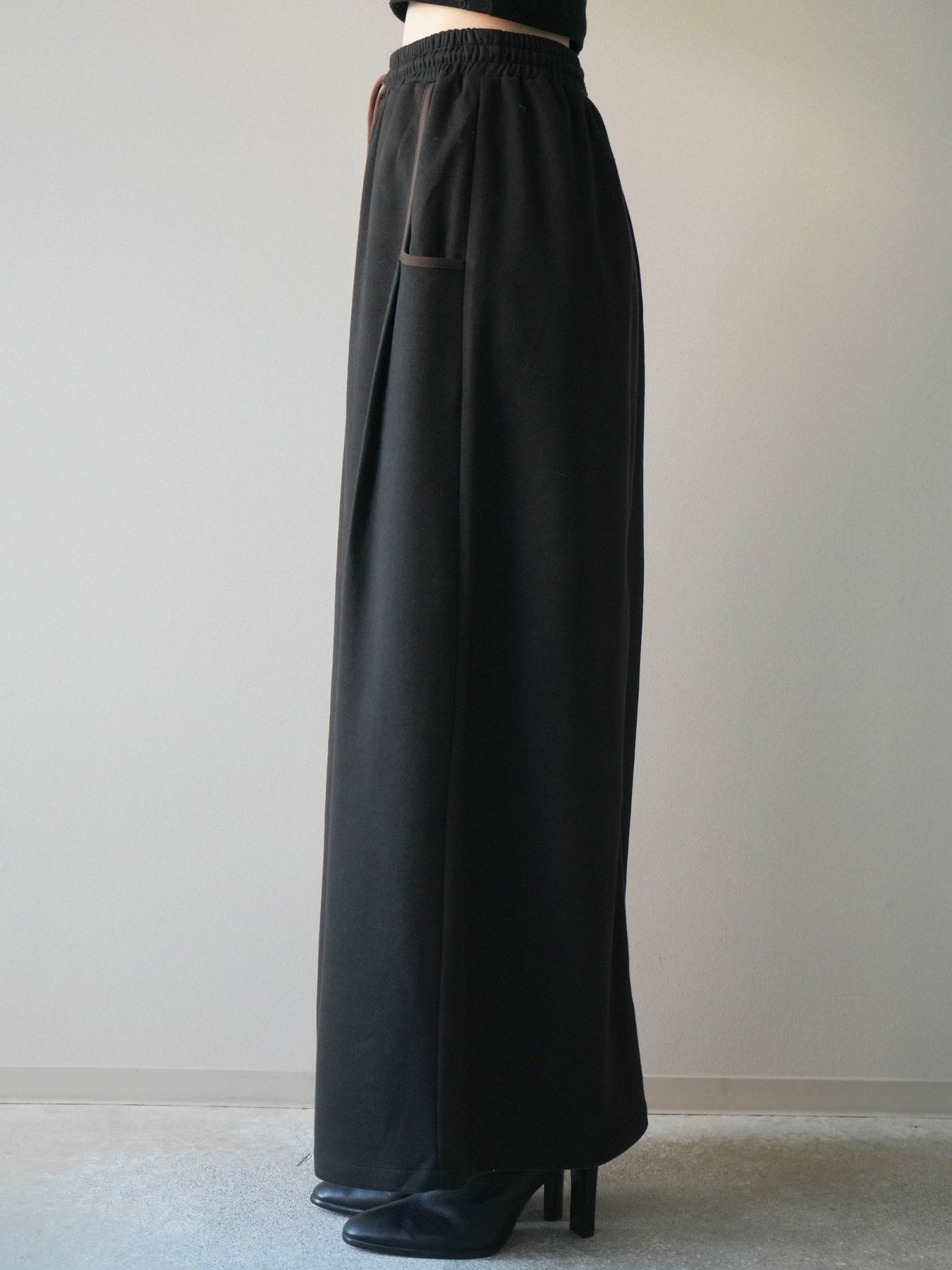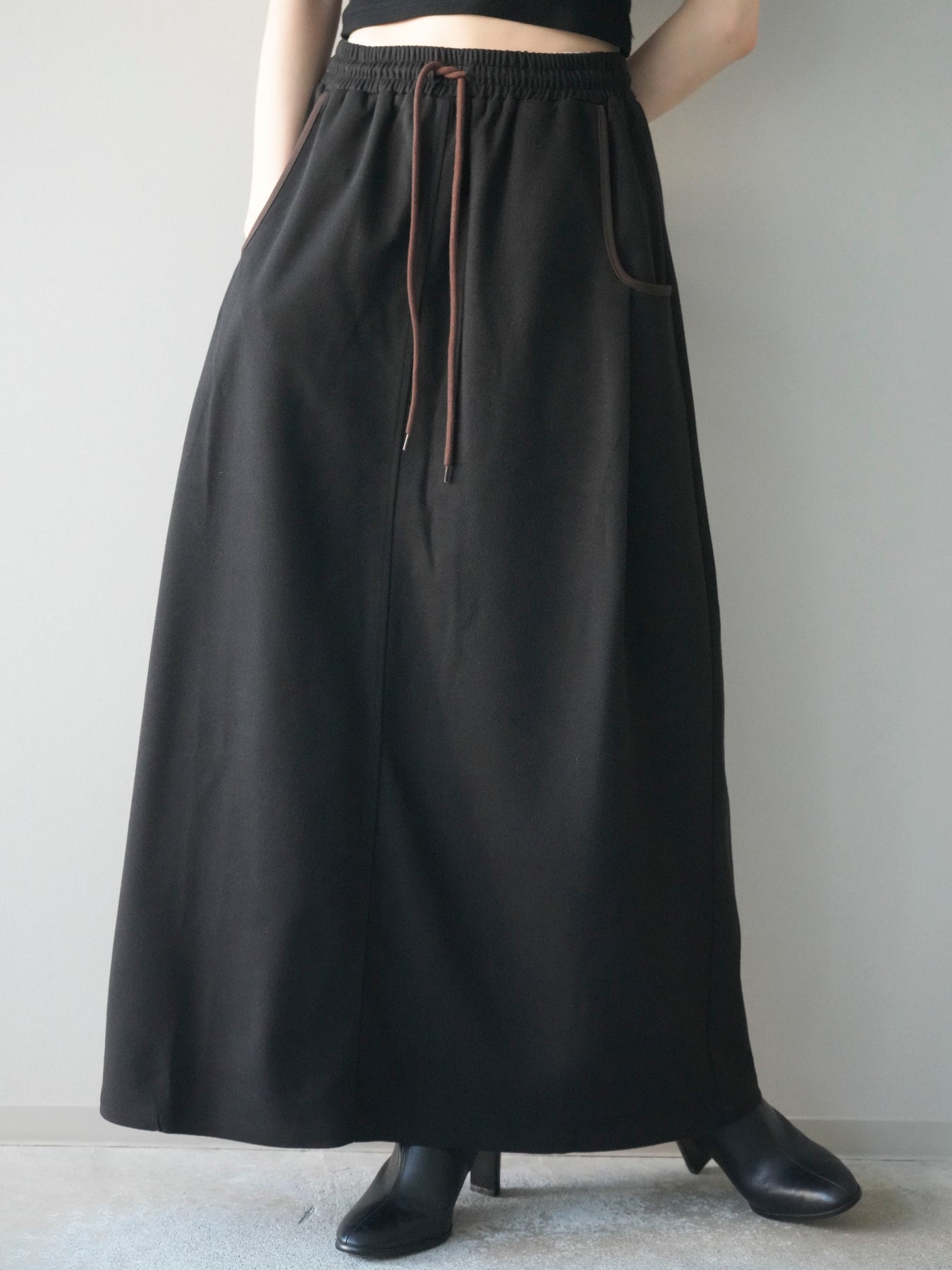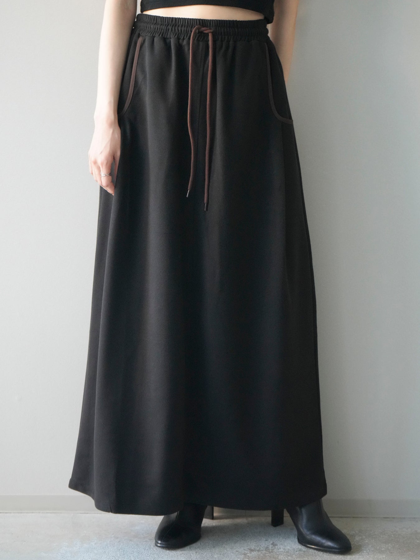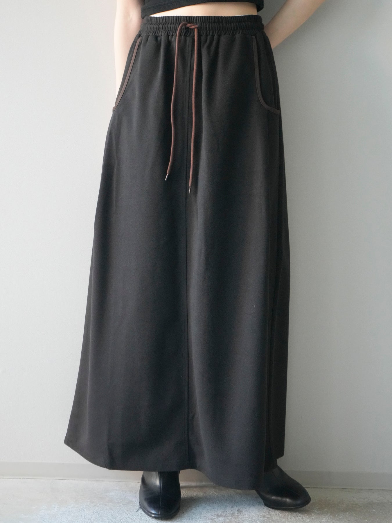 すっきりとしたIラインシルエットに、配色パイピングがアクセントとして映えるスカート。落ち感のある柔らかな素材が体のラインを拾いすぎず、縦のラインを強調することでスタイルアップ効果も期待できます。ウエストは総ゴム×ドローストリング仕様で、快適な穿き心地ときちんと感を両立。カジュアルなトップスと合わせても上品にまとまり、デイリーからお出かけまで幅広いシーンで活躍する万能アイテムです。
