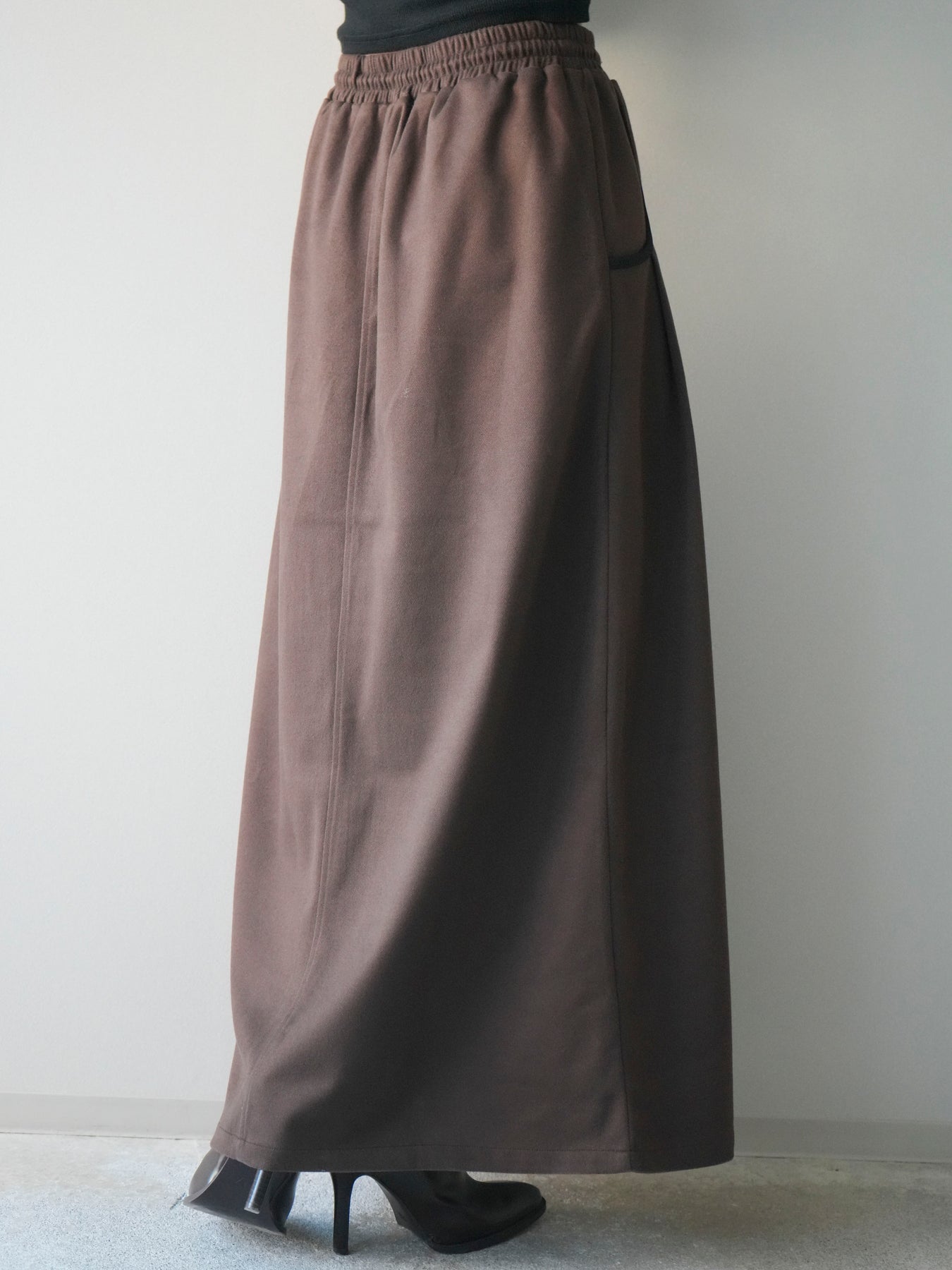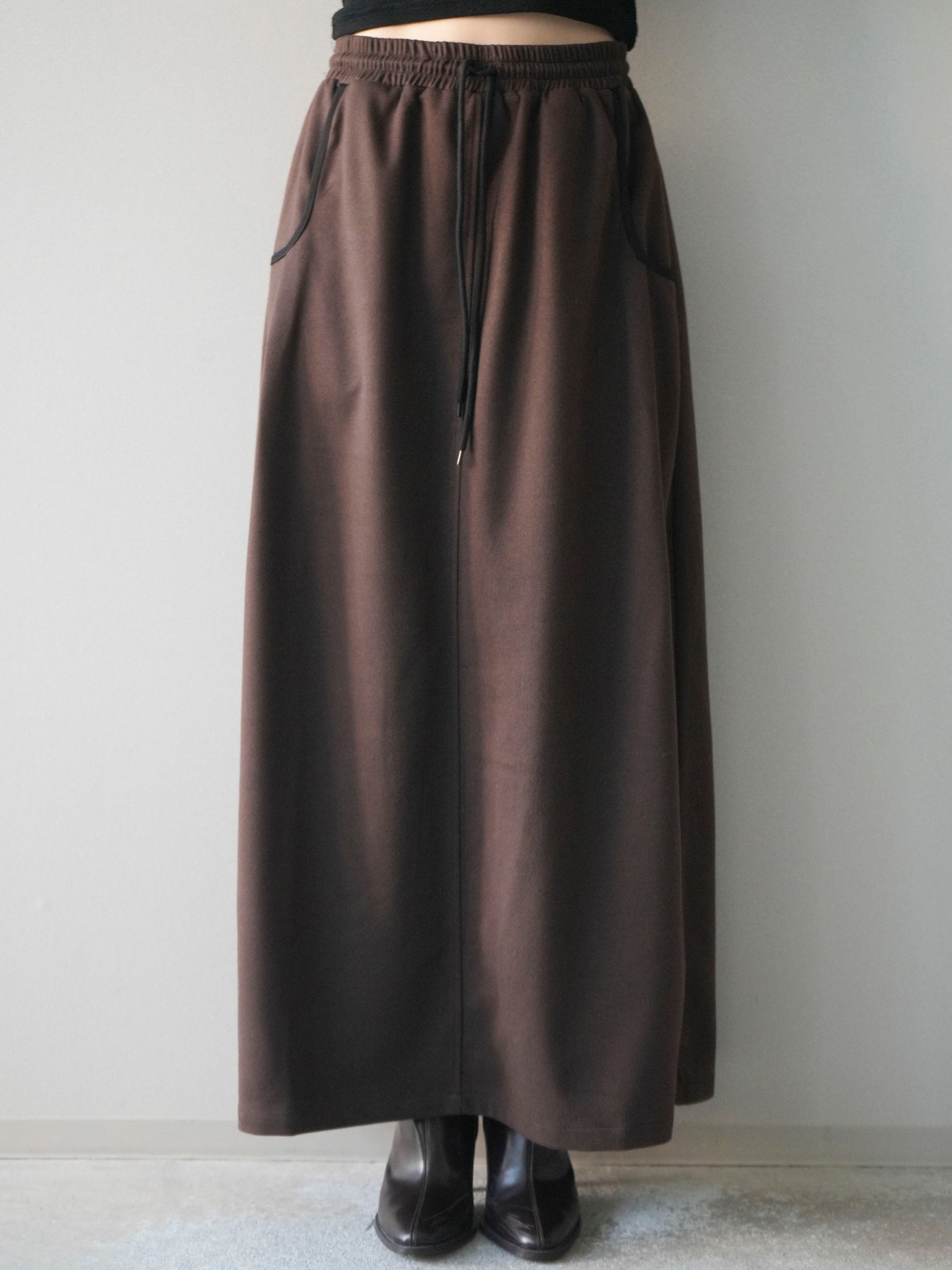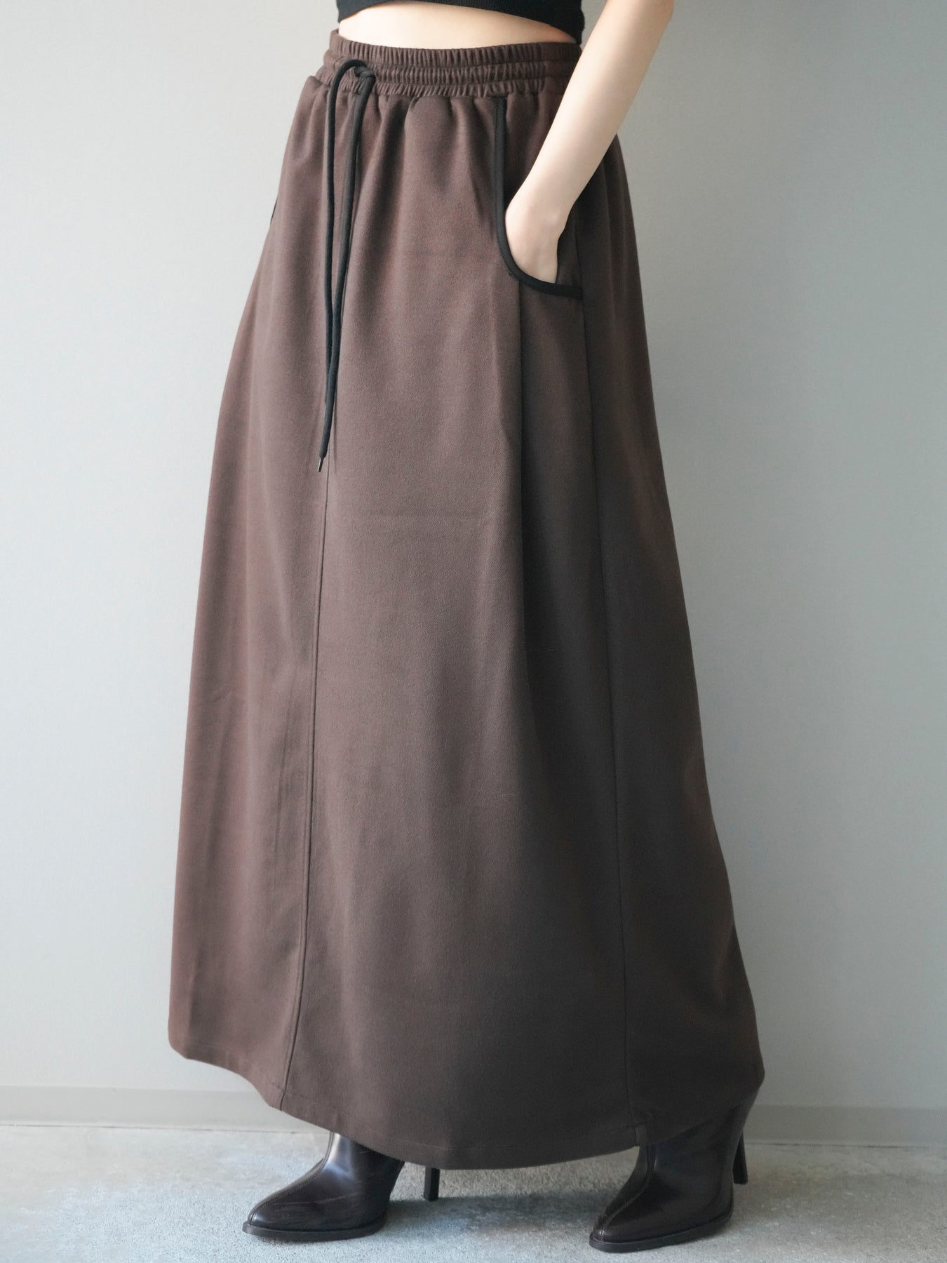 すっきりとしたIラインシルエットに、配色パイピングがアクセントとして映えるスカート。落ち感のある柔らかな素材が体のラインを拾いすぎず、縦のラインを強調することでスタイルアップ効果も期待できます。ウエストは総ゴム×ドローストリング仕様で、快適な穿き心地ときちんと感を両立。カジュアルなトップスと合わせても上品にまとまり、デイリーからお出かけまで幅広いシーンで活躍する万能アイテムです。