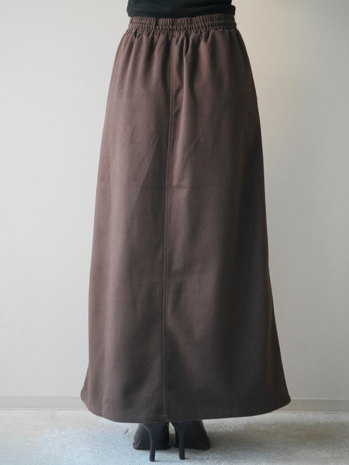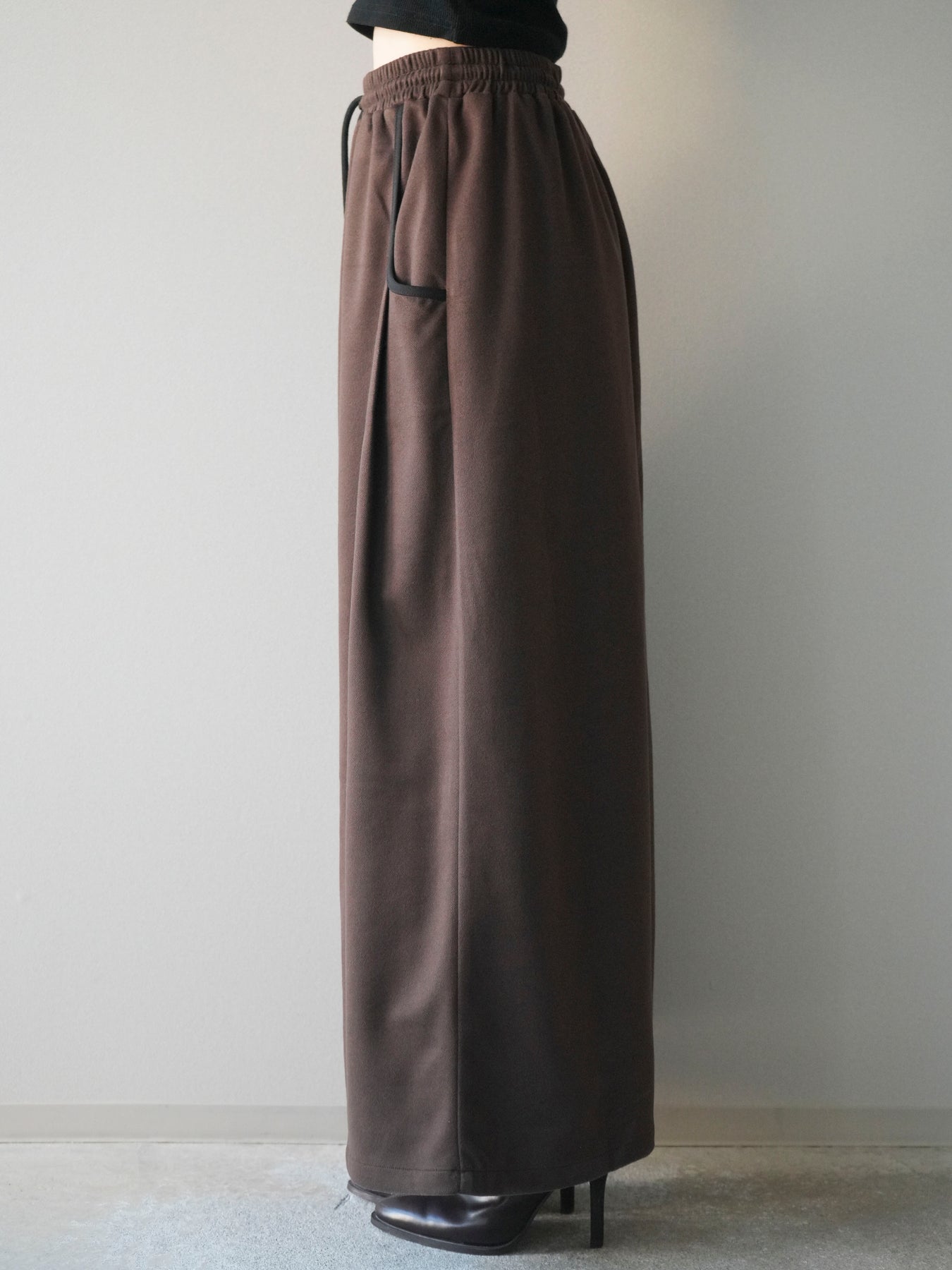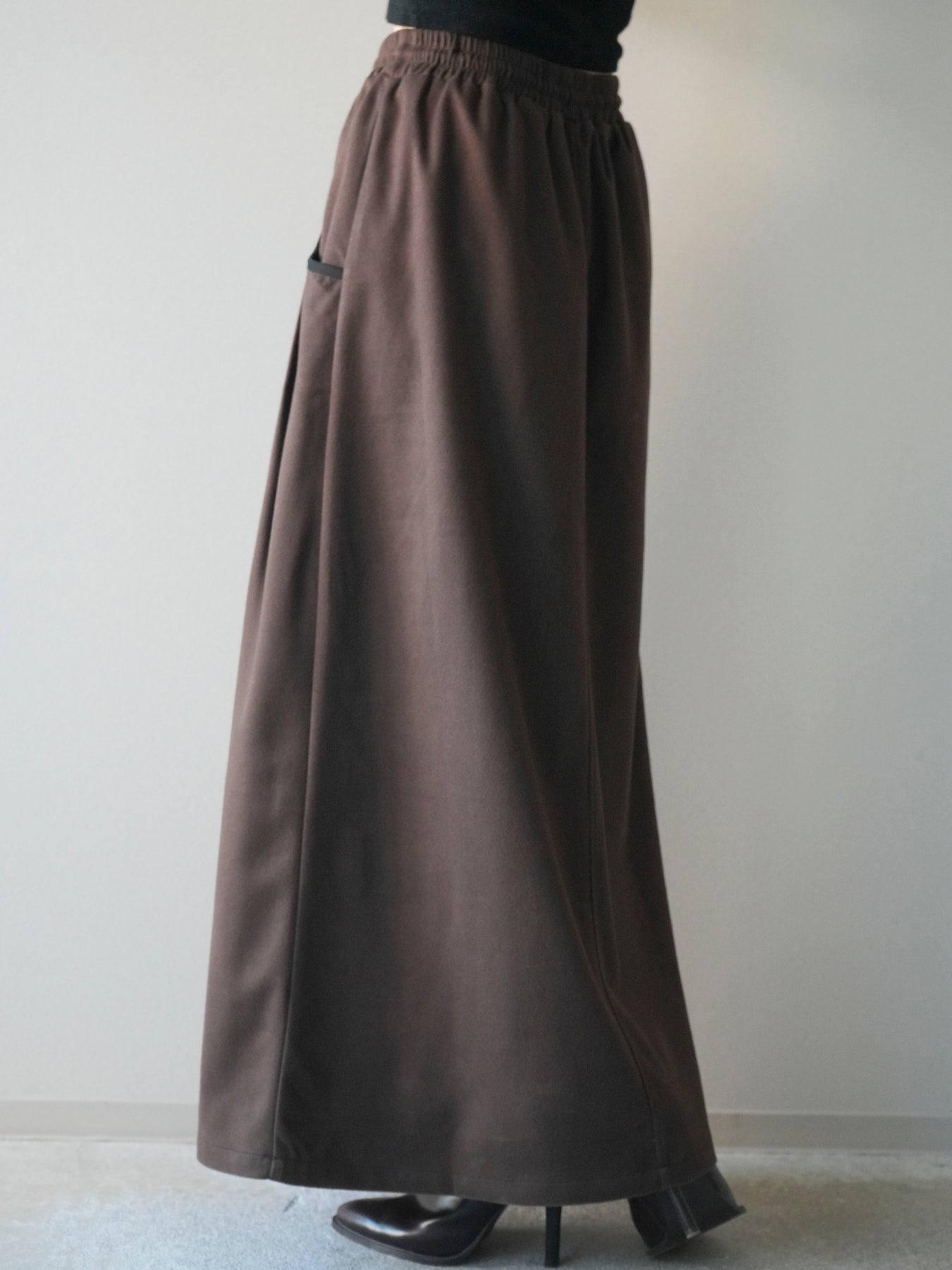 すっきりとしたIラインシルエットに、配色パイピングがアクセントとして映えるスカート。落ち感のある柔らかな素材が体のラインを拾いすぎず、縦のラインを強調することでスタイルアップ効果も期待できます。ウエストは総ゴム×ドローストリング仕様で、快適な穿き心地ときちんと感を両立。カジュアルなトップスと合わせても上品にまとまり、デイリーからお出かけまで幅広いシーンで活躍する万能アイテムです。