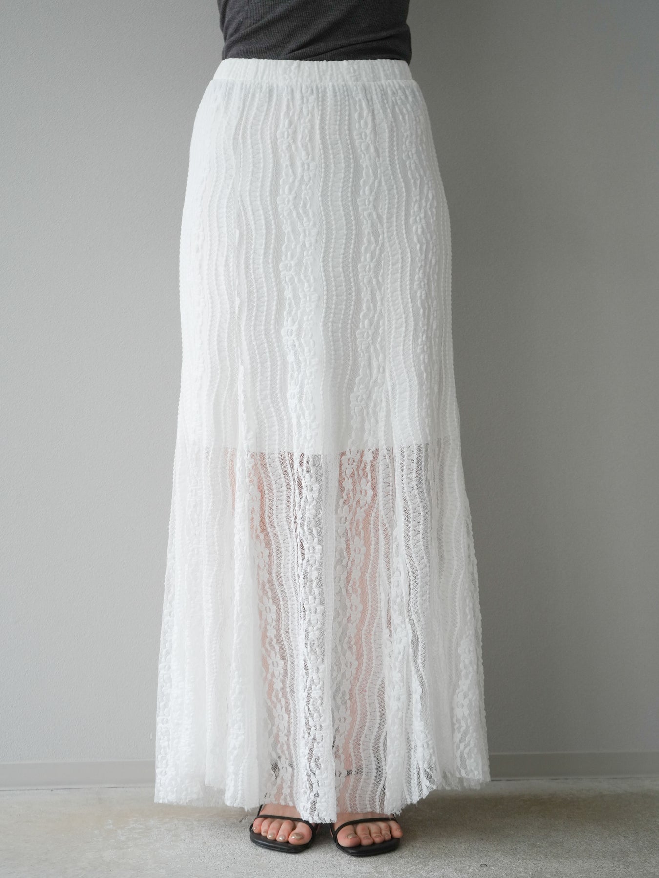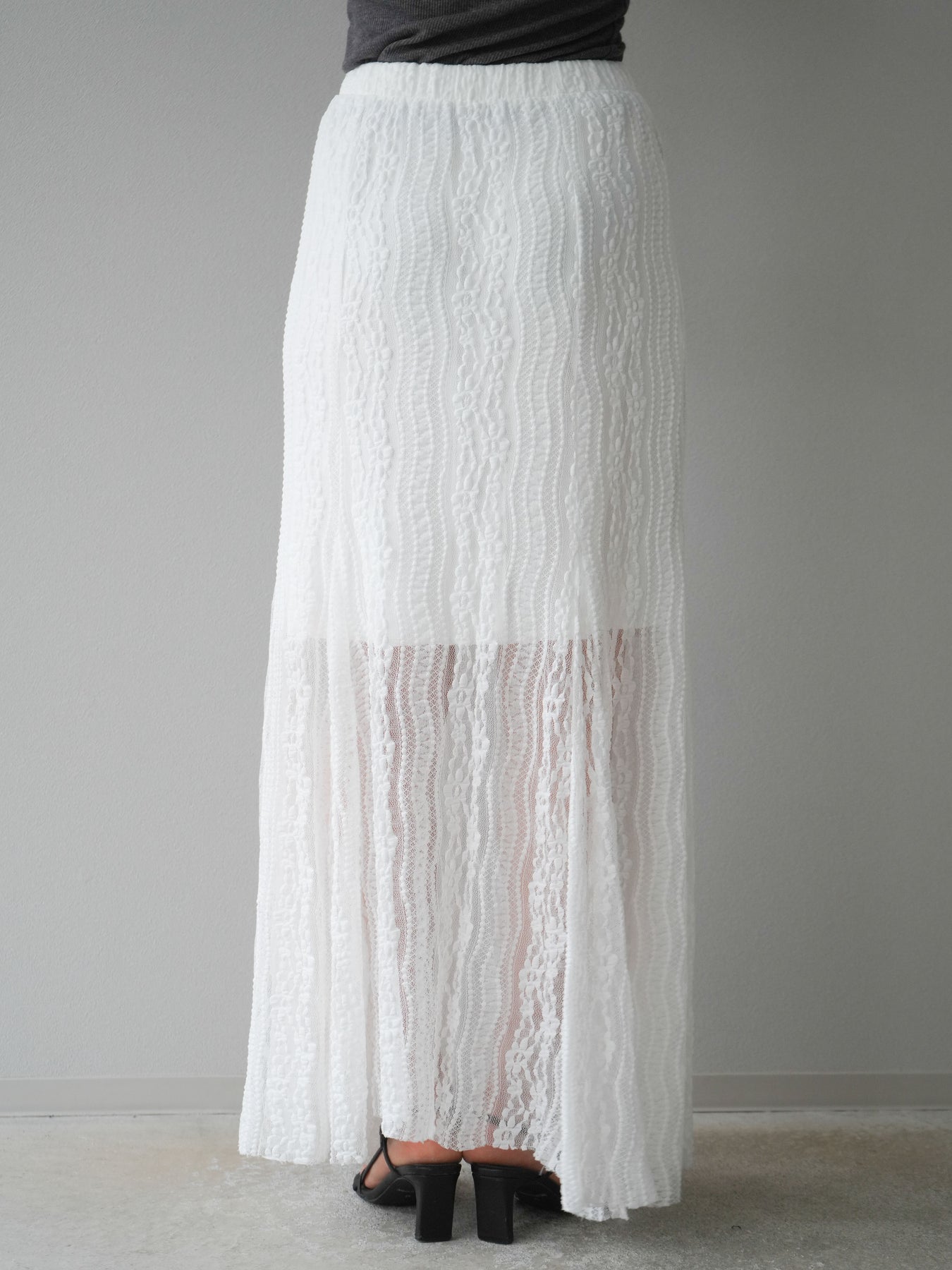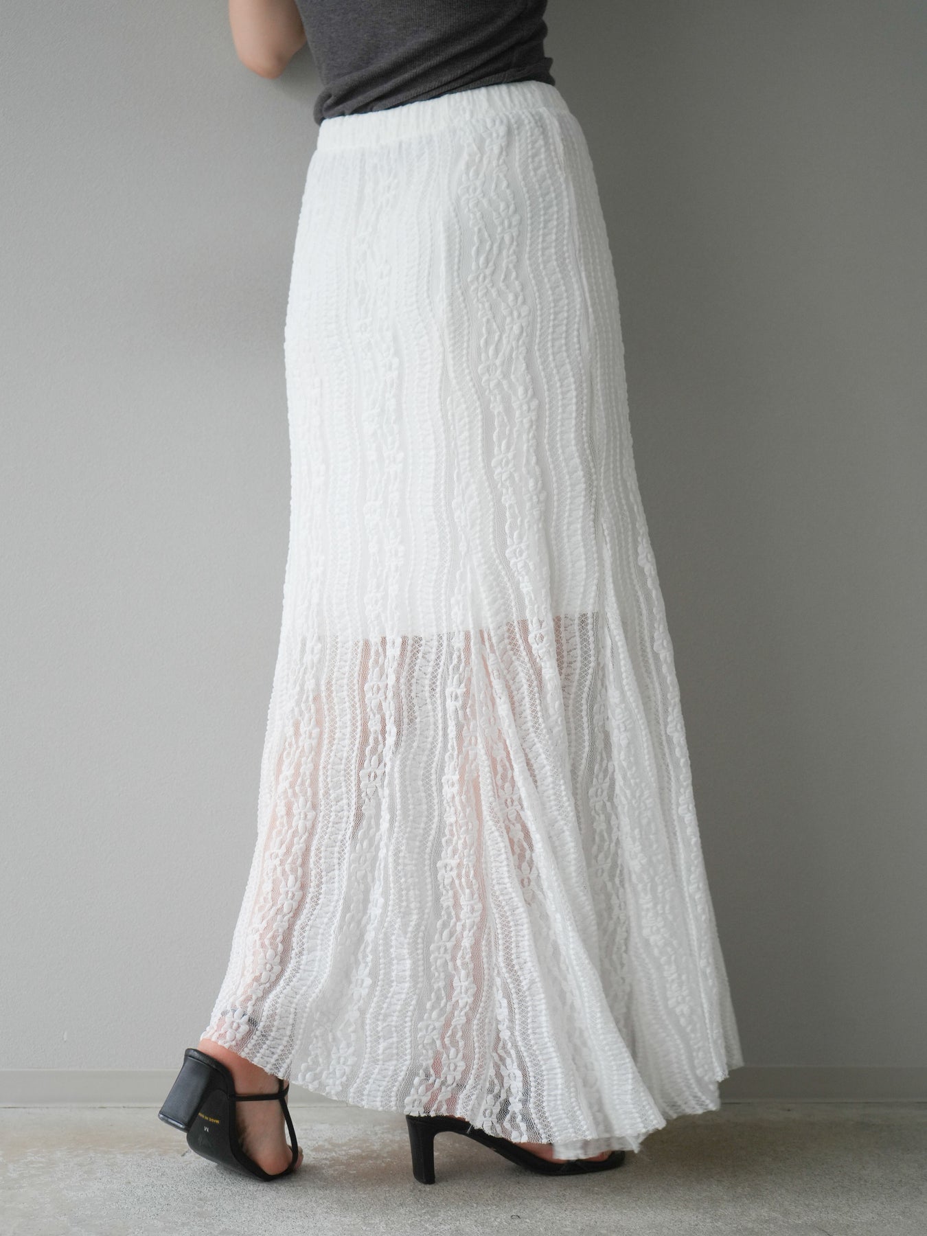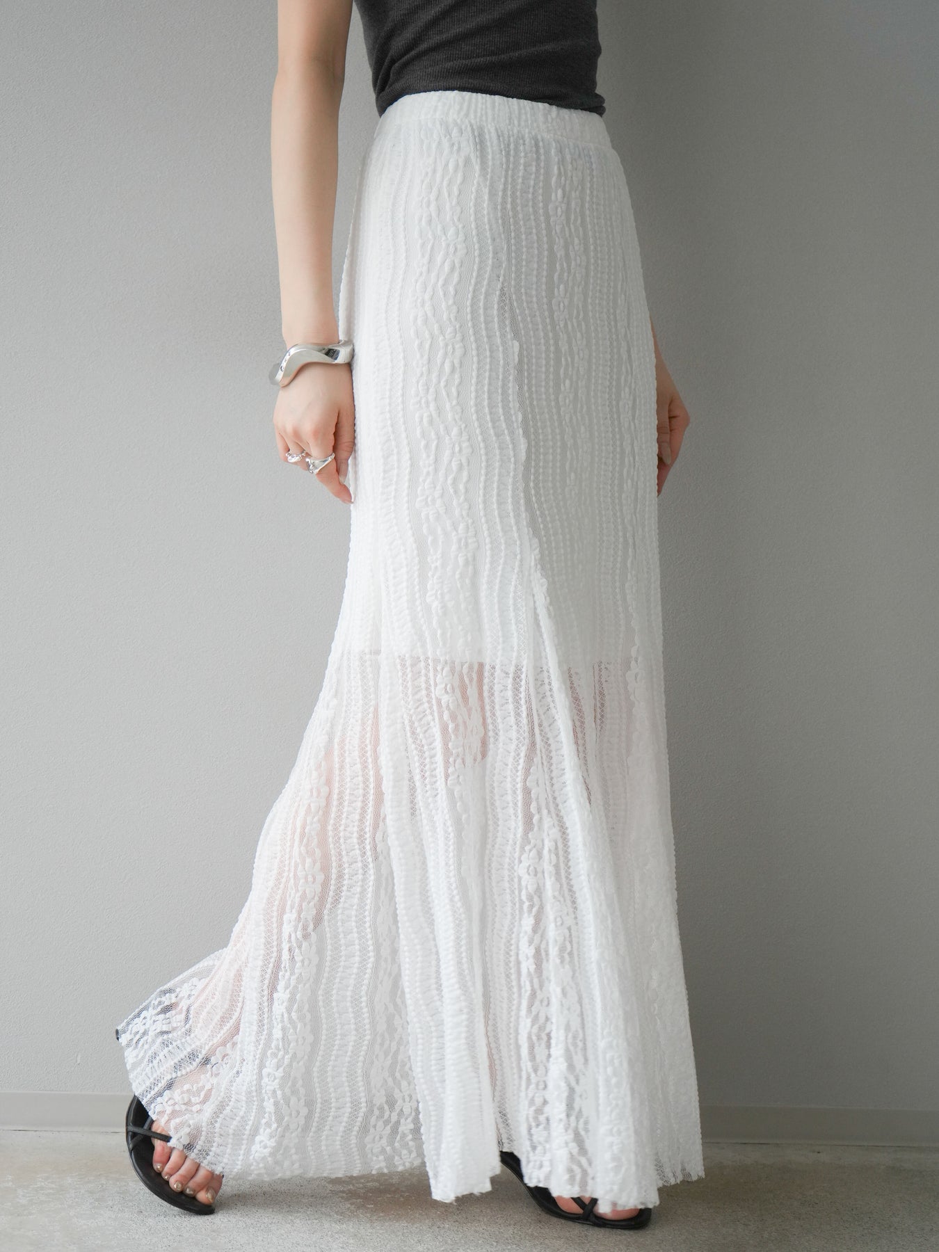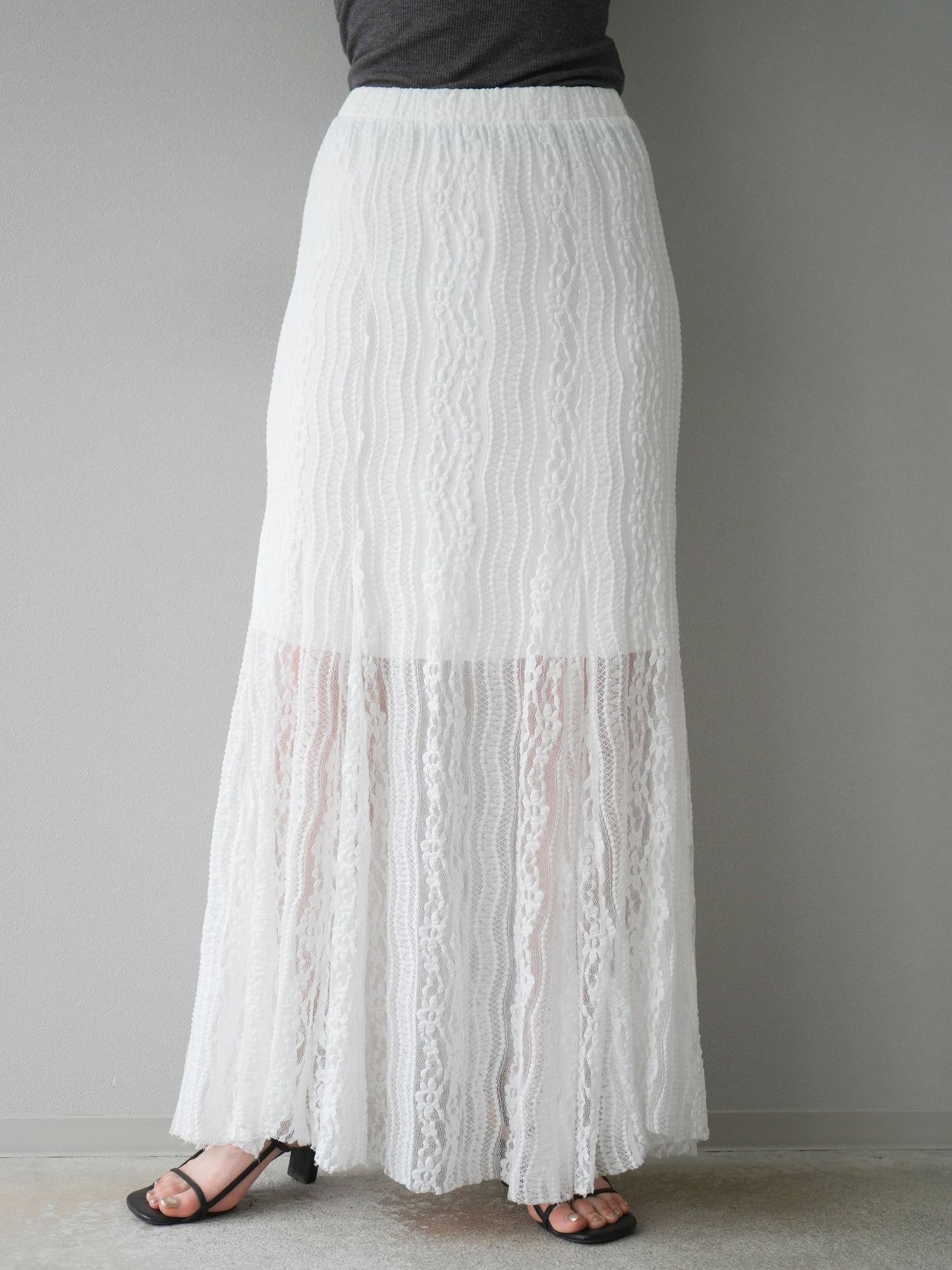 繊細なレース素材を使用したナローデザインのスカート。リラックス感のあるウエストゴム仕様で、軽やかな着心地を提供します。レースの美しいディテールが女性らしさを引き立て、シンプルながらも華やかな印象を与えます。モダンでありながらエレガントな一枚で、様々なトップスと合わせやすいアイテムです。 ※ボトムス、キャミソール(インナー)以外の商品は一律でインナーは付属していません