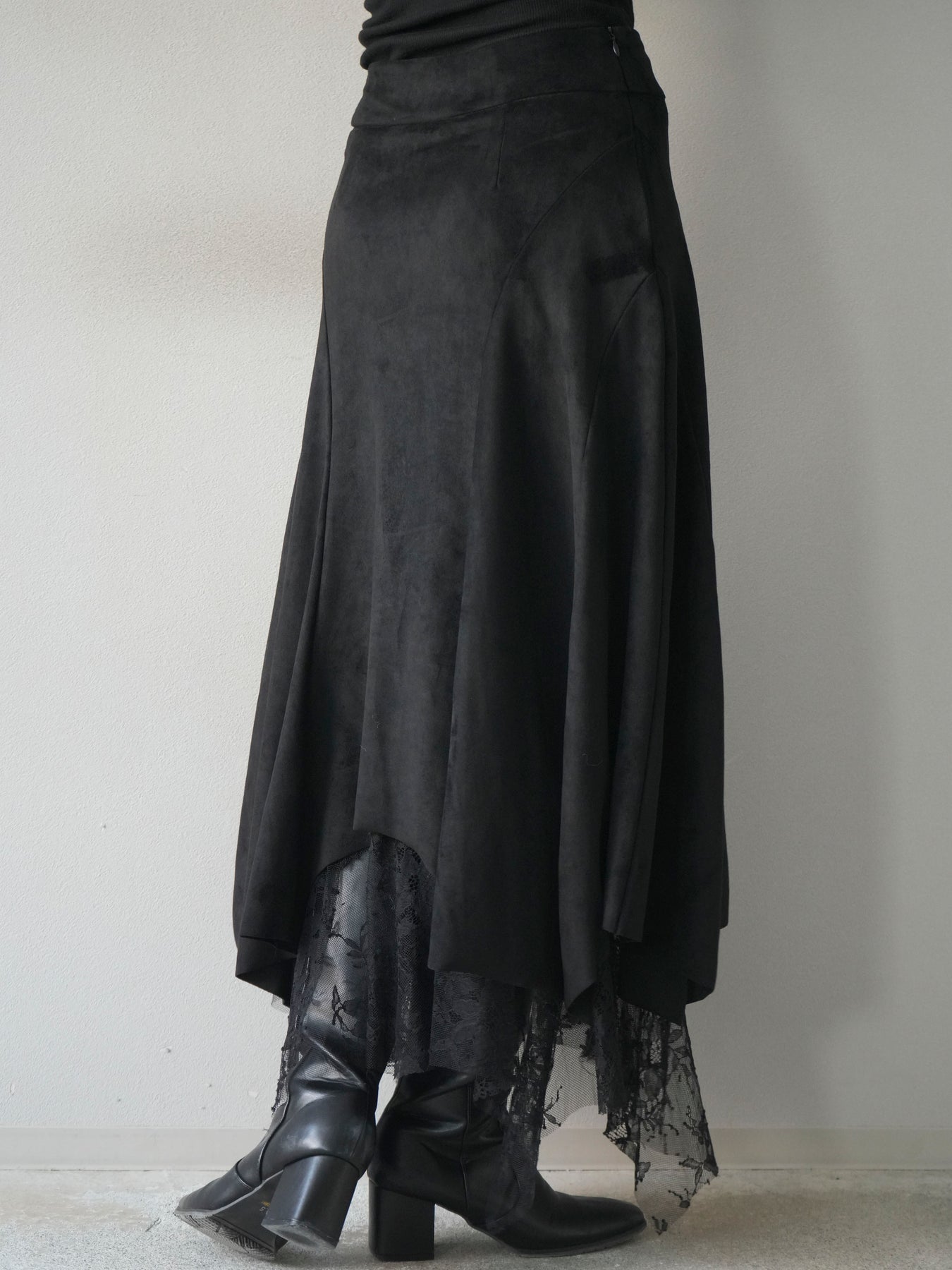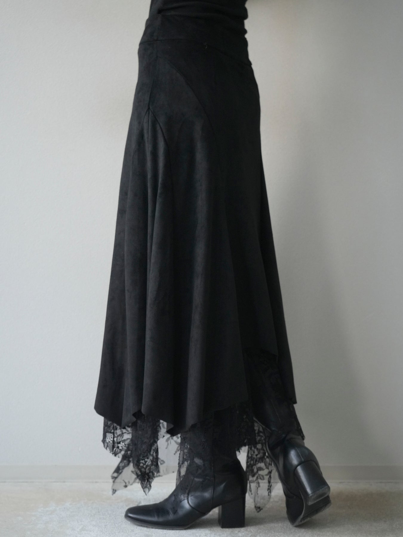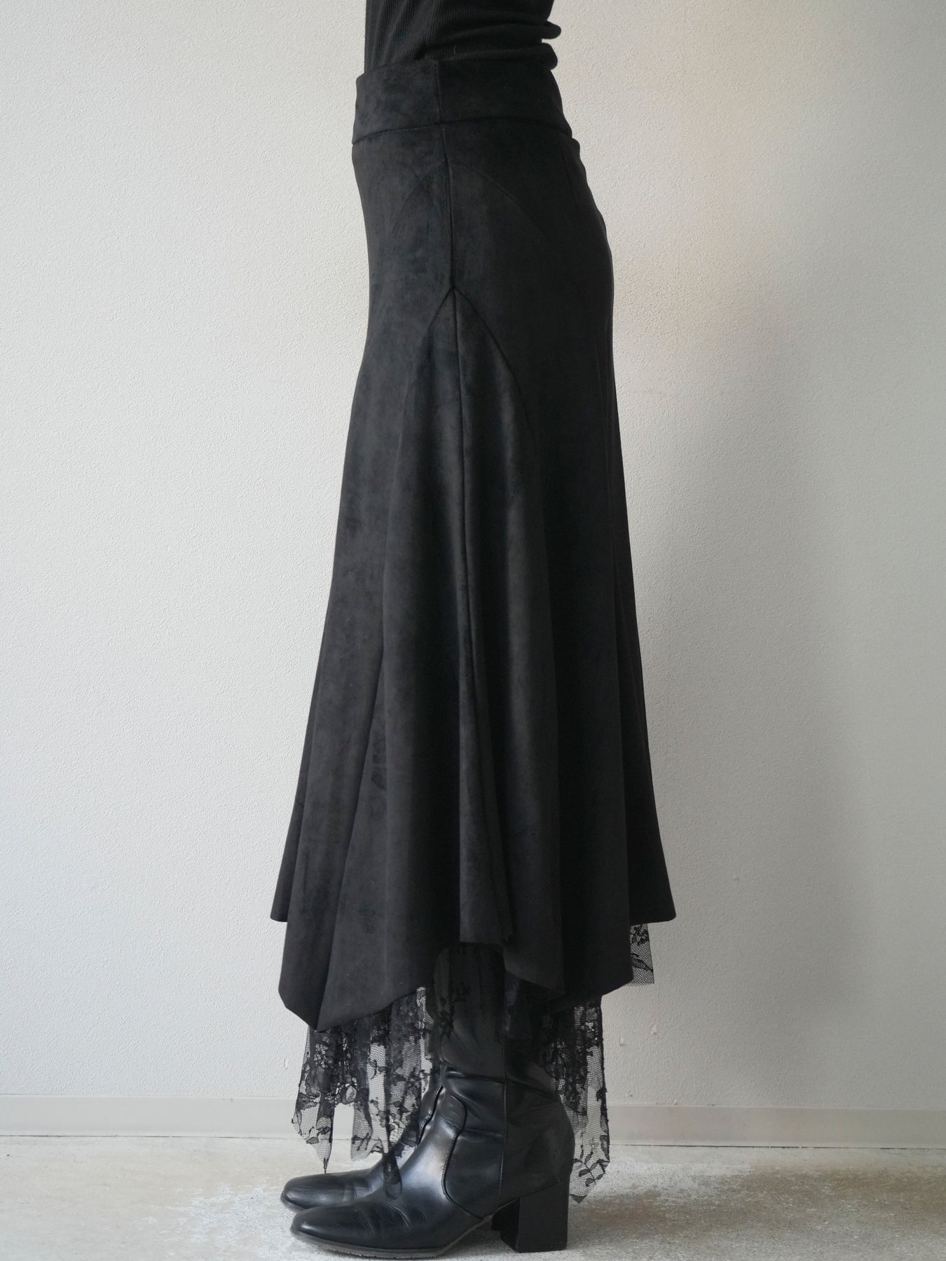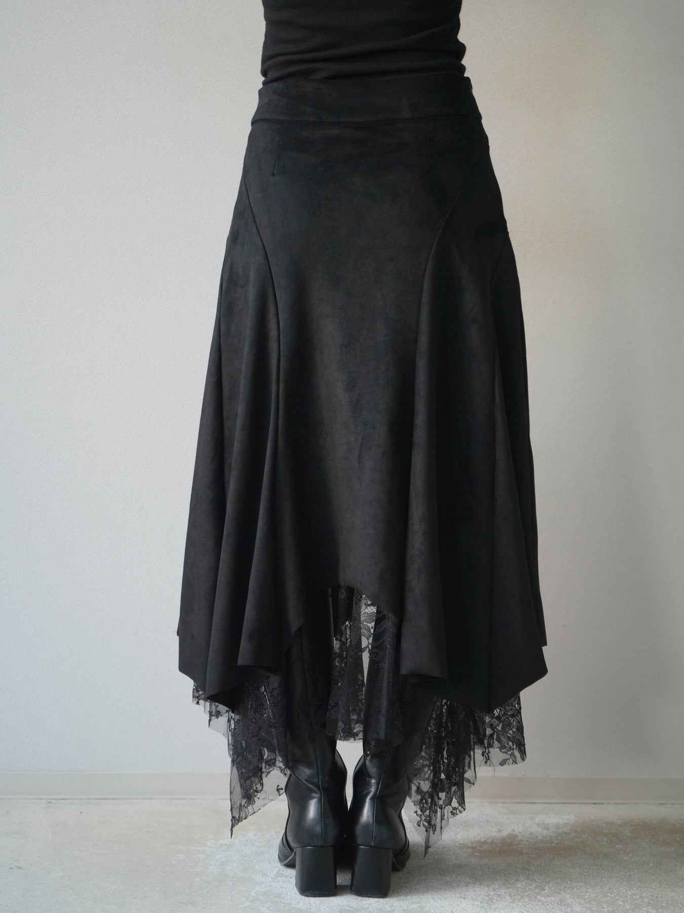 [予約]スエード裾レースアシンメトリースカート/black