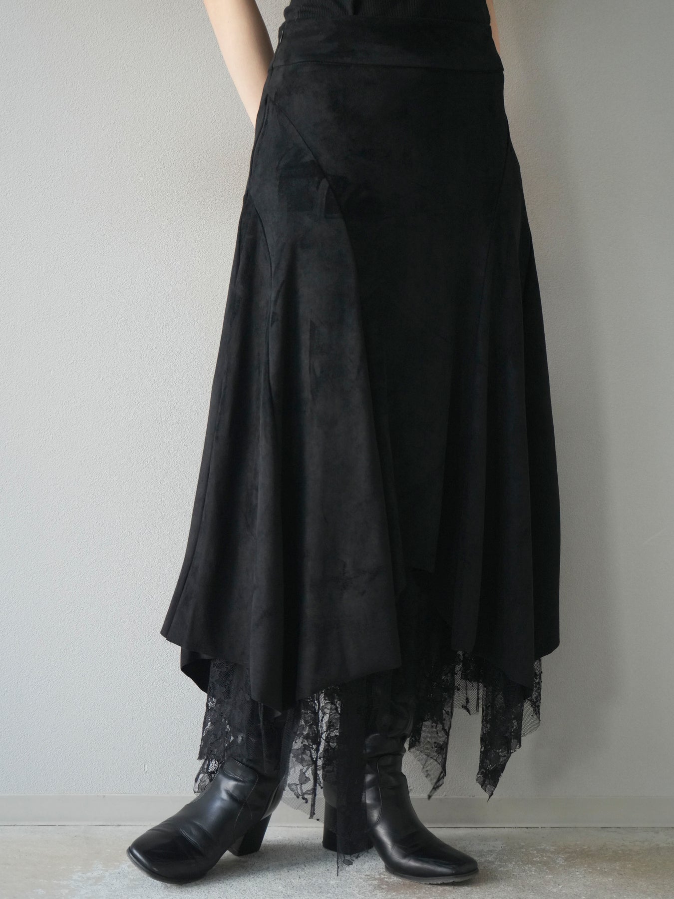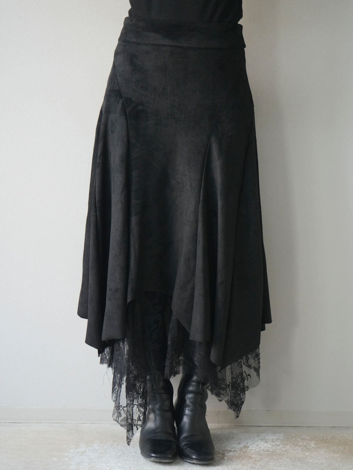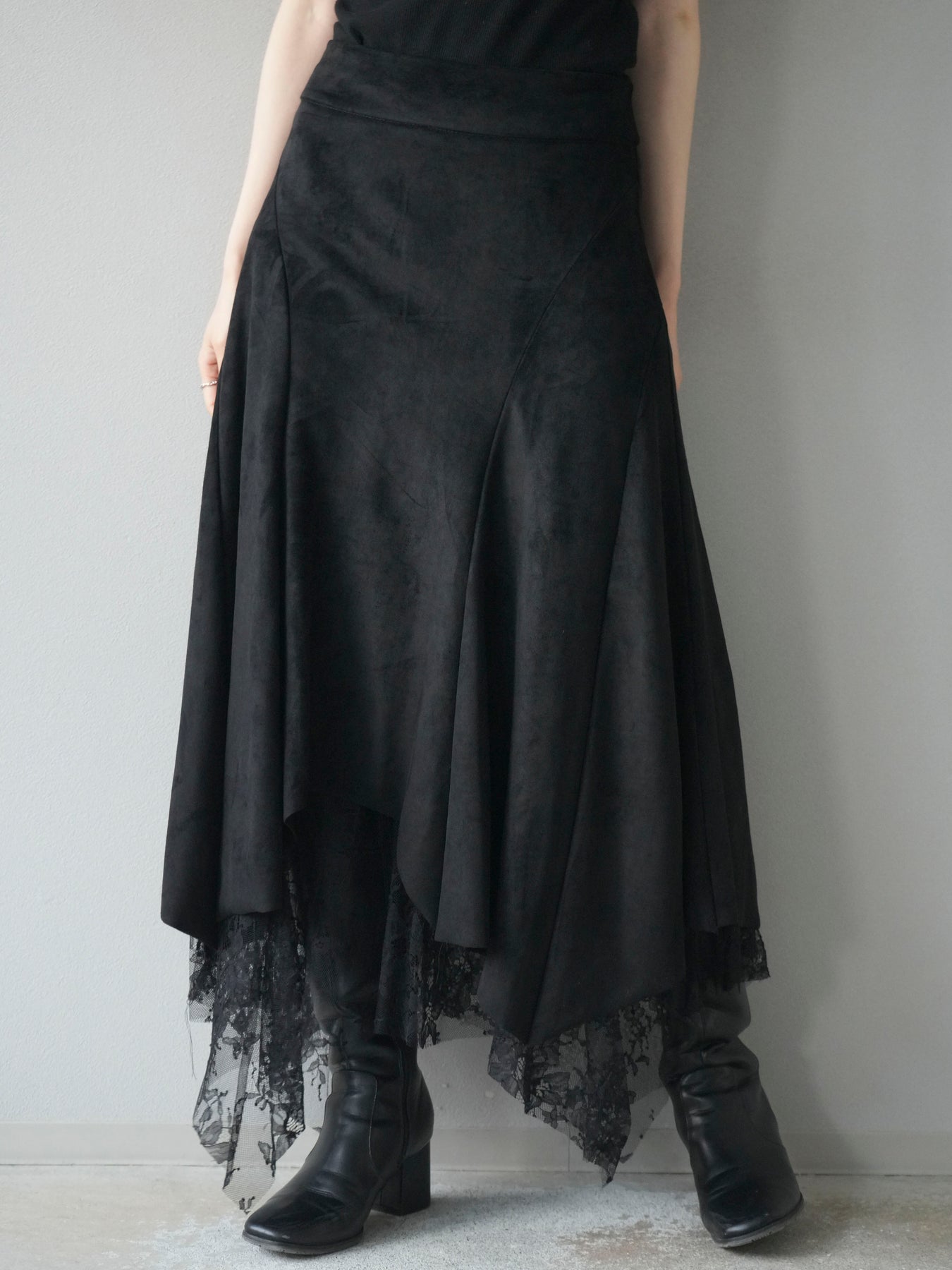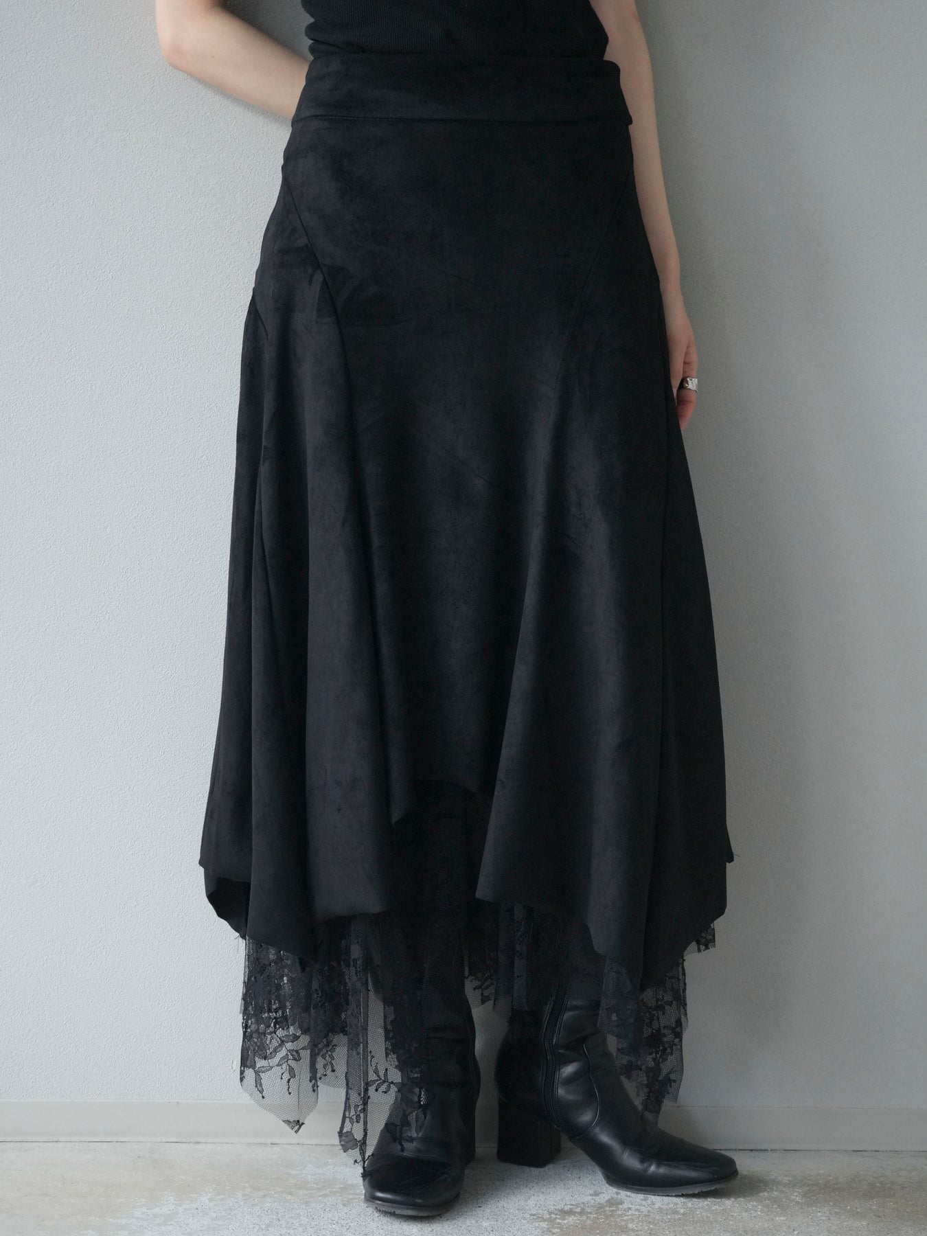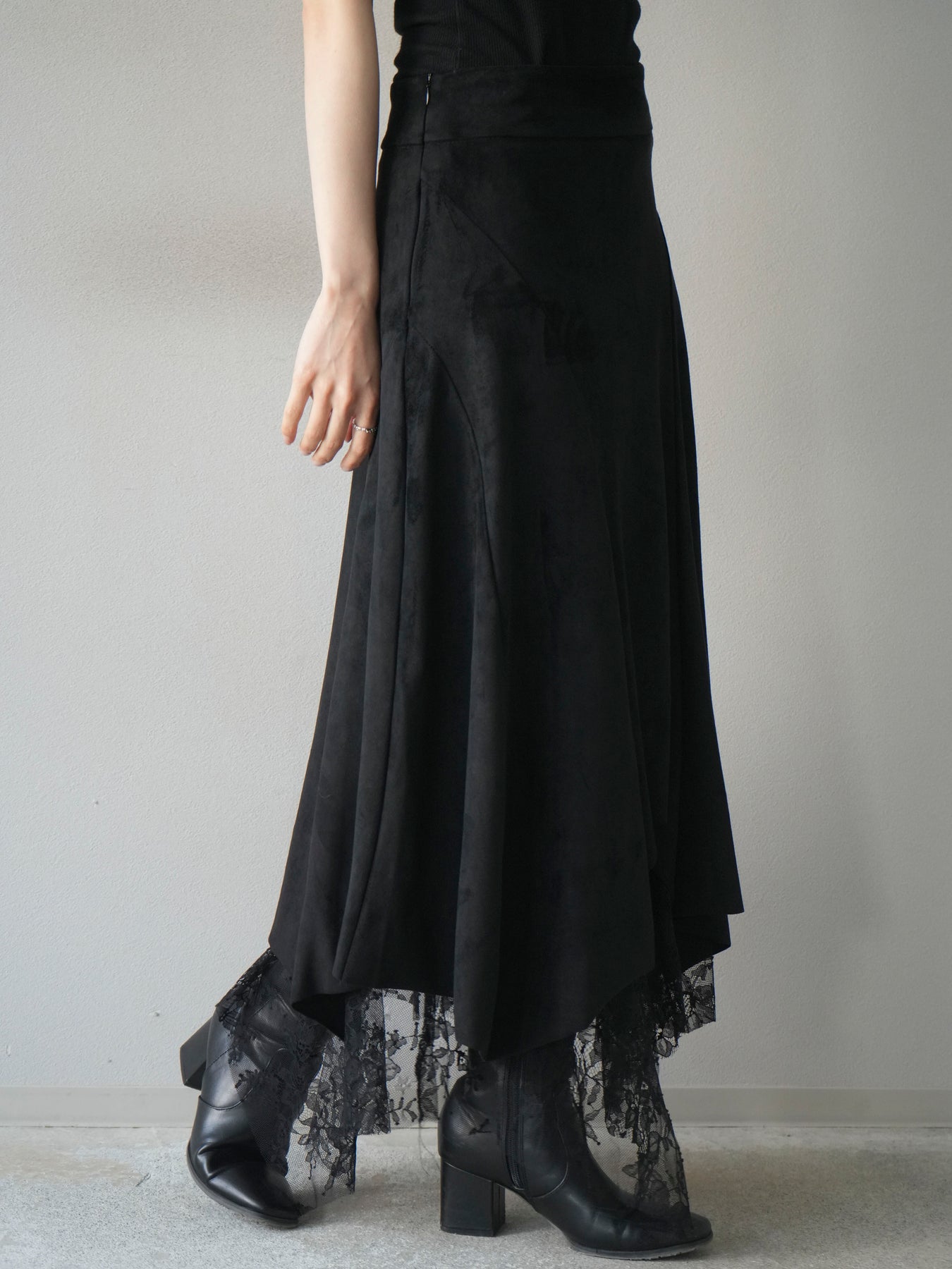 [予約]スエード裾レースアシンメトリースカート/black