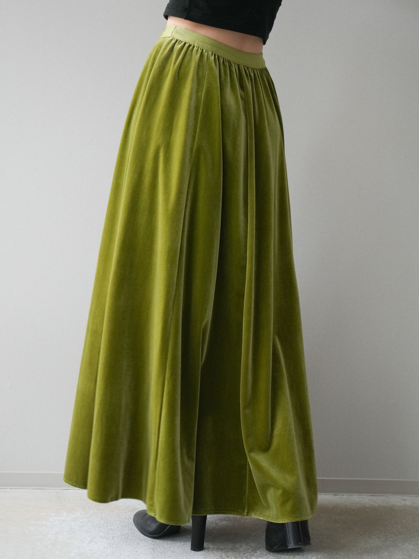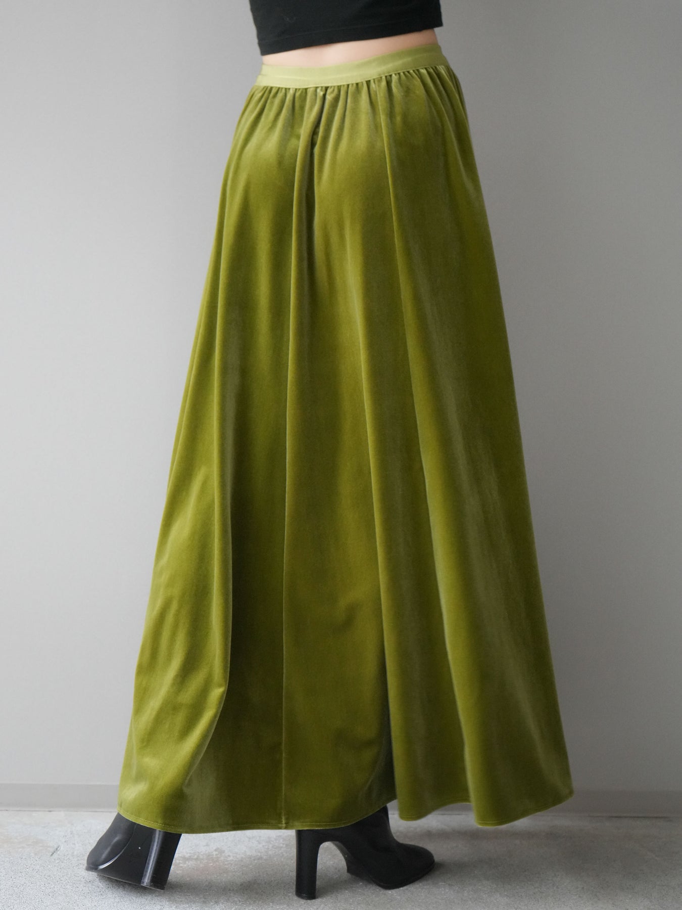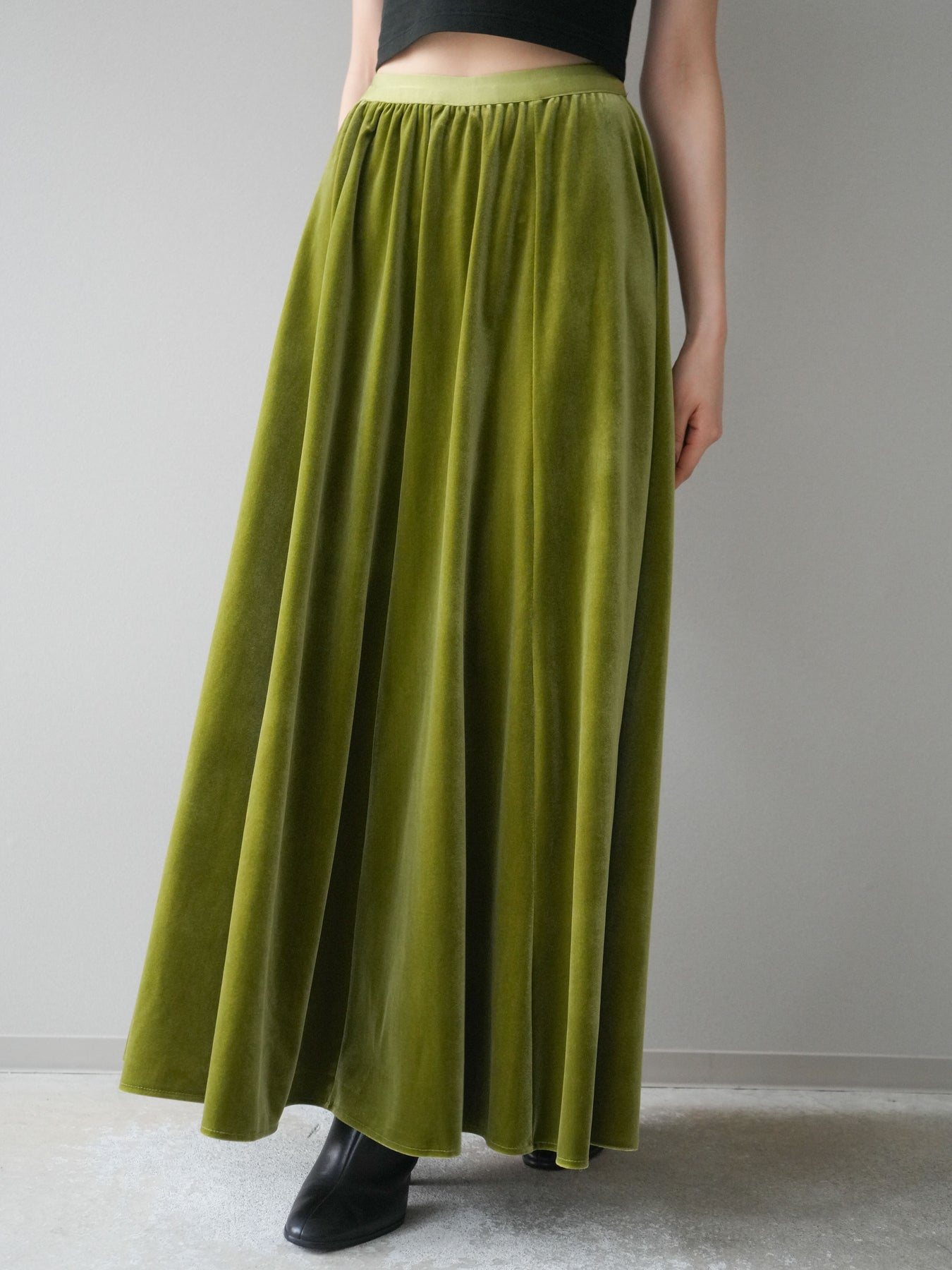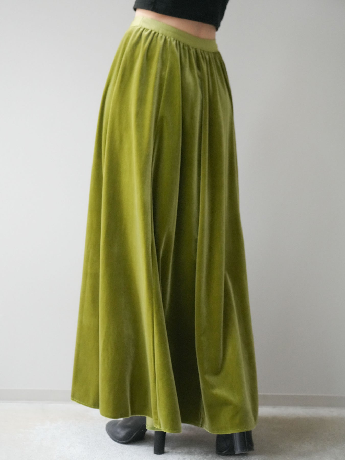 上品な光沢感が魅力のベロア素材を使用したフレアスカート。 柔らかくしなやかな質感が美しいドレープを生み、動くたびに華やかな印象を与えます。 ウエストは総ゴム仕様でリラックス感がありながらも、自然な落ち感でシルエットをすっきりと演出。 シンプルなデザインながらも存在感があり、ニットやブラウスなど幅広いトップスと好相性です。 デイリーから特別なシーンまで活躍する、シーズンライクな万能スカートです。 ※ボトムス、キャミソール(インナー)以外の商品は一律でインナーは付属していません。