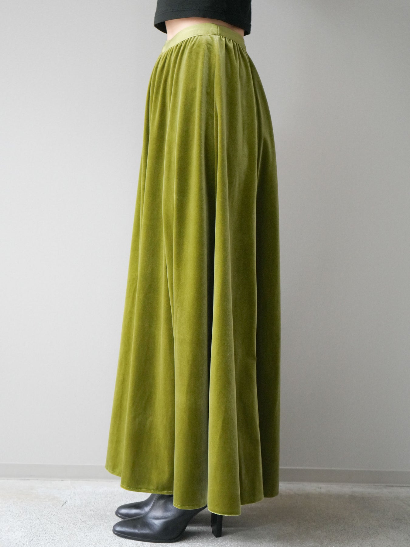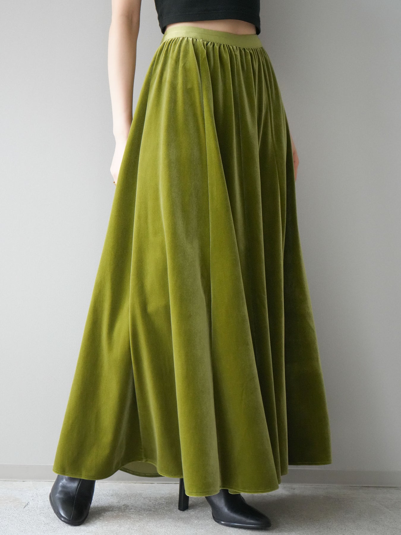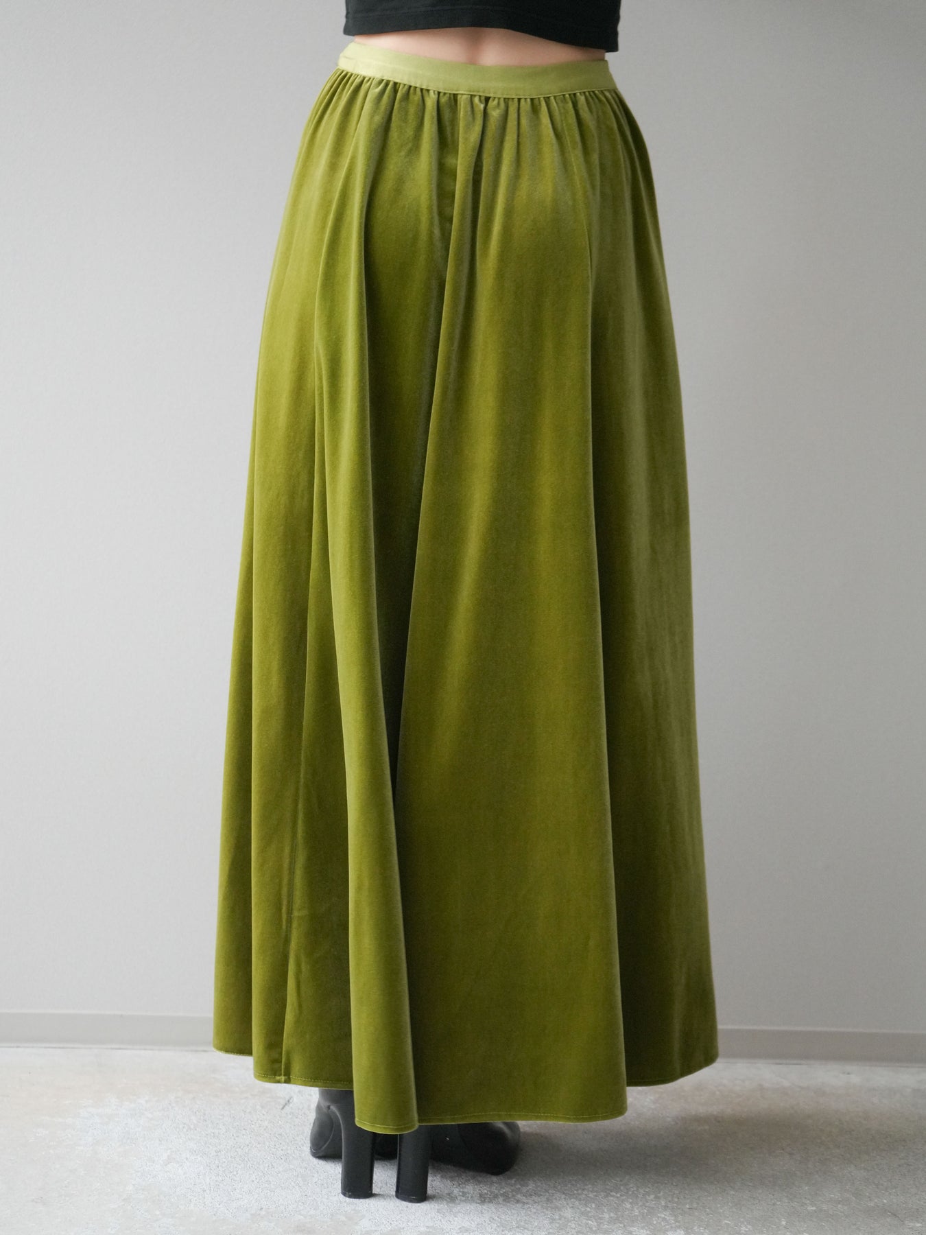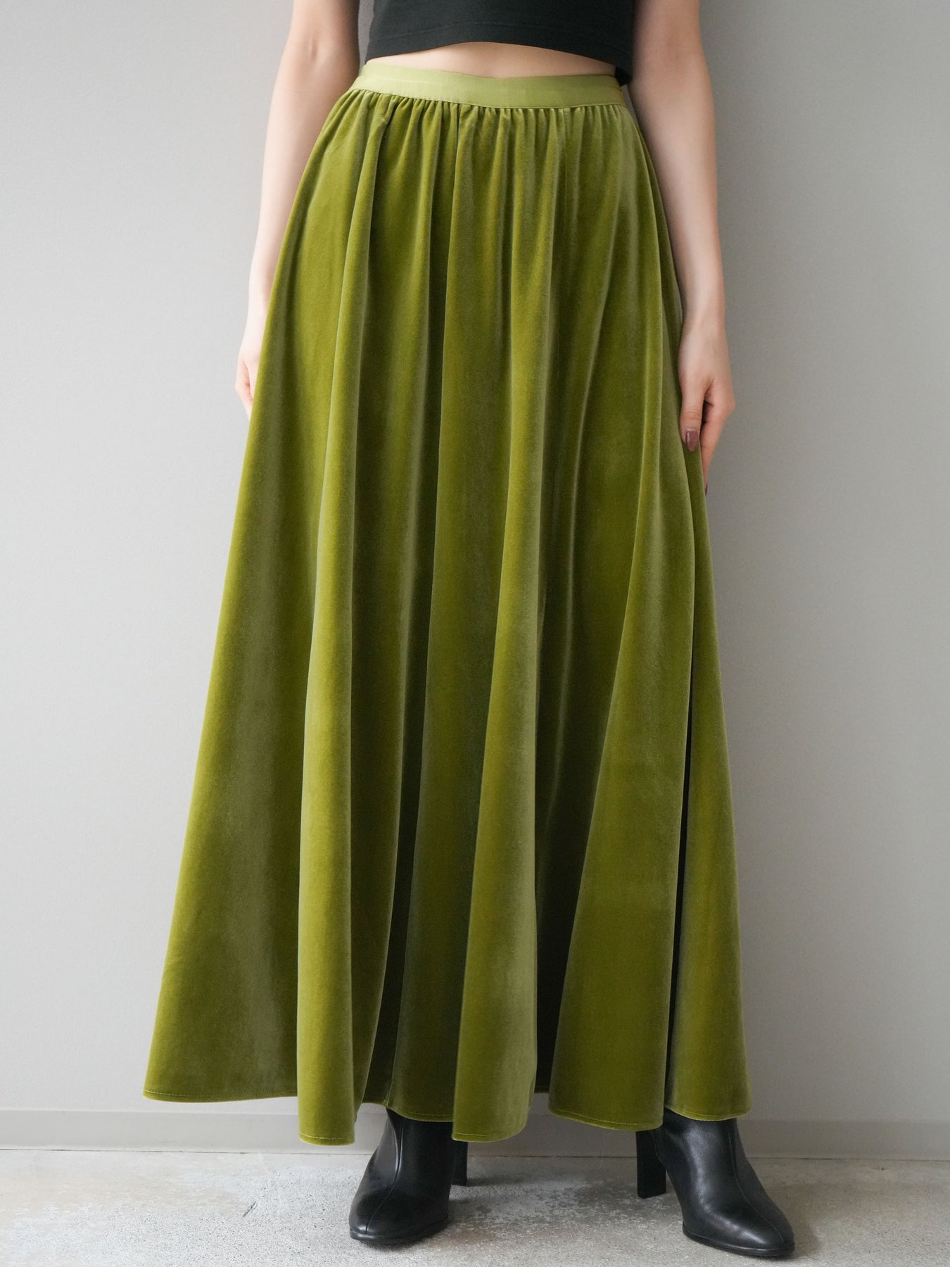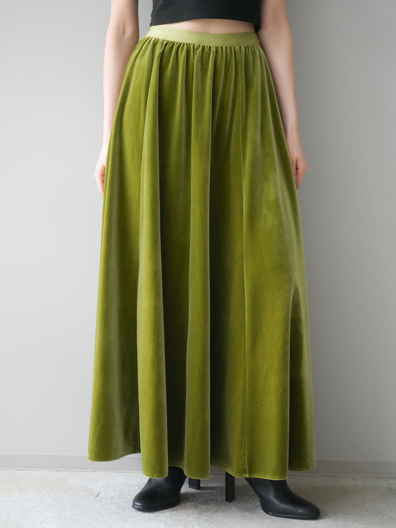 上品な光沢感が魅力のベロア素材を使用したフレアスカート。 柔らかくしなやかな質感が美しいドレープを生み、動くたびに華やかな印象を与えます。 ウエストは総ゴム仕様でリラックス感がありながらも、自然な落ち感でシルエットをすっきりと演出。 シンプルなデザインながらも存在感があり、ニットやブラウスなど幅広いトップスと好相性です。 デイリーから特別なシーンまで活躍する、シーズンライクな万能スカートです。 ※ボトムス、キャミソール(インナー)以外の商品は一律でインナーは付属していません。
