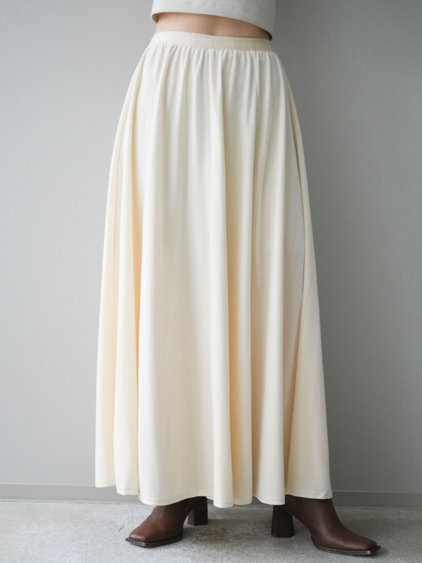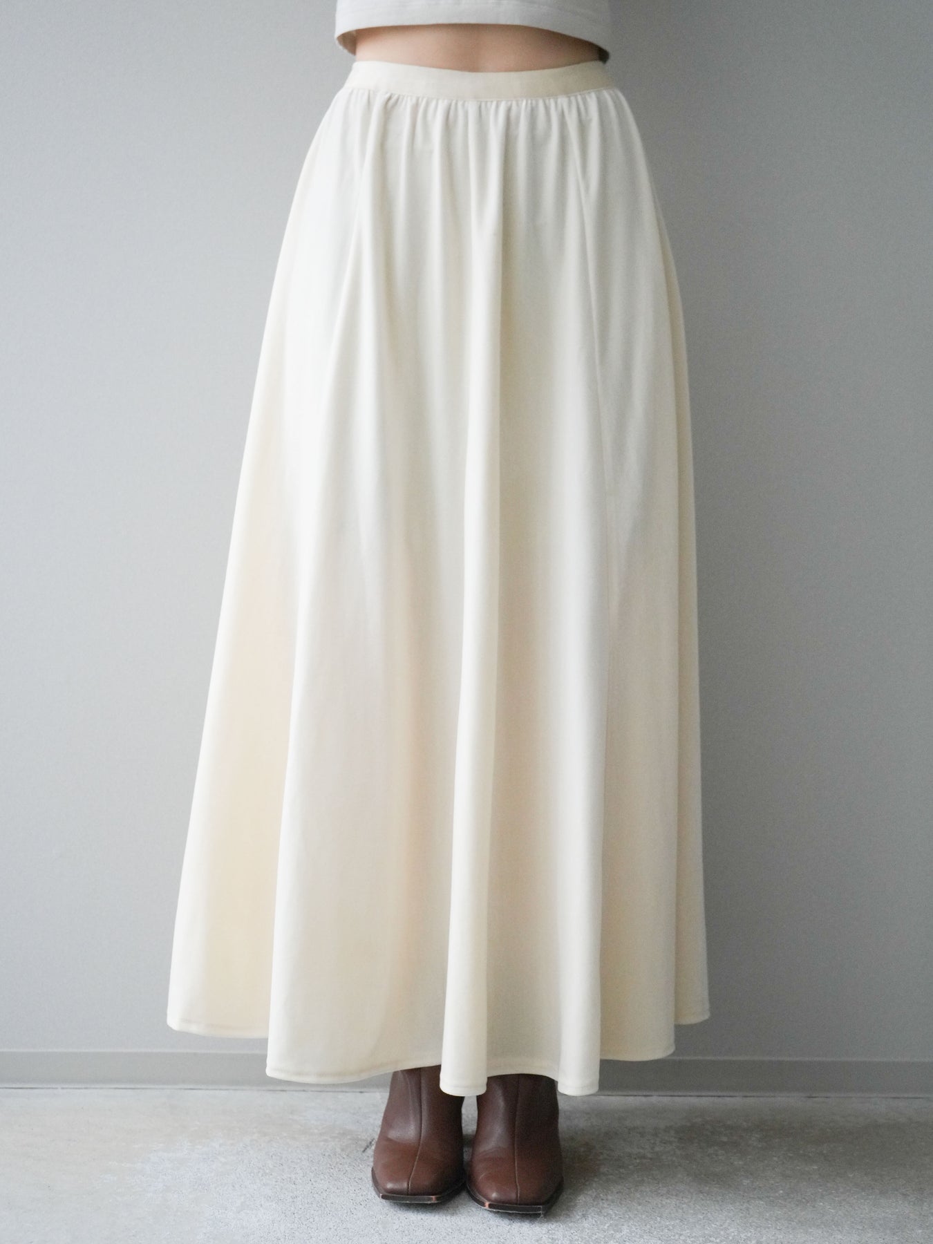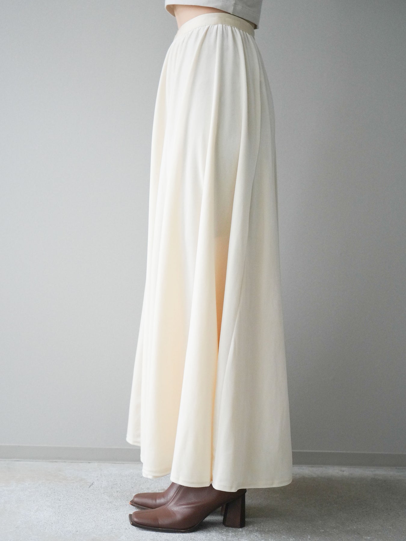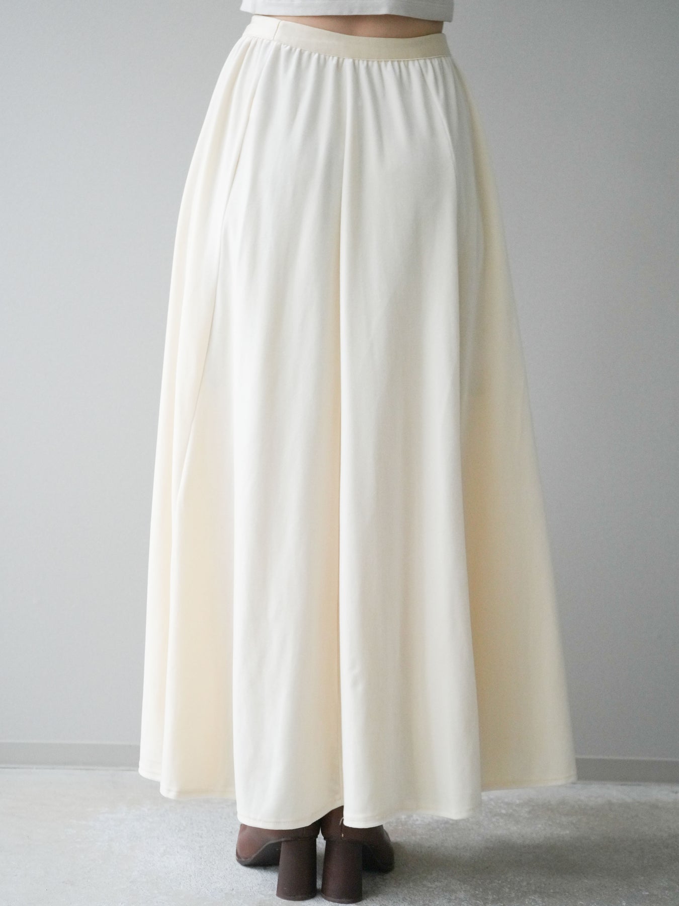 上品な光沢感が魅力のベロア素材を使用したフレアスカート。 柔らかくしなやかな質感が美しいドレープを生み、動くたびに華やかな印象を与えます。 ウエストは総ゴム仕様でリラックス感がありながらも、自然な落ち感でシルエットをすっきりと演出。 シンプルなデザインながらも存在感があり、ニットやブラウスなど幅広いトップスと好相性です。 デイリーから特別なシーンまで活躍する、シーズンライクな万能スカートです。 ※ボトムス、キャミソール(インナー)以外の商品は一律でインナーは付属していません。