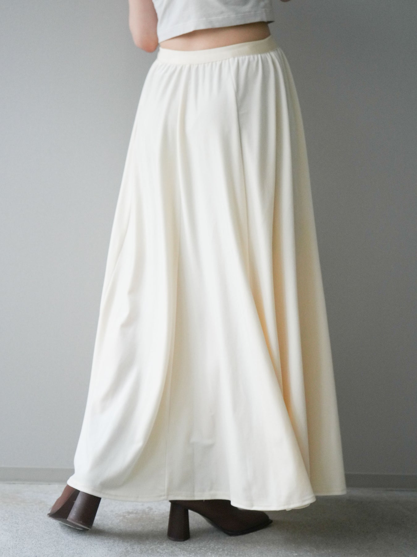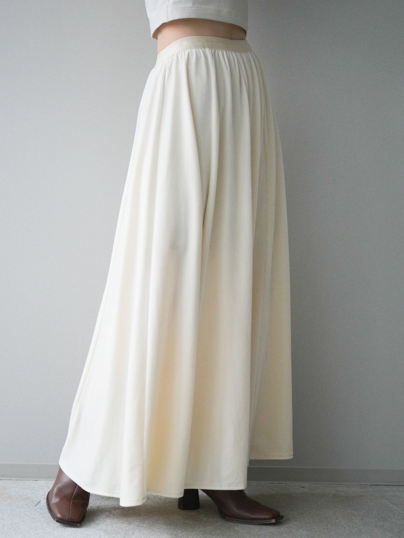 ウエスト54〜102cm(ウエストゴムあり) ヒップ124cm フロント着丈89cm バック着丈91cm 裏地なし オフのみ透け感あり 伸縮性あり ポケットなし