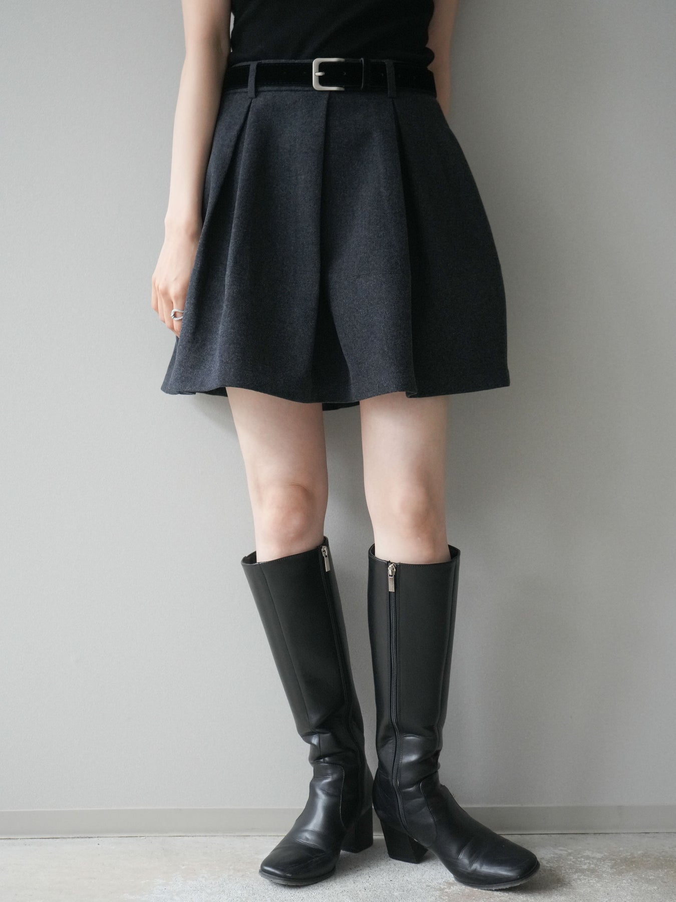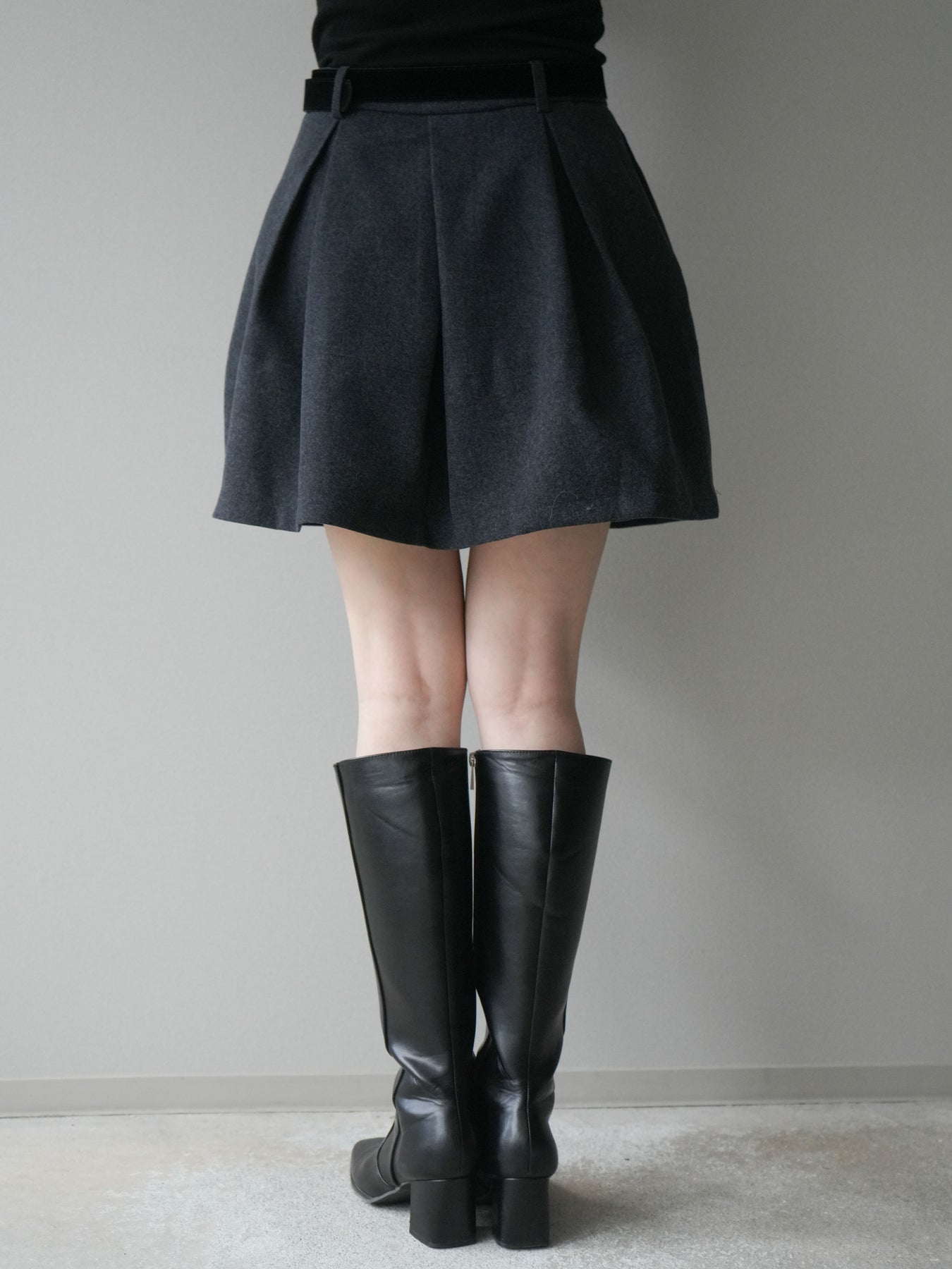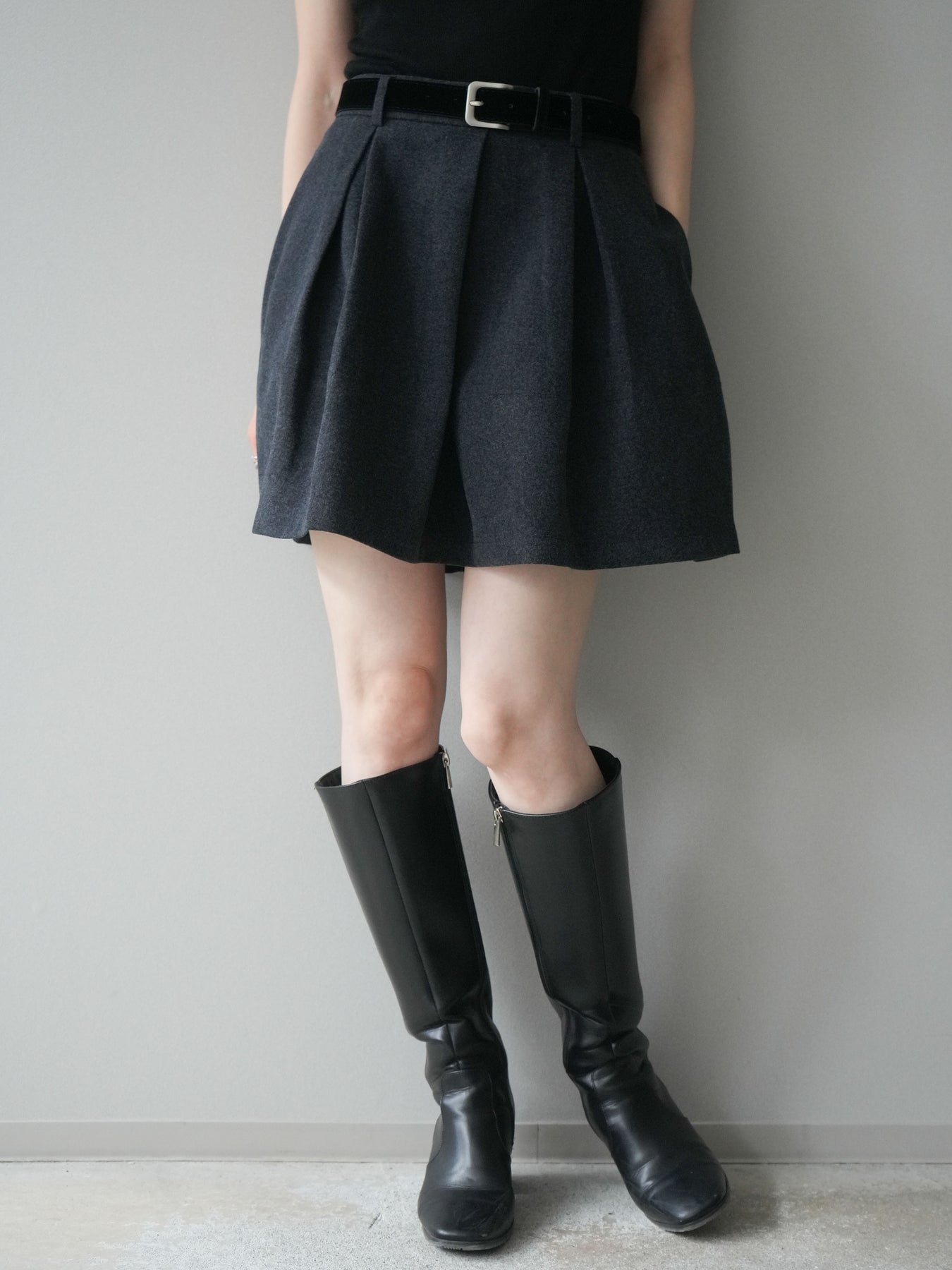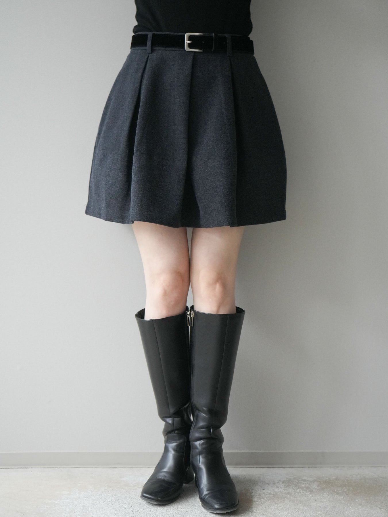 フロントに深めのタックを施し、立体感のあるシルエットに仕上げたミニスカート。ほどよいハリのある素材が美しいAラインをキープし、脚をすっきりと見せてくれます。ウエストには上品なベルトをセットし、スタイリングのアクセントになるだけでなく、スタイルアップ効果もプラス。ブーツやパンプスなど幅広いシューズと相性が良く、シンプルなトップスを合わせるだけで大人らしいバランスに仕上がる万能アイテムです。