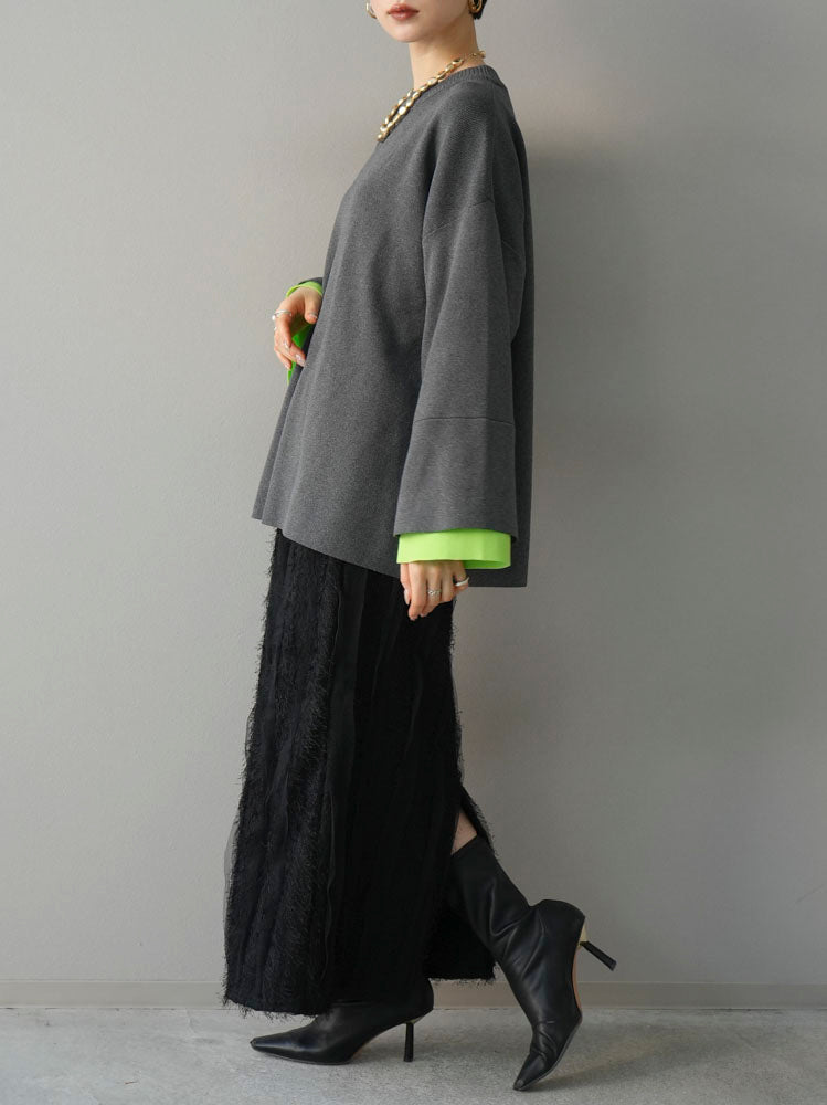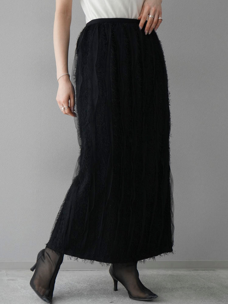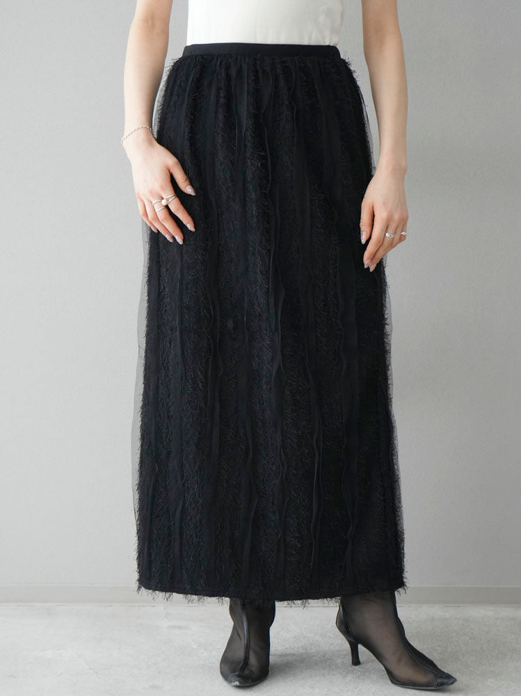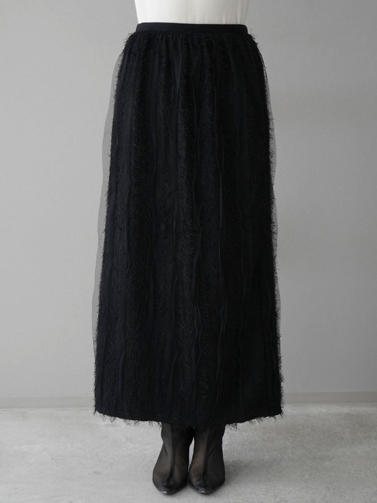 チュールとフリンジの掛け合わせが印象的なロングスカート。軽やかな素材感も相まって春からのスタイリングにもピッタリです。ウエスト部分はゴム仕様でフィット感が優しく、縦長のシルエットがレッグラインをスッキリと見せてくれます。存在感があるためシンプルなトップスを合わせるだけで、おしゃれ見えするコーディネートがかないます。
