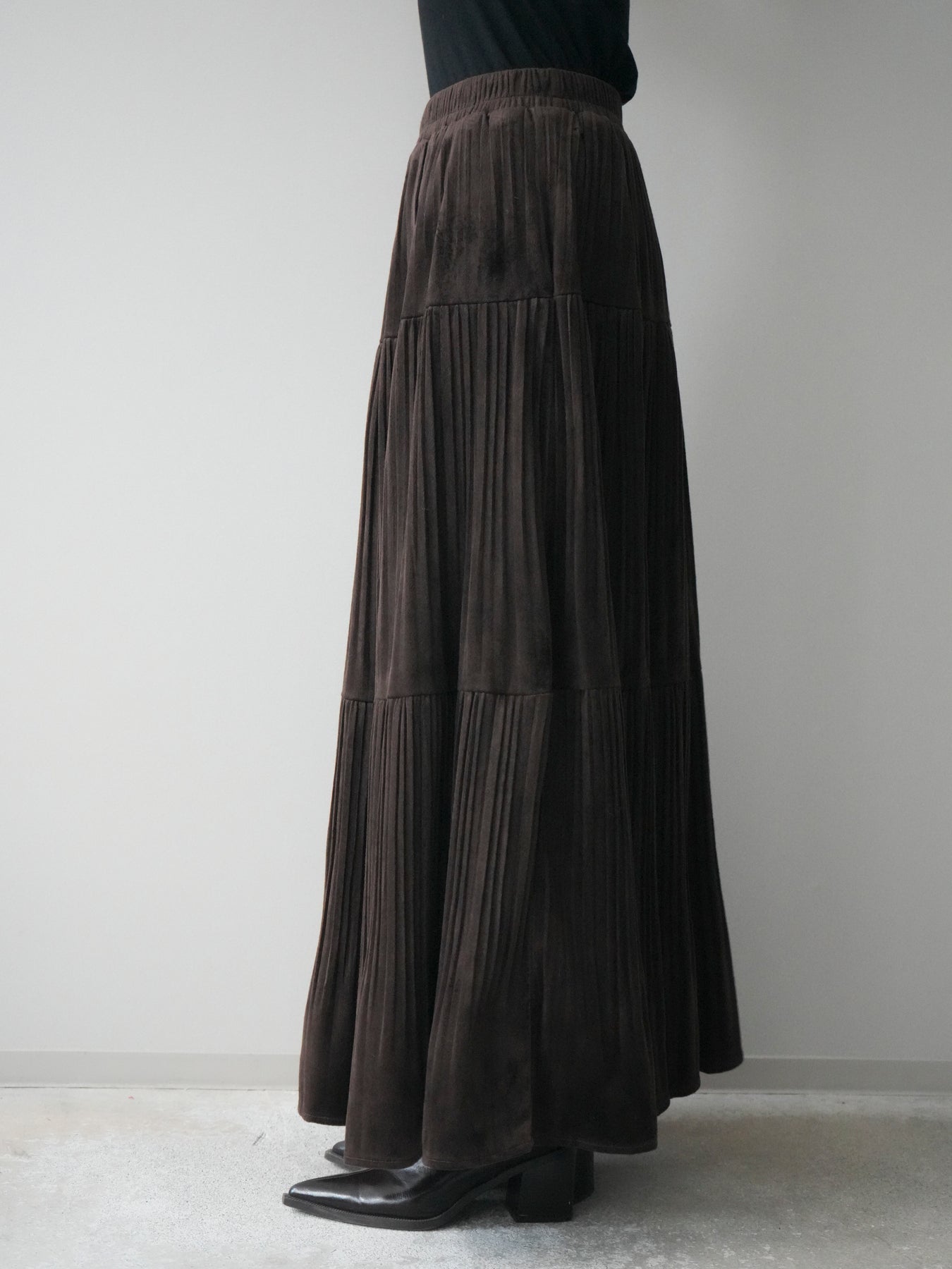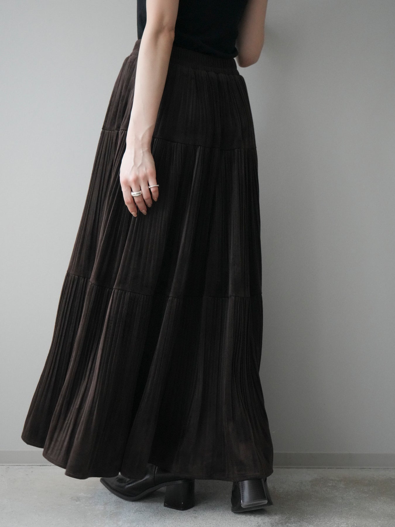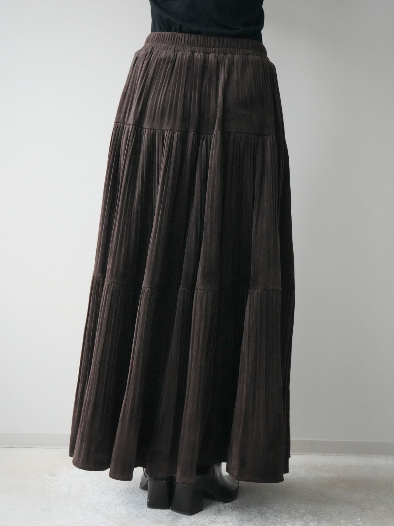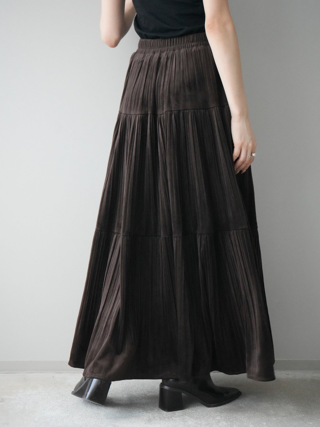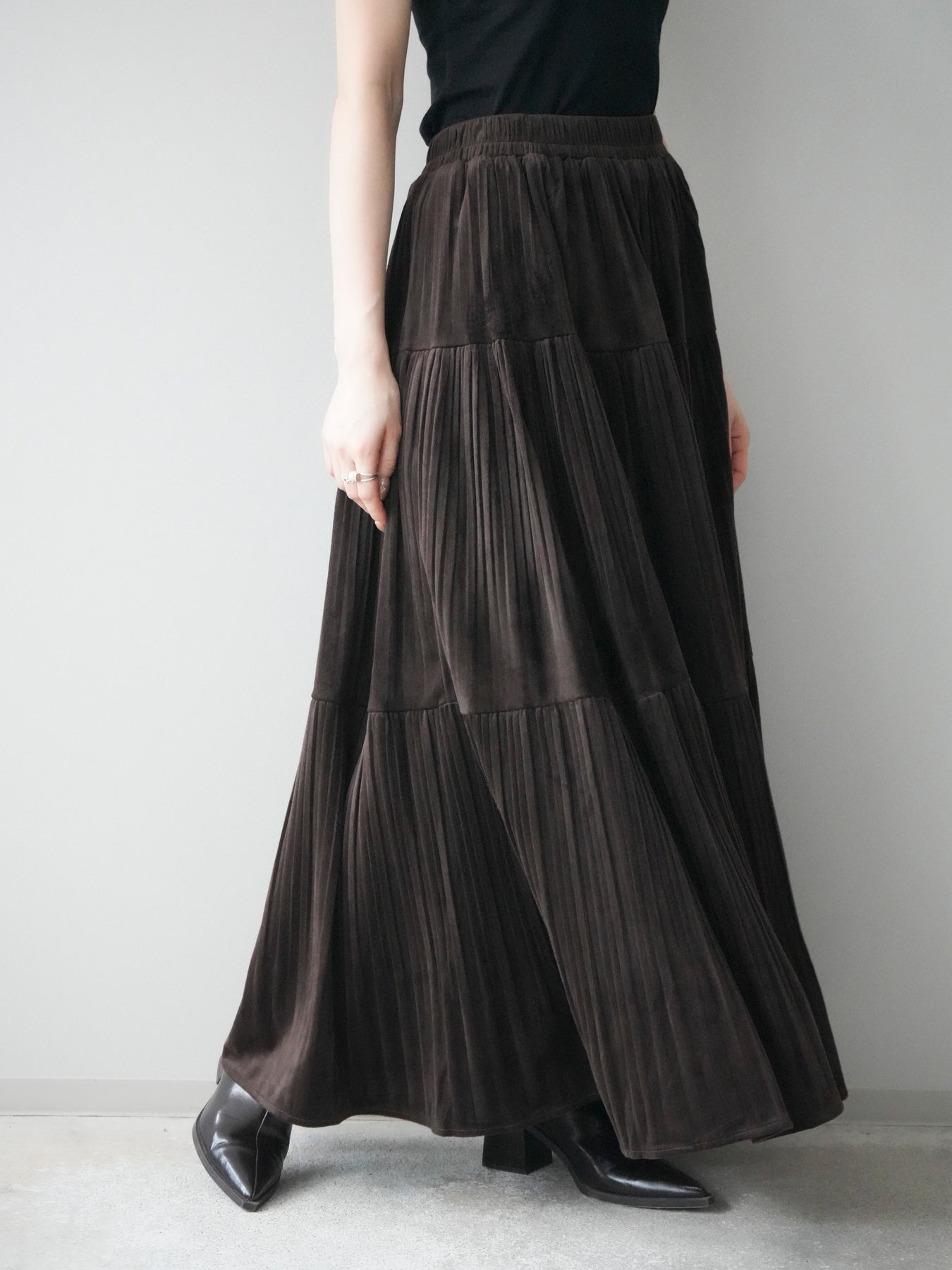 上品な光沢感のあるベロア素材に、ワッシャー加工を施した表情豊かなティアードスカート。 動くたびに陰影が生まれ、シンプルながらも奥行きのあるスタイリングを演出します。 ティアード切り替えによる自然な広がりが、女性らしい柔らかな印象をプラス。 甘くなりすぎない落ち感のあるシルエットで、カジュアルにもきれいめにも馴染みます。 ニットやスウェット、ブラウスなど合わせるトップス次第で幅広い着こなしが可能。 シーズンムードを高めつつ、コーディネートの主役として活躍してくれる一枚です。