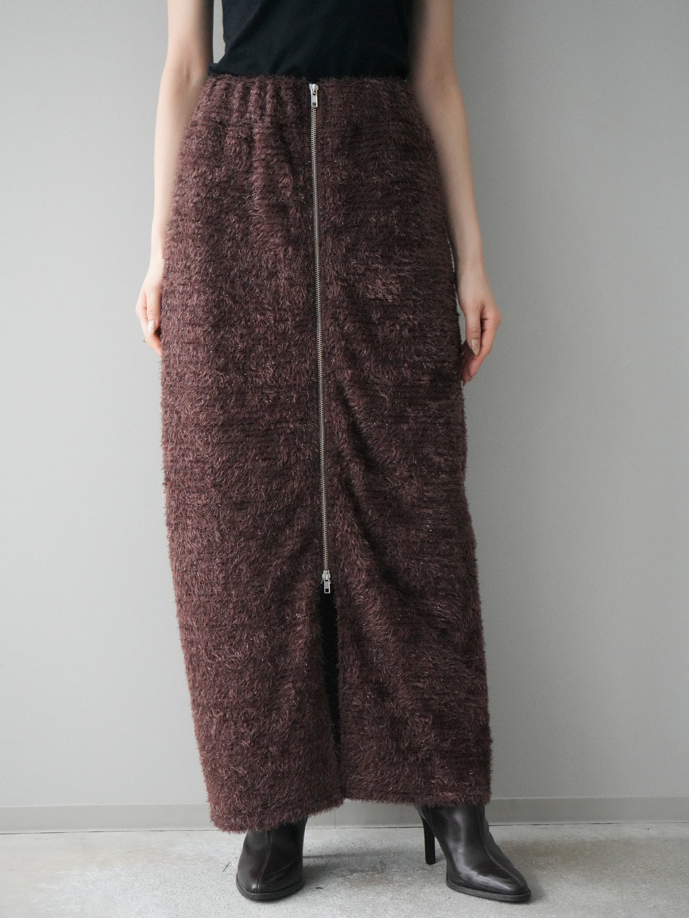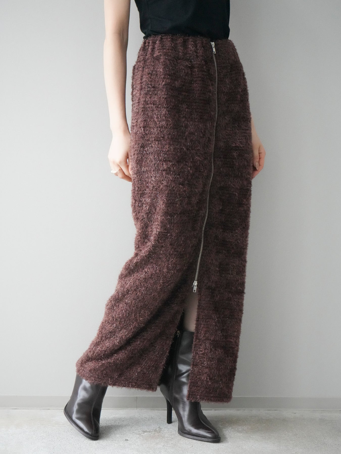 ラメ糸を織り込んだシャギー素材が、動くたびに上品な輝きを放つスカート。 毛足のある表情豊かな生地感が、シンプルなシルエットに奥行きを与え、コーディネートを印象的に仕上げます。 フロントにあしらわれたジップデザインが、縦のラインを強調し、すっきりとした印象に。 程よく落ち感のあるシルエットで、甘くなりすぎず大人っぽく着こなせる一着です。 ニットやスウェット、シャツまで幅広いトップスと相性が良く、 季節感と華やかさをプラスしたスタイリングが楽しめるアイテムです。