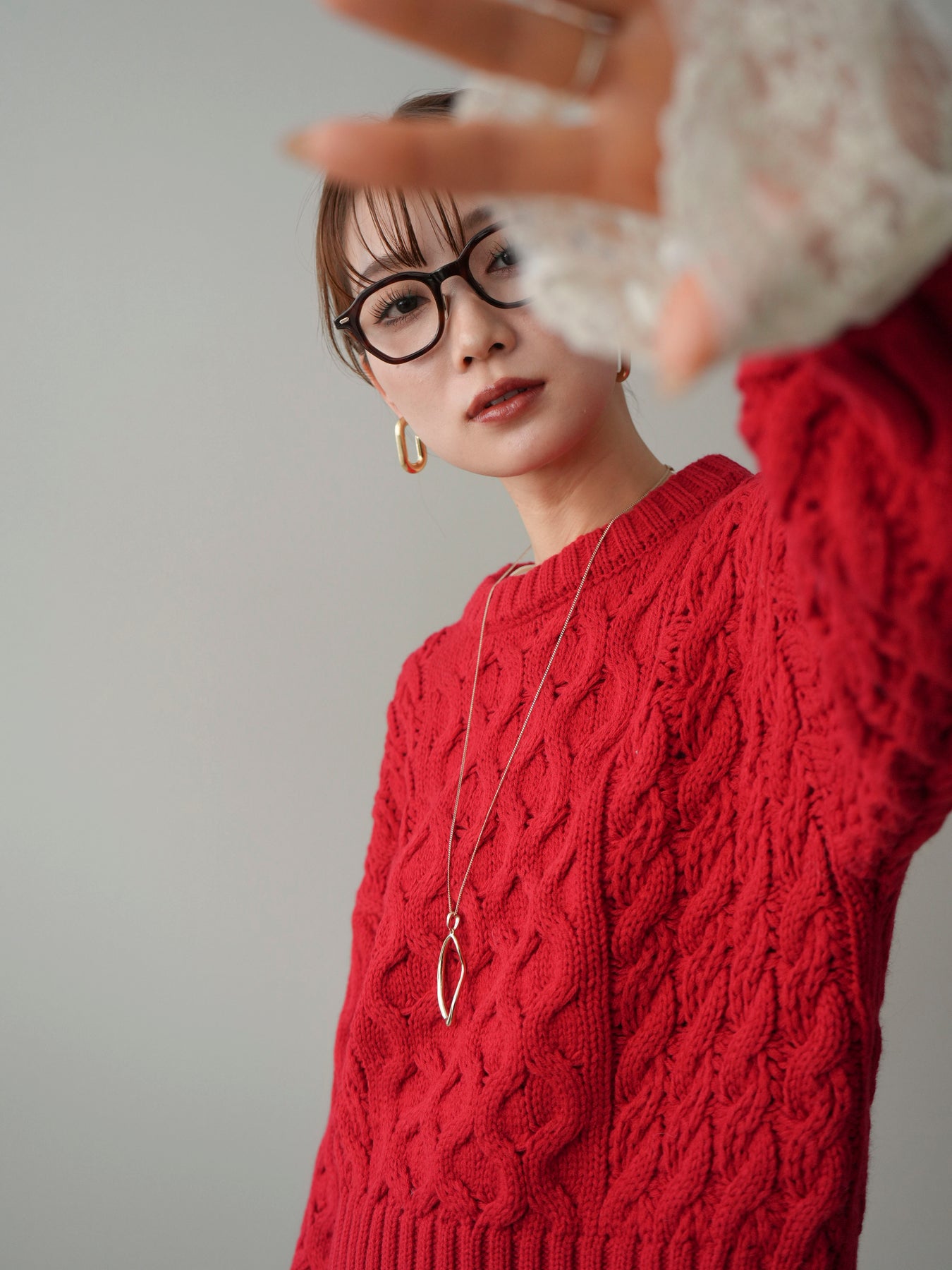 立体感のあるケーブル編みが目を惹く、存在感たっぷりのニットプルオーバー。 バルキーな編み地がシーズンムードを高め、着るだけでコーディネートに温かみと奥行きをプラスします。 程よくボリュームのあるスリーブと、バランスの取りやすいクロップド丈が特徴。 コンパクトな丈感ながら、立体的なシルエットでラフになりすぎず、洗練された印象に仕上がります。 ハイウエストのボトムスやスカートとも相性が良く、 シンプルなスタイリングでも主役として活躍してくれる一着です。