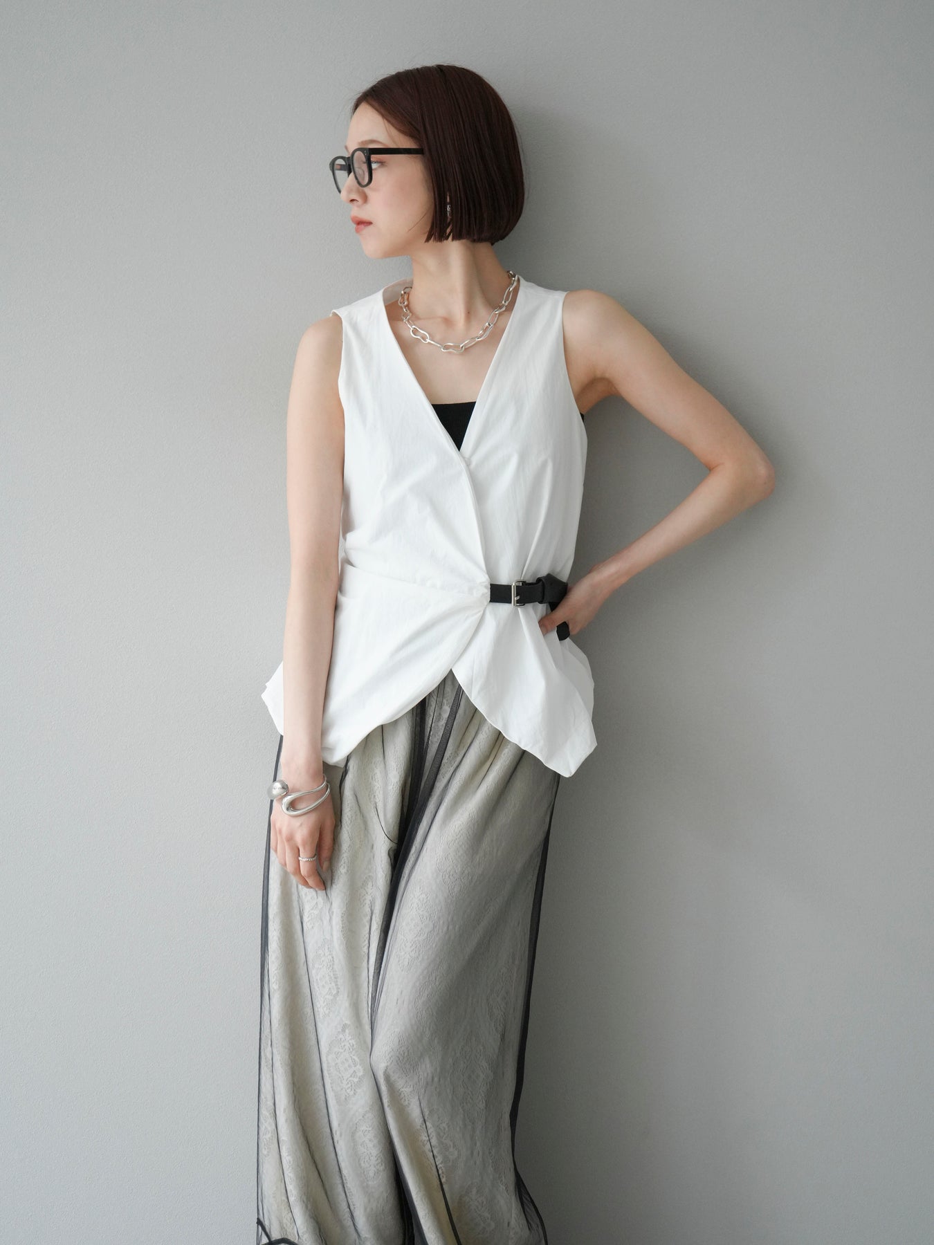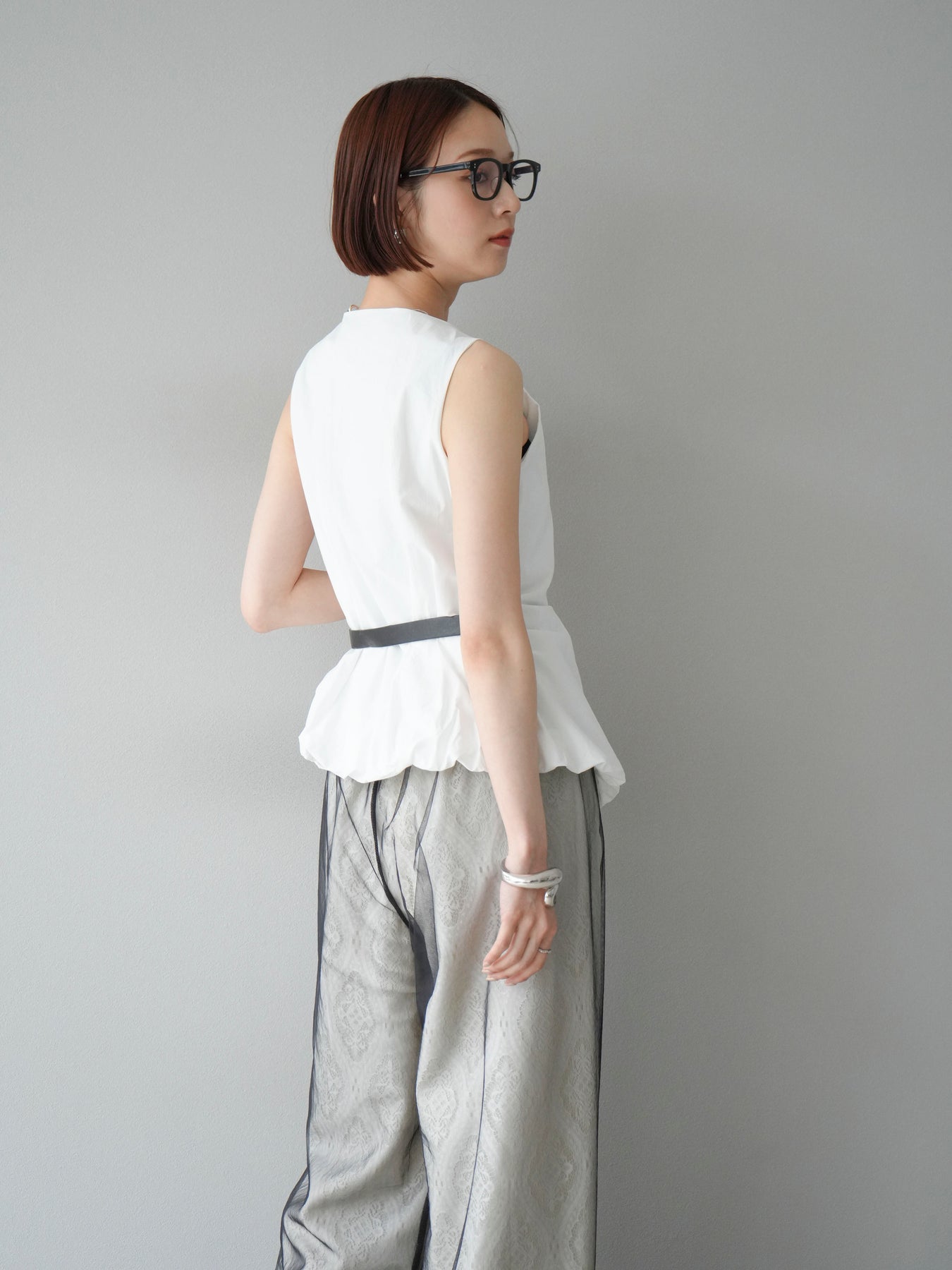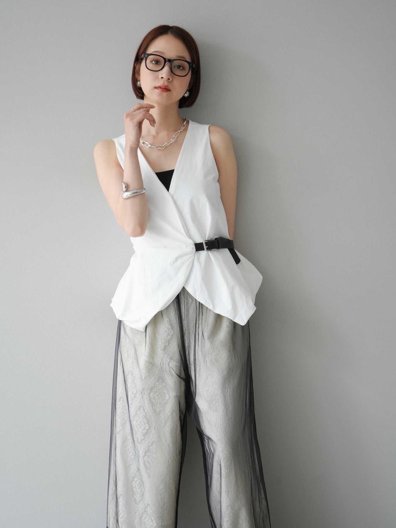 [SET]ベルトデザインバルーンブラウス+レースタックイージーパンツ+コード刺繍チュールレイヤードパンツ(3set)