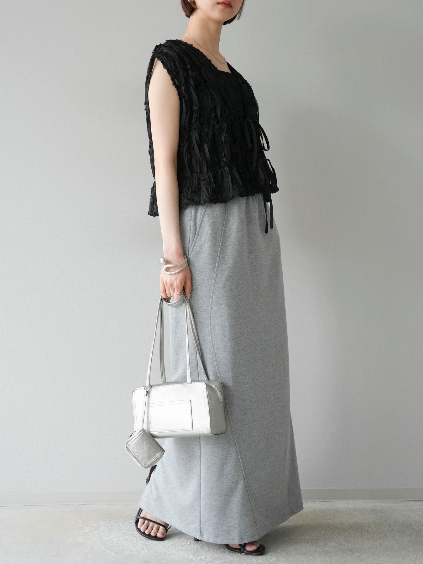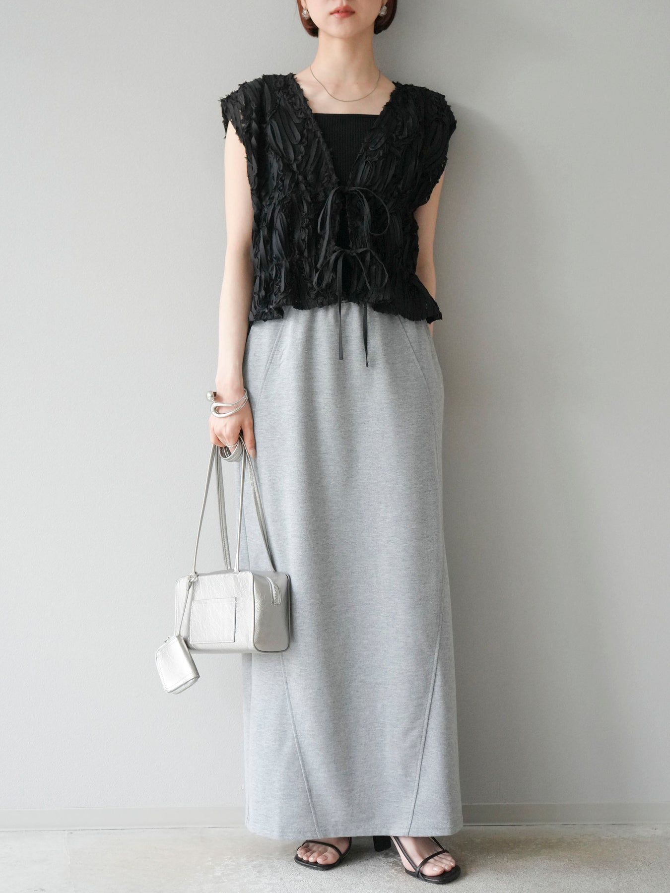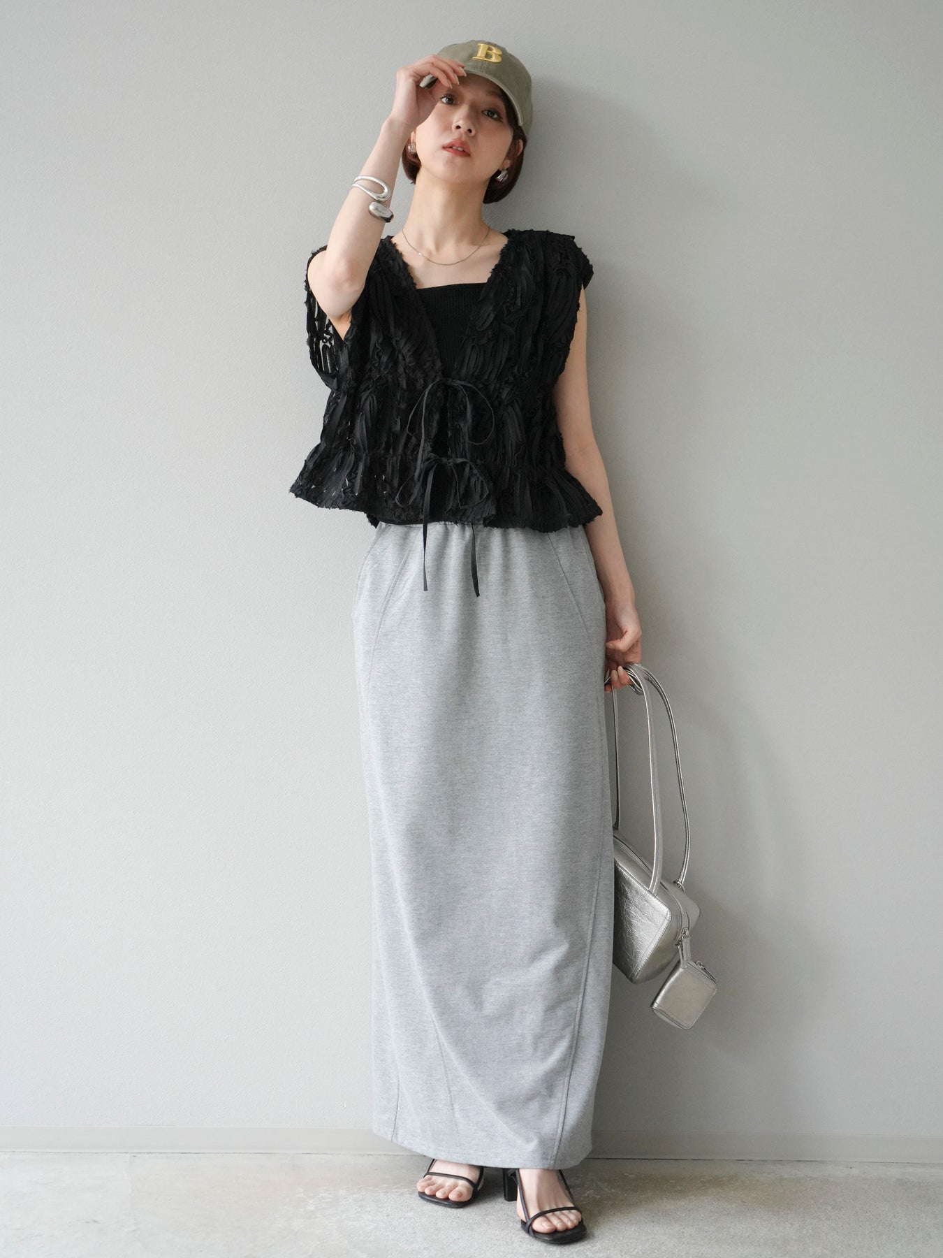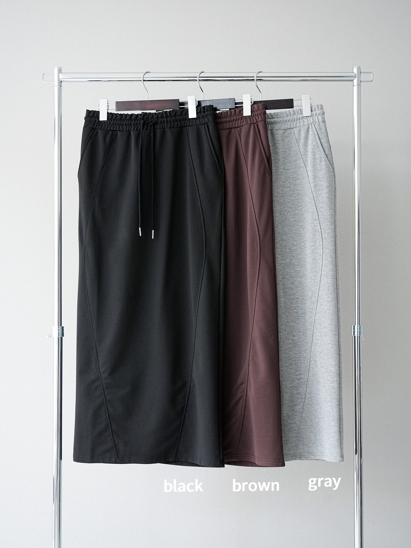 程よい厚みと柔らかな肌触りが魅力の、スウェットロングスカート。カジュアルなスウェット素材ながらも、縦に入った切替ラインがスタイルアップを叶え、すっきりとしたIラインシルエットを演出します。ウエストは総ゴム&ドロスト仕様で、リラクシーかつ快適な履き心地。スニーカーを合わせてラフに着こなすのはもちろん、ヒールやシャツと合わせてきれいめカジュアルにも。シーズンレスで活躍する、万能なデイリーボトムです。 ※ボトムス、キャミソール(インナー)以外の商品は一律でインナーは付属していません。