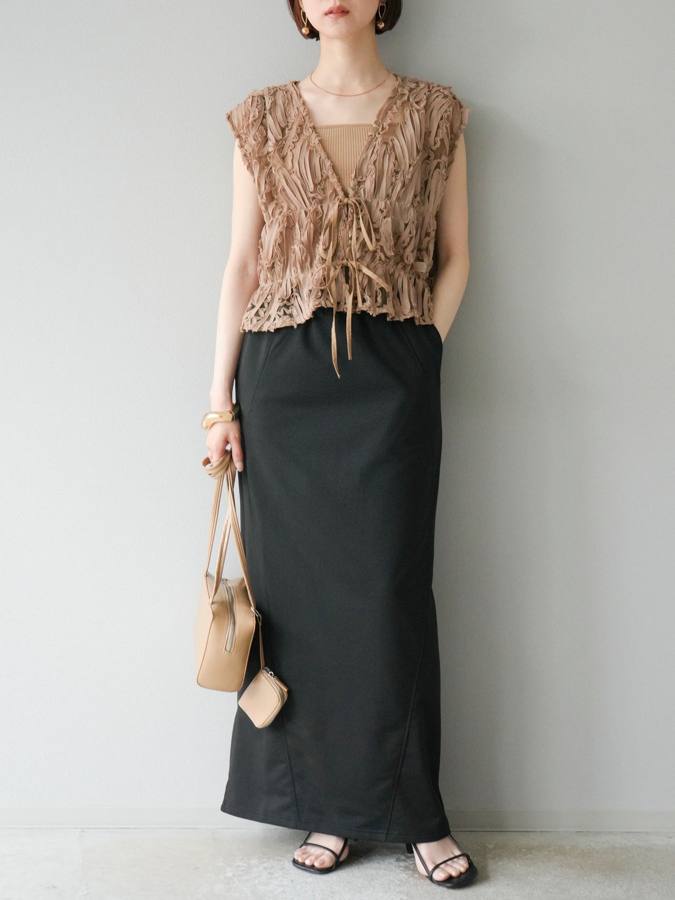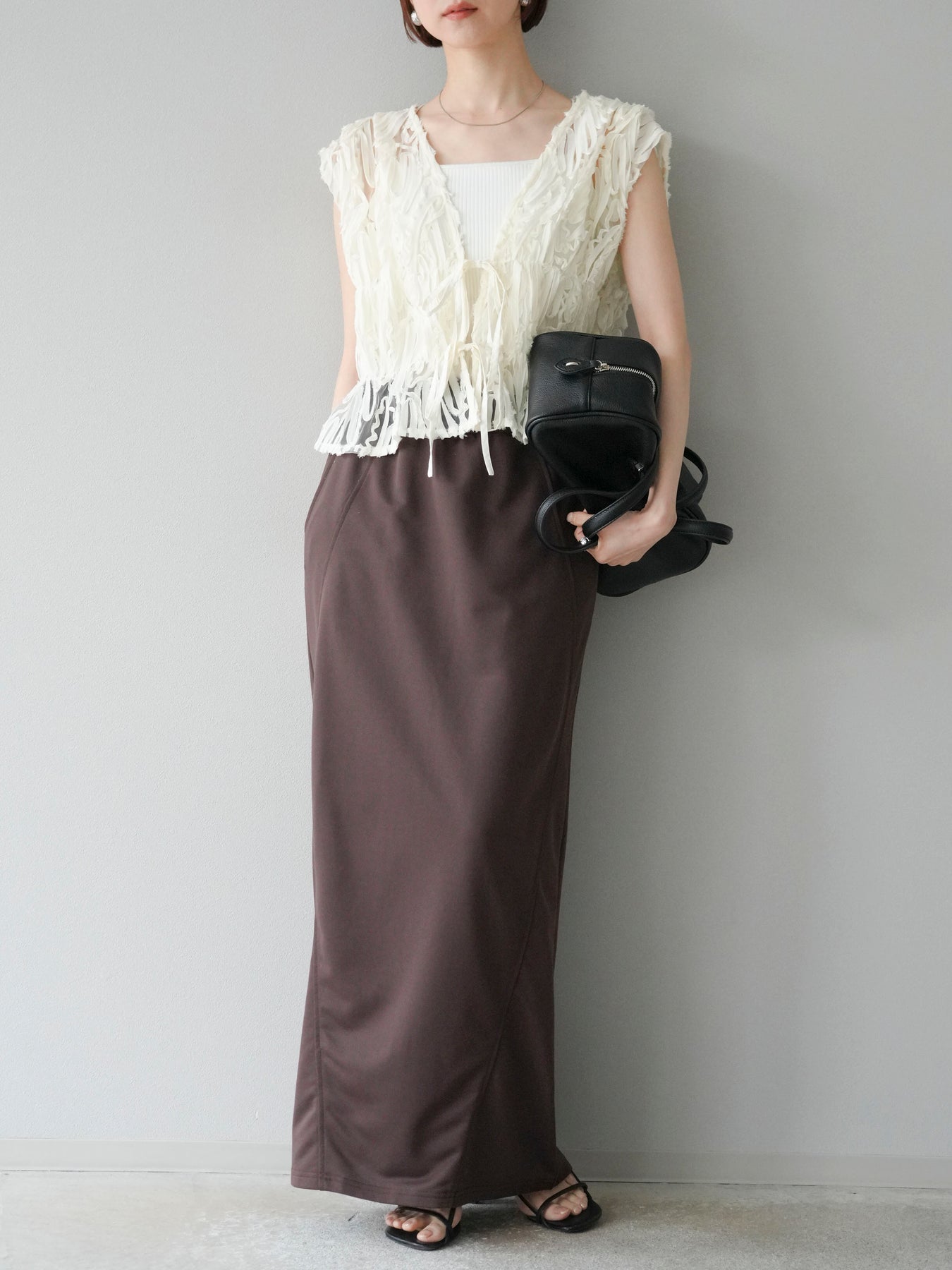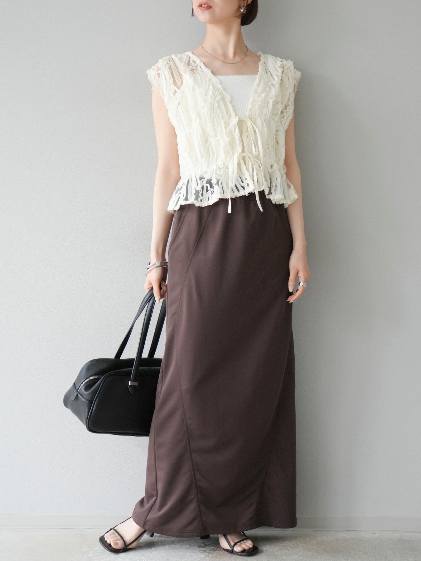 程よい厚みと柔らかな肌触りが魅力の、スウェットロングスカート。カジュアルなスウェット素材ながらも、縦に入った切替ラインがスタイルアップを叶え、すっきりとしたIラインシルエットを演出します。ウエストは総ゴム&ドロスト仕様で、リラクシーかつ快適な履き心地。スニーカーを合わせてラフに着こなすのはもちろん、ヒールやシャツと合わせてきれいめカジュアルにも。シーズンレスで活躍する、万能なデイリーボトムです。 ※ボトムス、キャミソール(インナー)以外の商品は一律でインナーは付属していません。