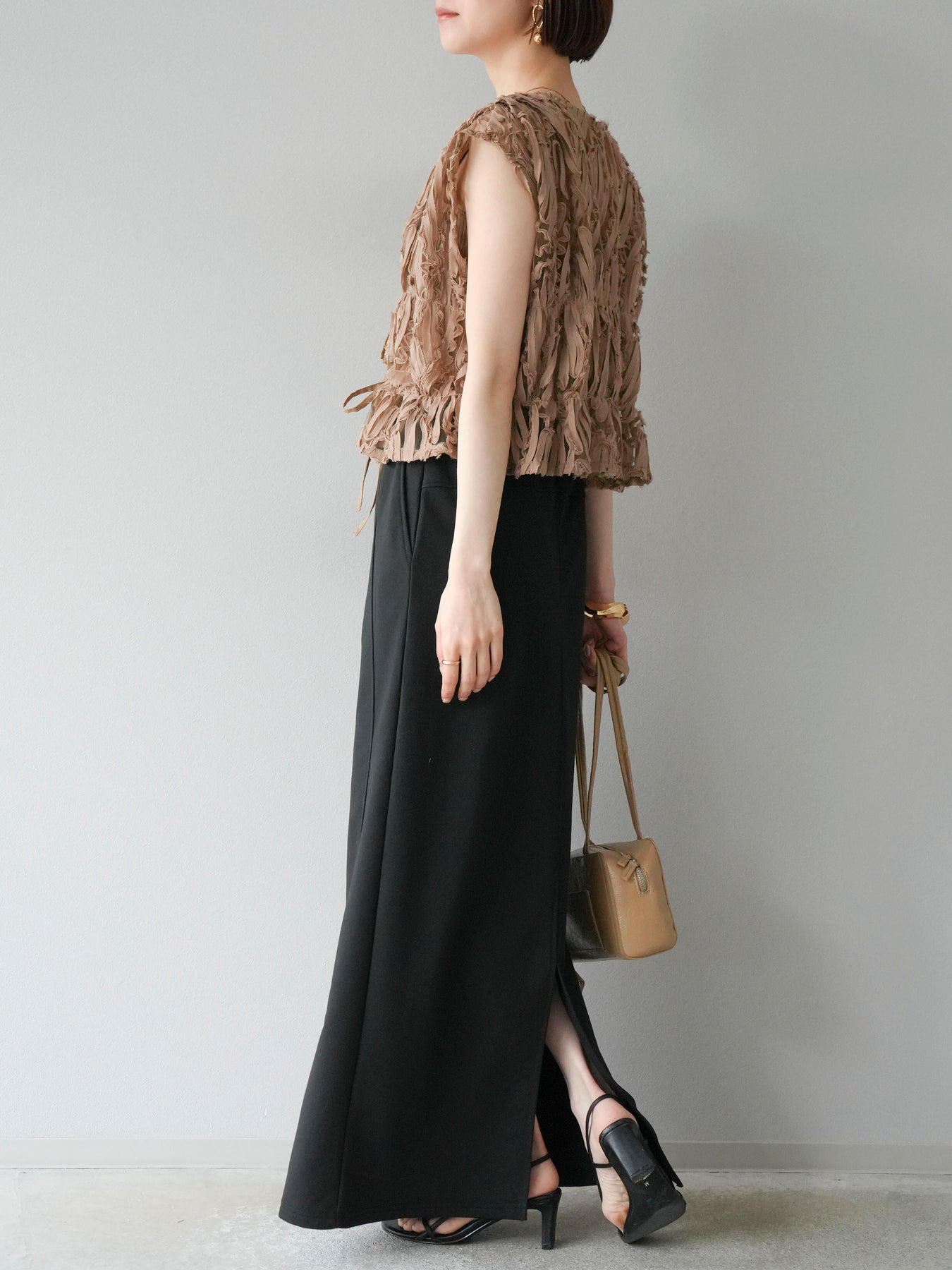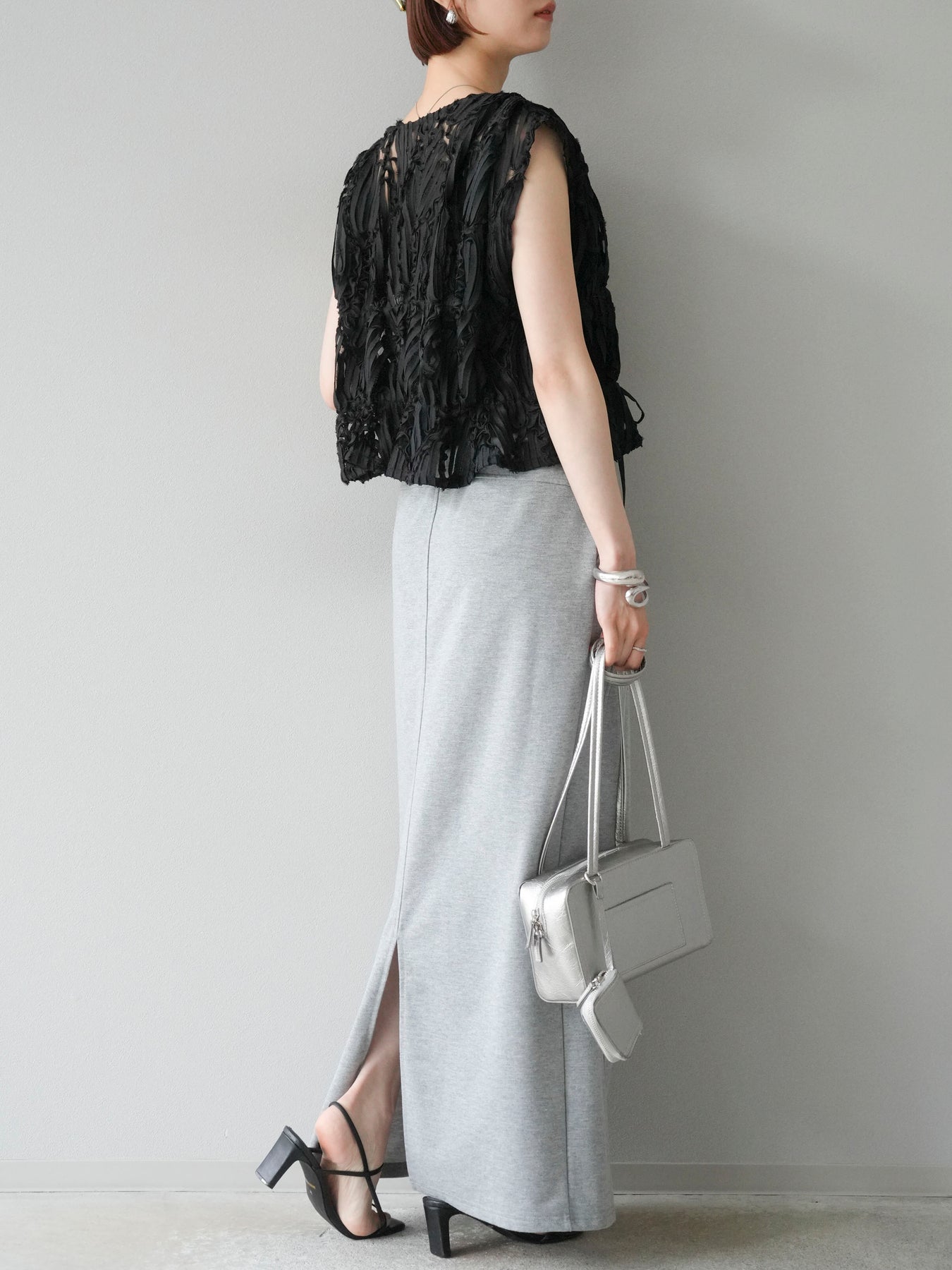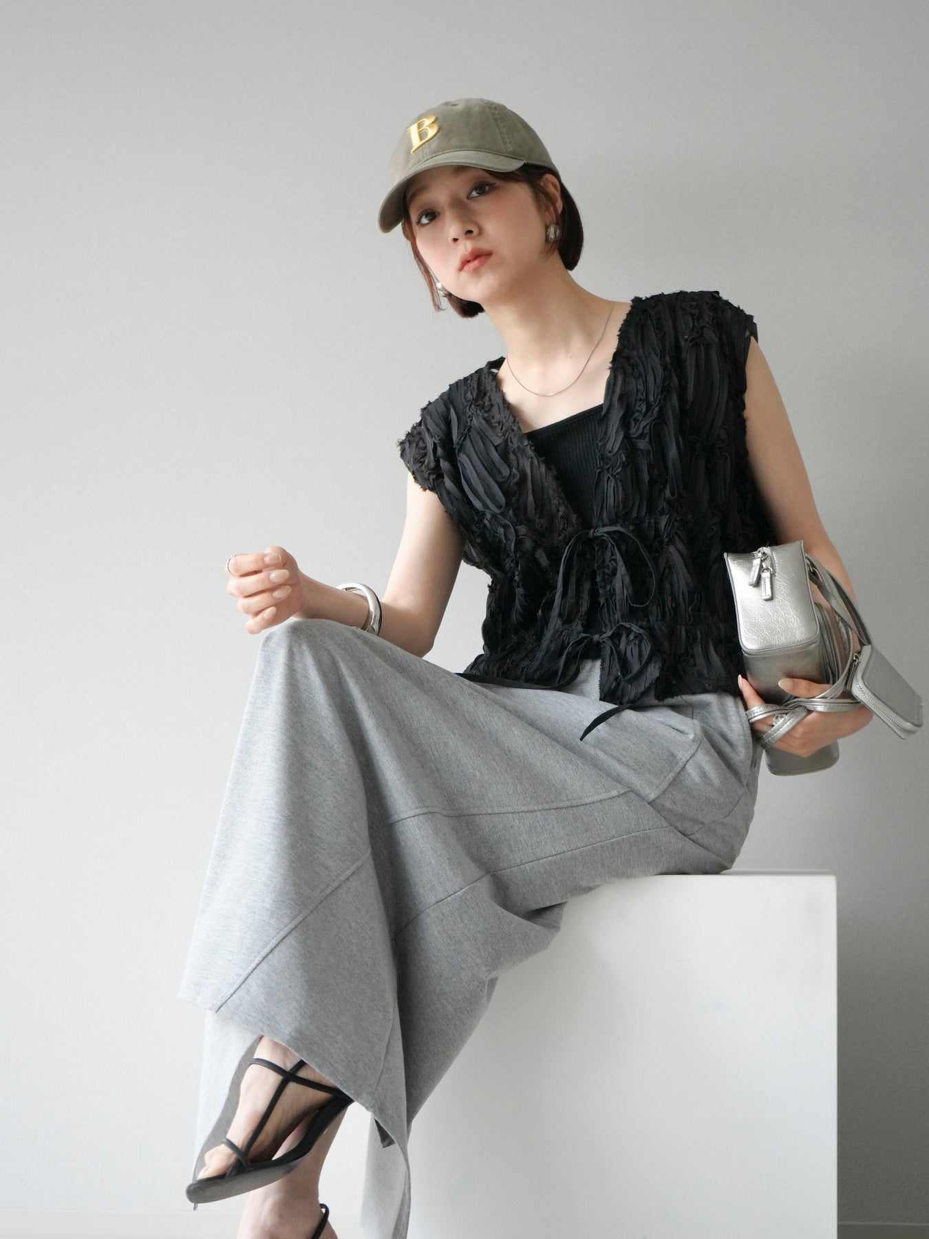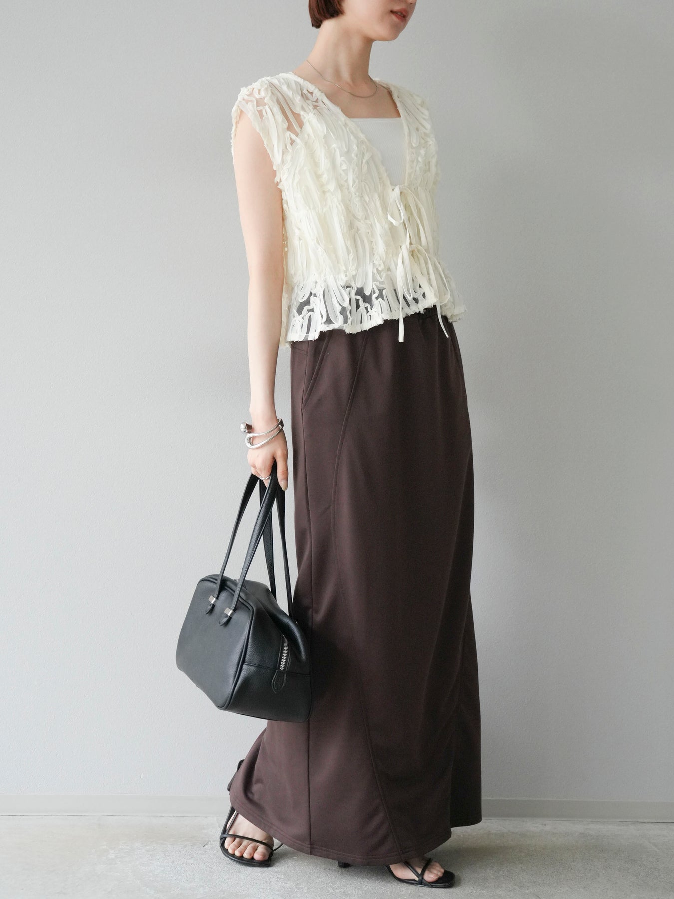 程よい厚みと柔らかな肌触りが魅力の、スウェットロングスカート。カジュアルなスウェット素材ながらも、縦に入った切替ラインがスタイルアップを叶え、すっきりとしたIラインシルエットを演出します。ウエストは総ゴム&ドロスト仕様で、リラクシーかつ快適な履き心地。スニーカーを合わせてラフに着こなすのはもちろん、ヒールやシャツと合わせてきれいめカジュアルにも。シーズンレスで活躍する、万能なデイリーボトムです。 ※ボトムス、キャミソール(インナー)以外の商品は一律でインナーは付属していません。