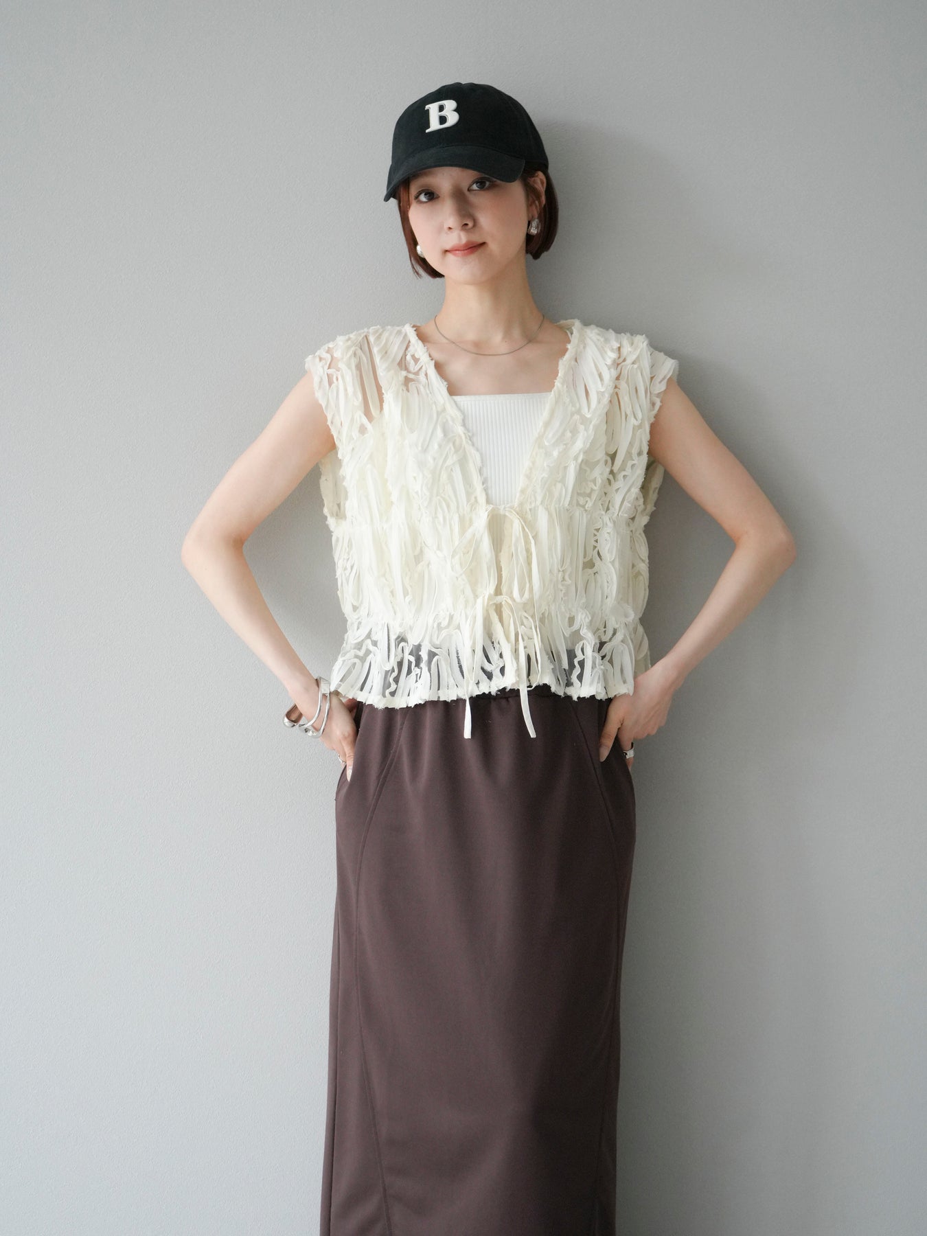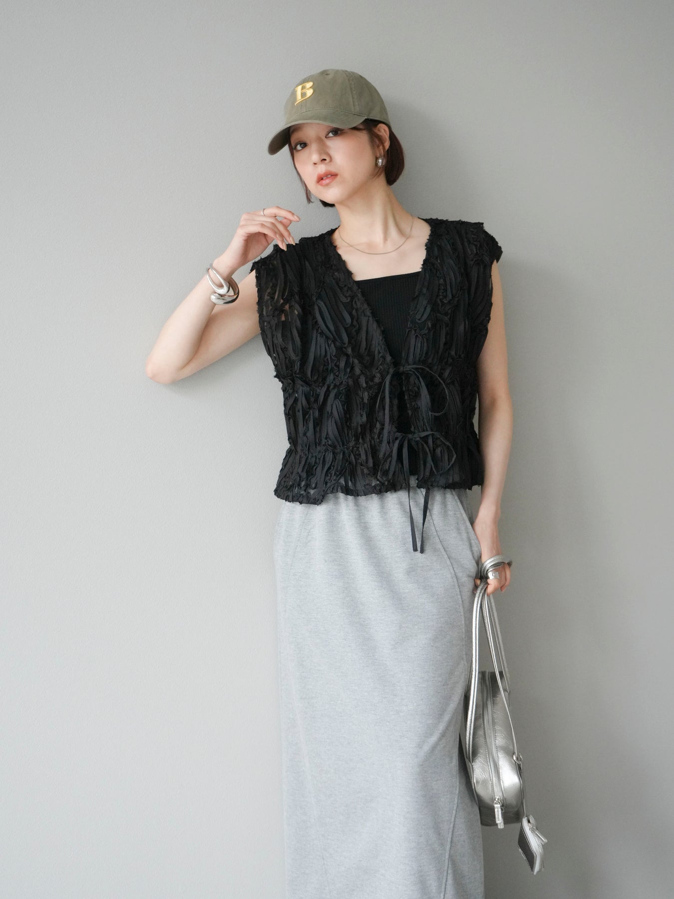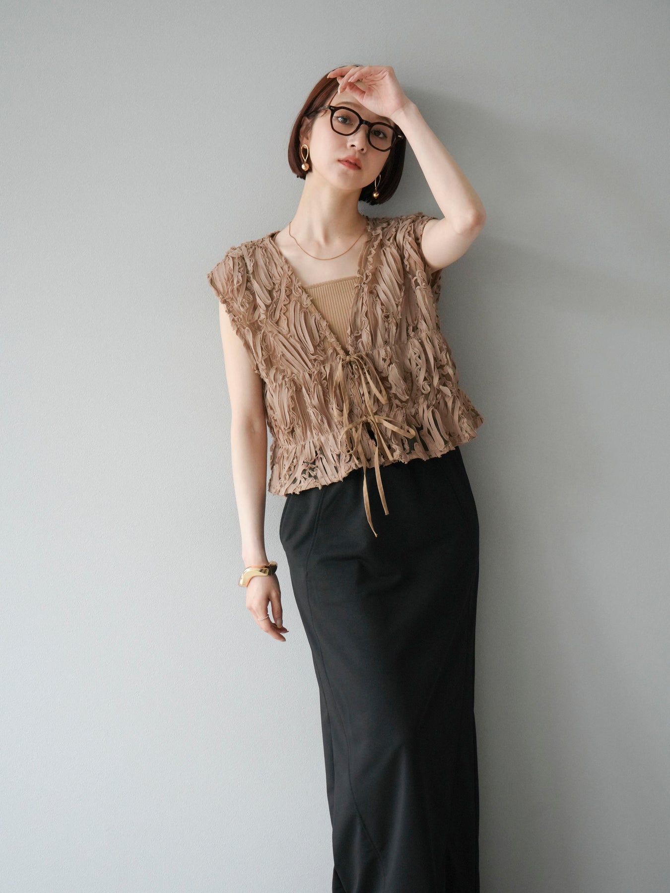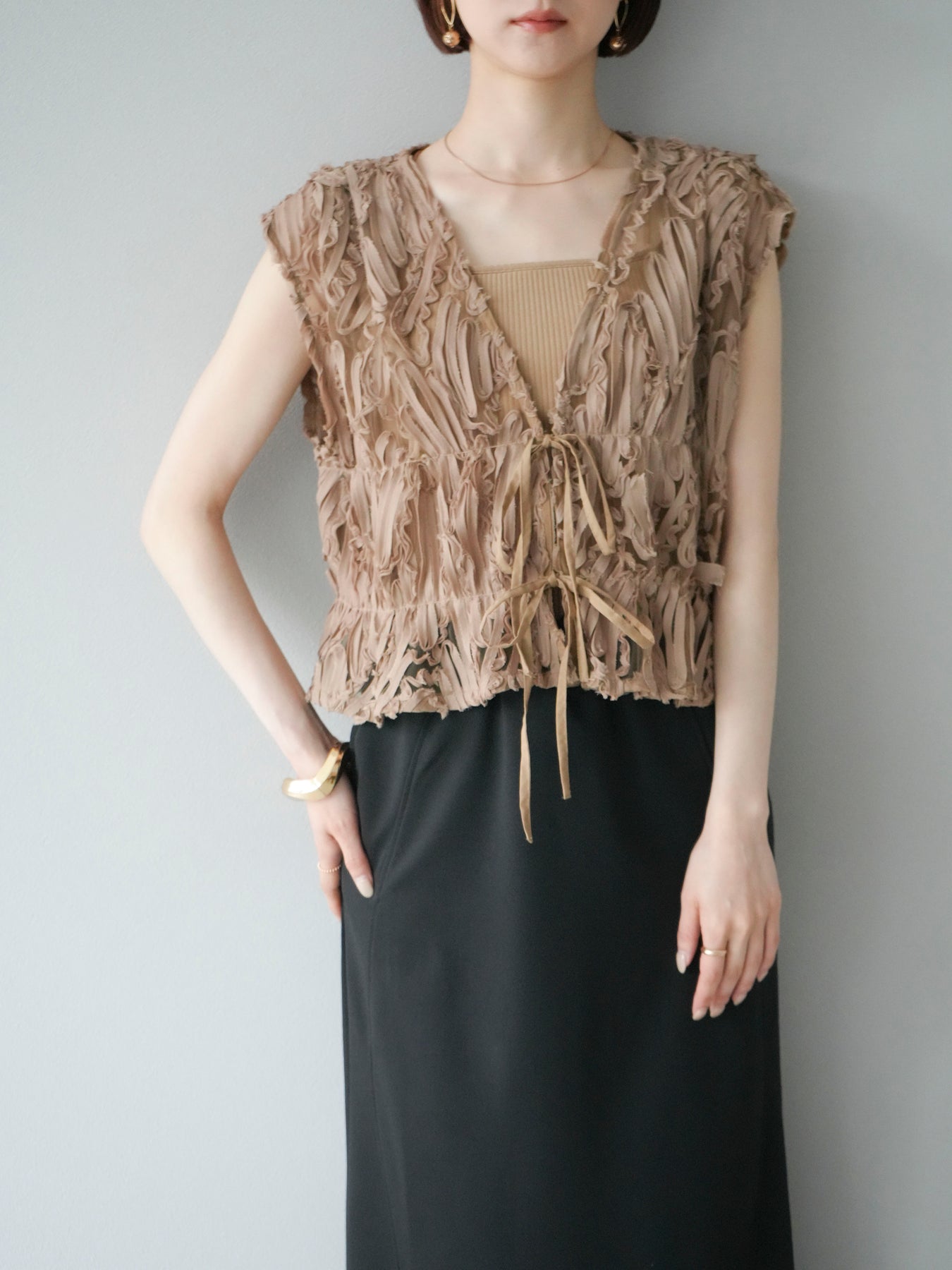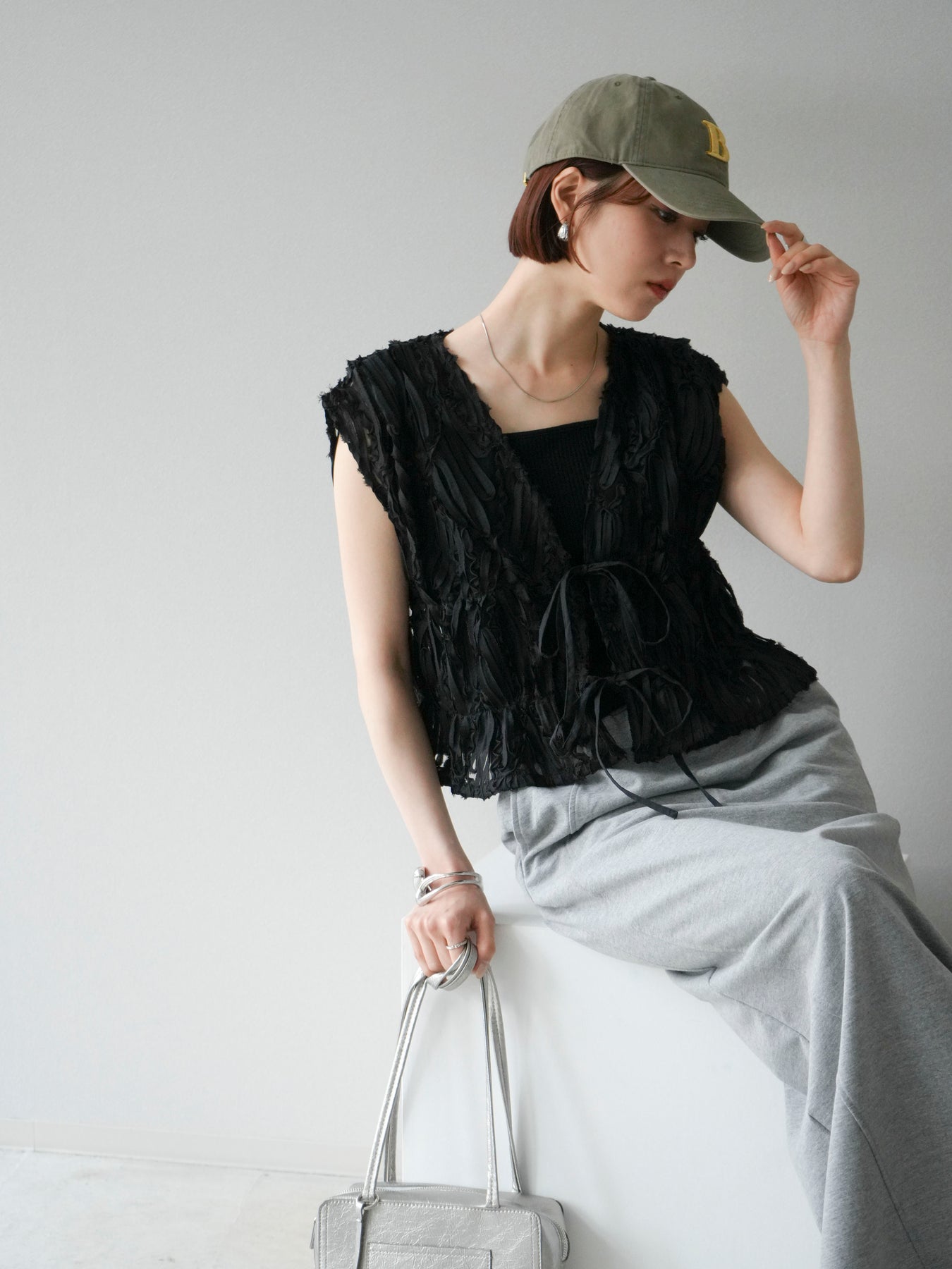 華やかなジャガードレースが目を引くデザイントップス。立体的な織り模様と繊細な透け感が、スタイリングに女性らしいニュアンスを加えます。フロントのリボンデザインは、結び方次第でシルエットの変化を楽しめ、着こなしの幅が広がる一着。キャミソールやタンクトップとのレイヤードがおすすめです。 ※ボトムス、キャミソール(インナー)以外の商品は一律でインナーは付属していません