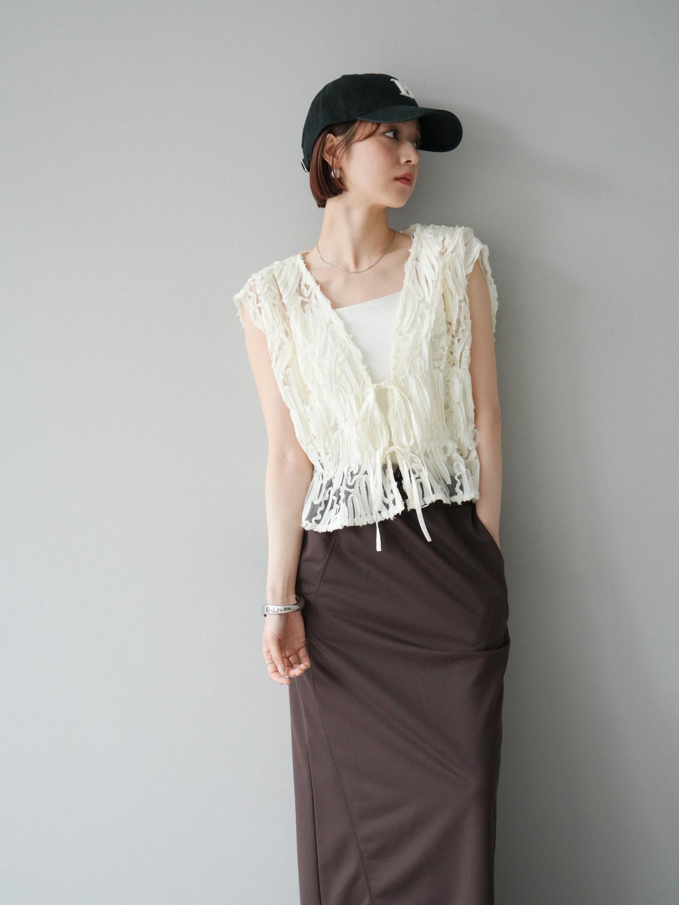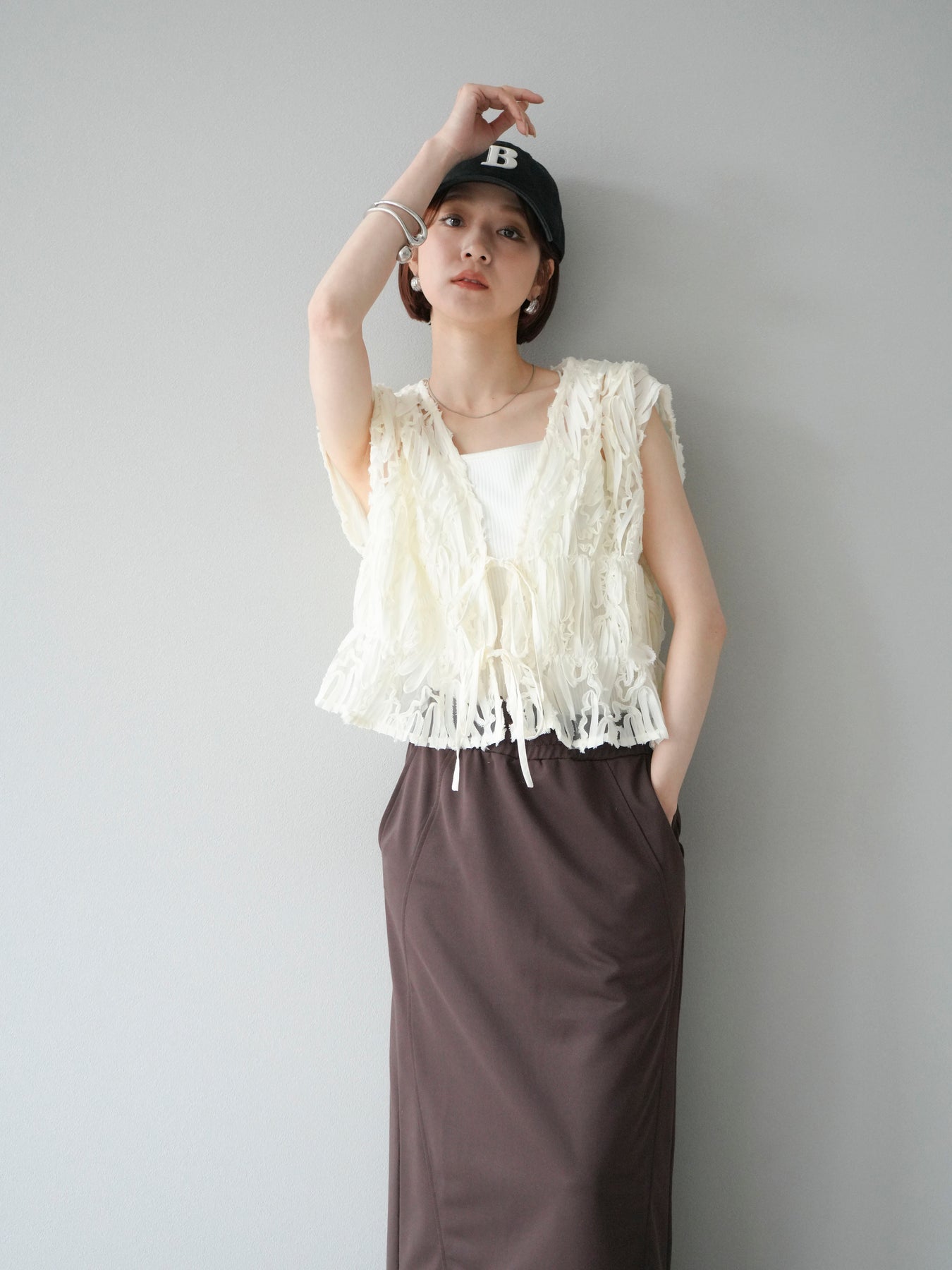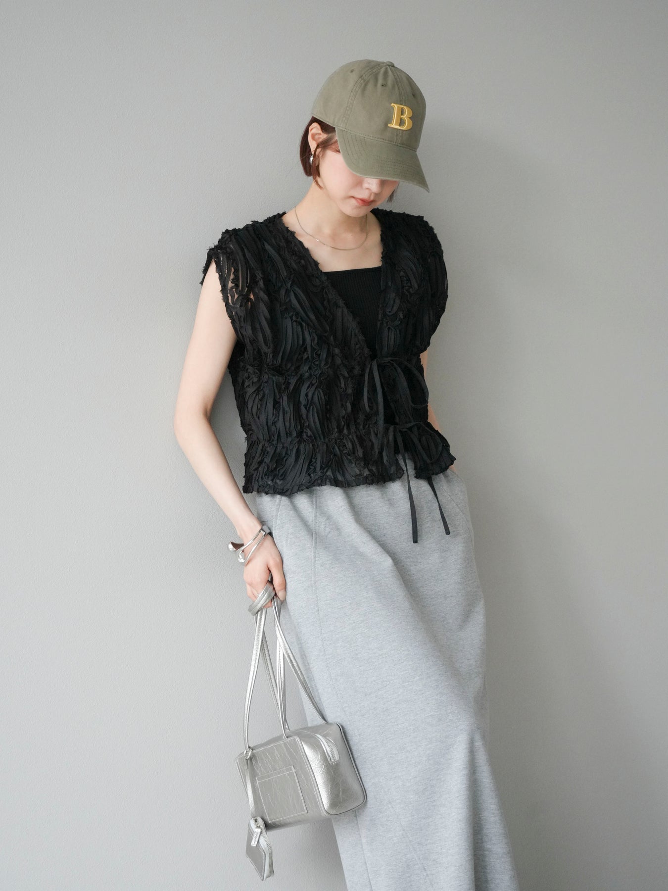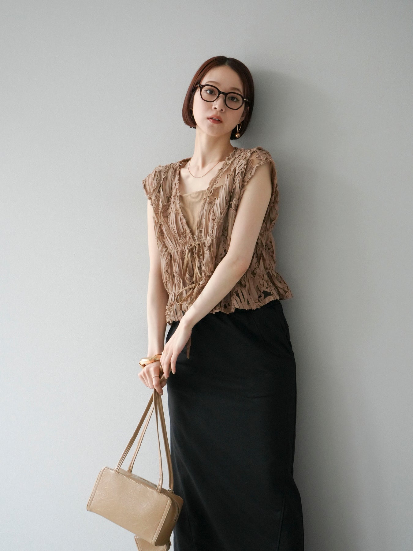 華やかなジャガードレースが目を引くデザイントップス。立体的な織り模様と繊細な透け感が、スタイリングに女性らしいニュアンスを加えます。フロントのリボンデザインは、結び方次第でシルエットの変化を楽しめ、着こなしの幅が広がる一着。キャミソールやタンクトップとのレイヤードがおすすめです。 ※ボトムス、キャミソール(インナー)以外の商品は一律でインナーは付属していません