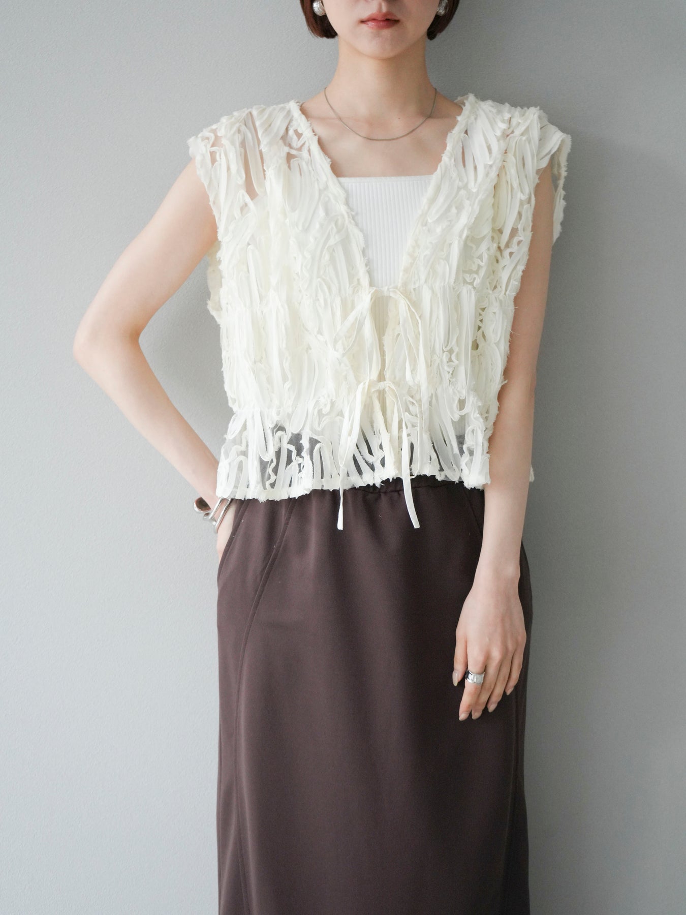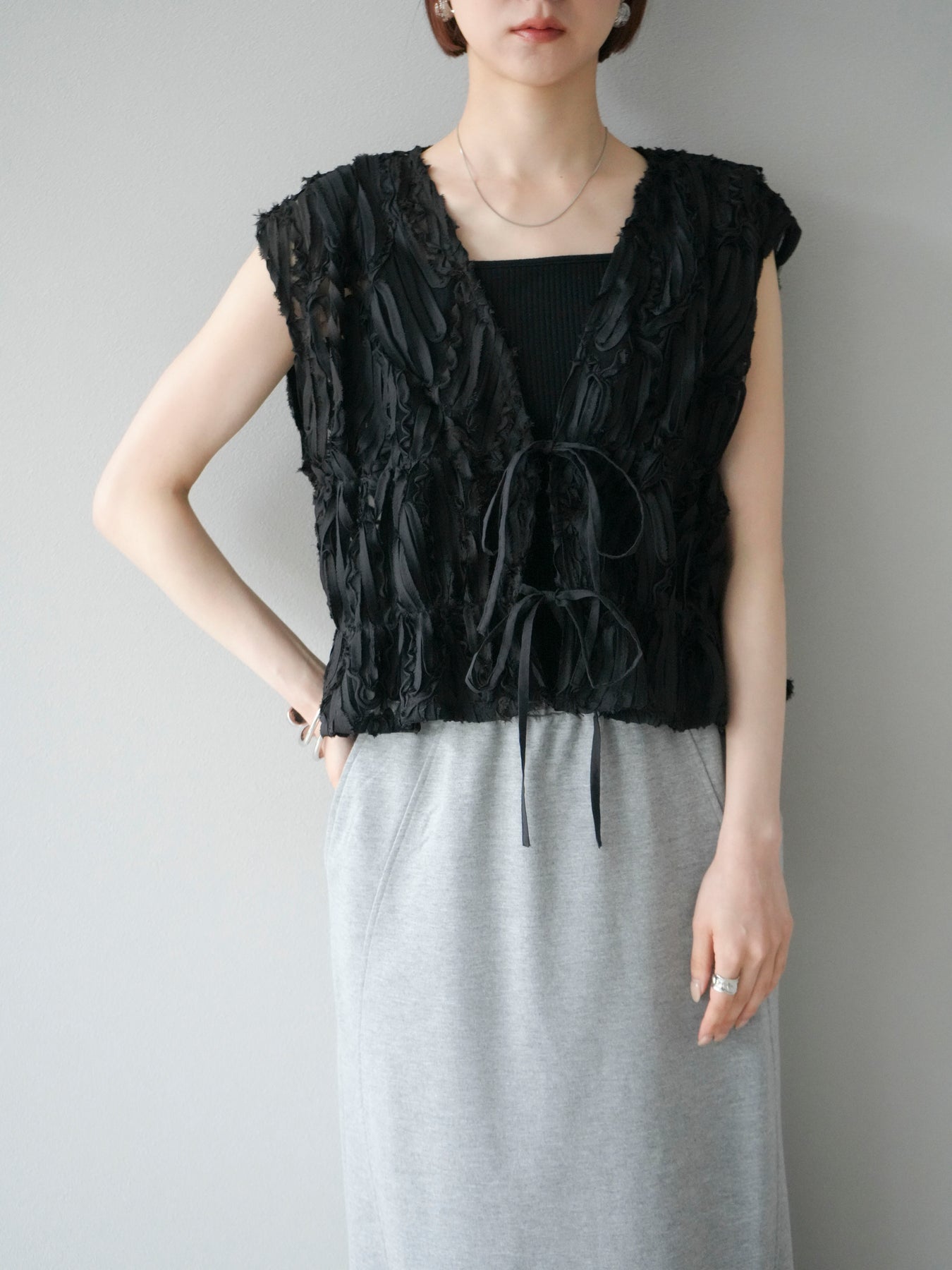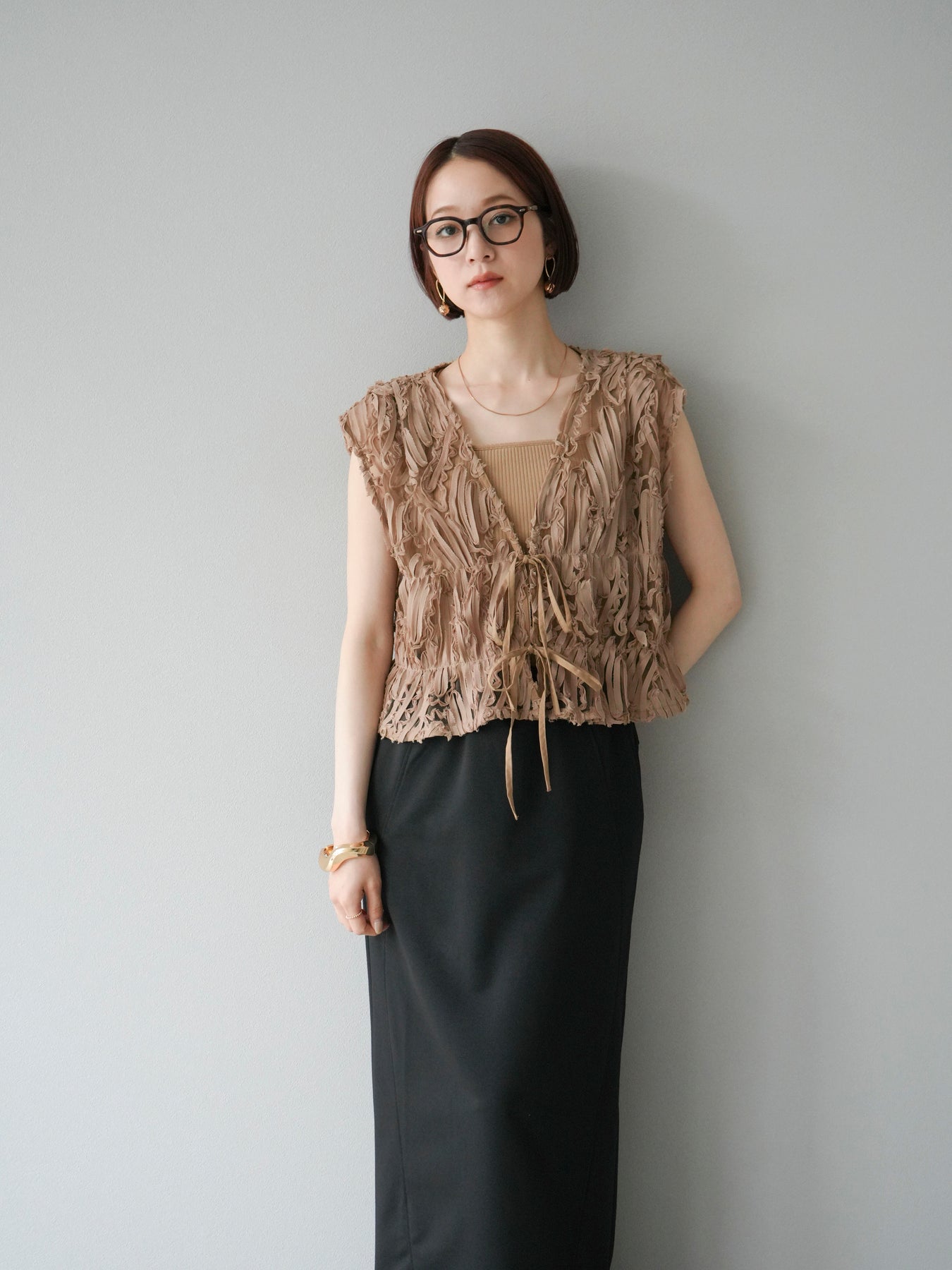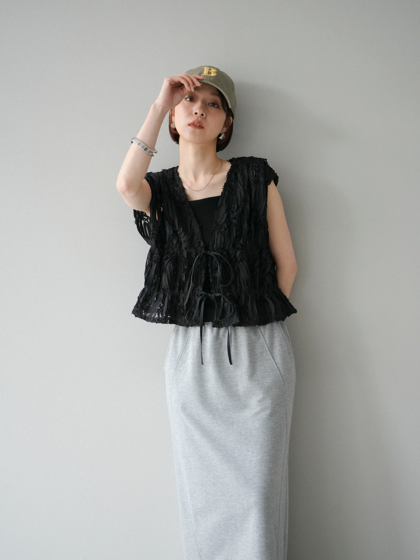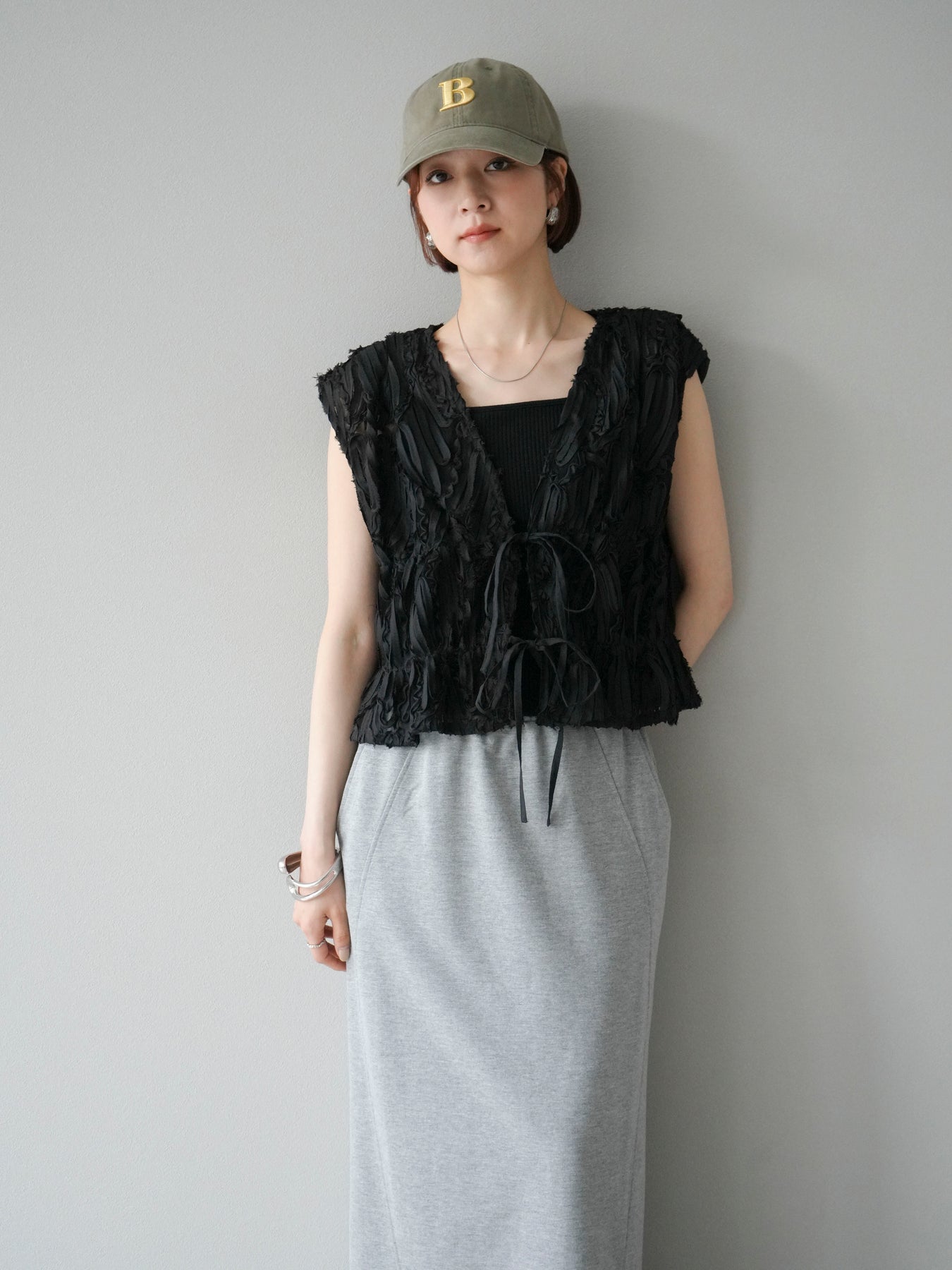 華やかなジャガードレースが目を引くデザイントップス。立体的な織り模様と繊細な透け感が、スタイリングに女性らしいニュアンスを加えます。フロントのリボンデザインは、結び方次第でシルエットの変化を楽しめ、着こなしの幅が広がる一着。キャミソールやタンクトップとのレイヤードがおすすめです。 ※ボトムス、キャミソール(インナー)以外の商品は一律でインナーは付属していません