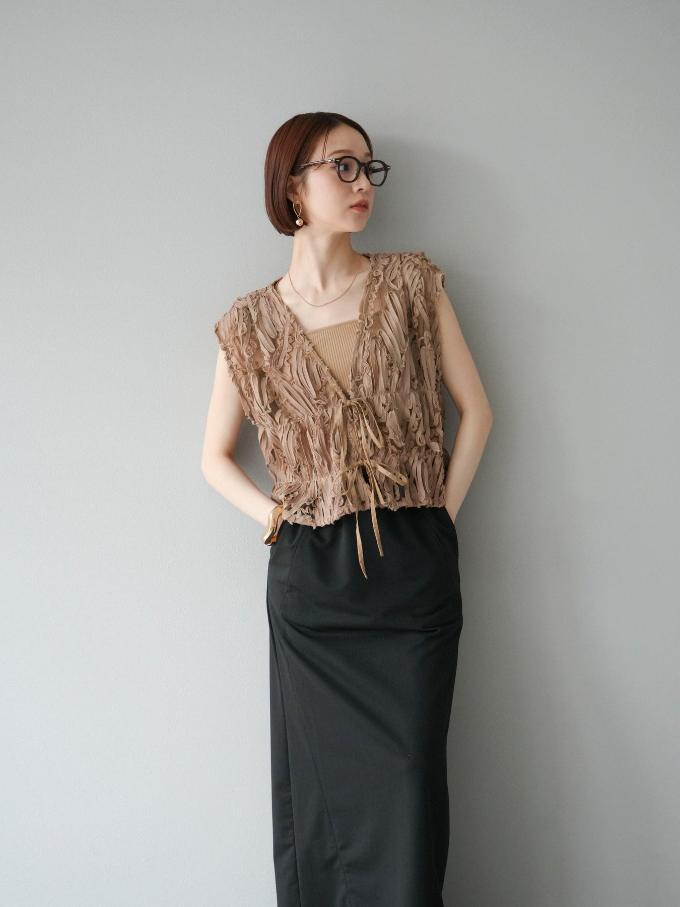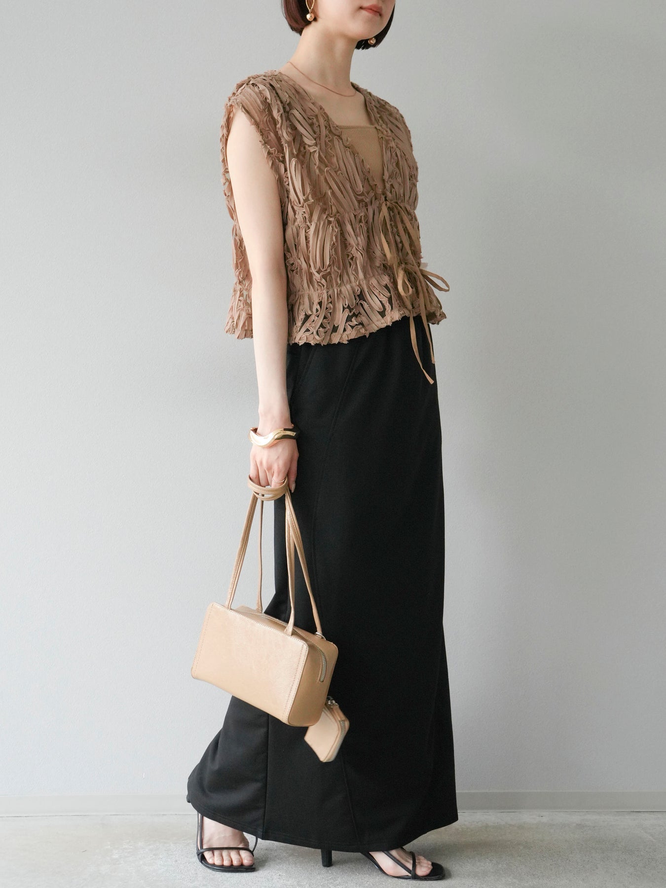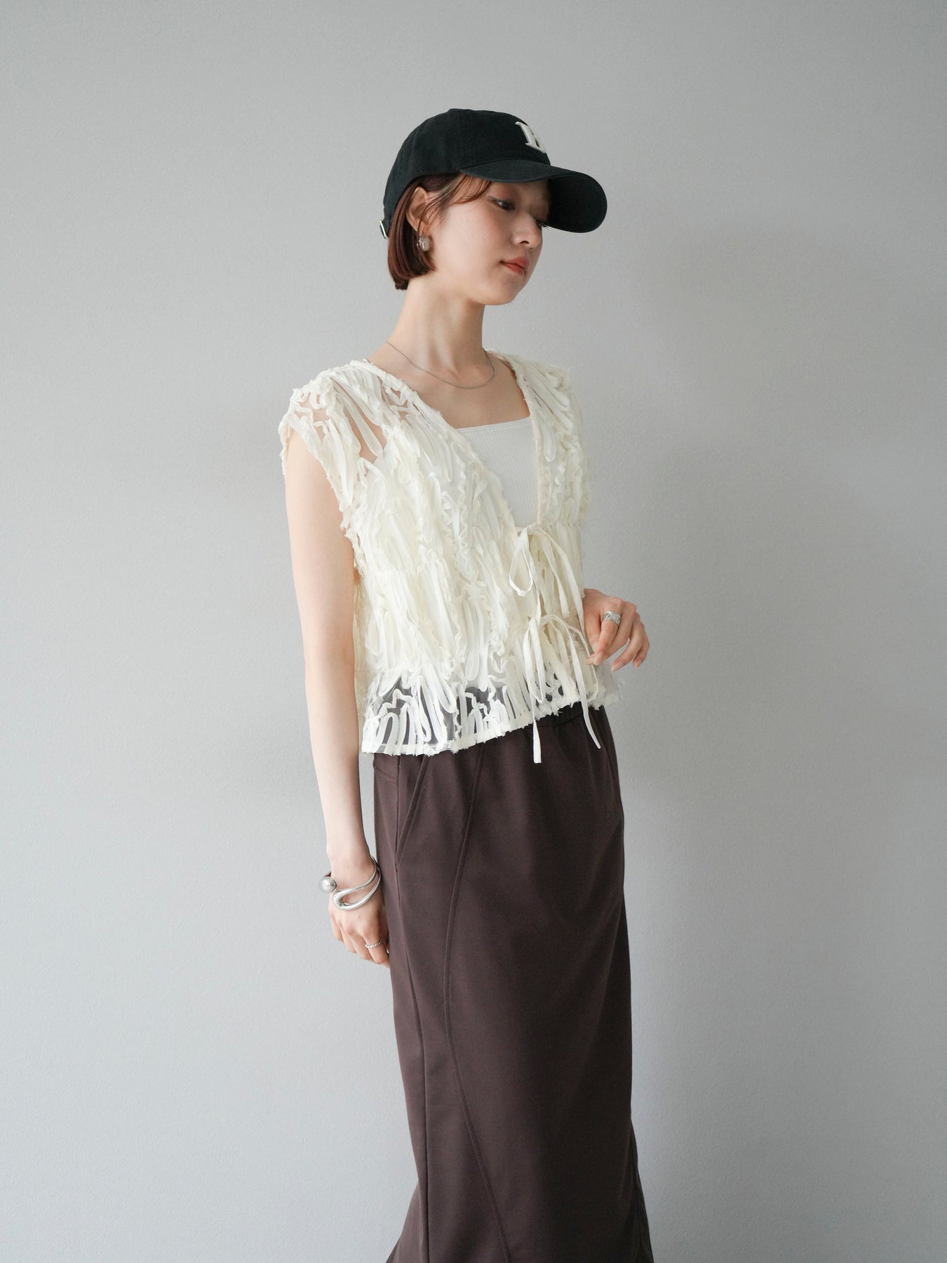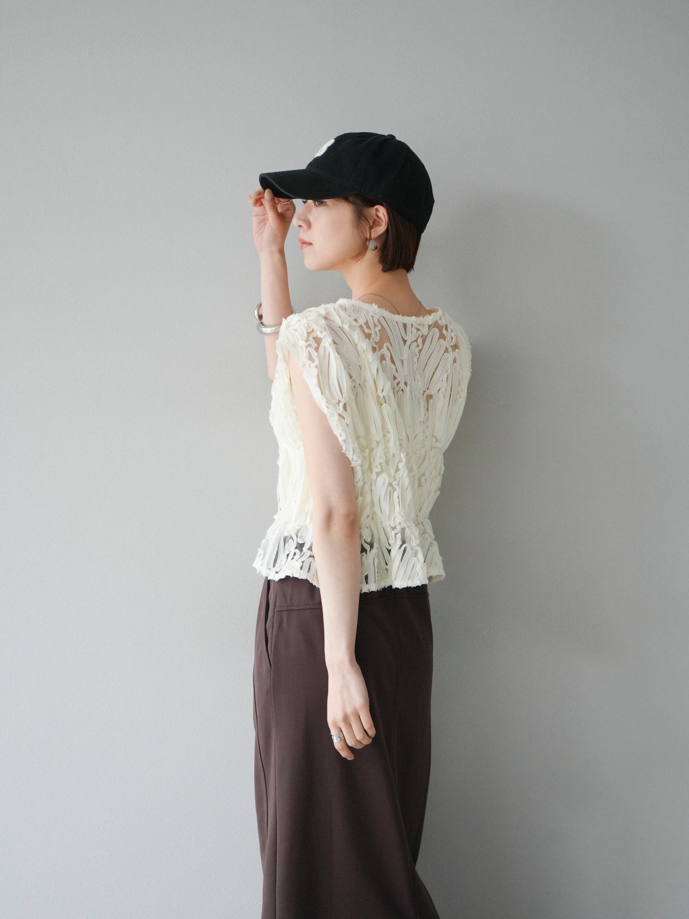 華やかなジャガードレースが目を引くデザイントップス。立体的な織り模様と繊細な透け感が、スタイリングに女性らしいニュアンスを加えます。フロントのリボンデザインは、結び方次第でシルエットの変化を楽しめ、着こなしの幅が広がる一着。キャミソールやタンクトップとのレイヤードがおすすめです。 ※ボトムス、キャミソール(インナー)以外の商品は一律でインナーは付属していません