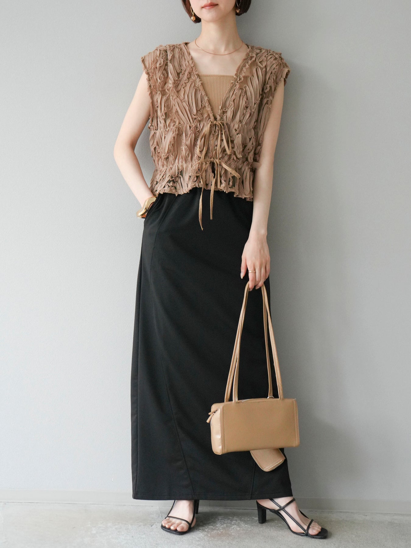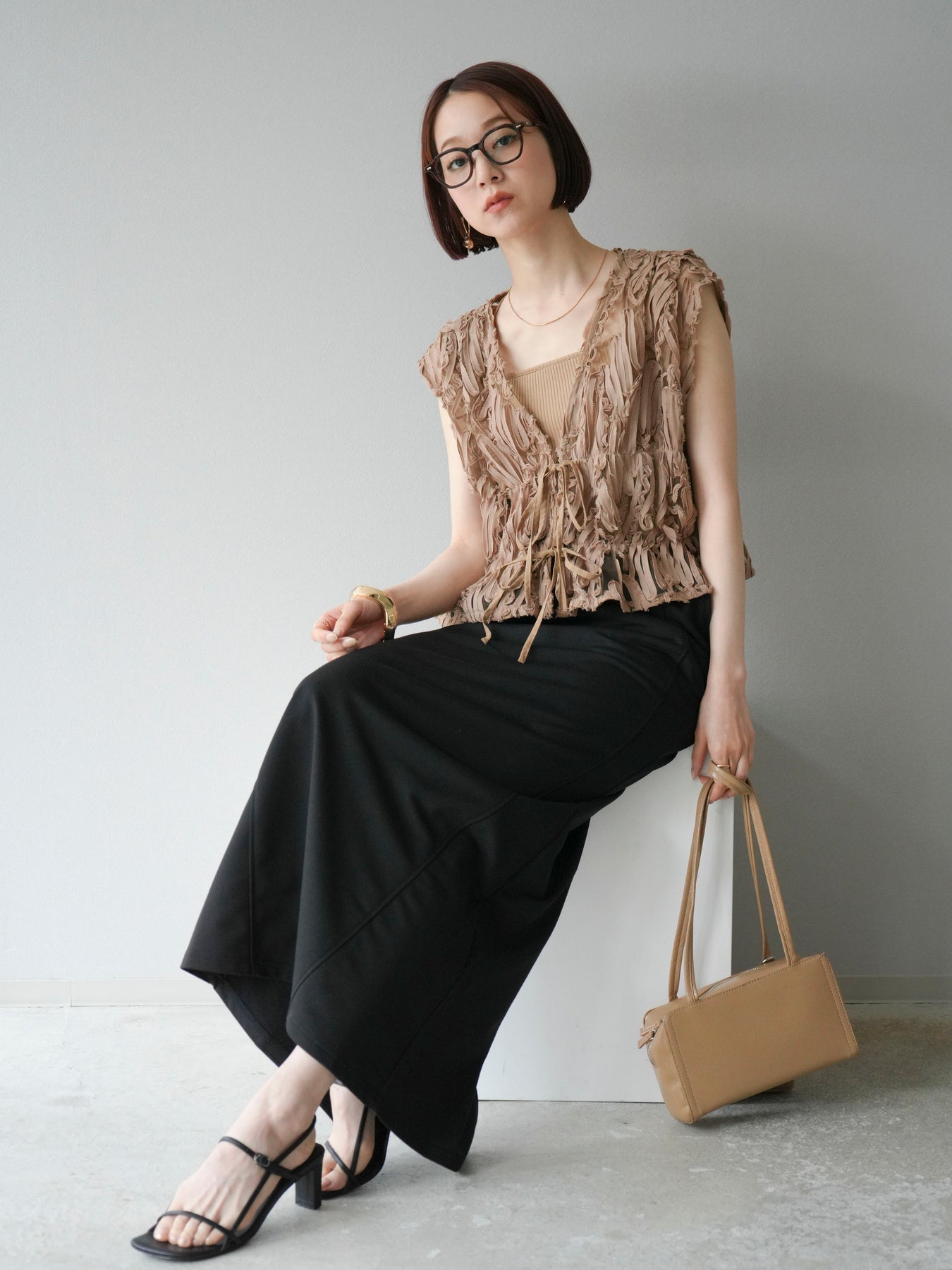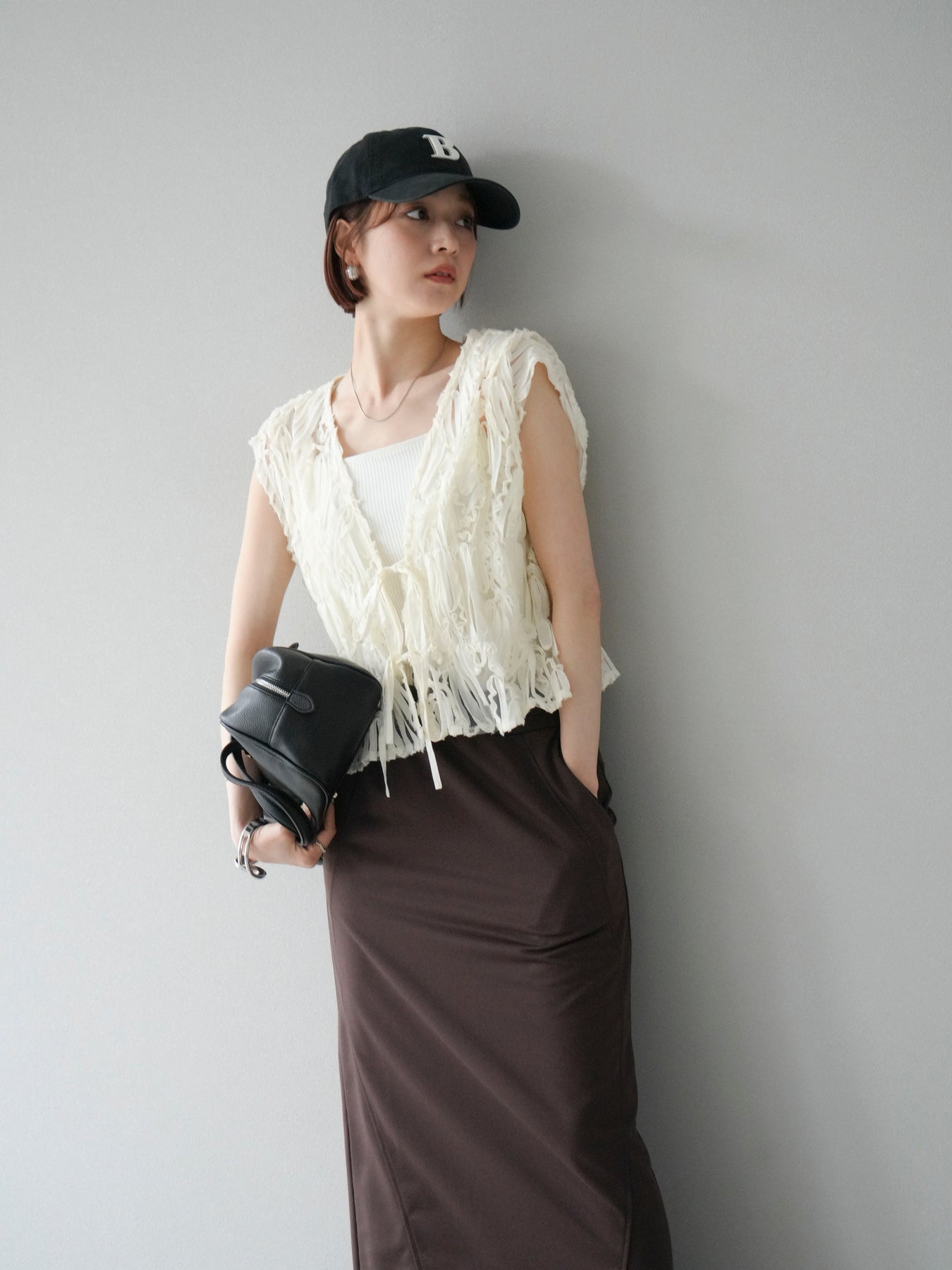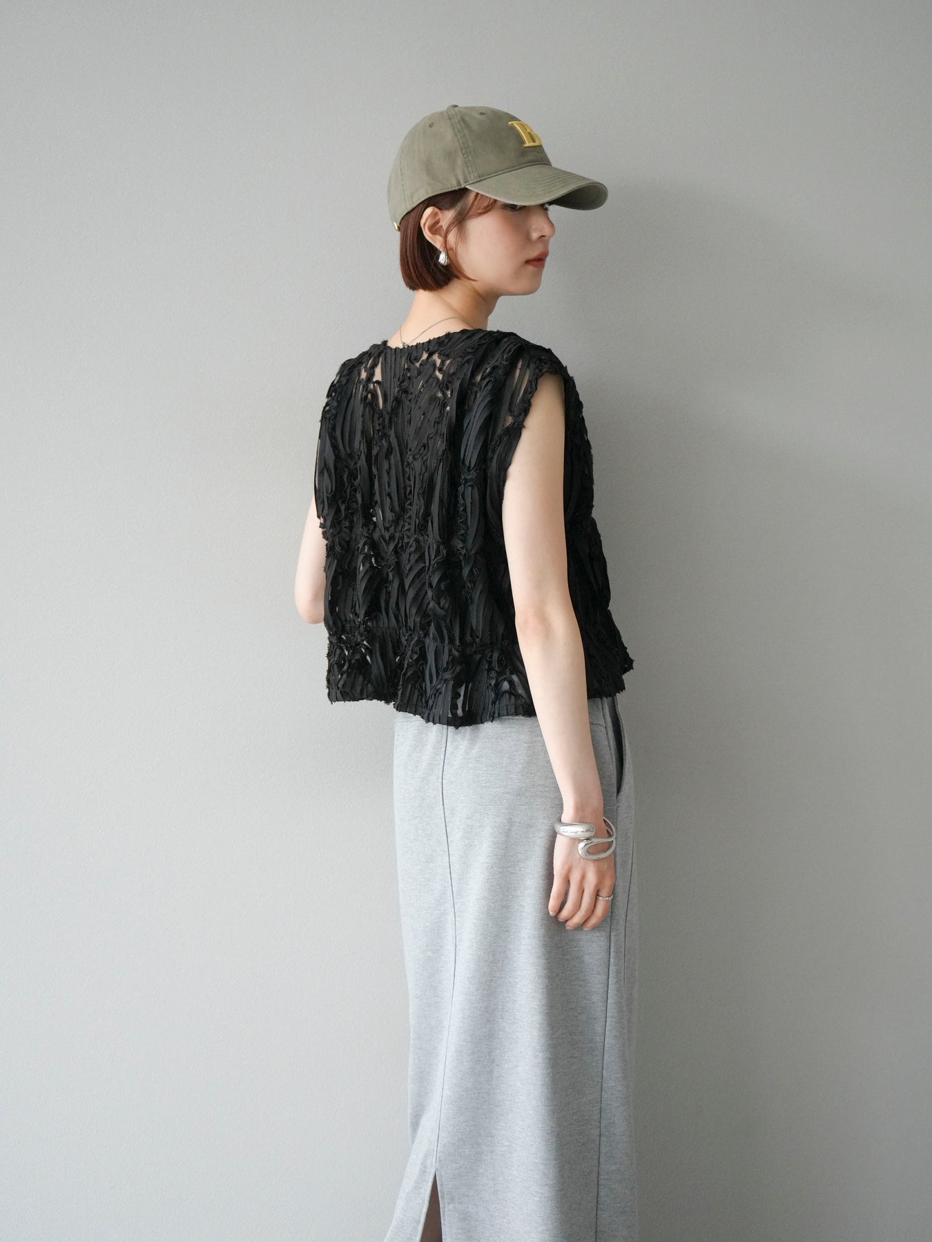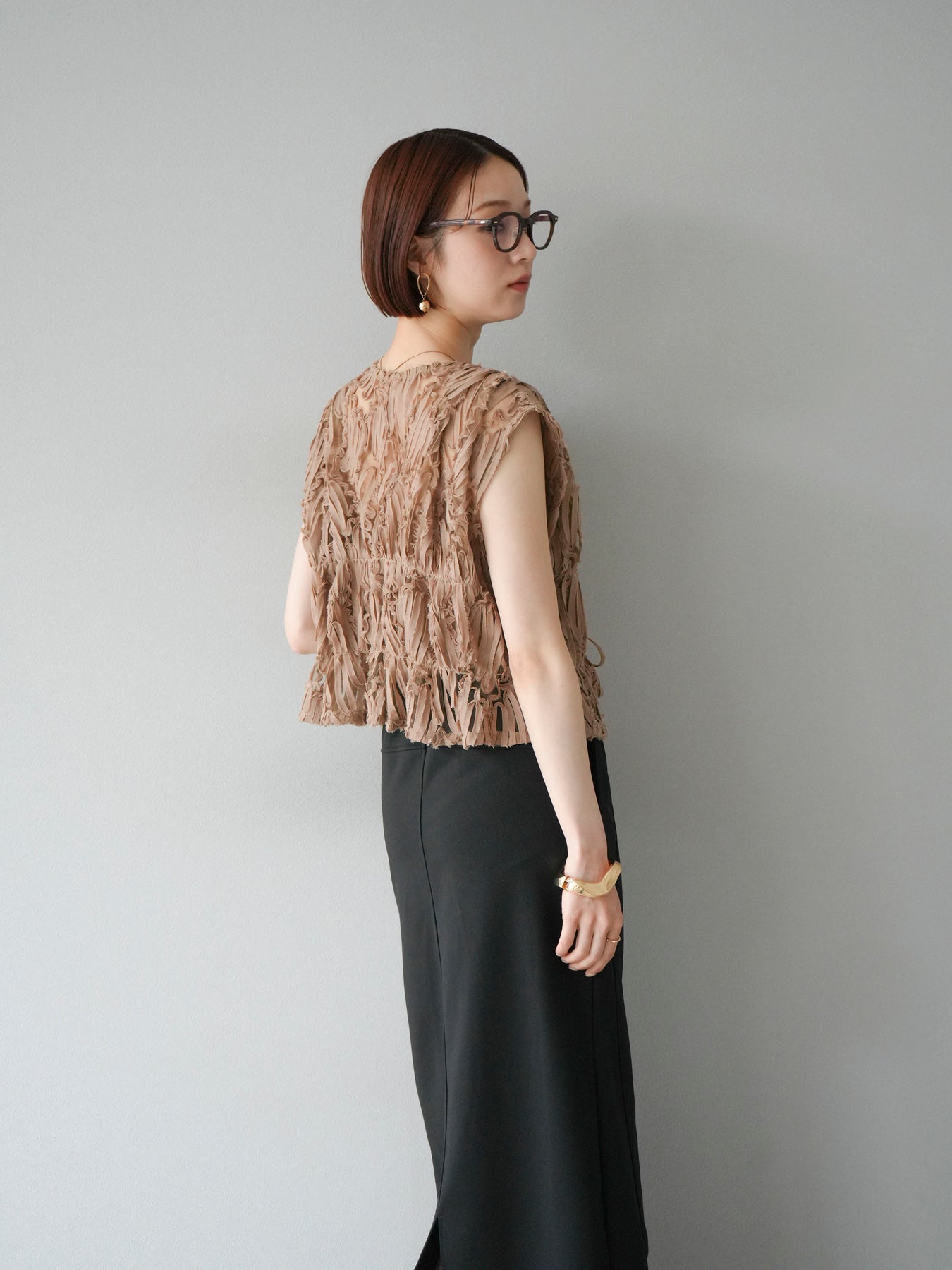 華やかなジャガードレースが目を引くデザイントップス。立体的な織り模様と繊細な透け感が、スタイリングに女性らしいニュアンスを加えます。フロントのリボンデザインは、結び方次第でシルエットの変化を楽しめ、着こなしの幅が広がる一着。キャミソールやタンクトップとのレイヤードがおすすめです。 ※ボトムス、キャミソール(インナー)以外の商品は一律でインナーは付属していません