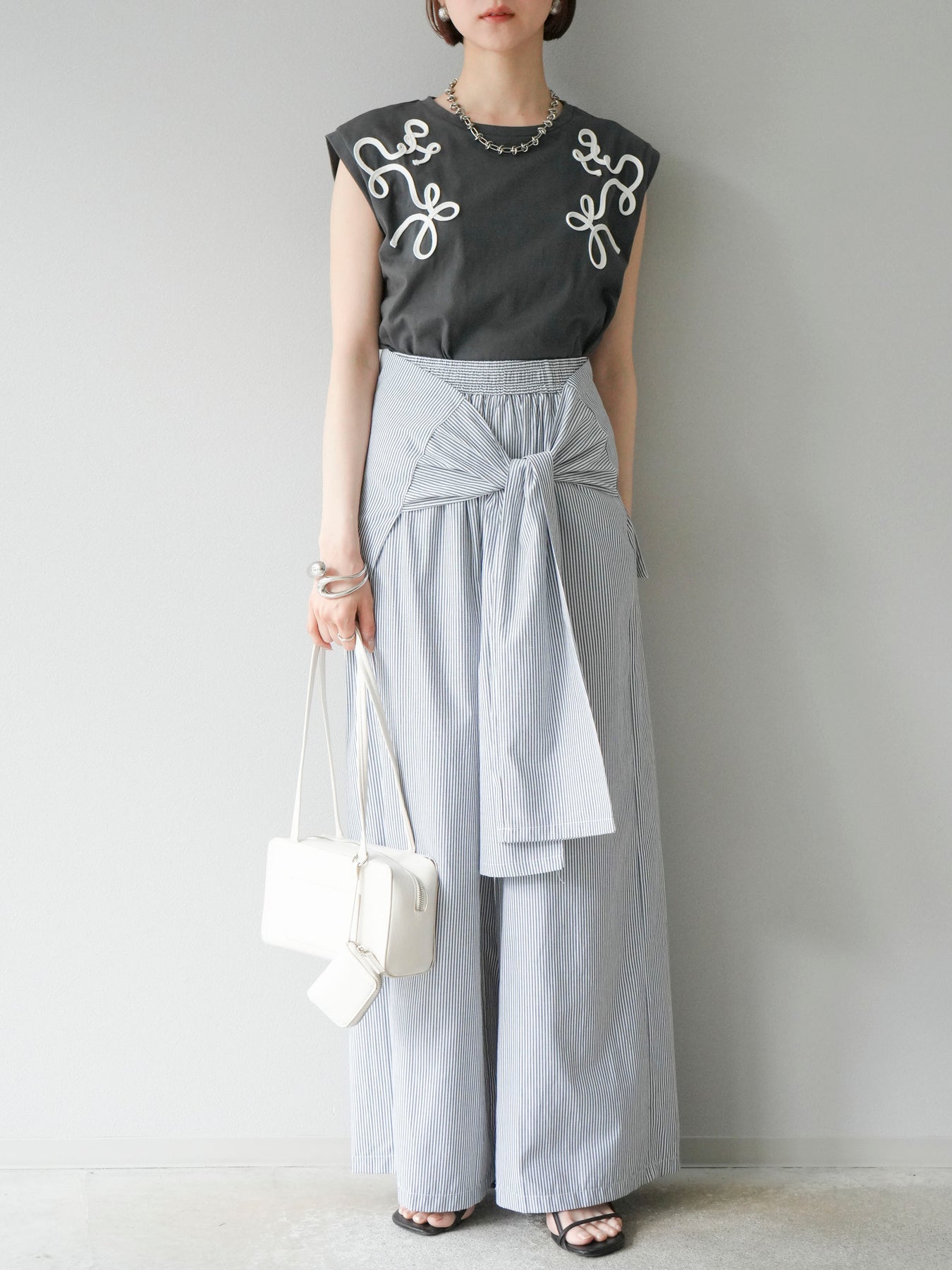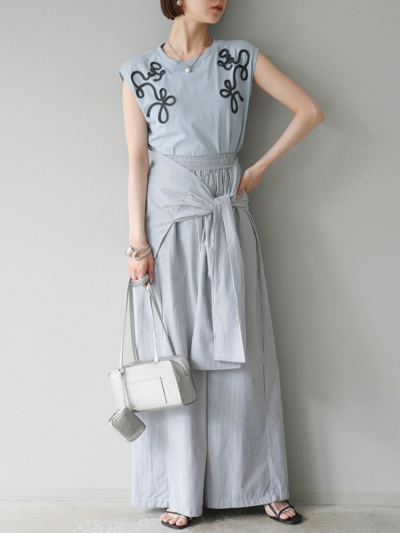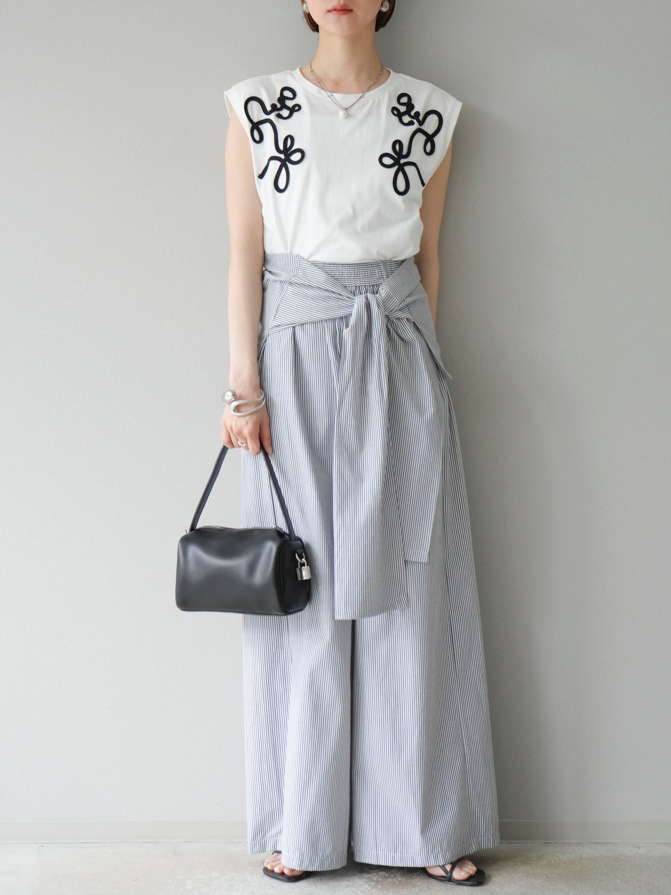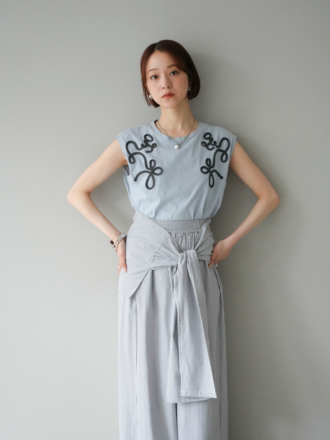 [SET]コード刺繍フレンチスリーブTシャツ+ウエスト巻きストライプイージーパンツ(2set)