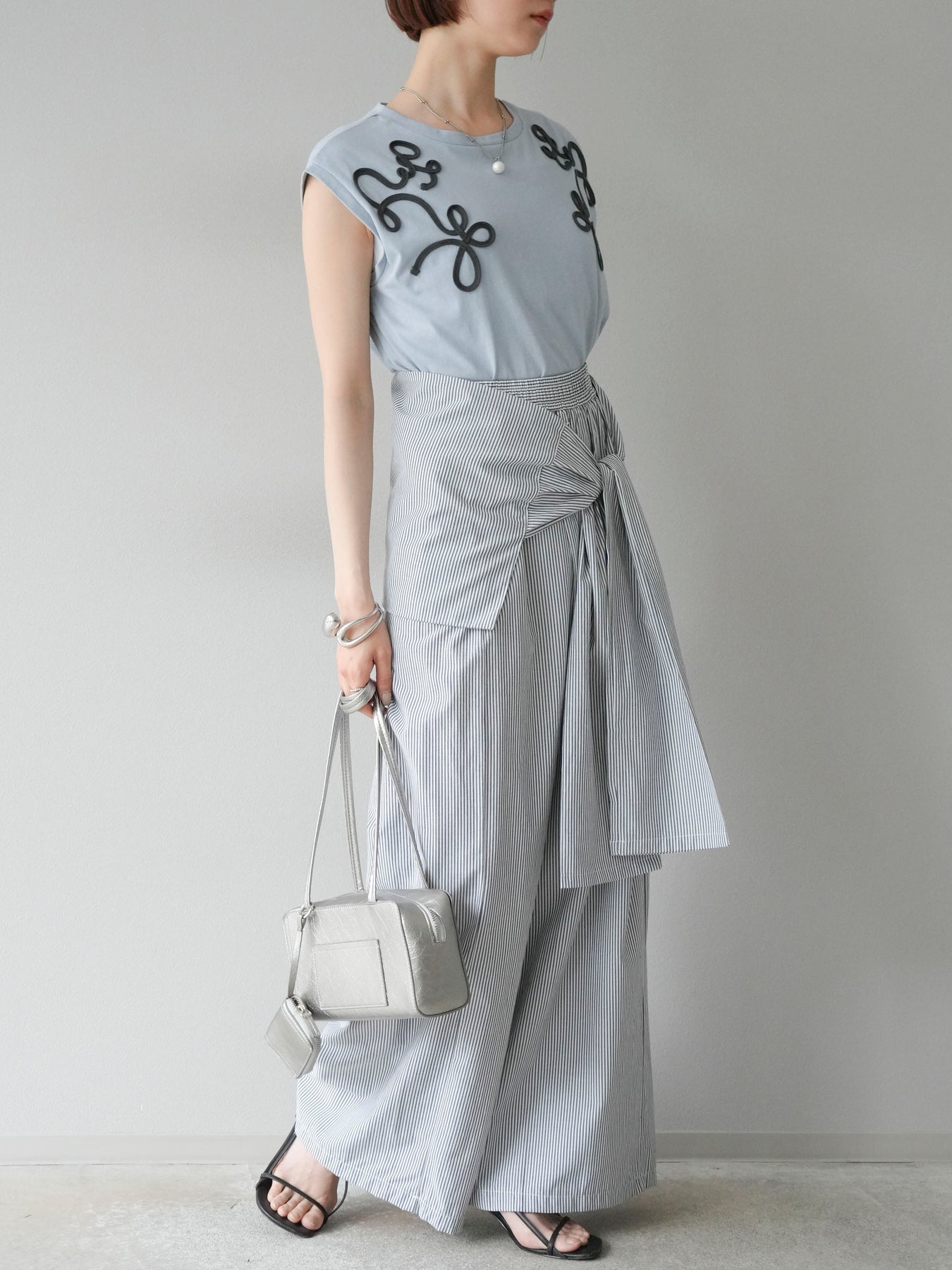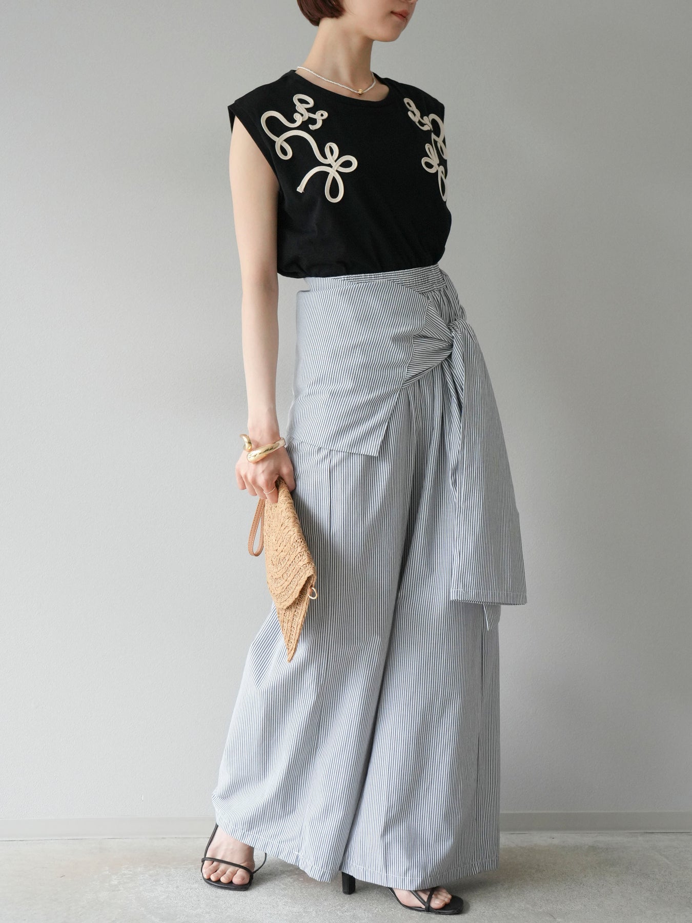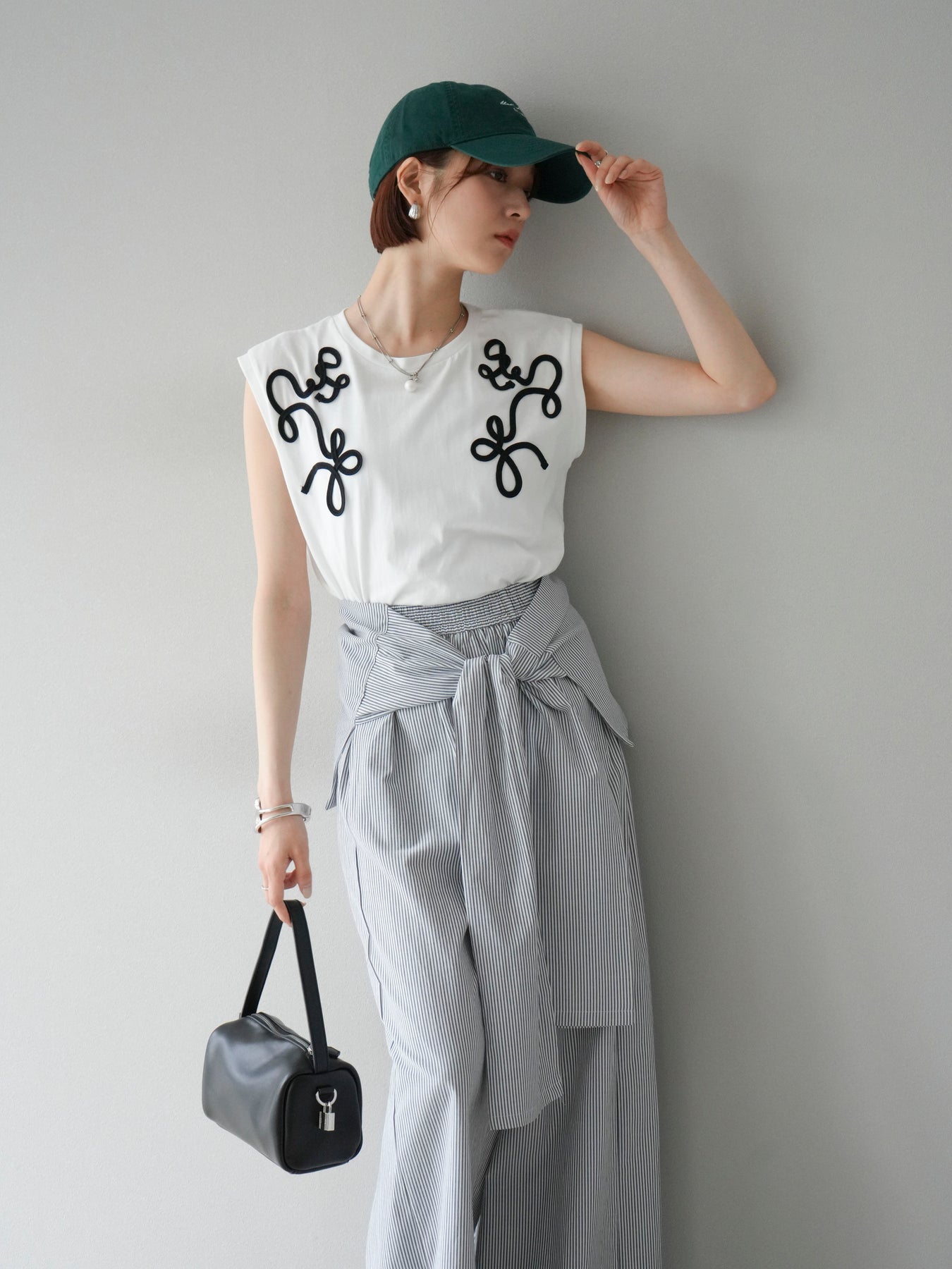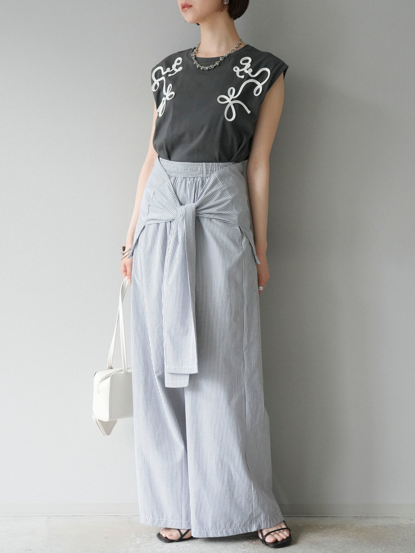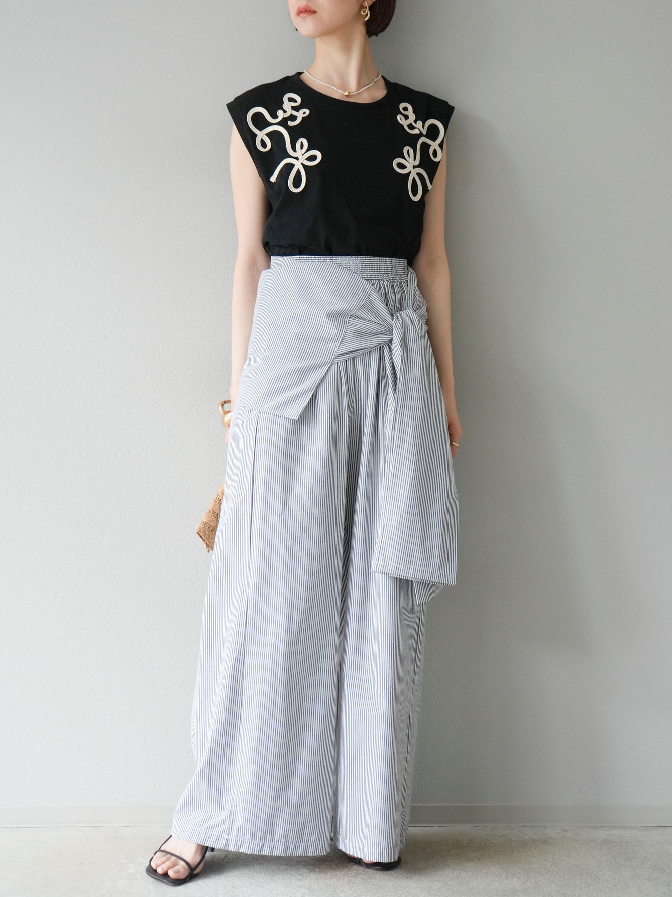 [SET]コード刺繍フレンチスリーブTシャツ+ウエスト巻きストライプイージーパンツ(2set)