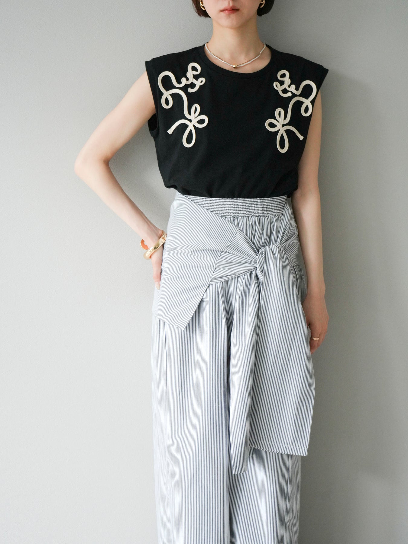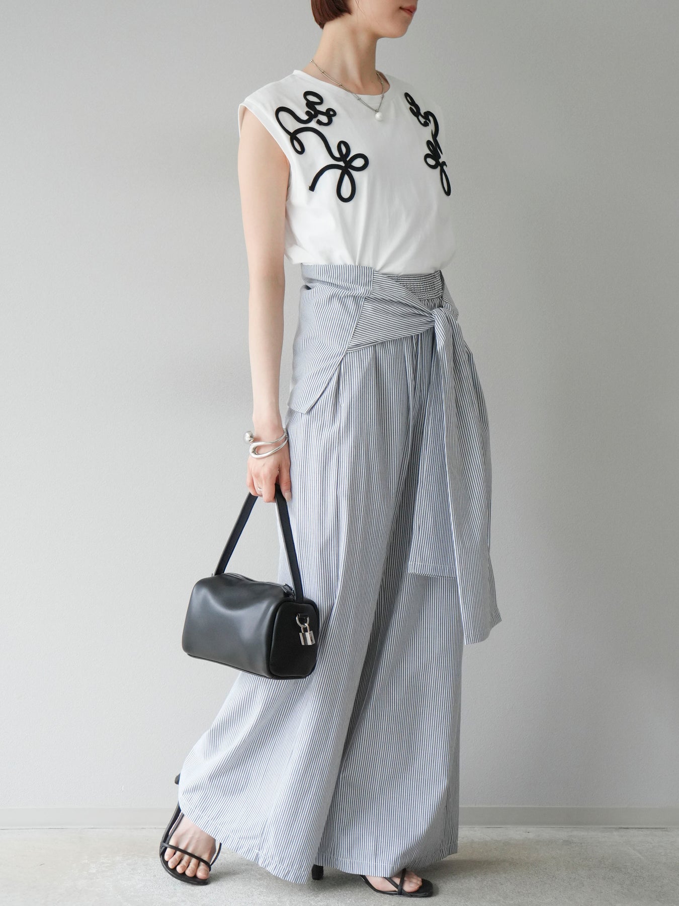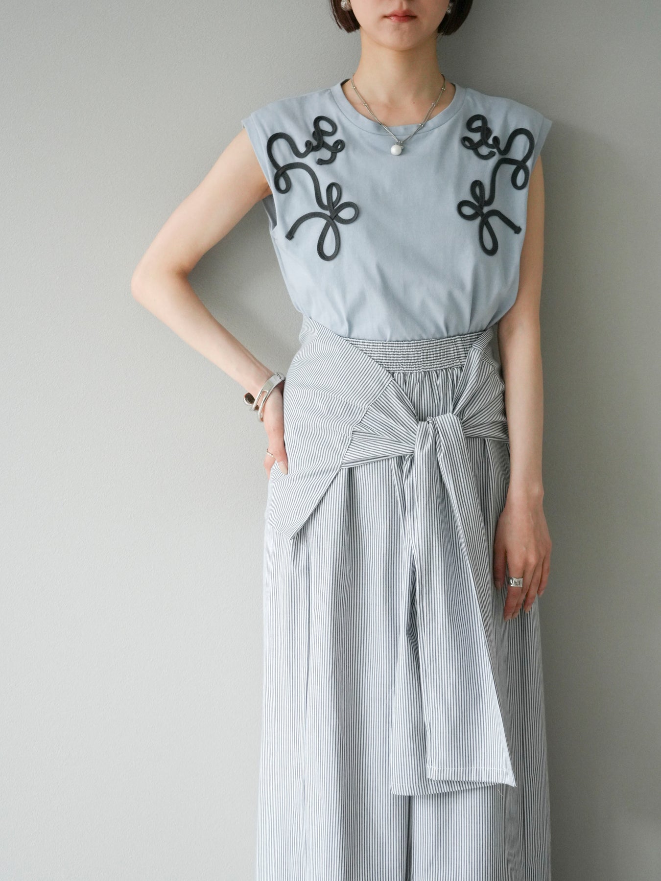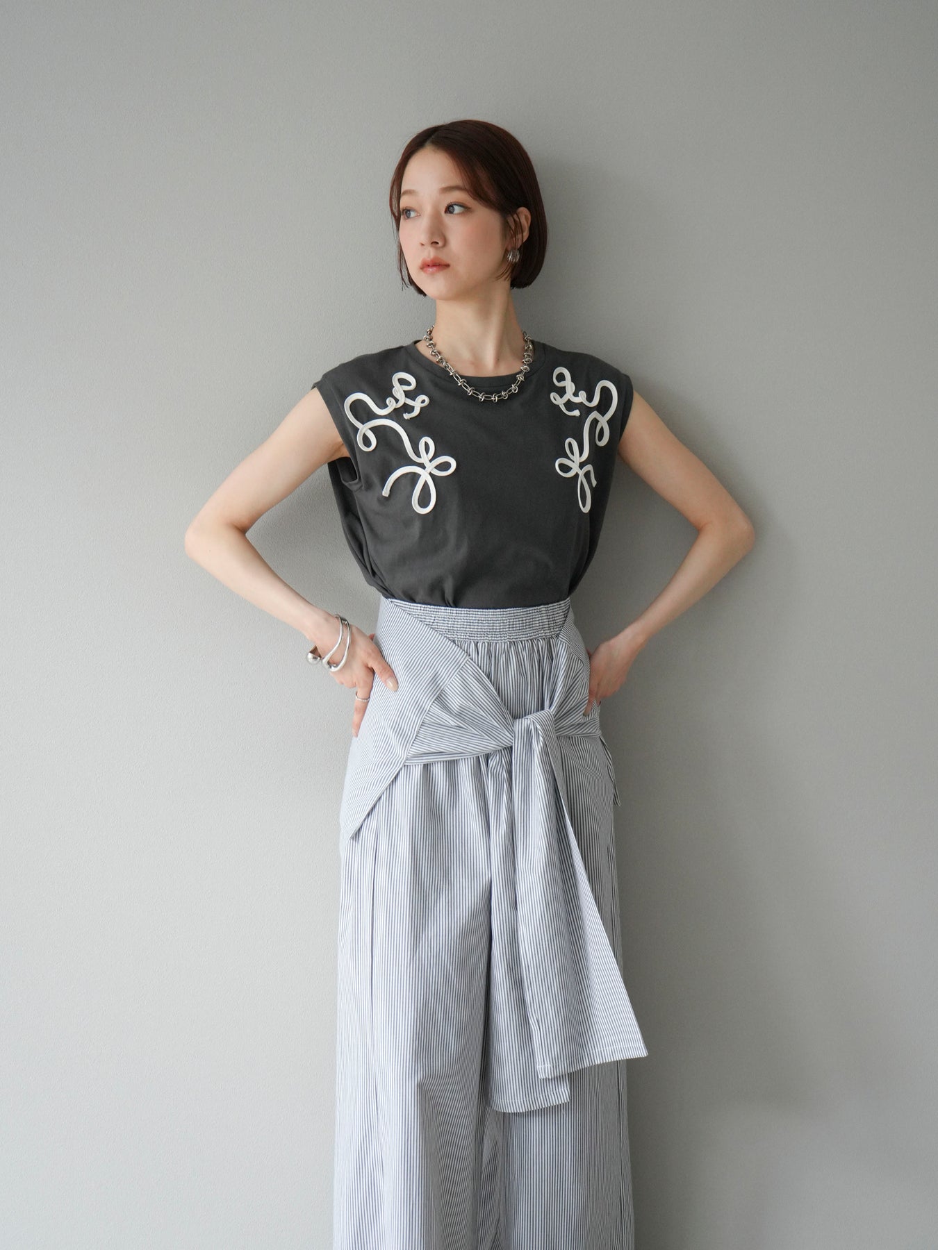 [SET]コード刺繍フレンチスリーブTシャツ+ウエスト巻きストライプイージーパンツ(2set)