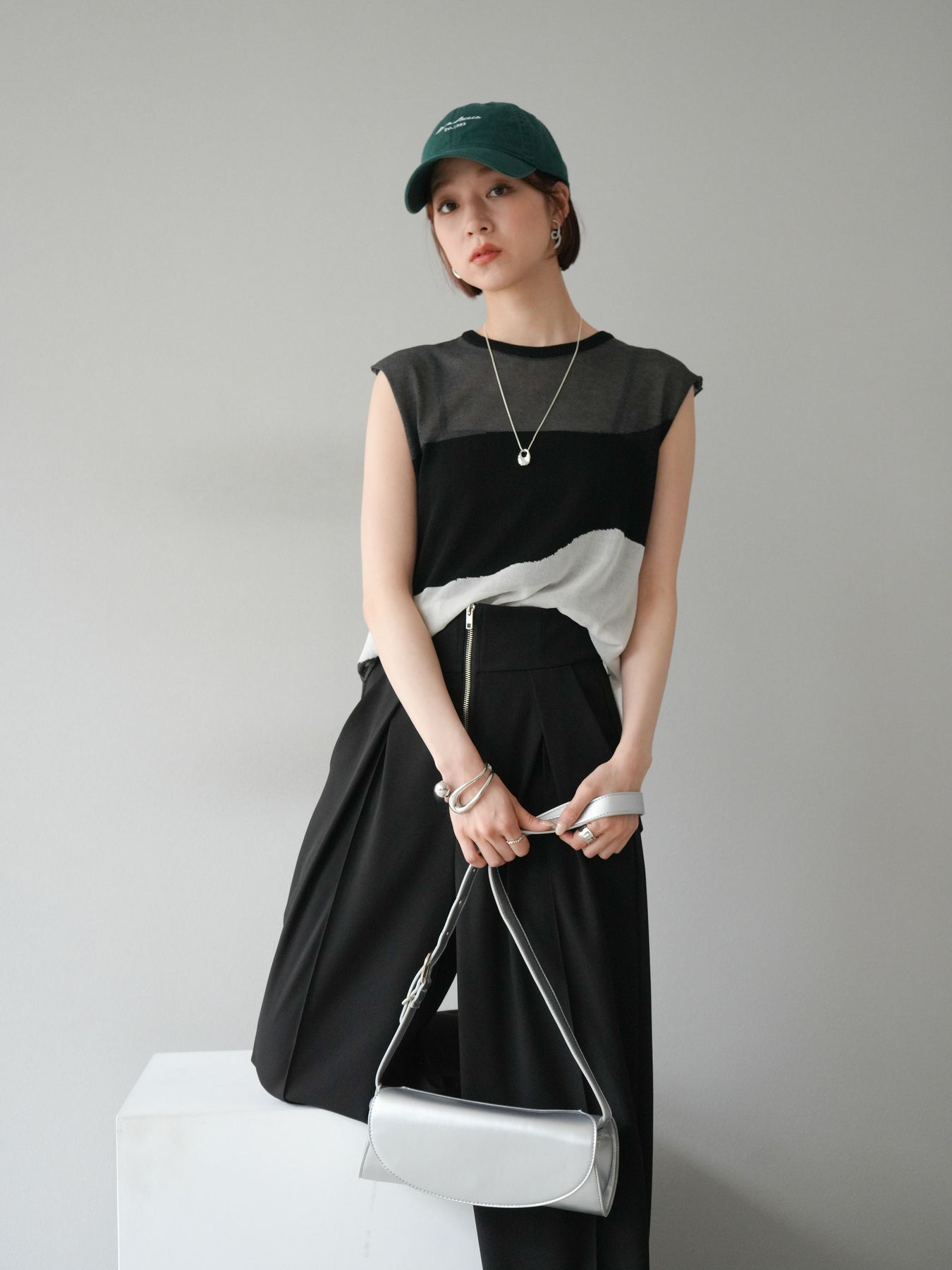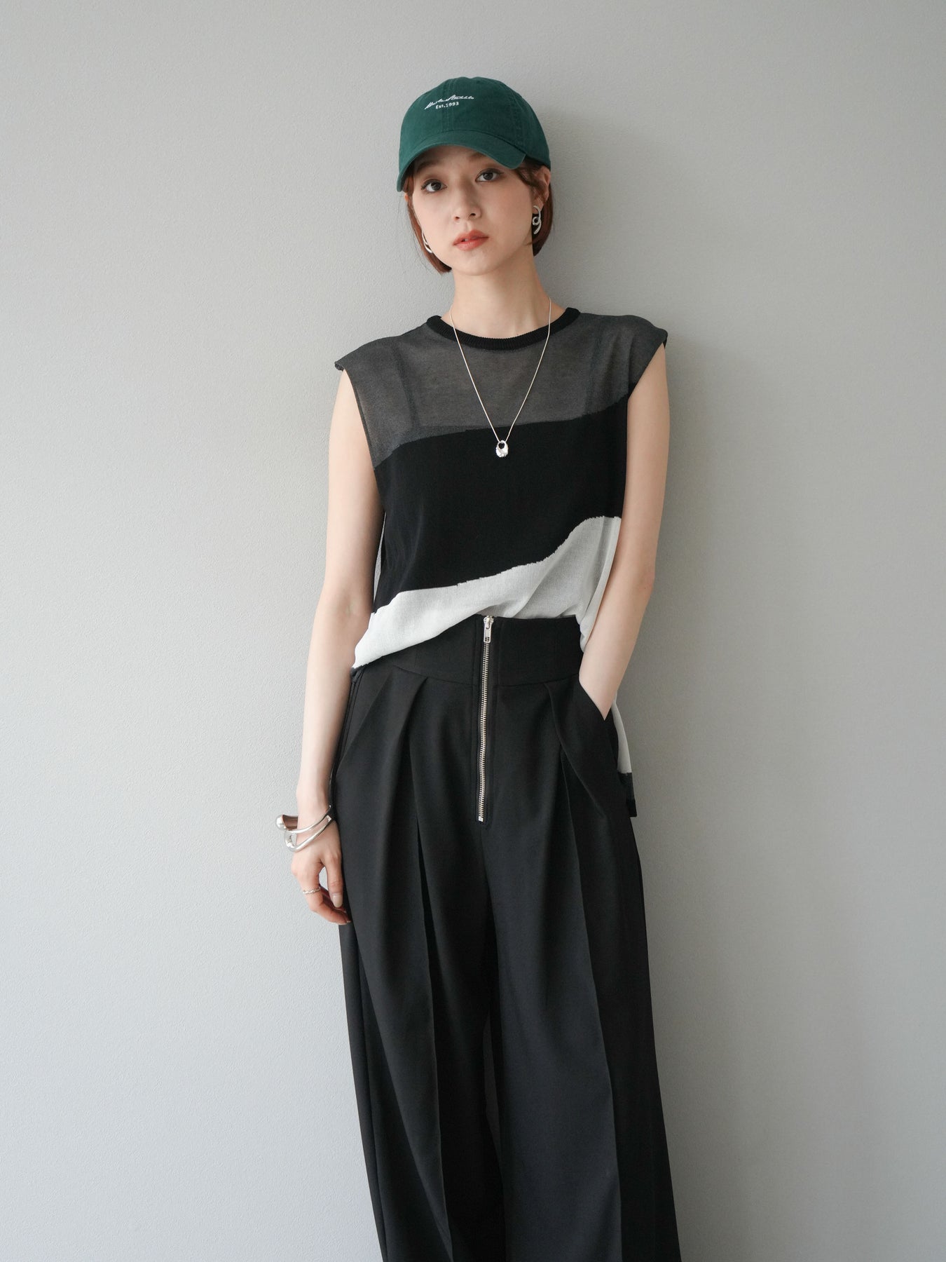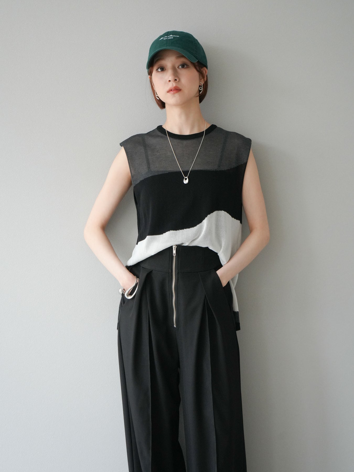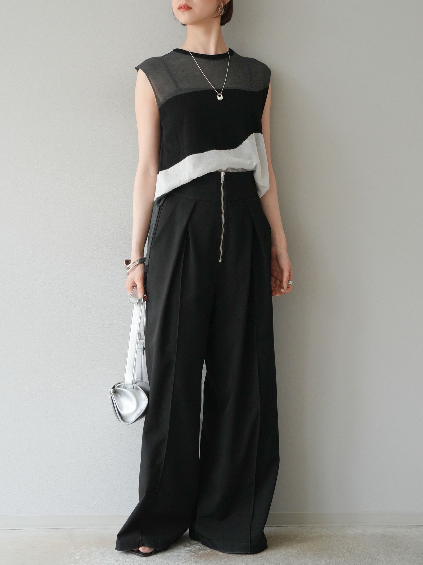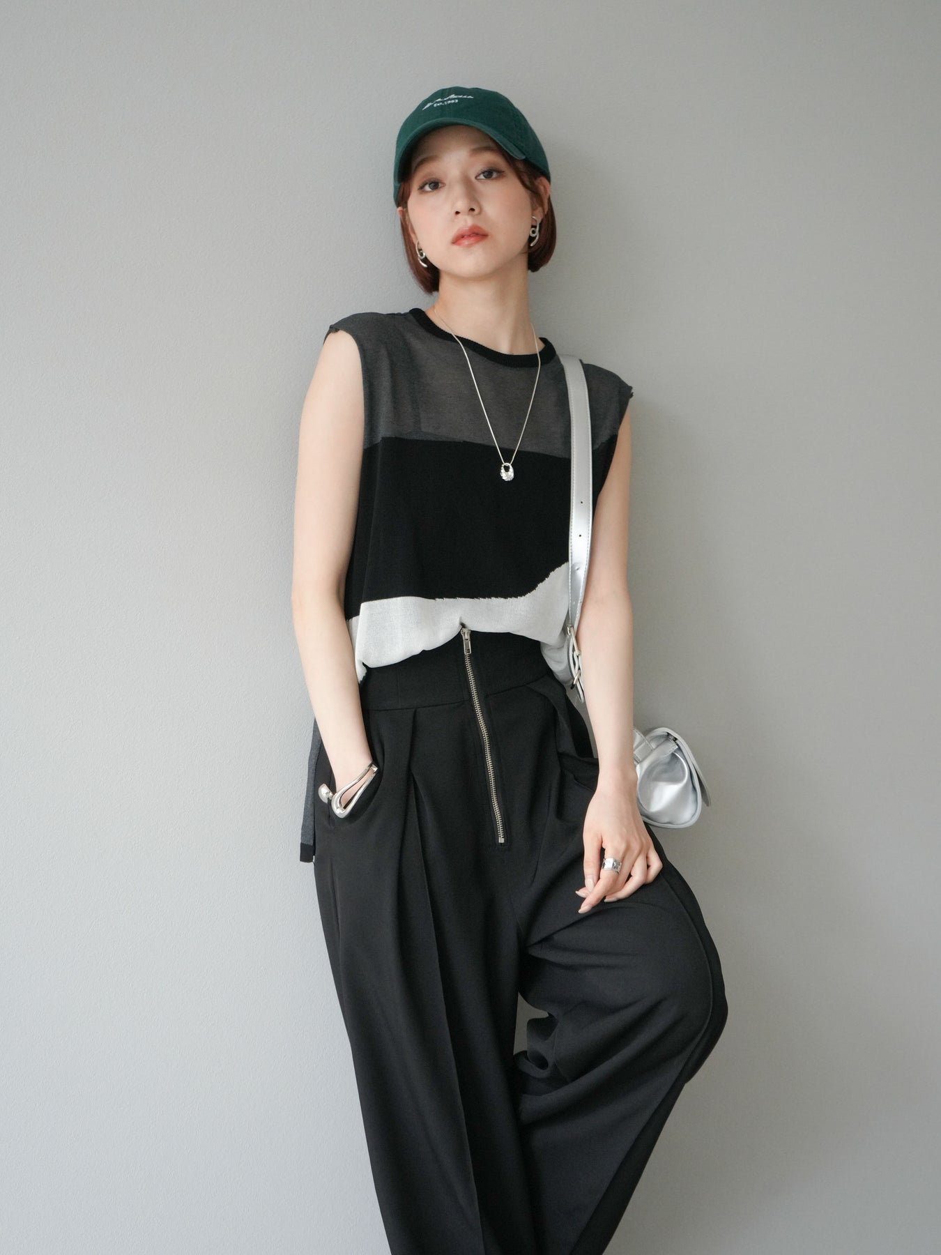 [SET]バイカラーシアーニットノースリーブ+ジップタックワイドパンツ(2set)