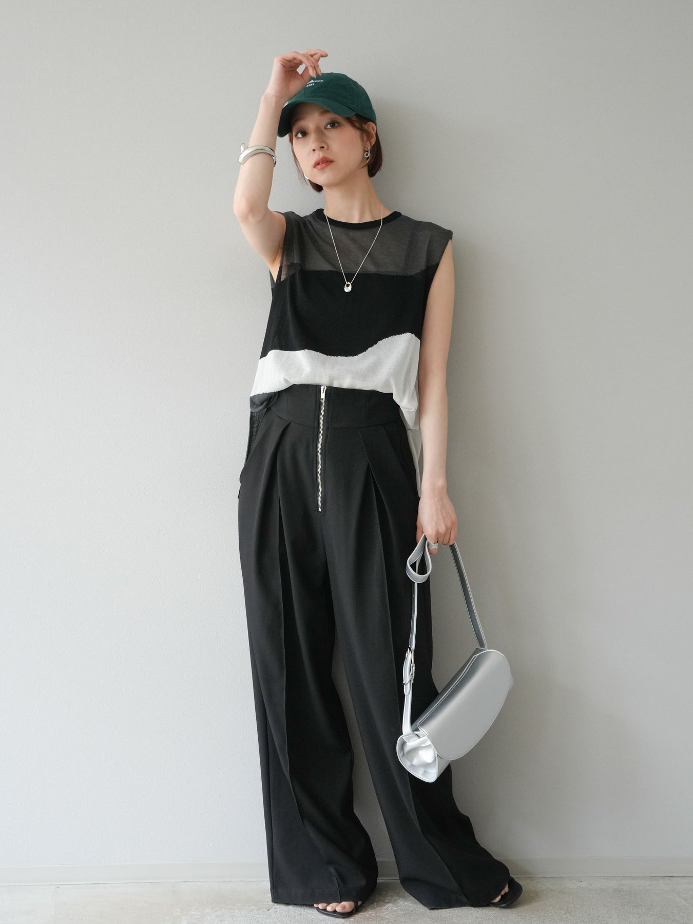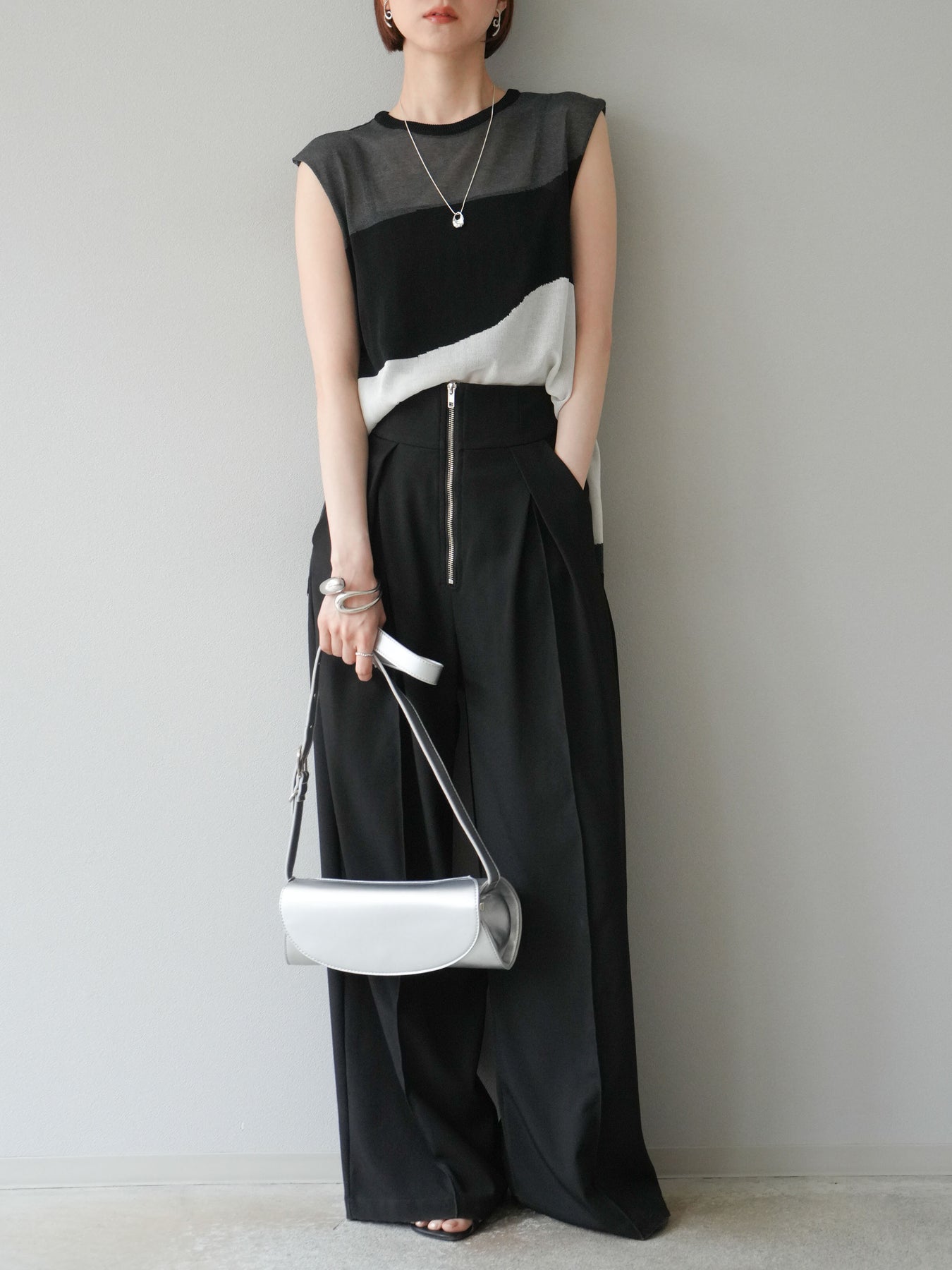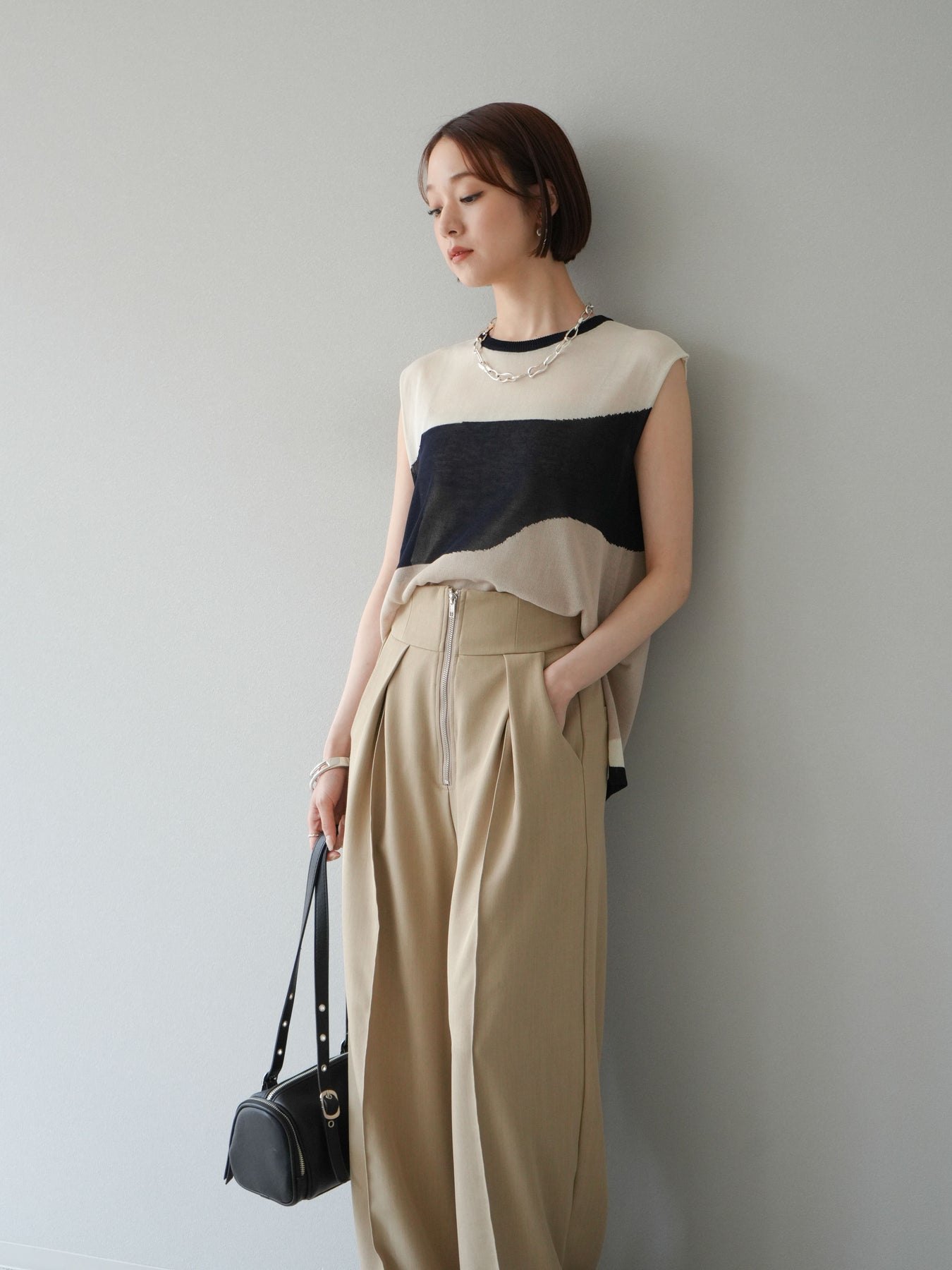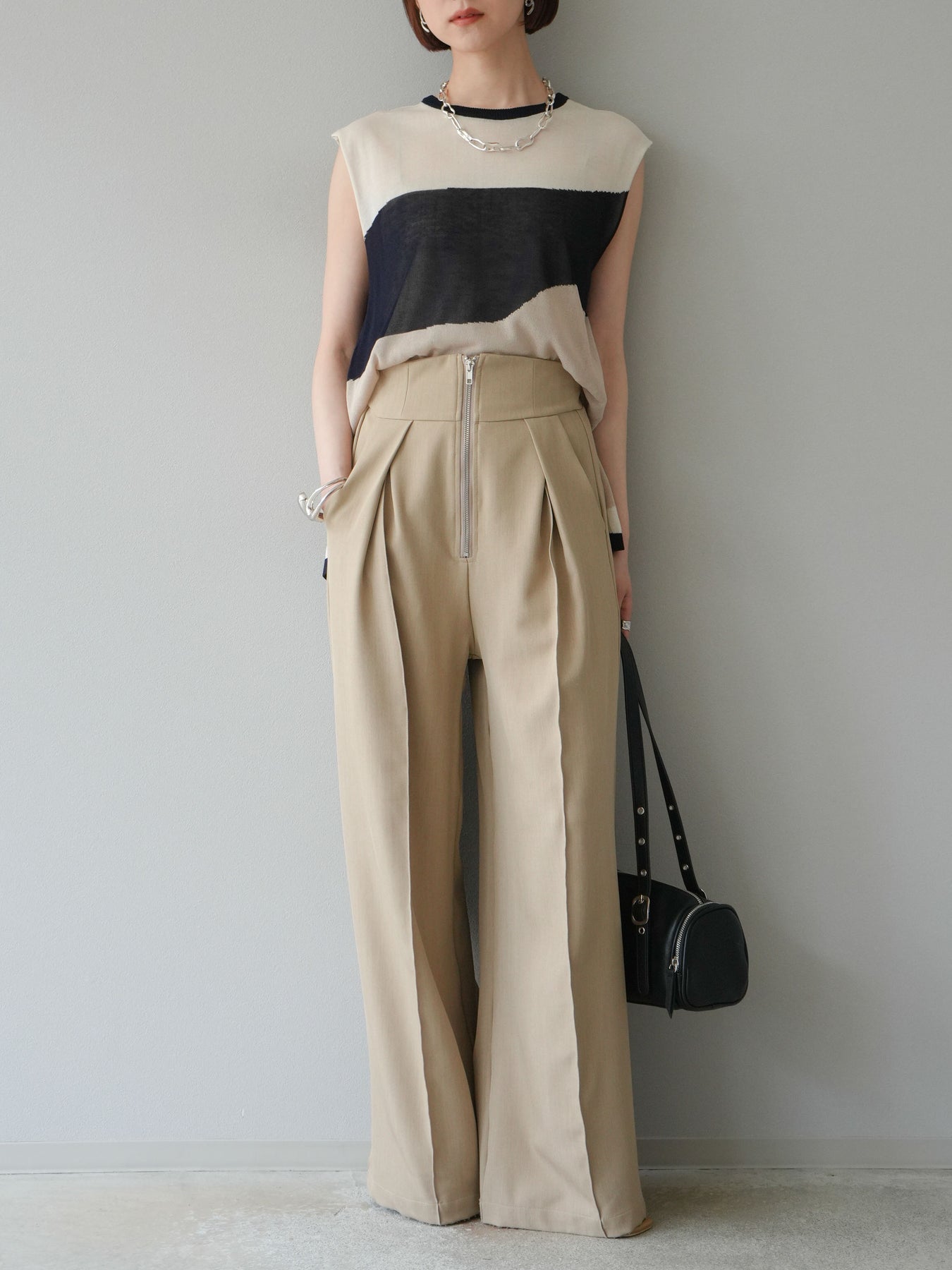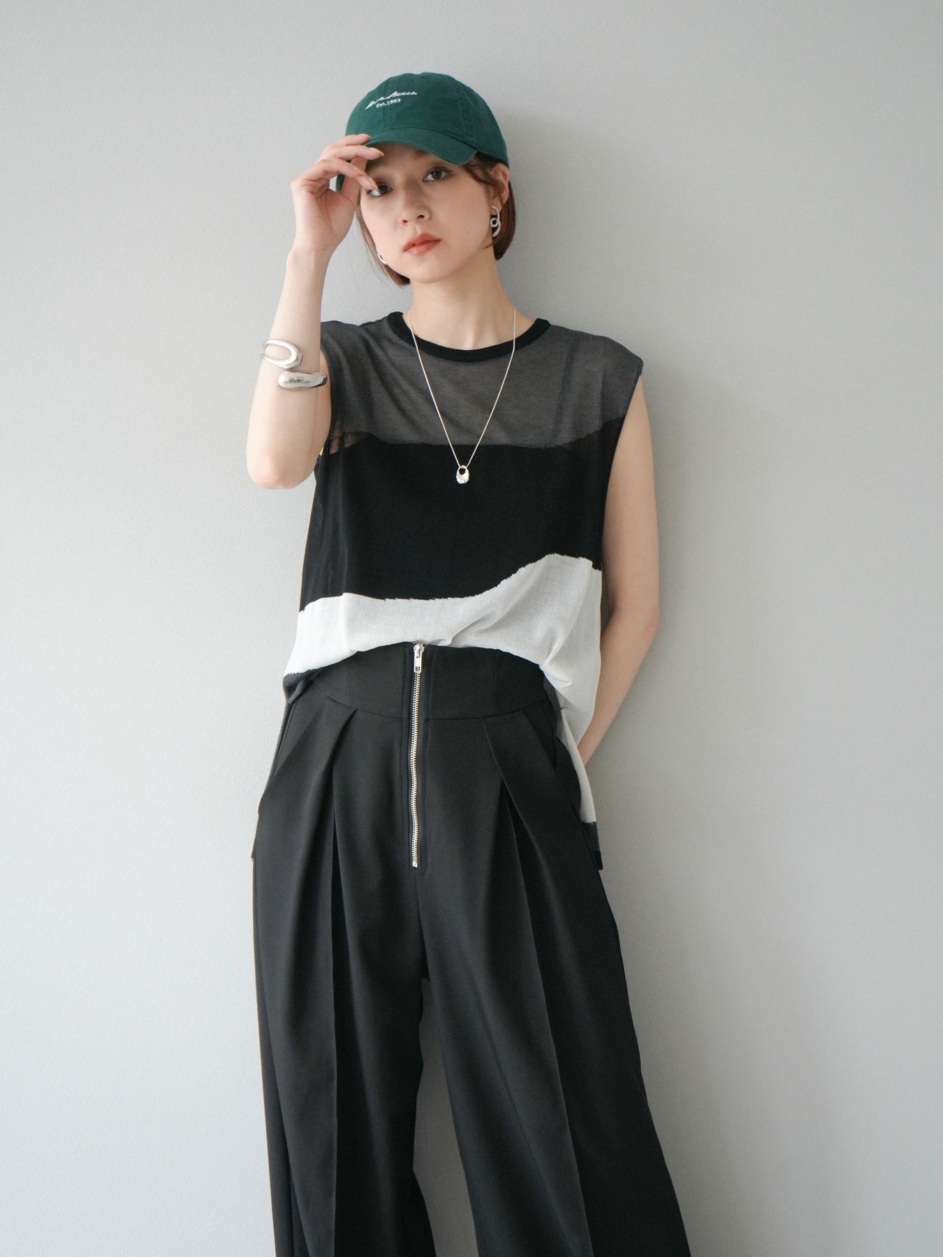 [SET]バイカラーシアーニットノースリーブ+ジップタックワイドパンツ(2set)