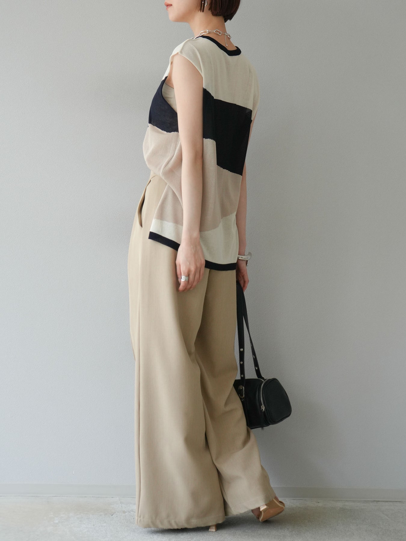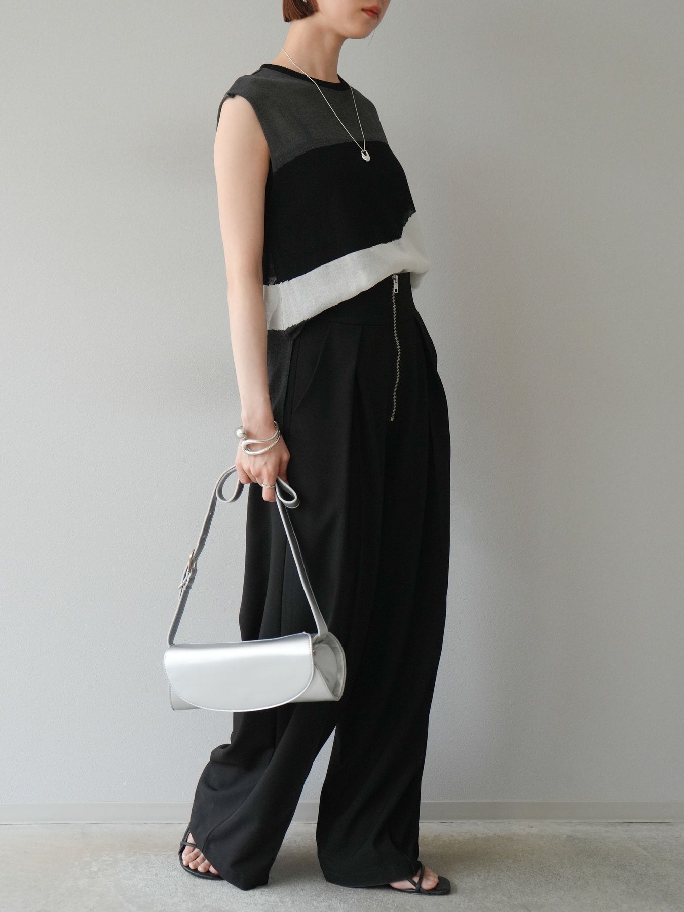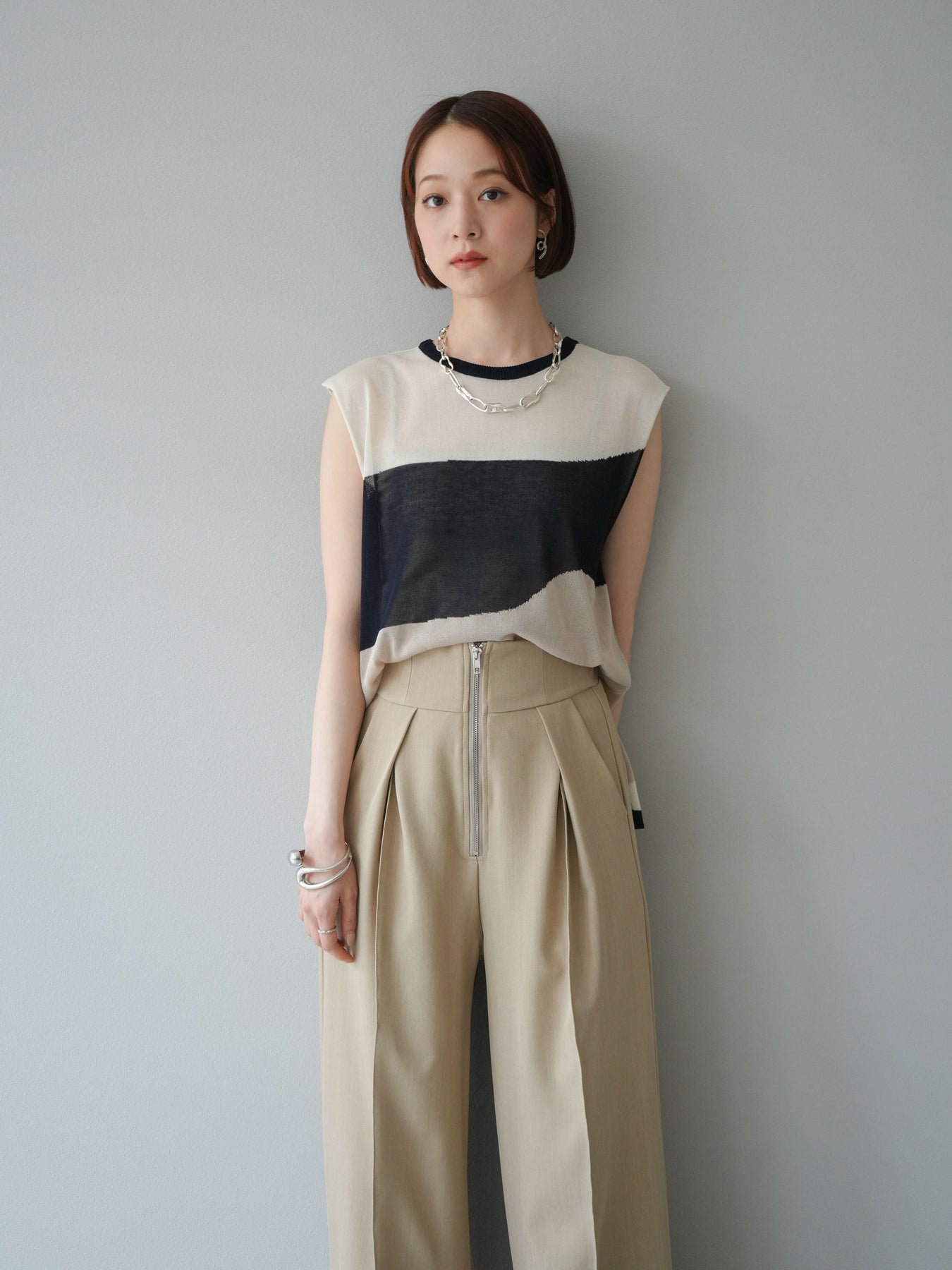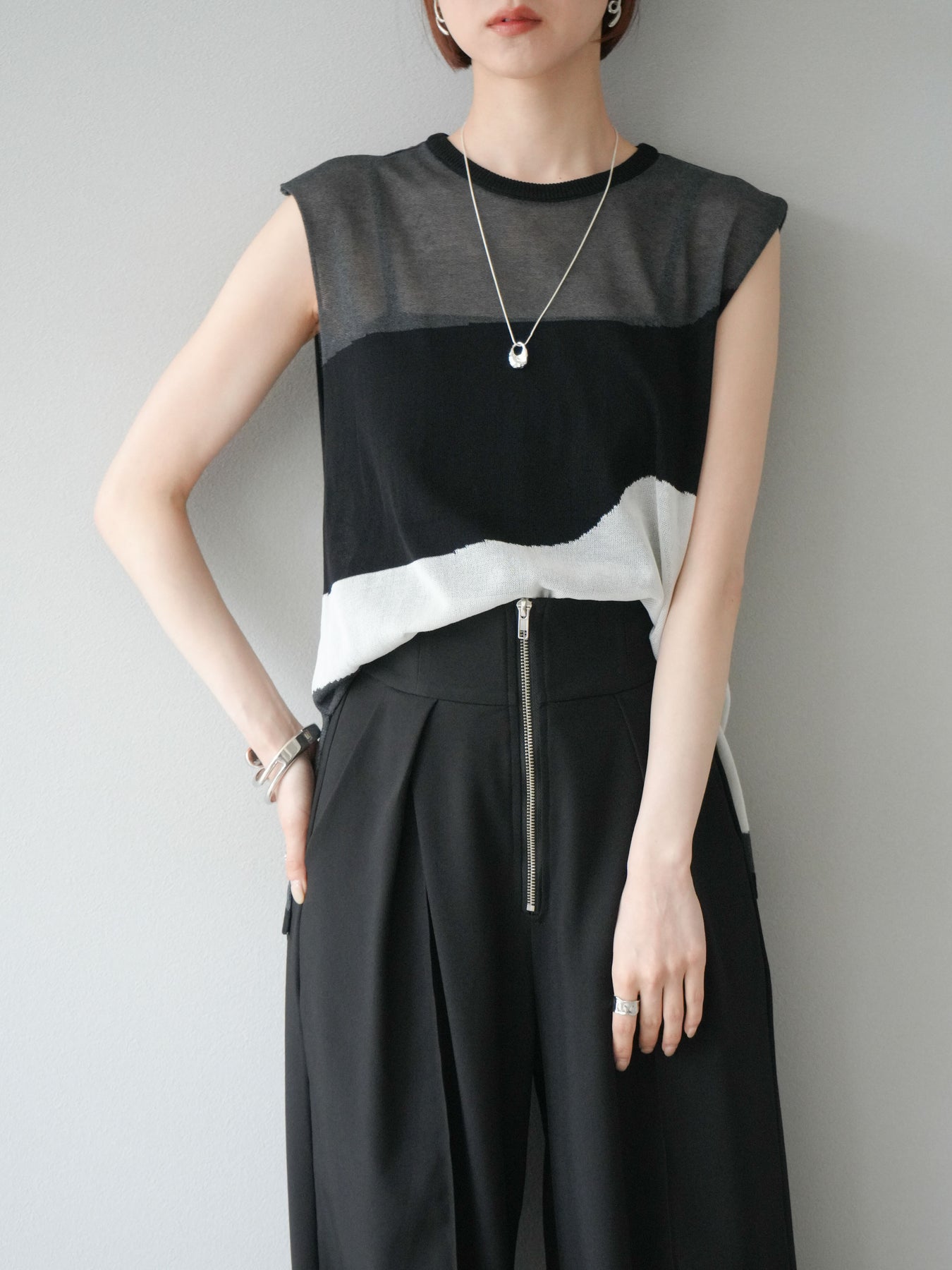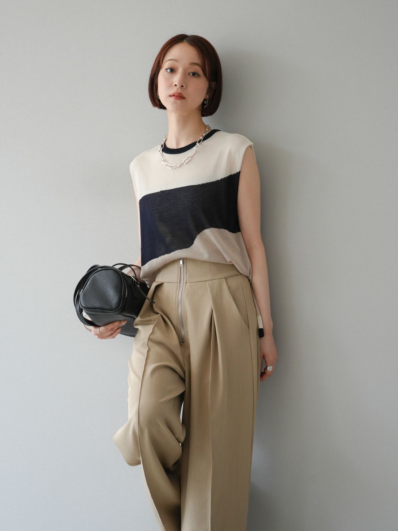 [SET]バイカラーシアーニットノースリーブ+ジップタックワイドパンツ(2set)