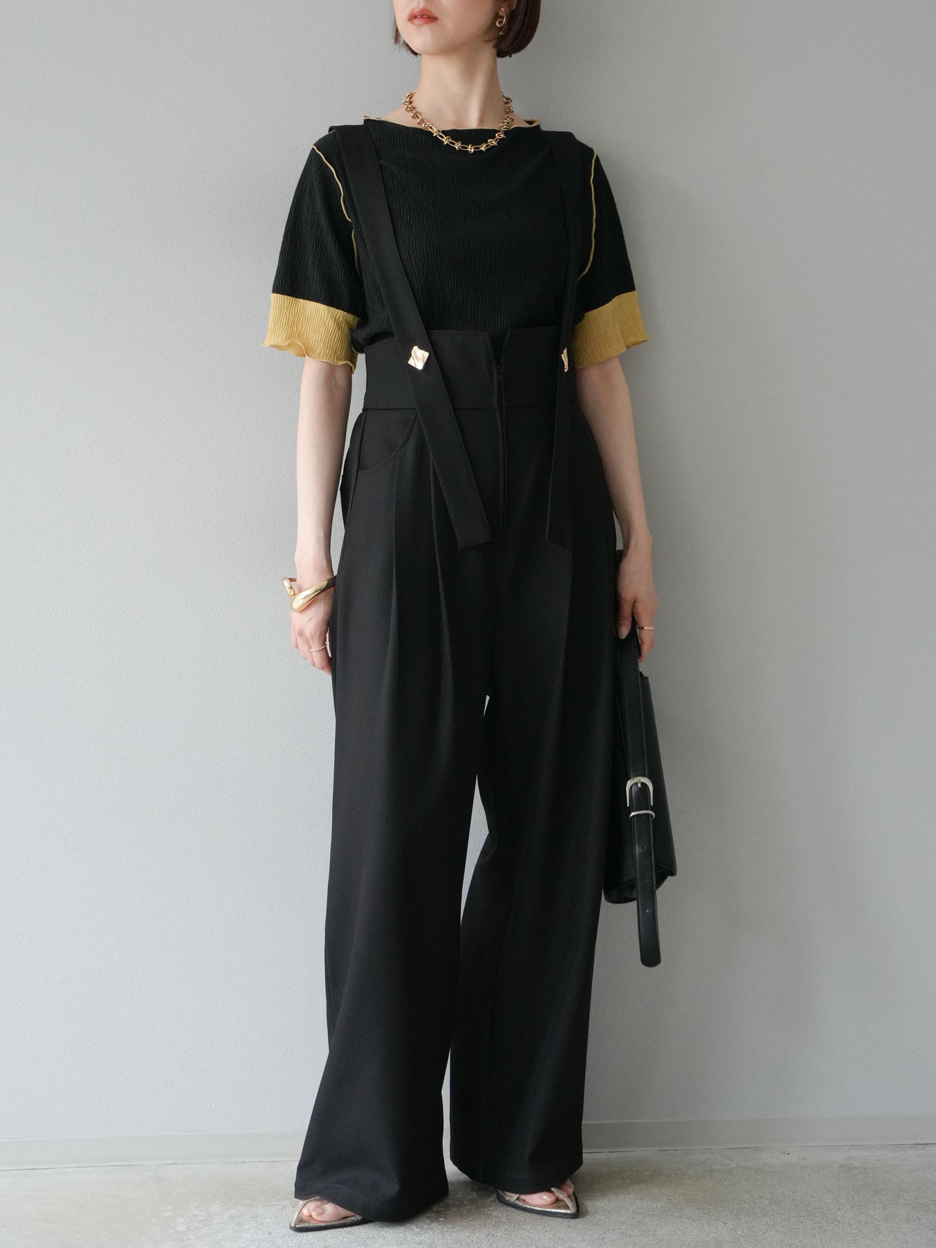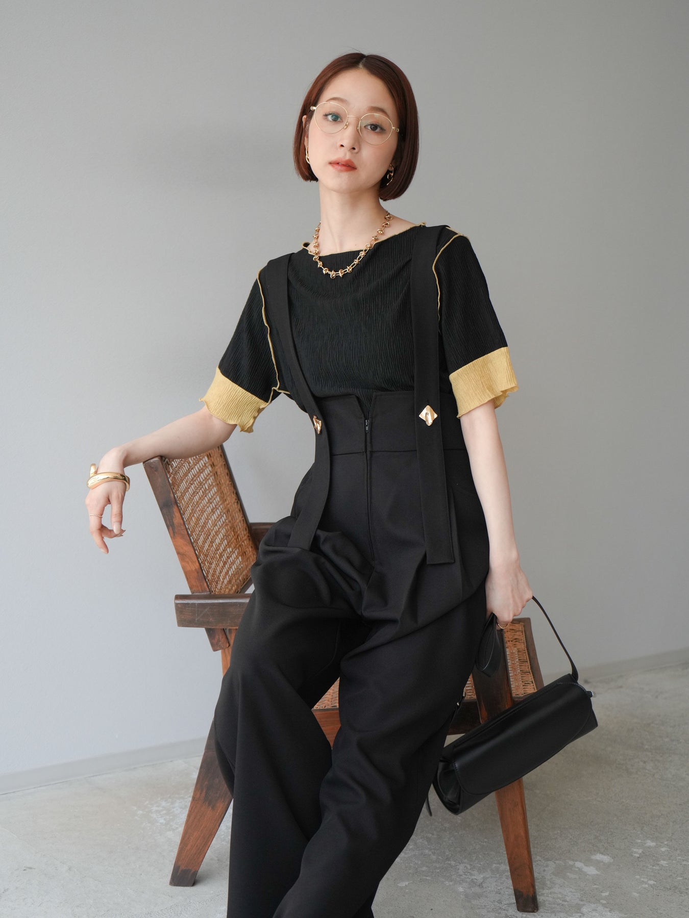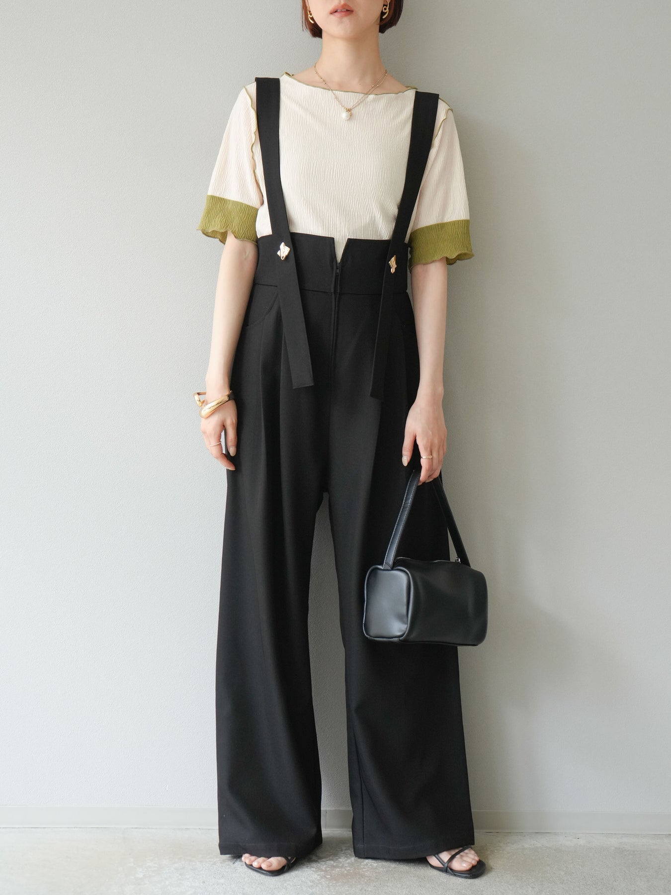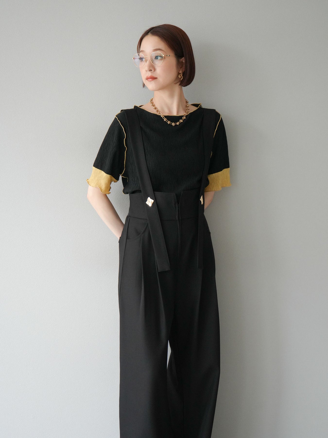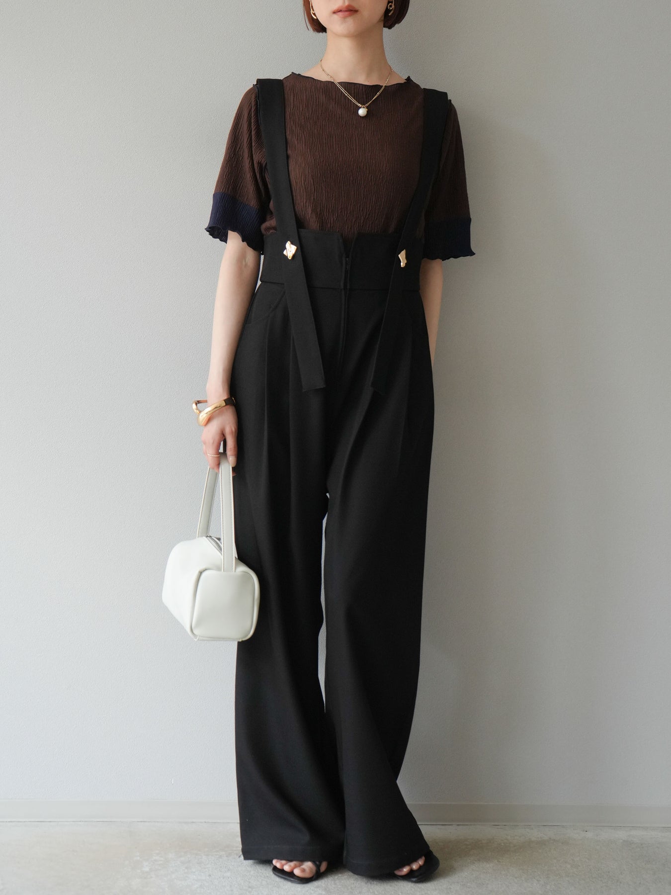 [SET]プリーツ配色ボートネックプルオーバー+ゴールドボタンサスペンダーワイドパンツ(2set)