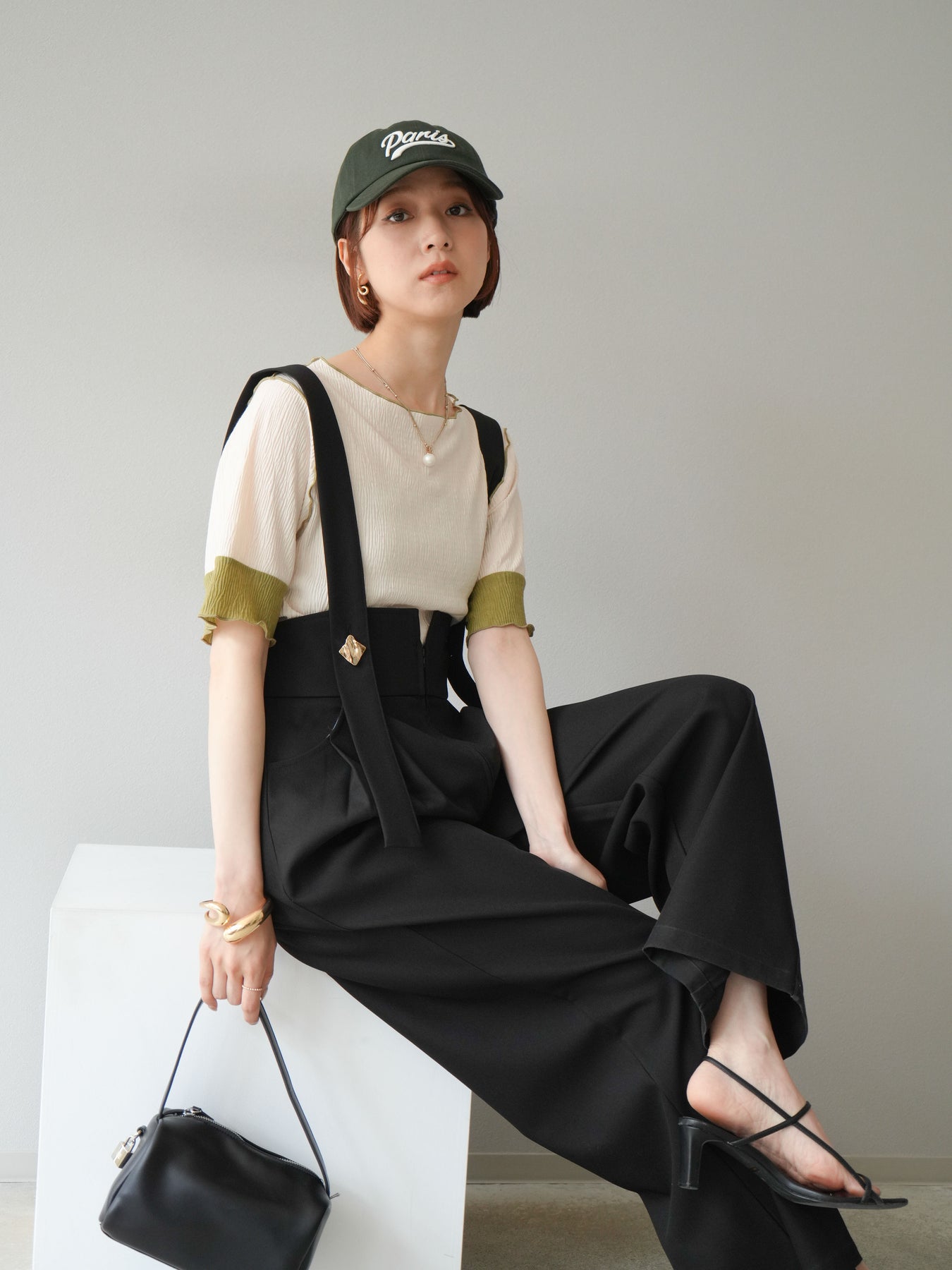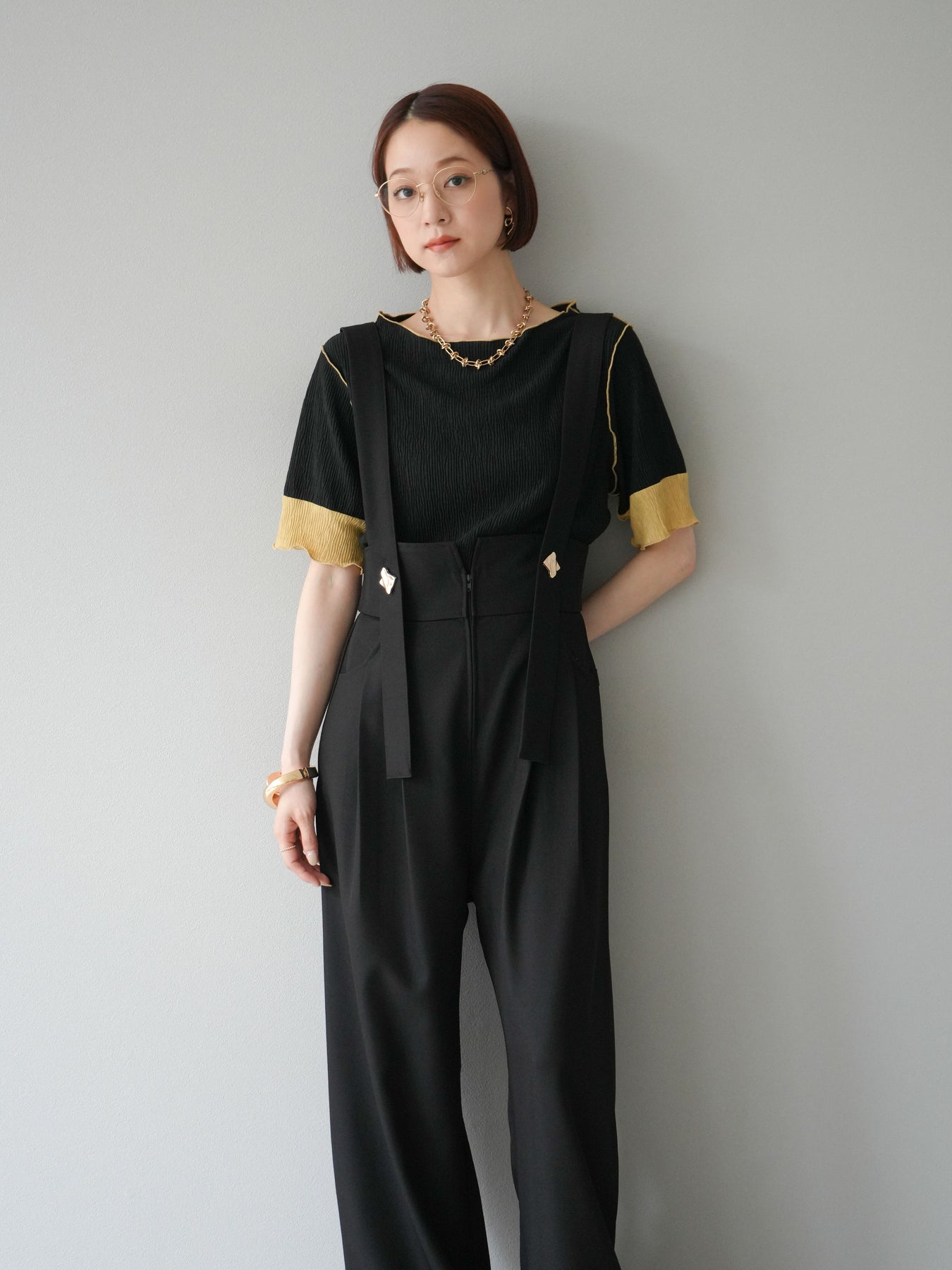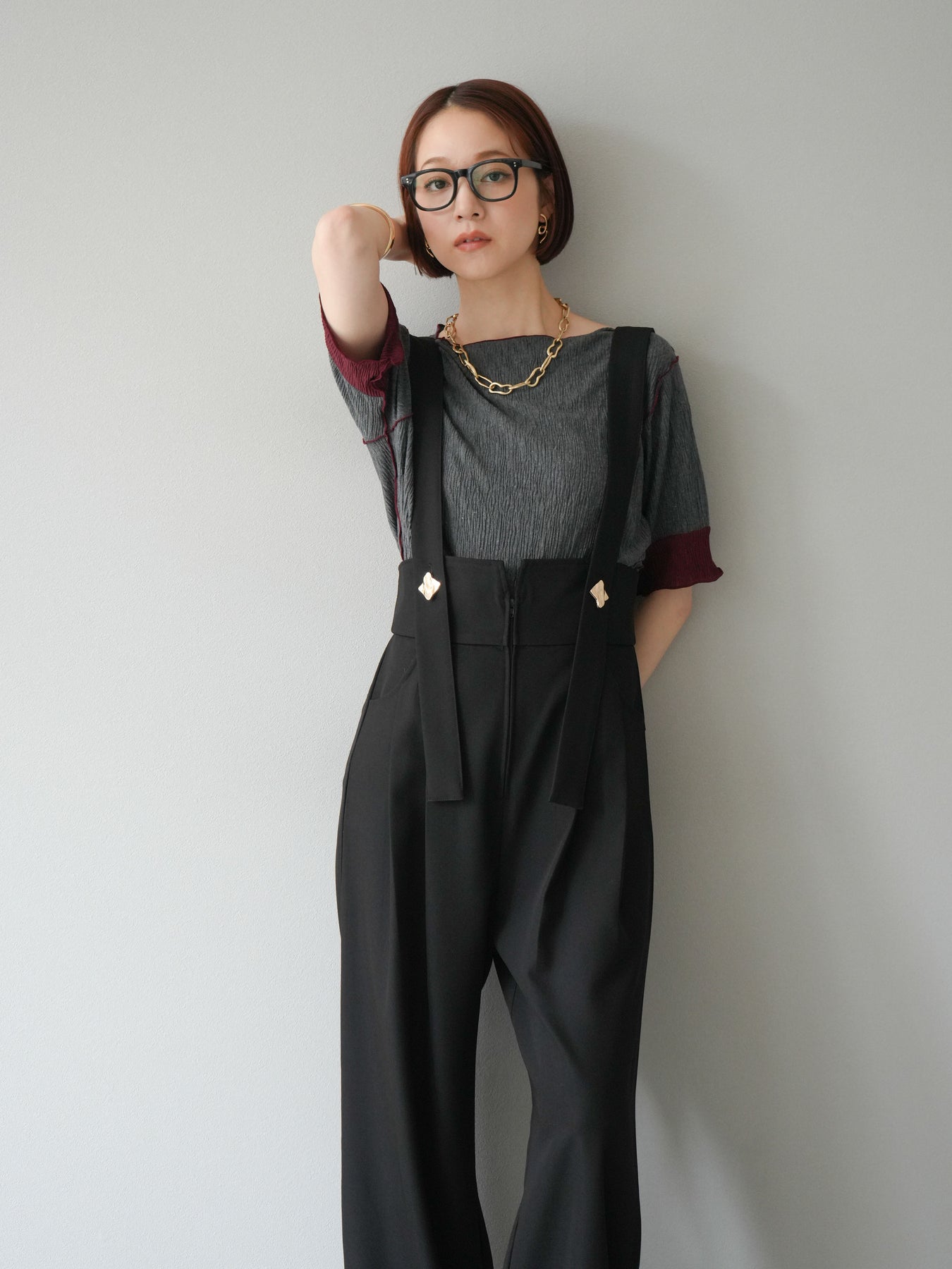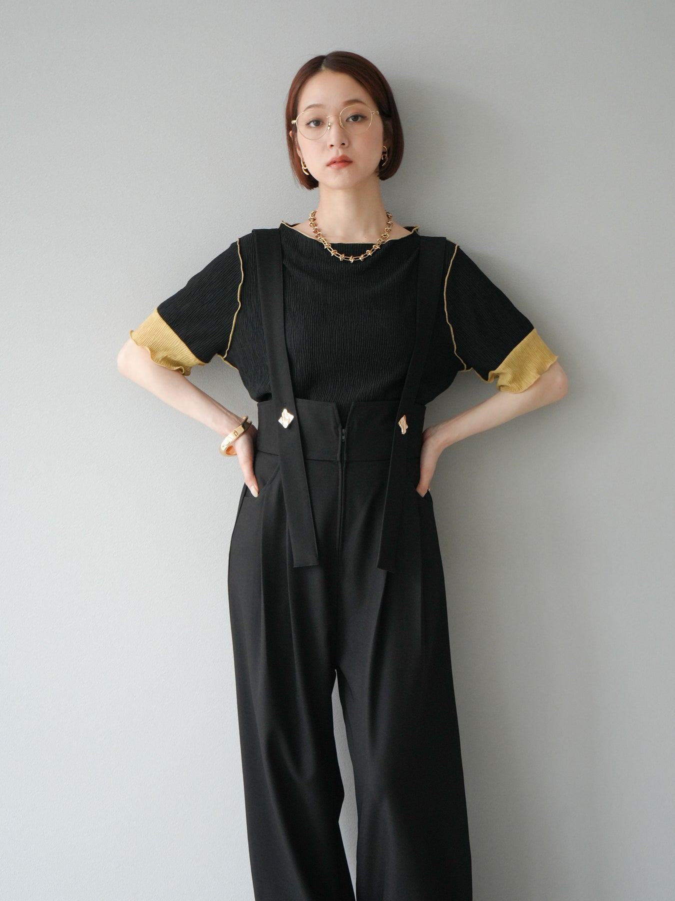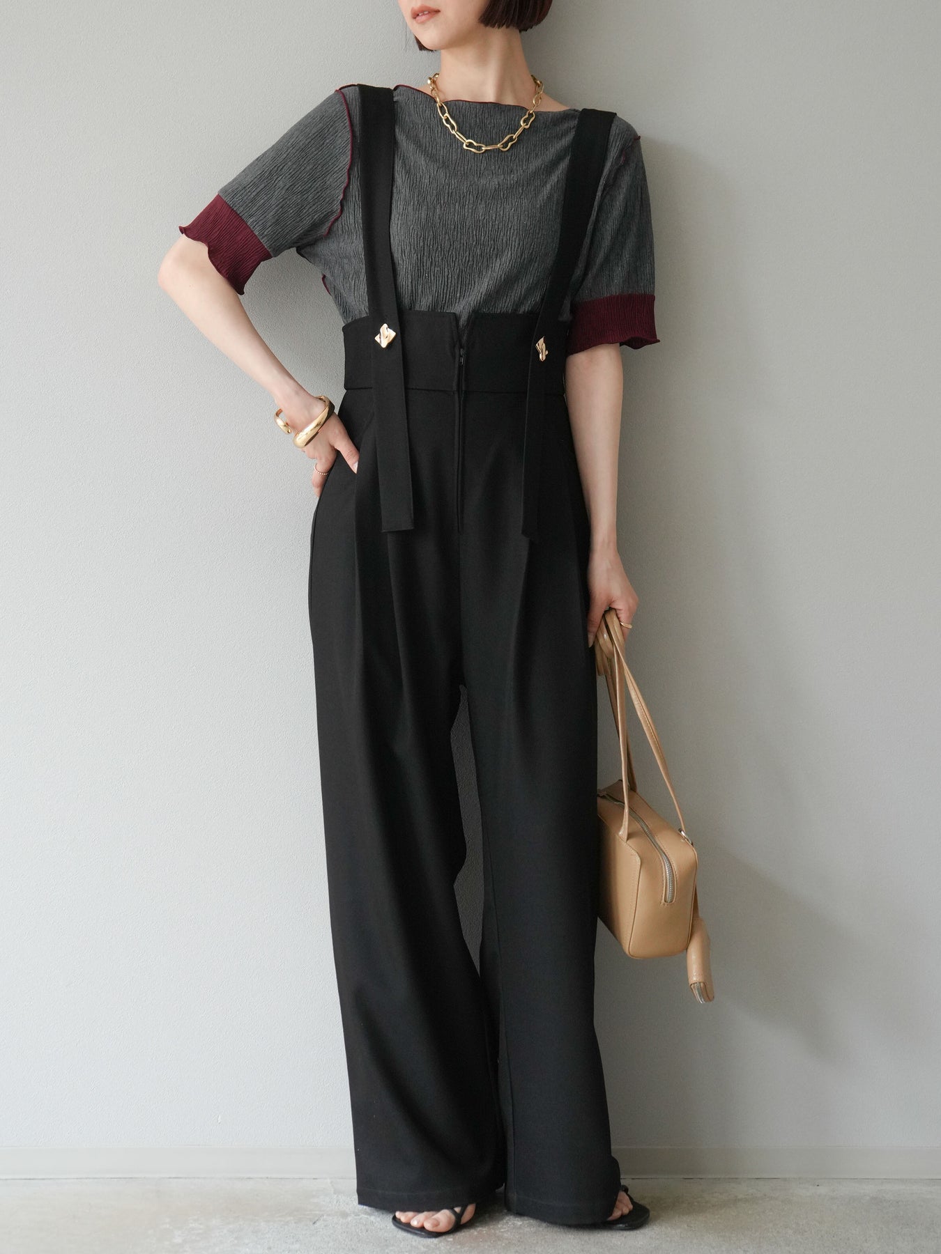 [SET]プリーツ配色ボートネックプルオーバー+ゴールドボタンサスペンダーワイドパンツ(2set)