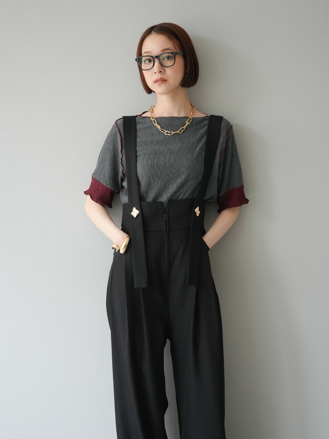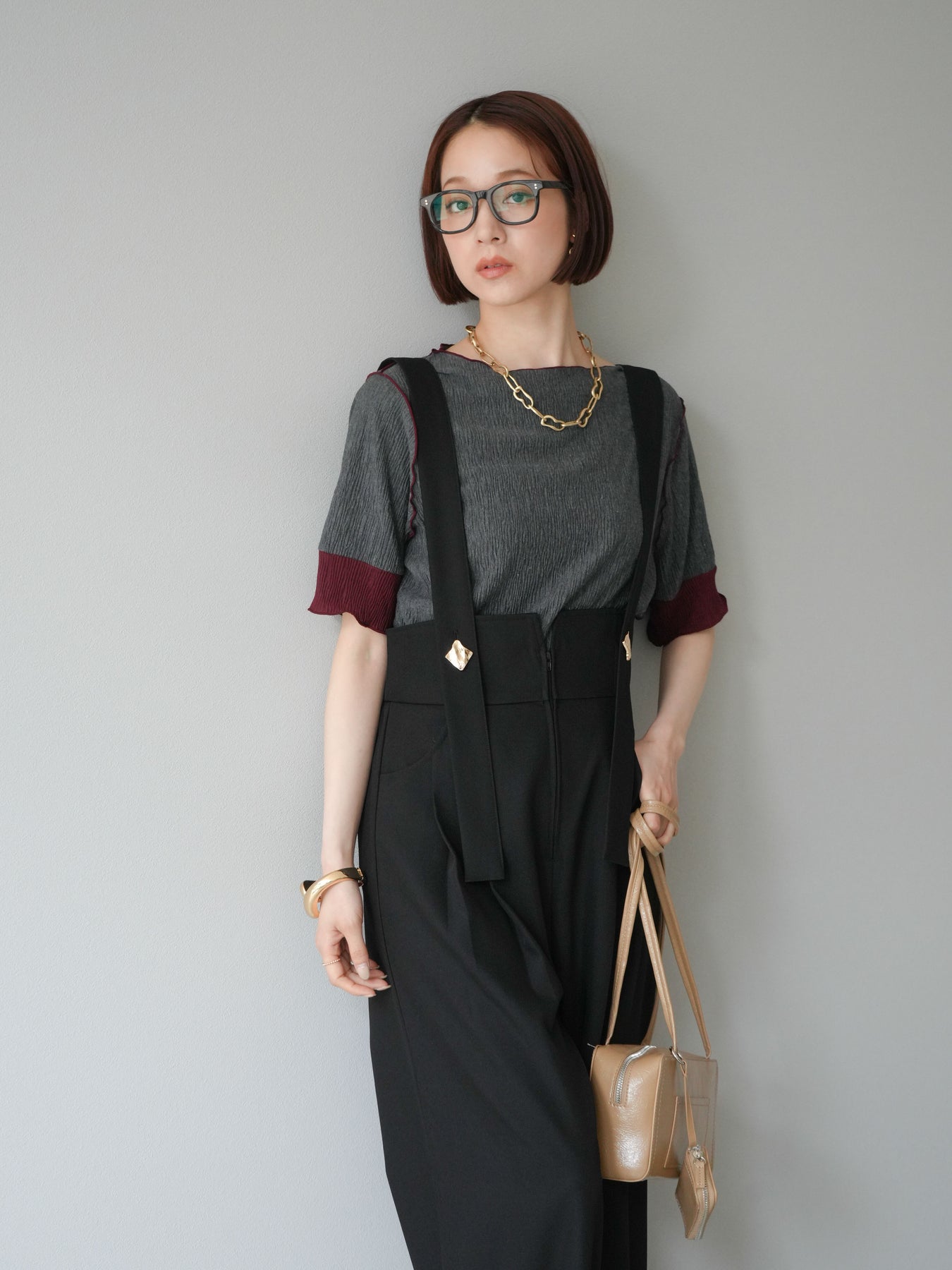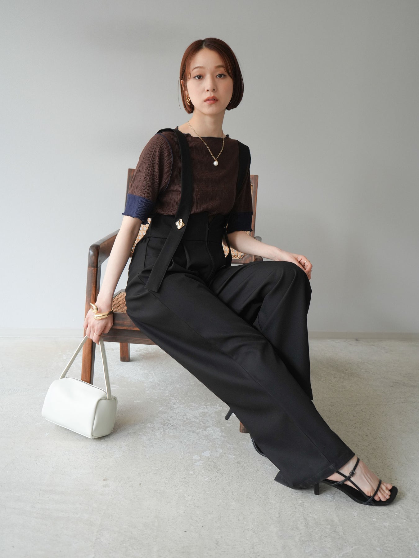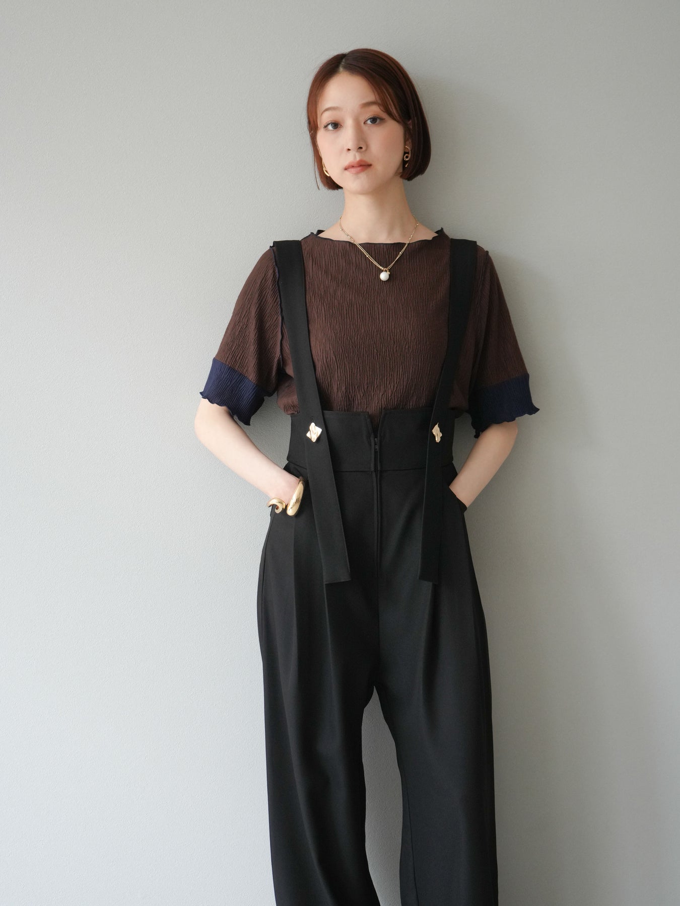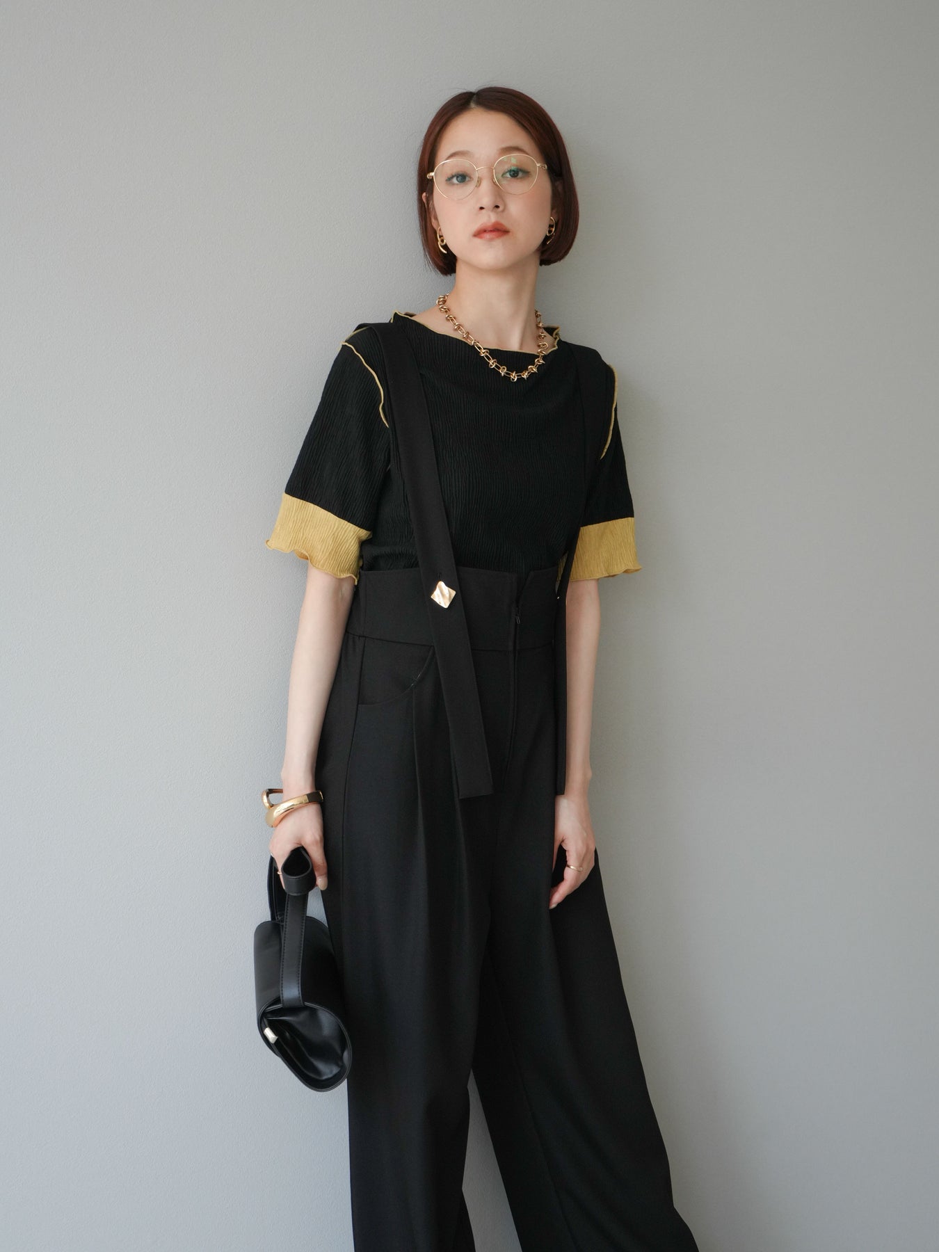 [SET]プリーツ配色ボートネックプルオーバー+ゴールドボタンサスペンダーワイドパンツ(2set)