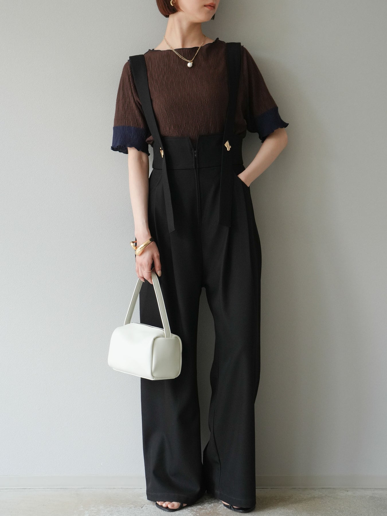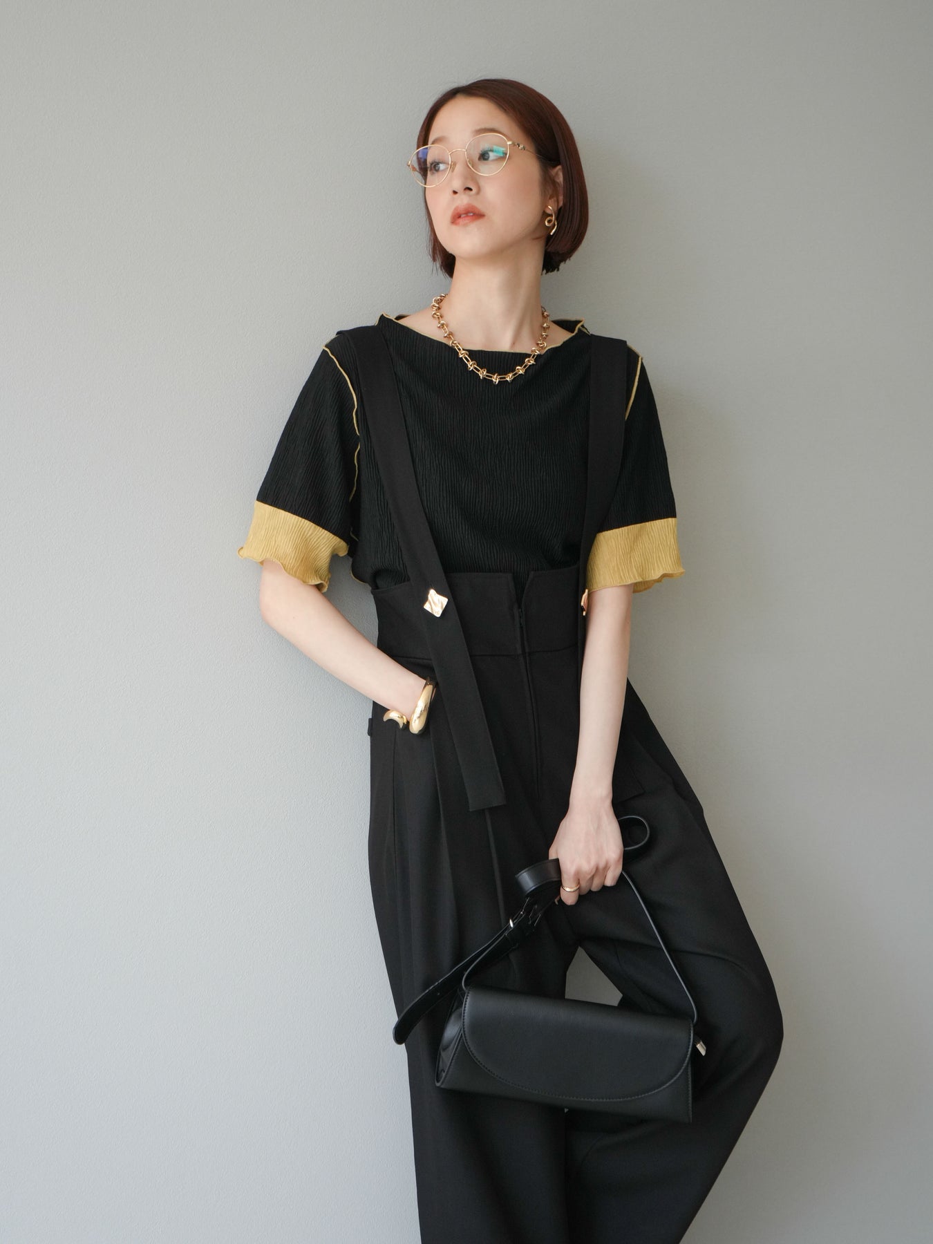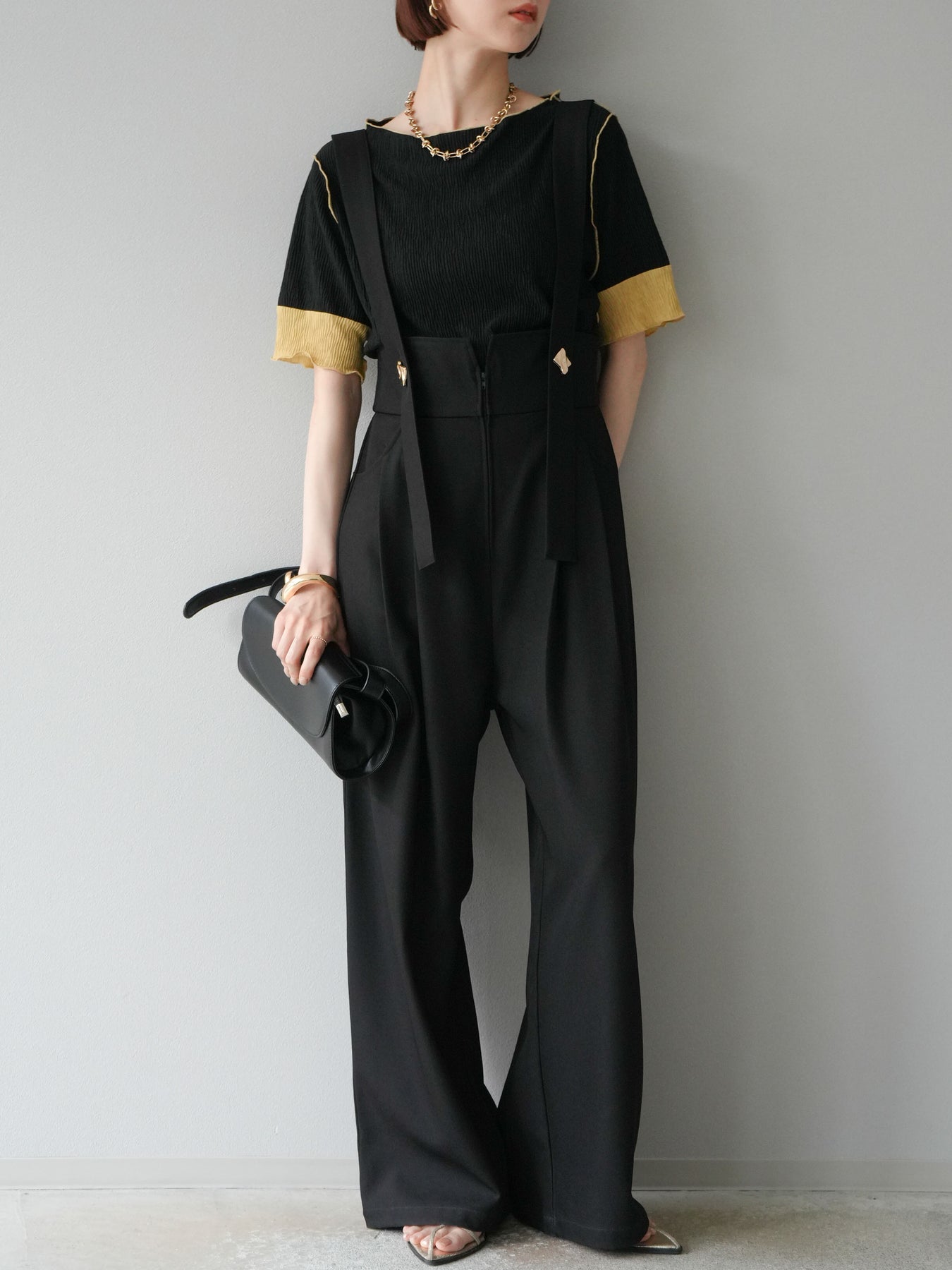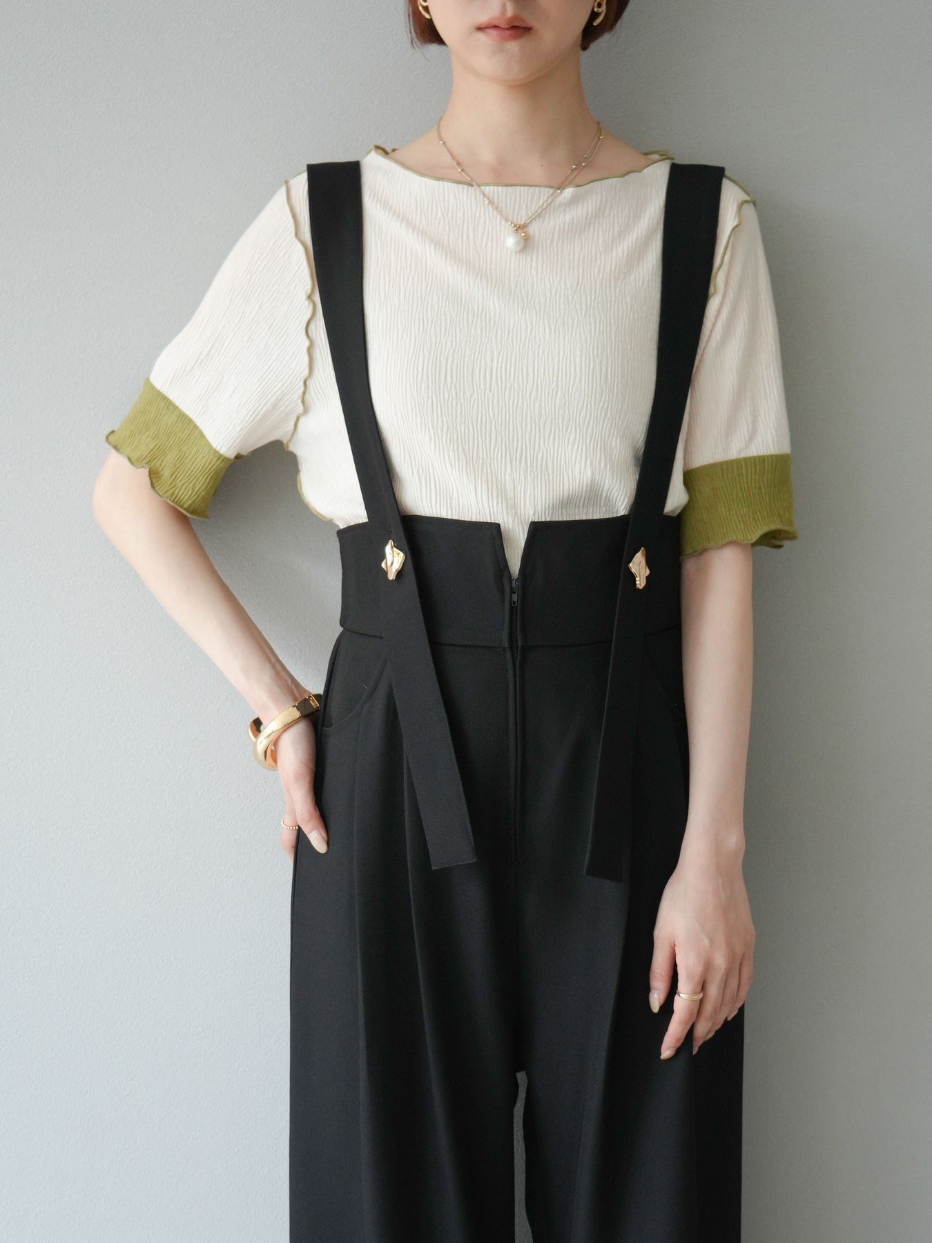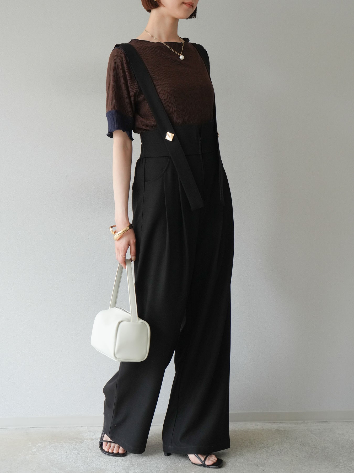 [SET]プリーツ配色ボートネックプルオーバー+ゴールドボタンサスペンダーワイドパンツ(2set)