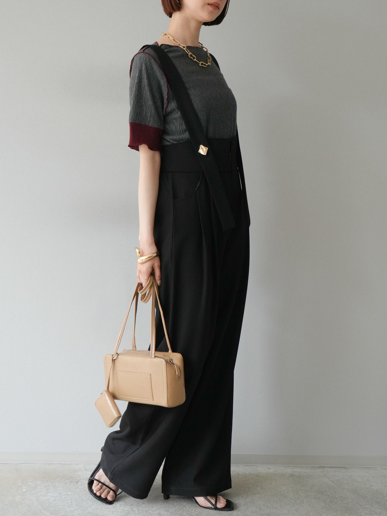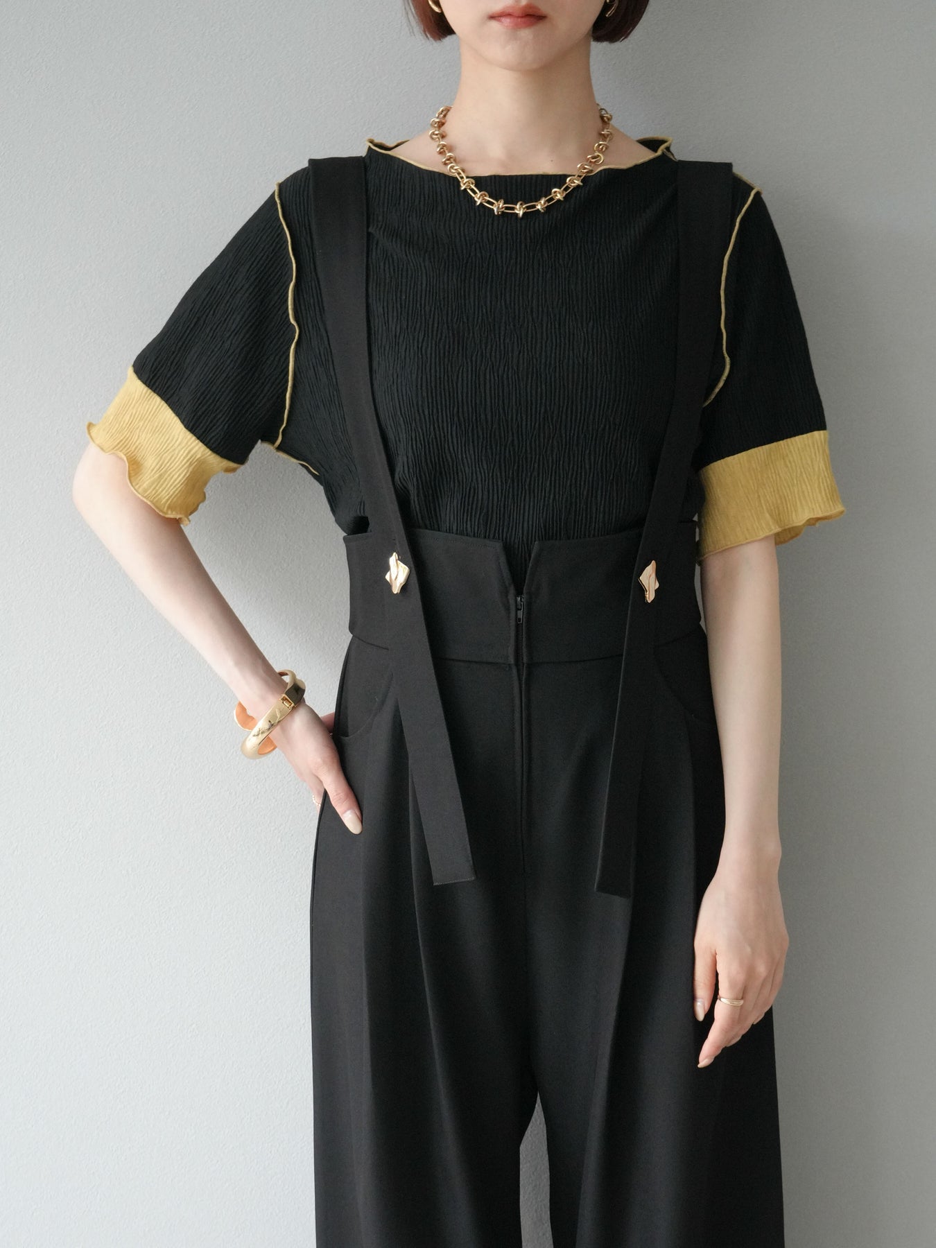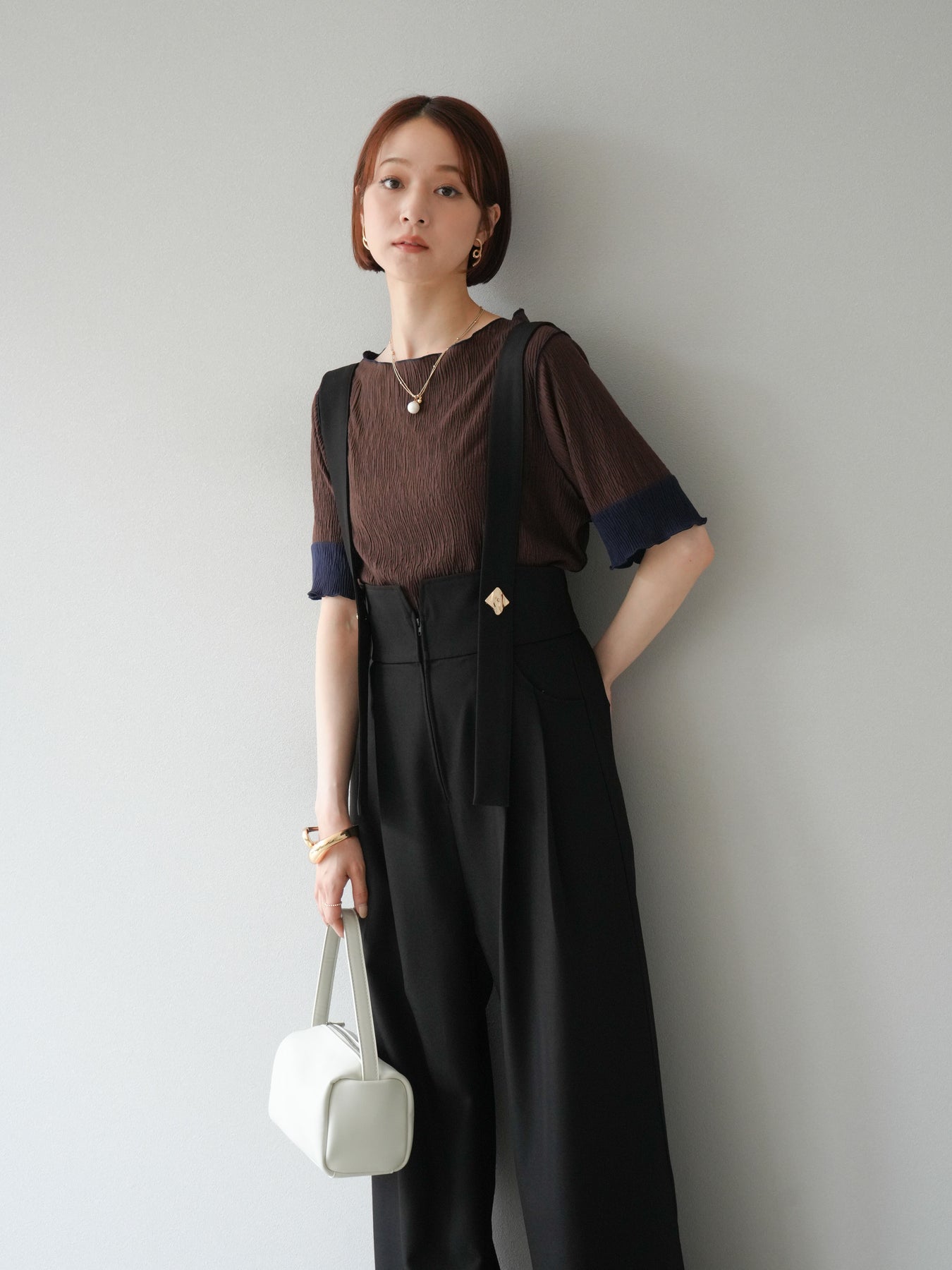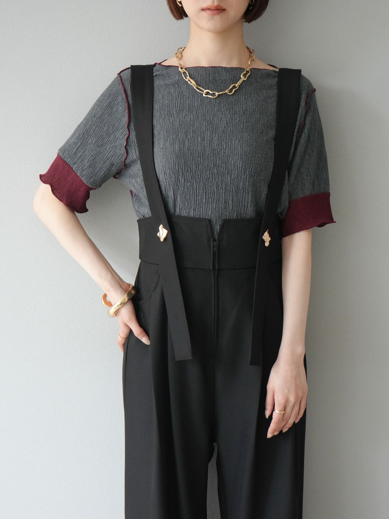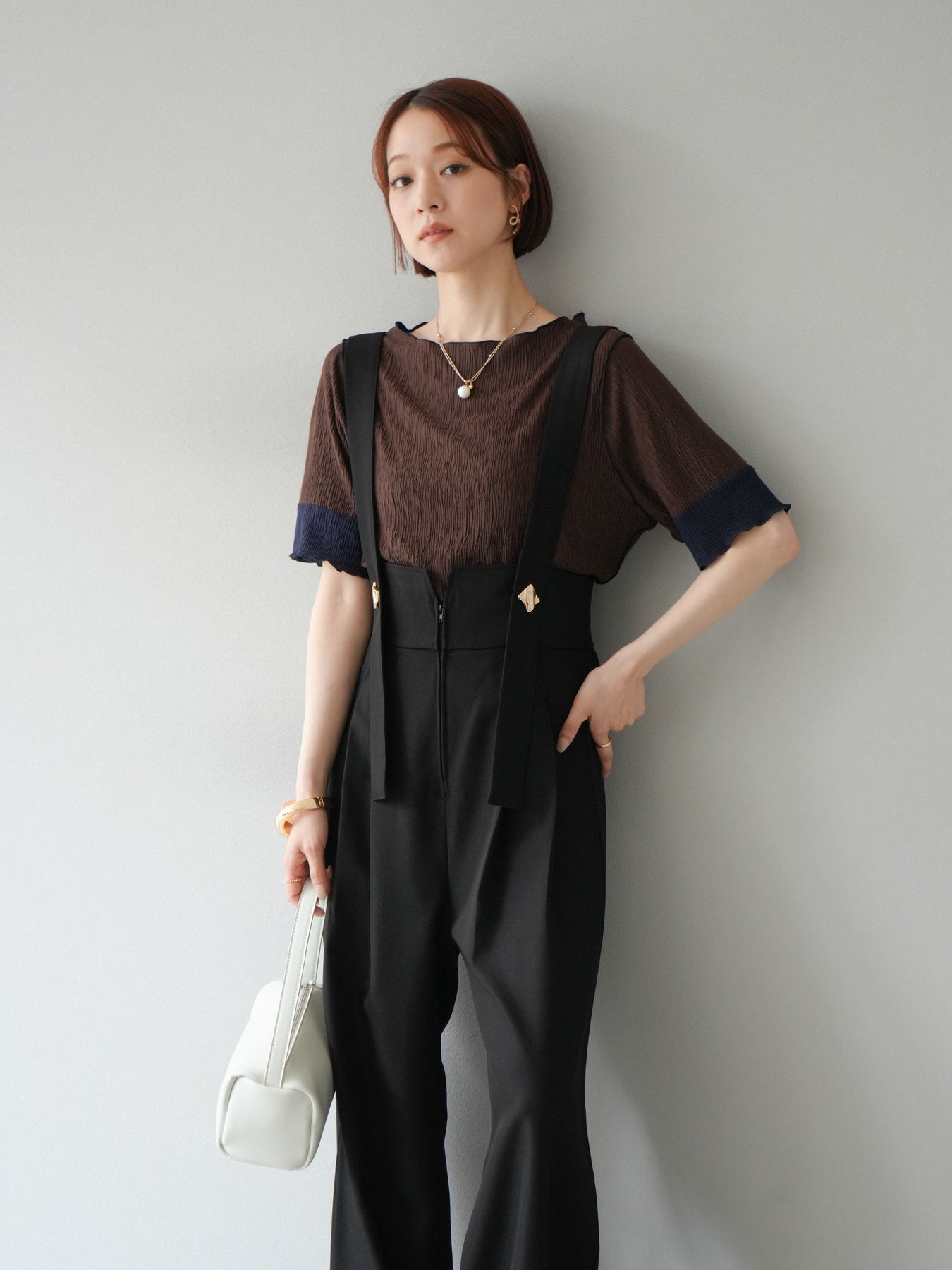 [SET]プリーツ配色ボートネックプルオーバー+ゴールドボタンサスペンダーワイドパンツ(2set)