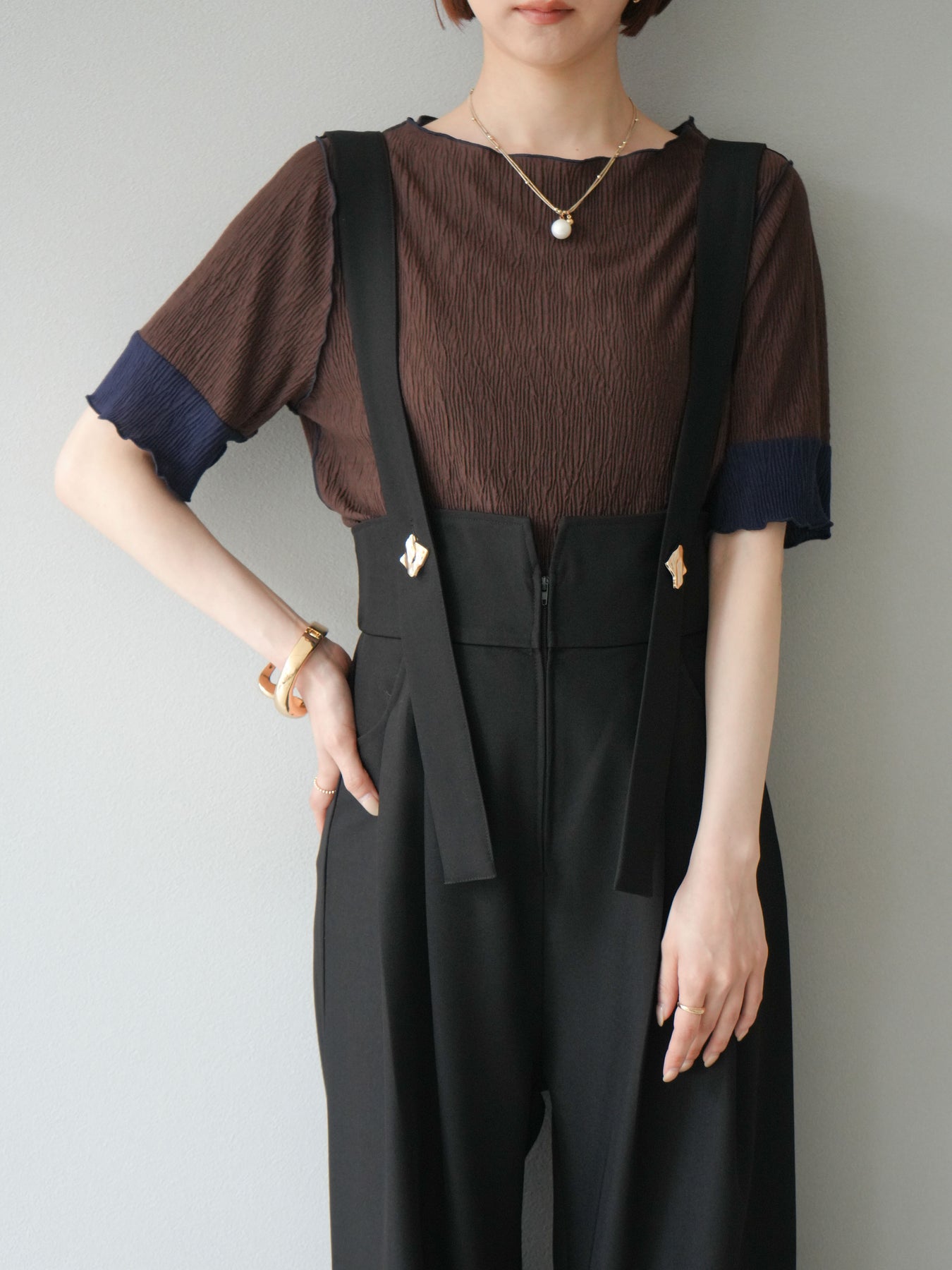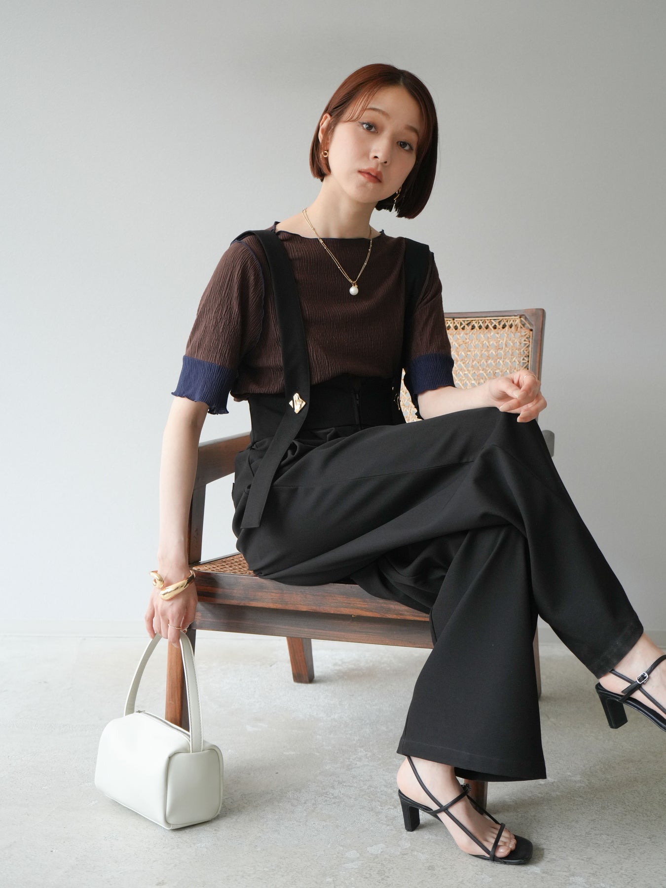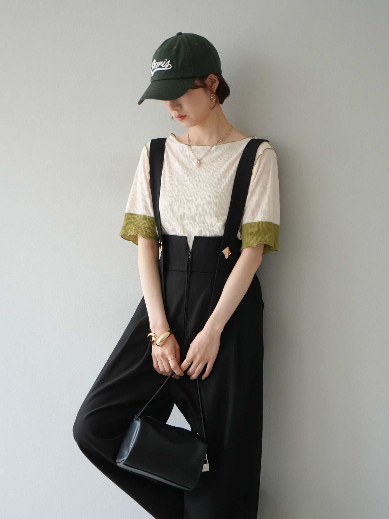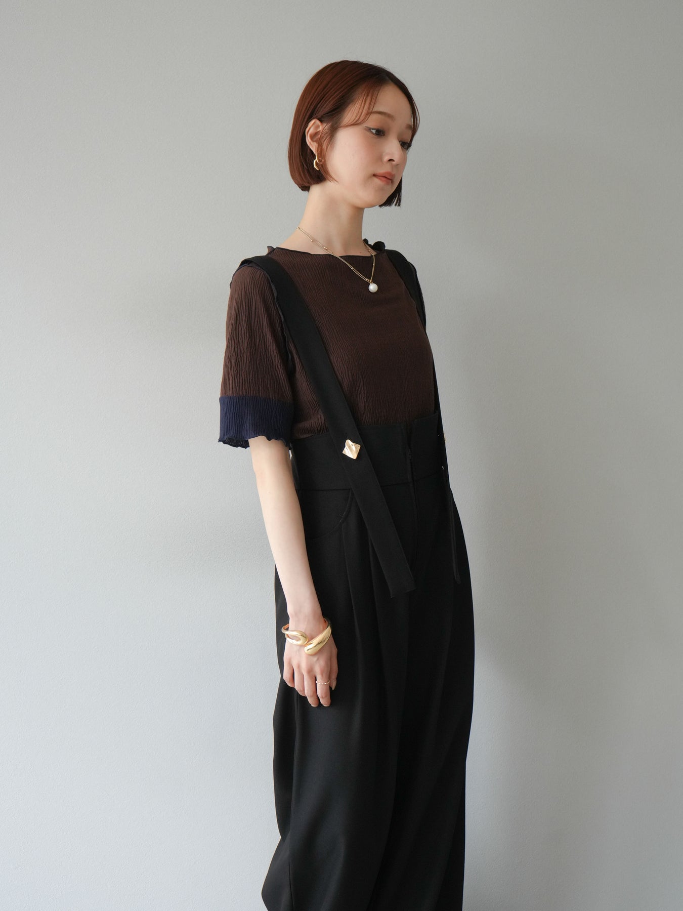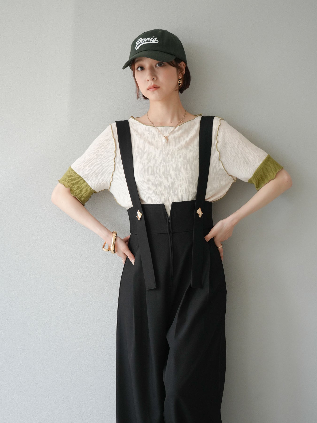 [SET]プリーツ配色ボートネックプルオーバー+ゴールドボタンサスペンダーワイドパンツ(2set)