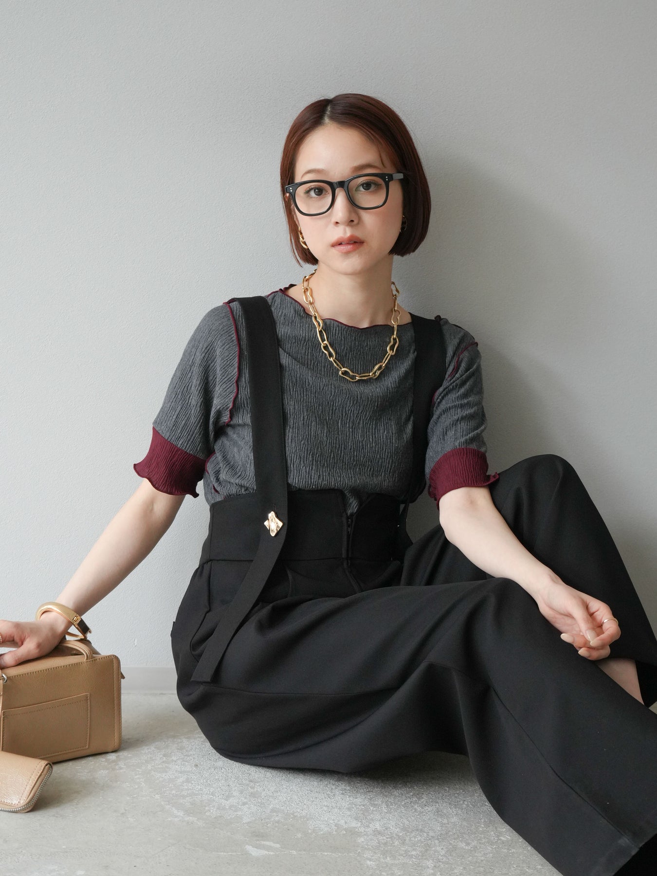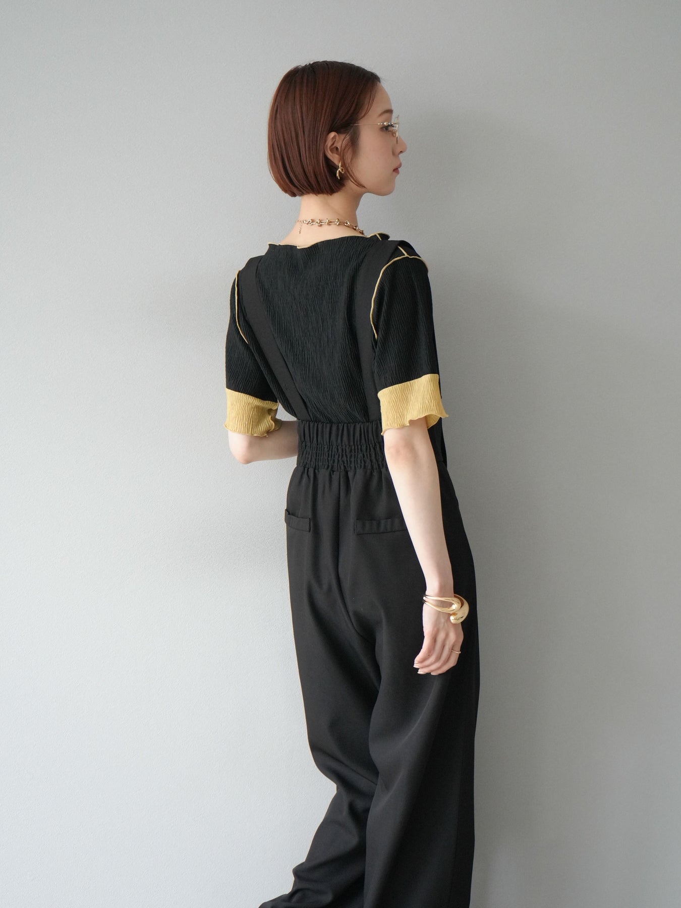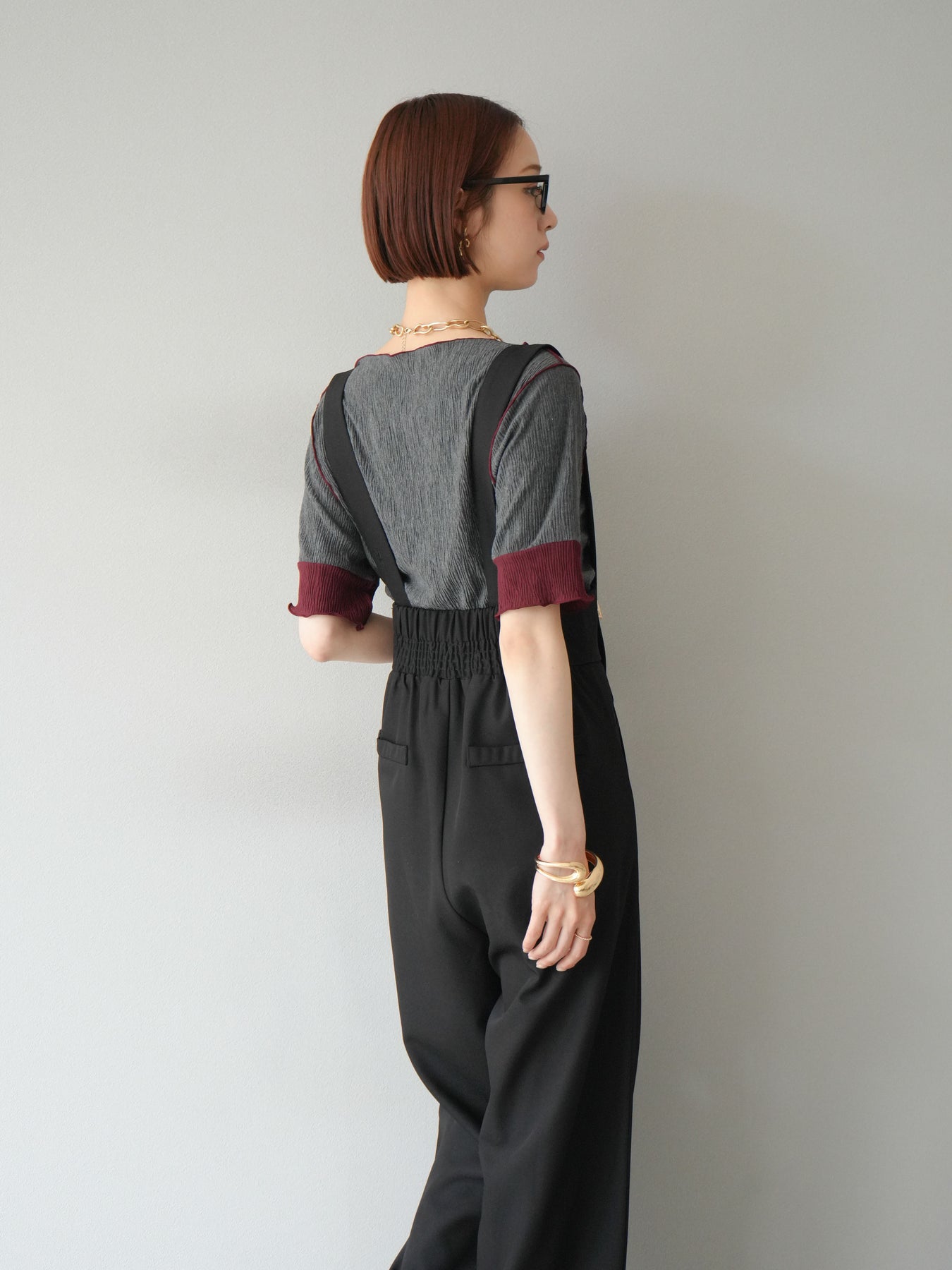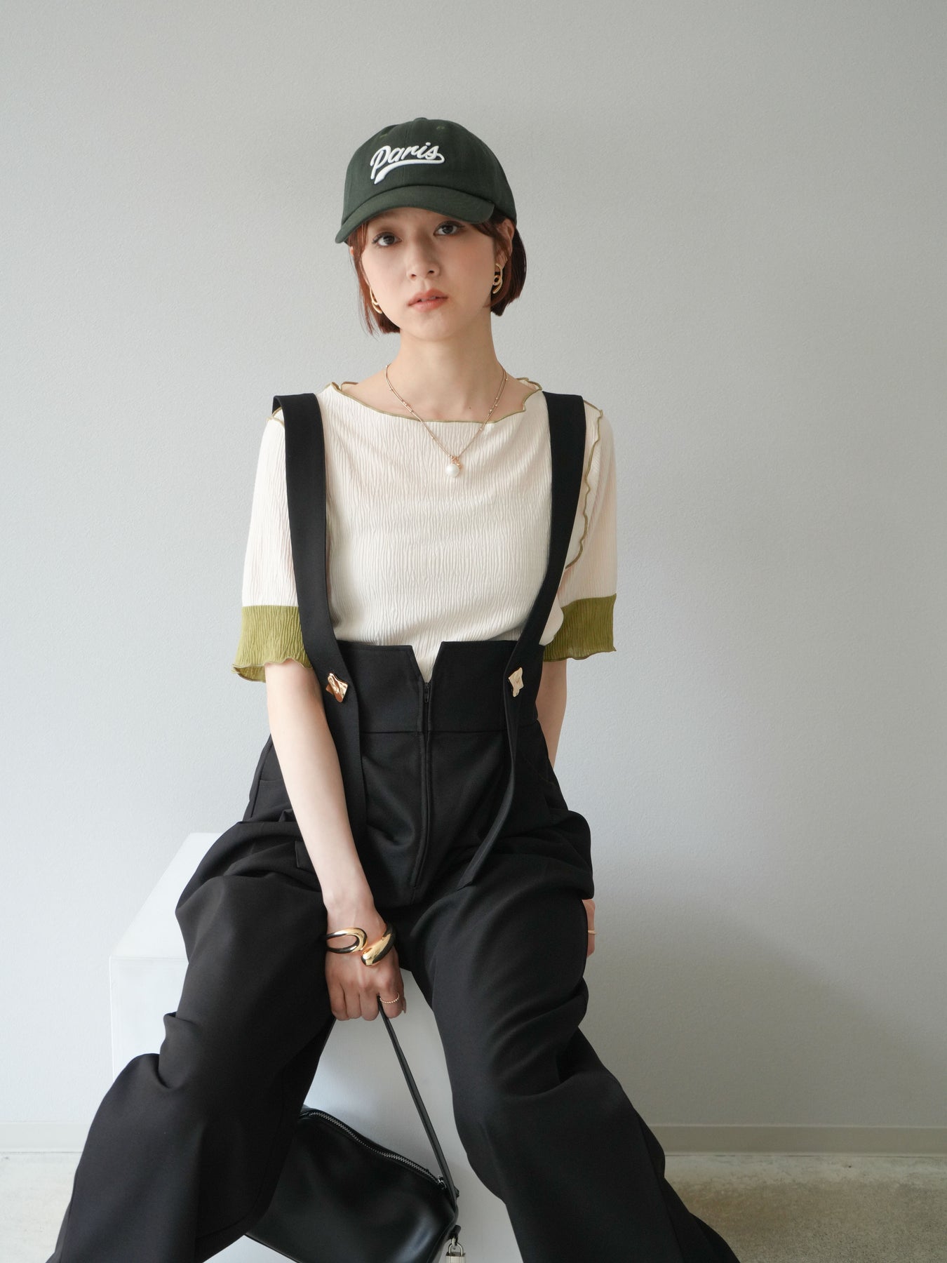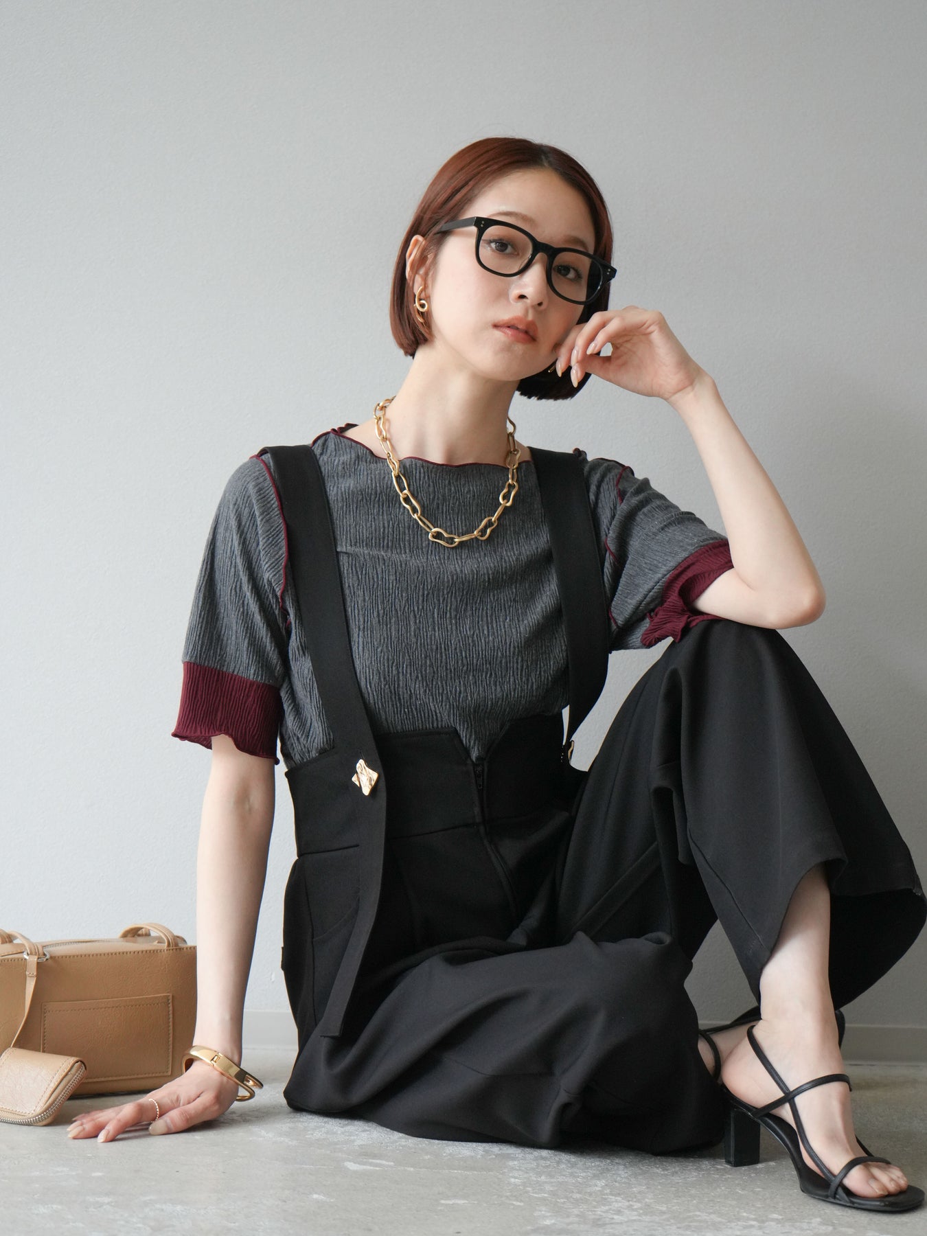 [SET]プリーツ配色ボートネックプルオーバー+ゴールドボタンサスペンダーワイドパンツ(2set)