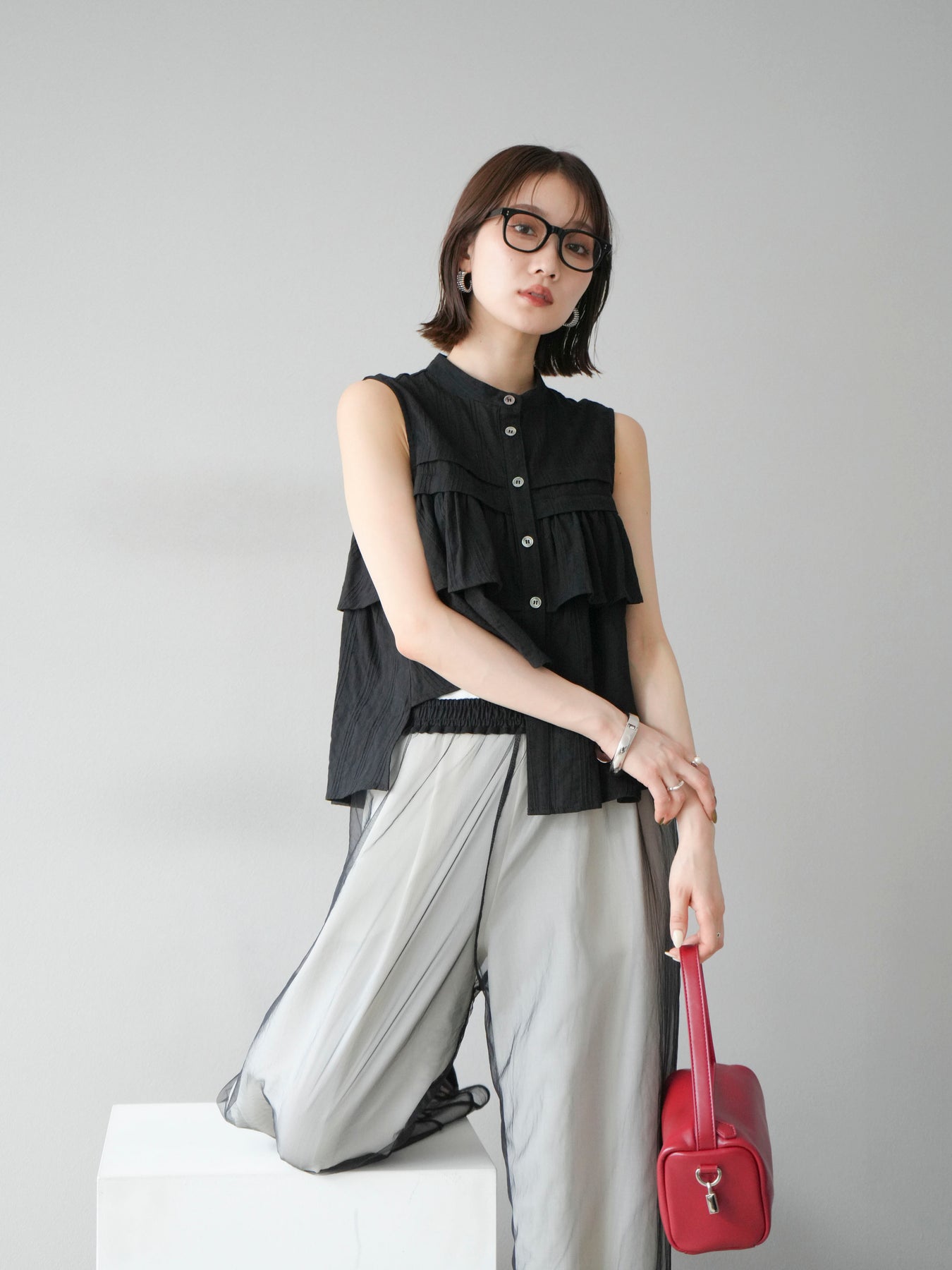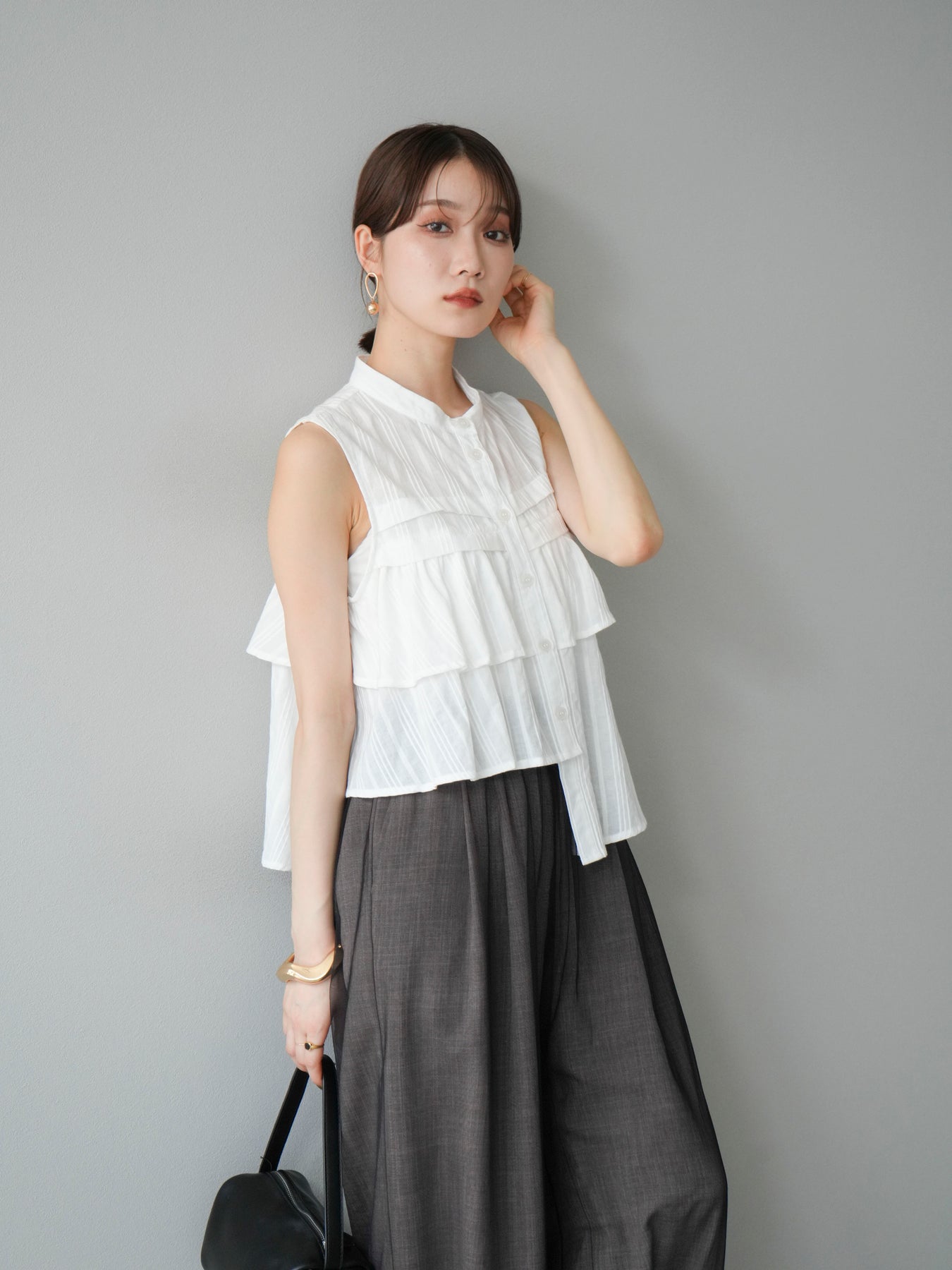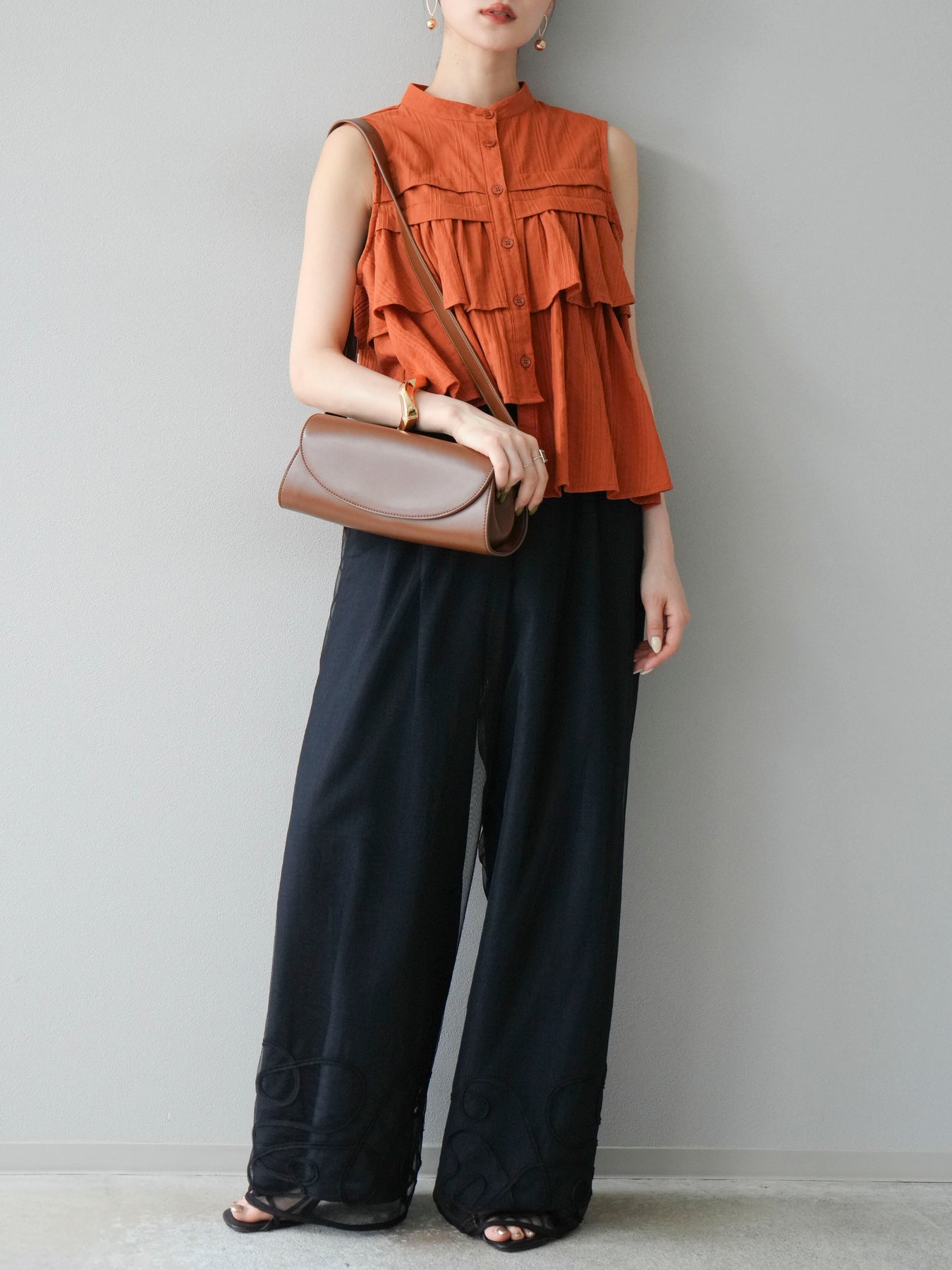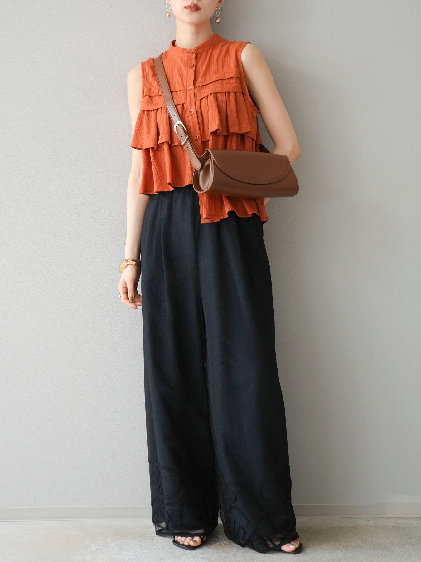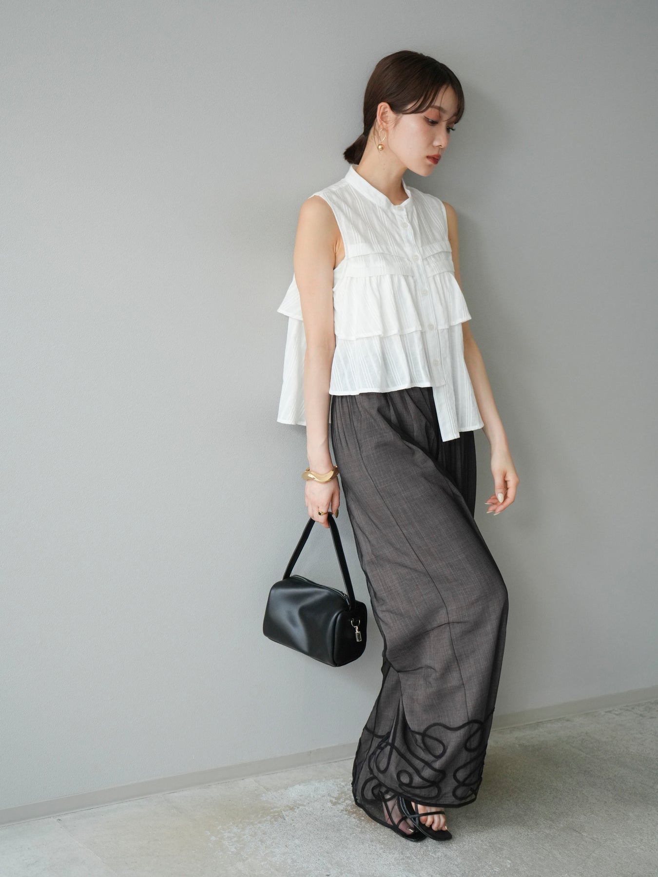 [SET]ドビーストライプアシンメトリーフリルノースリブラウス+コード刺繍チュールレイヤードパンツ+リネンライクイージーワイドパンツ(3set)
