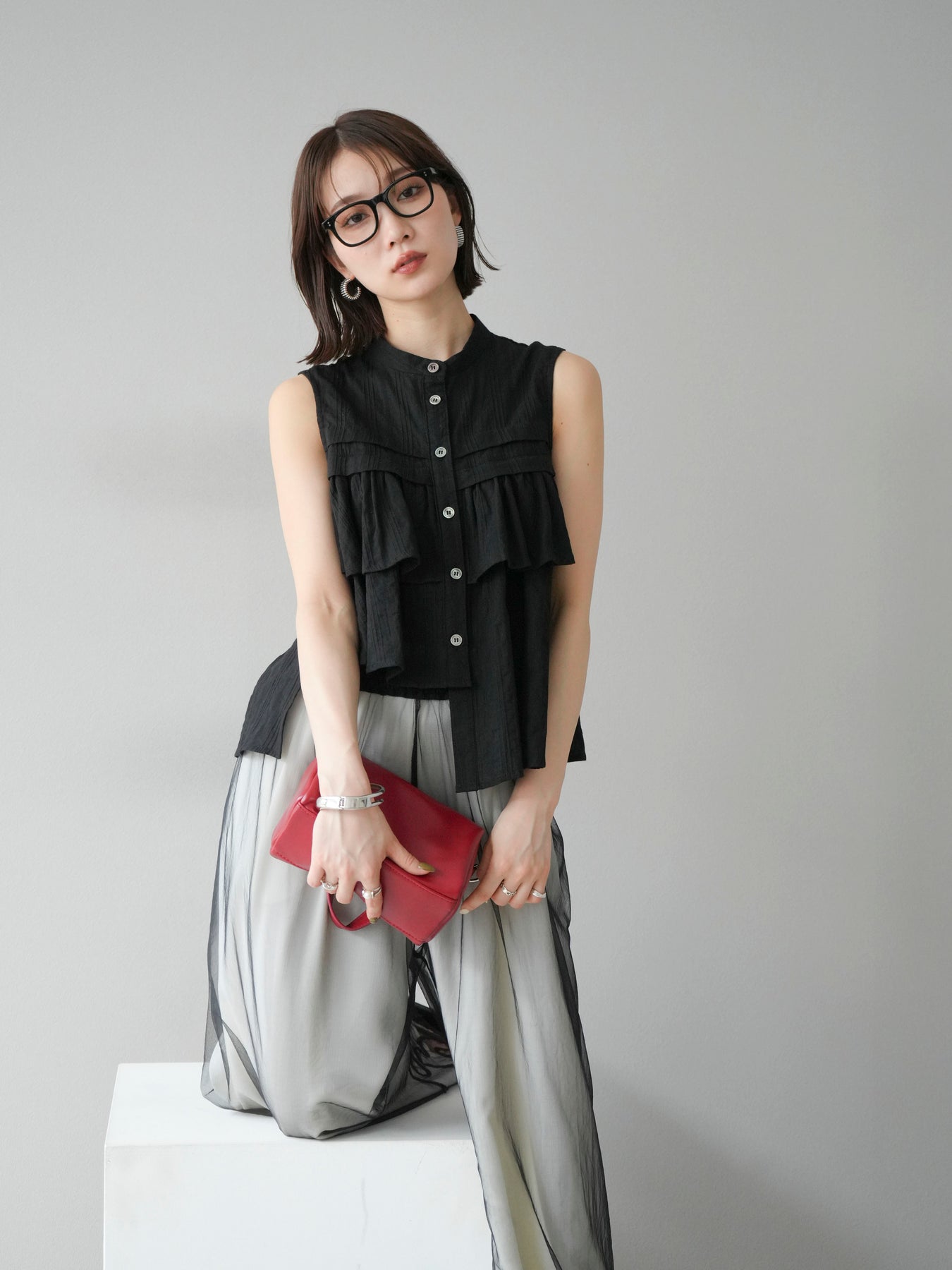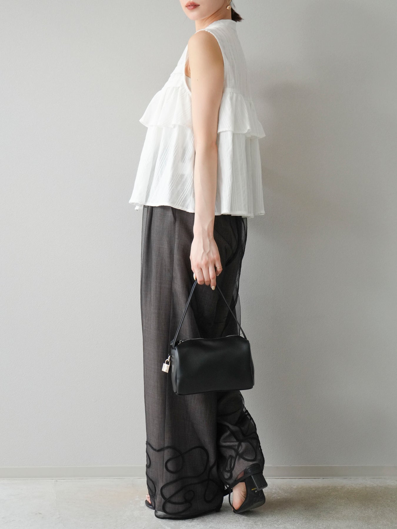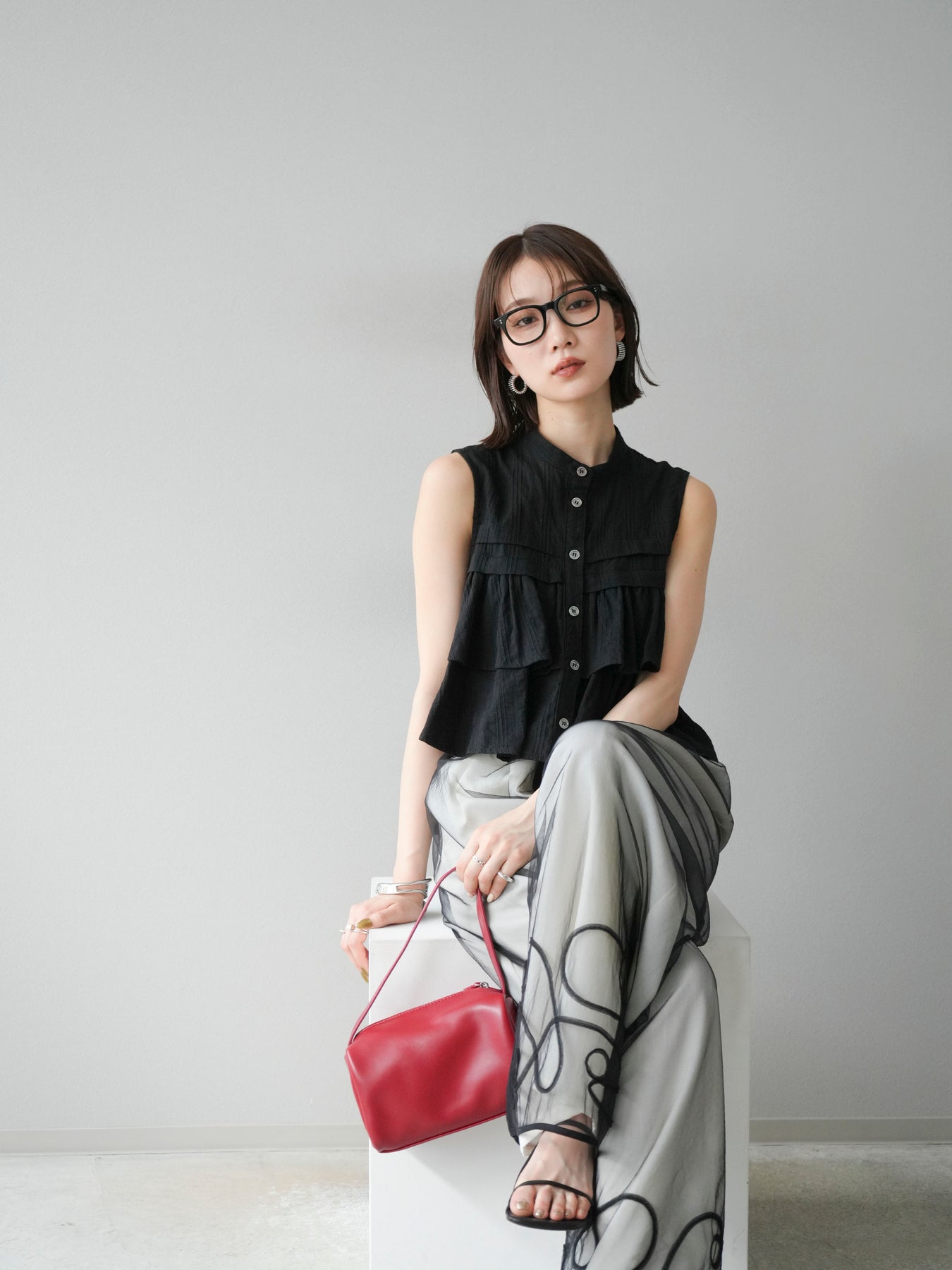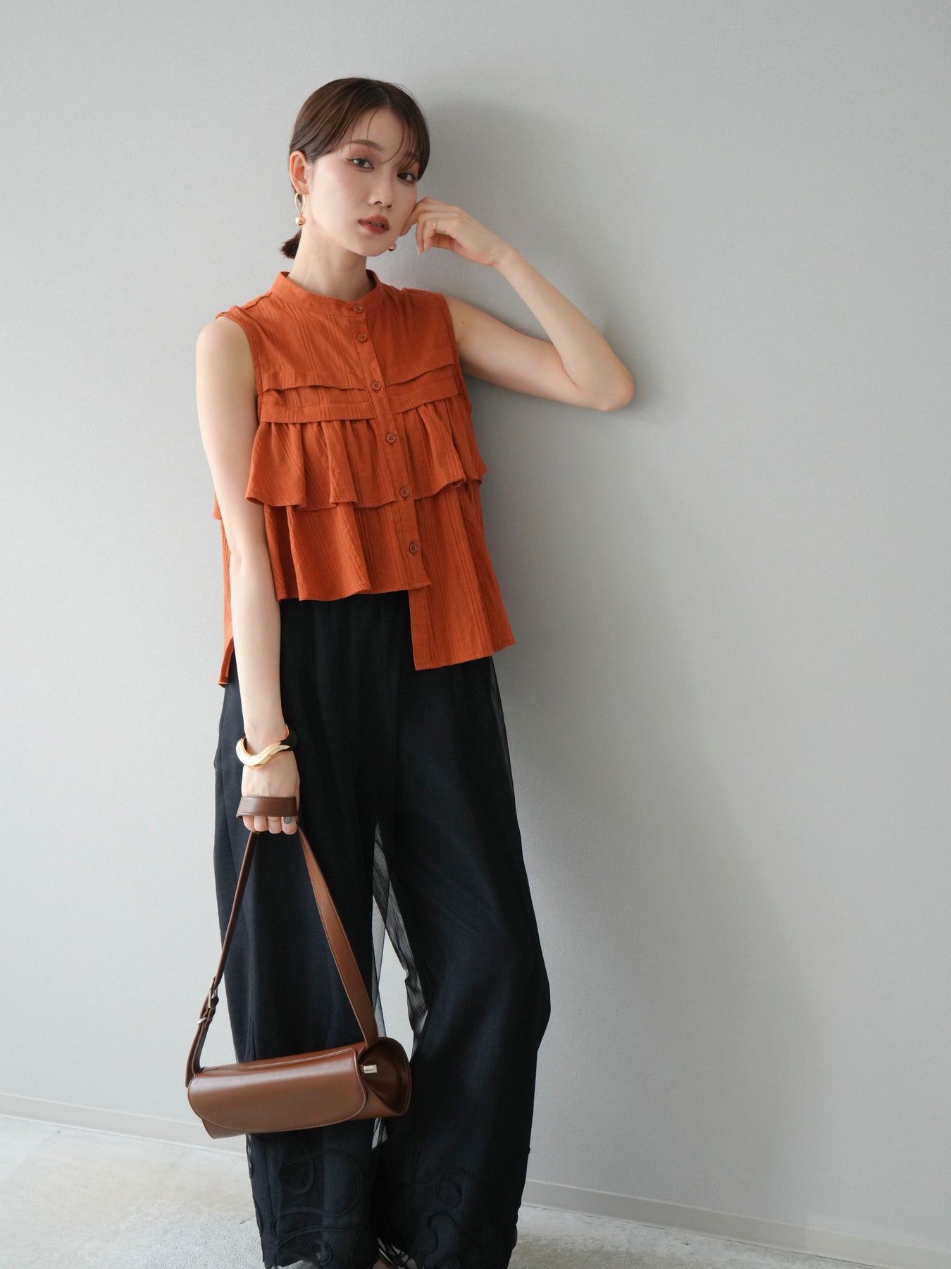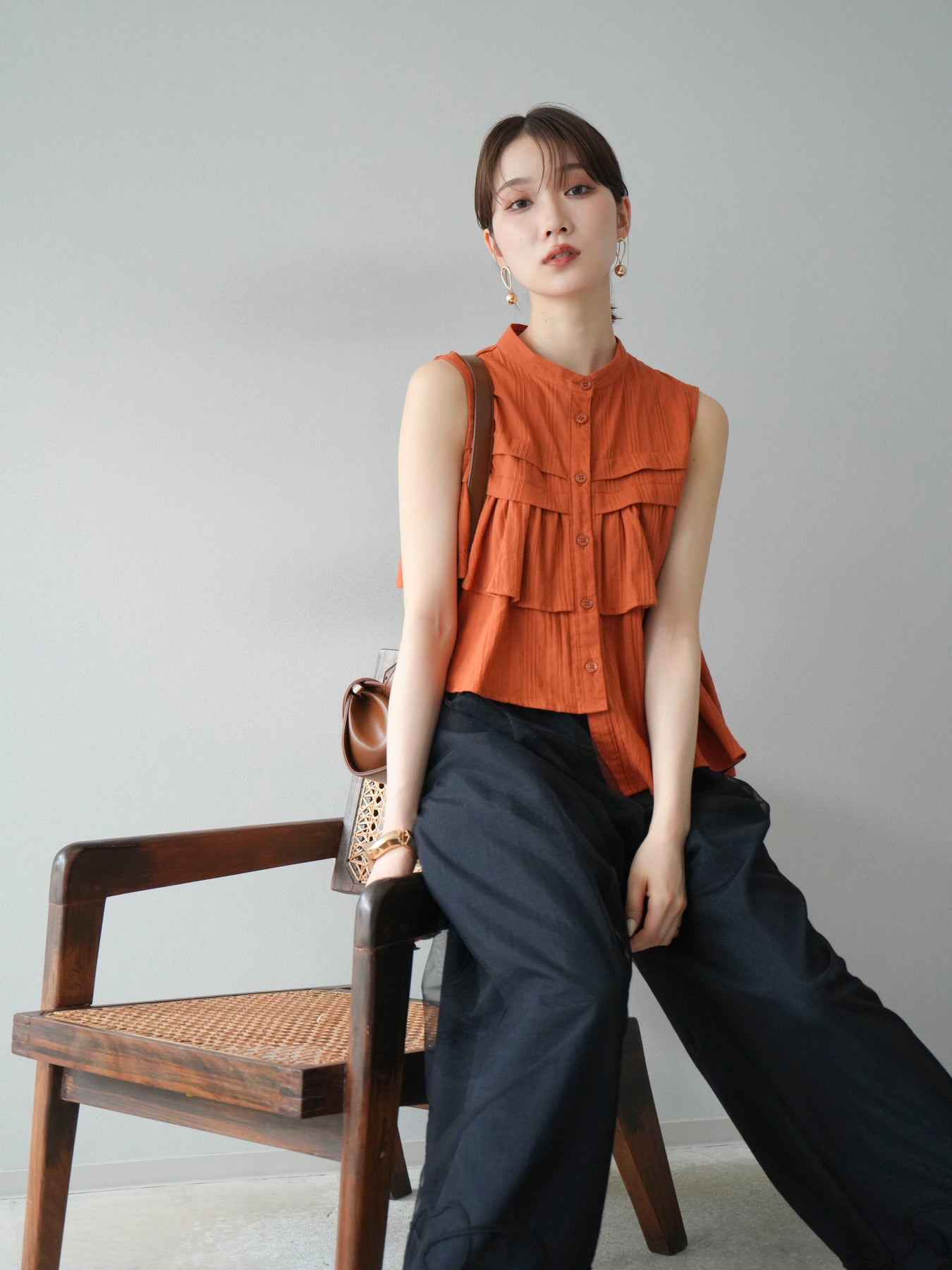 [SET]ドビーストライプアシンメトリーフリルノースリブラウス+コード刺繍チュールレイヤードパンツ+リネンライクイージーワイドパンツ(3set)
