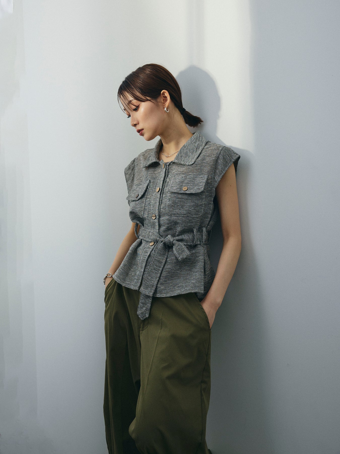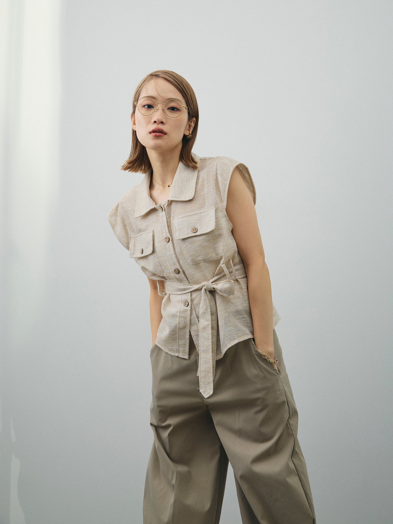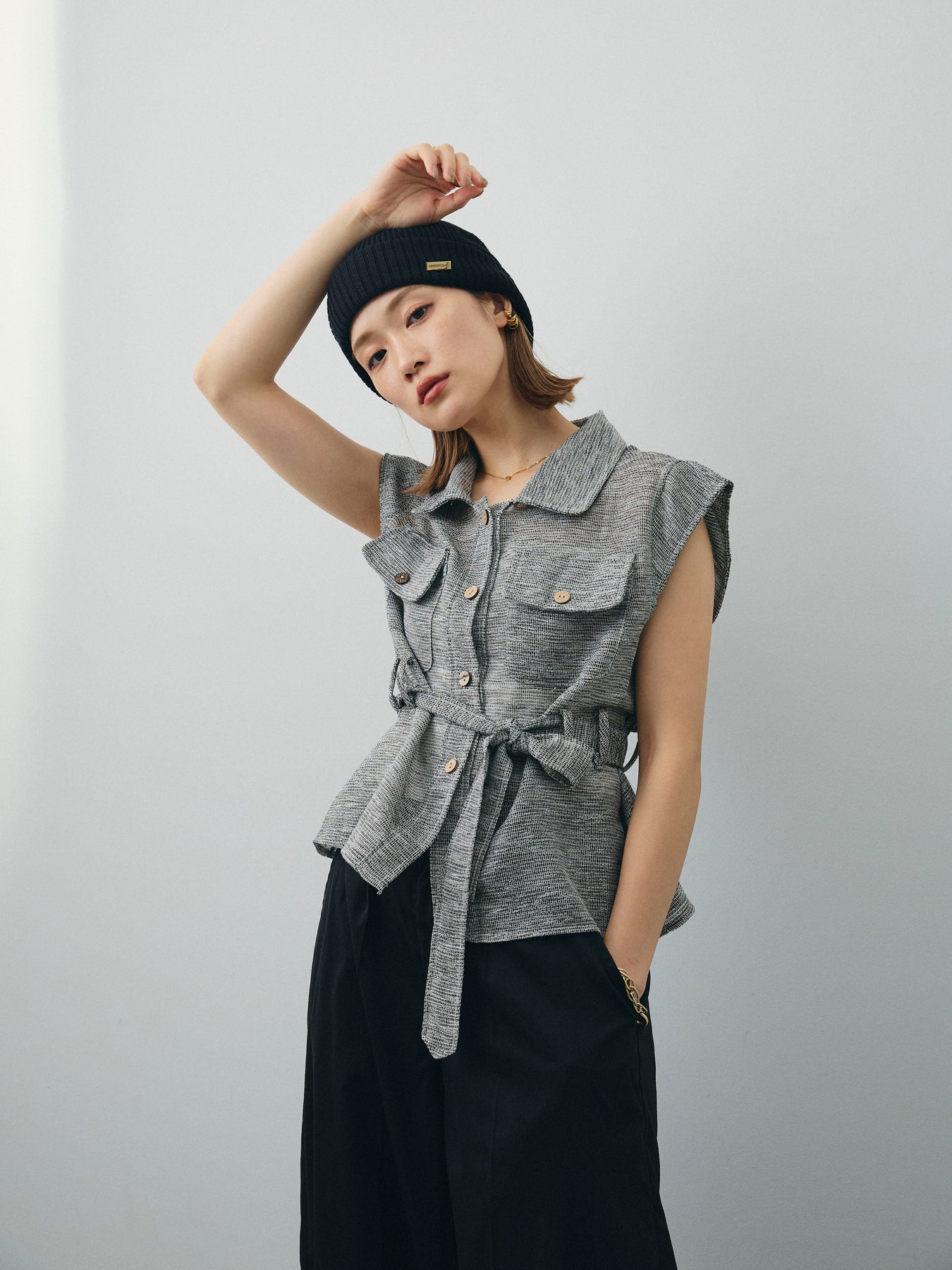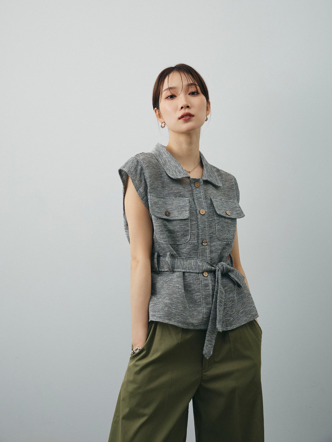異素材のミックスヤーンで編み上げた、表情豊かなメッシュ素材が魅力のノースリーブブラウス。 通気性に優れた軽やかな着心地と、ニュアンスのある色合いが大人の抜け感を演出します。 ウエストは共布リボン付きで、シルエットにメリハリを出した着こなしが可能。 胸元の大きめポケットや開襟デザインが、カジュアルながらもきちんと感をプラスします。 インナー次第で季節を問わず着回しができ、パンツにもスカートにも合わせやすい万能アイテム。 一枚で主役になる、大人のための涼しげサマーブラウスです。