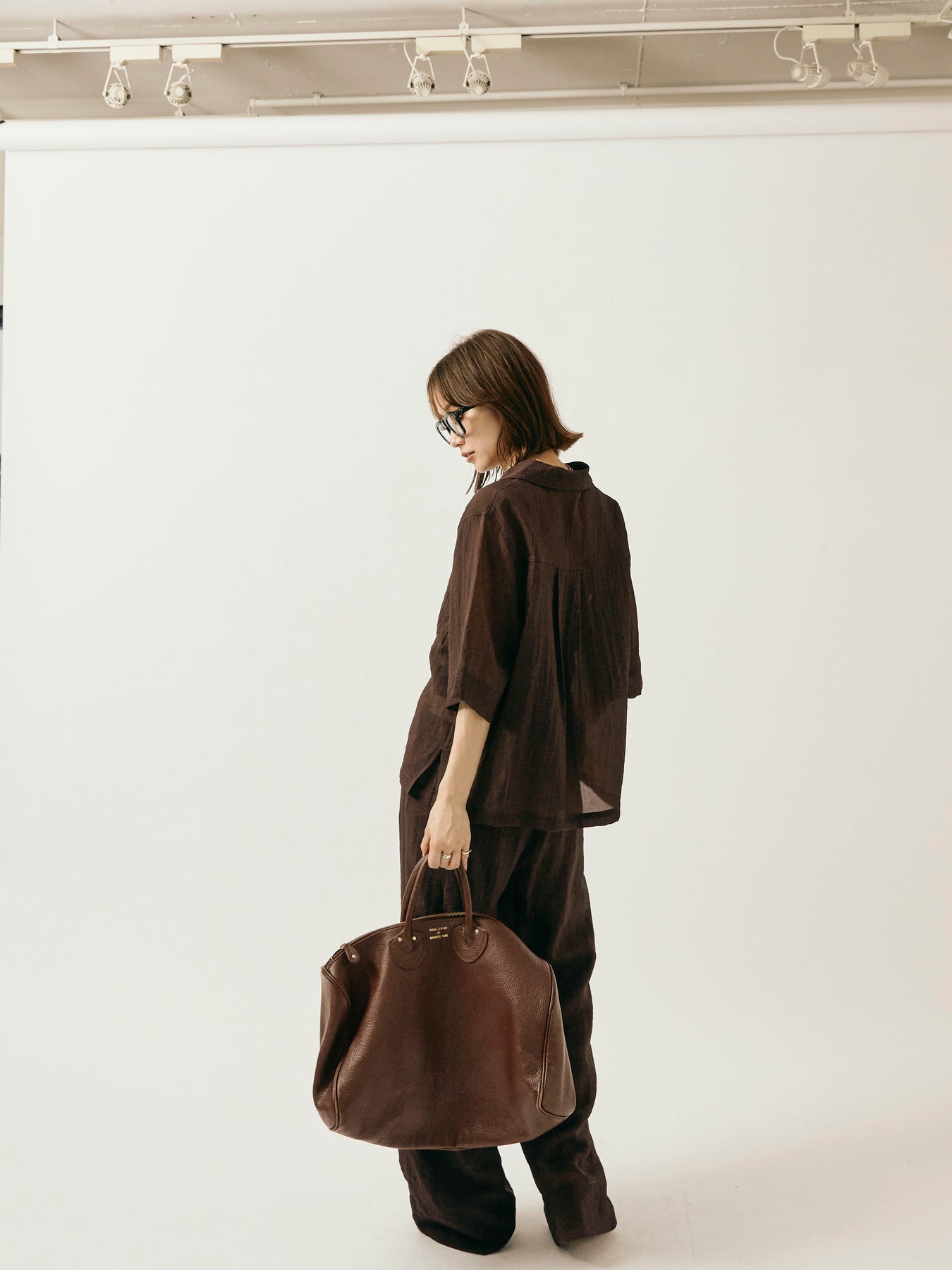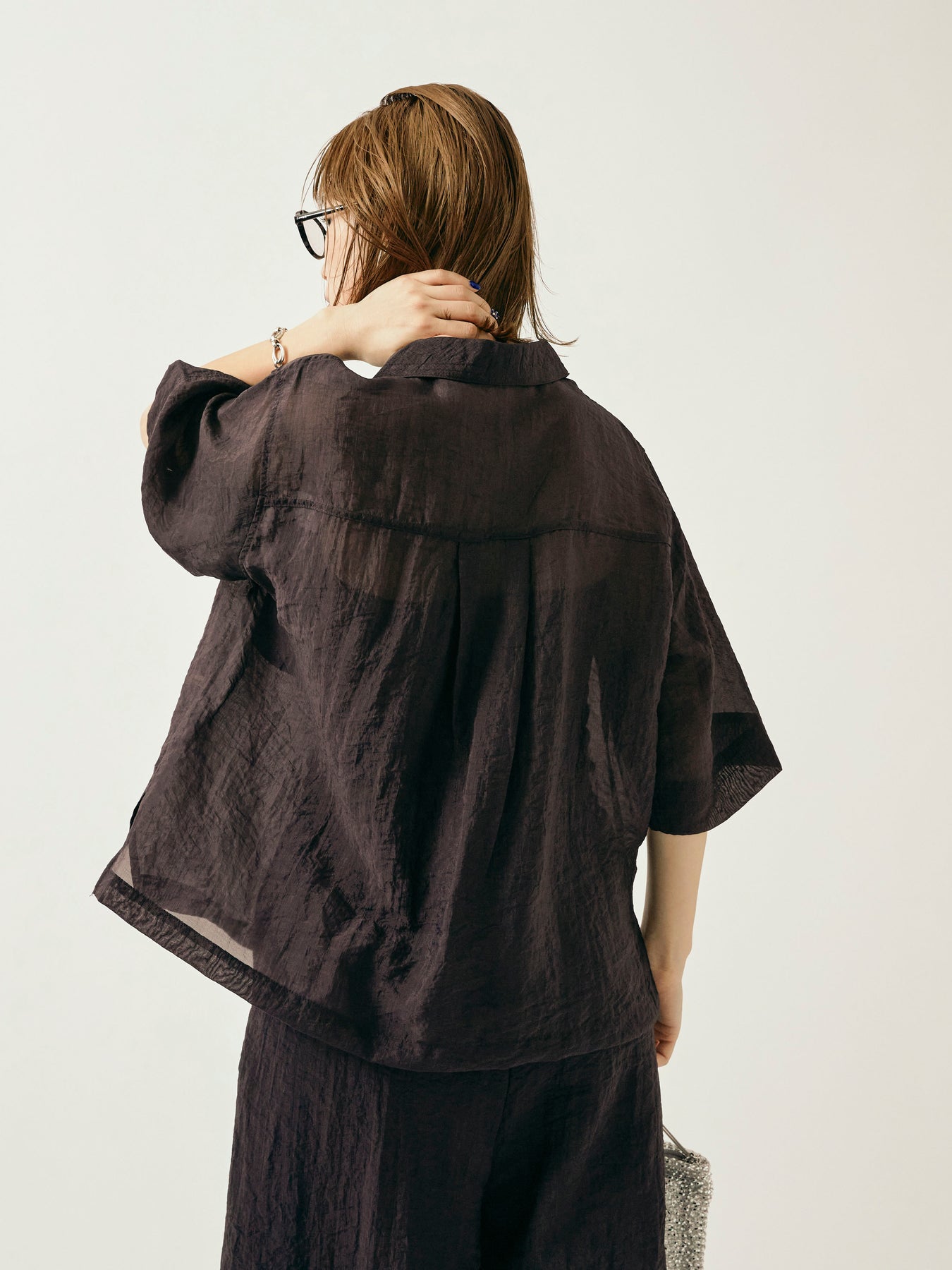 繊細な透け感と光沢が魅力のシャイニースラブ素材を使用した開襟ハーフシャツ。 ほんのりシアーな質感が、軽やかで涼しげな印象を与えてくれます。 ドロップショルダーとややワイドなシルエットで、ラフさと抜け感を演出。 タンクトップやキャミソールとのレイヤードはもちろん、羽織りとしても活躍します。 シンプルながらも洗練された大人のリラックススタイルにぴったりな1着です。 ※ボトムス、キャミソール(インナー)以外の商品は一律でインナーは付属していません。