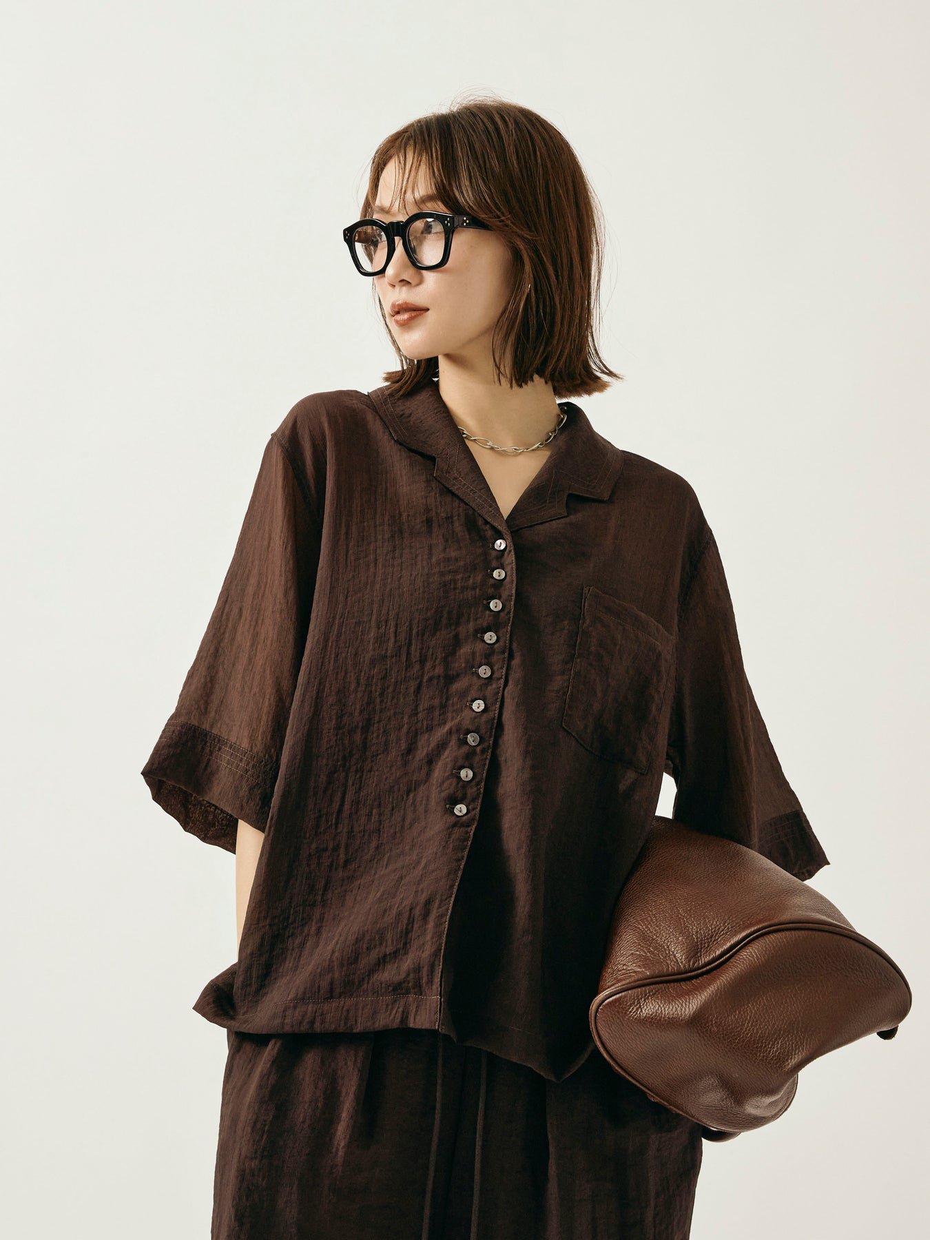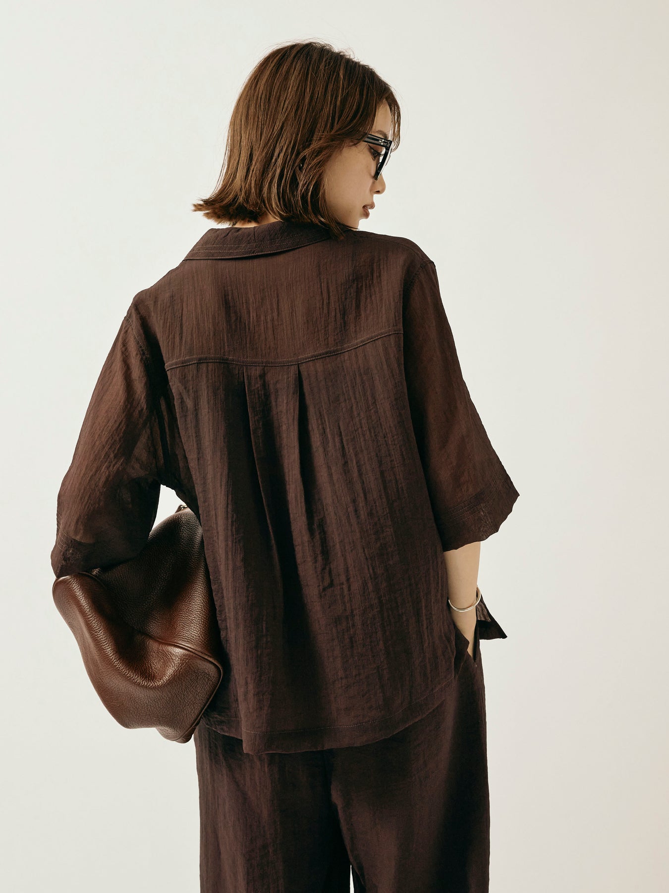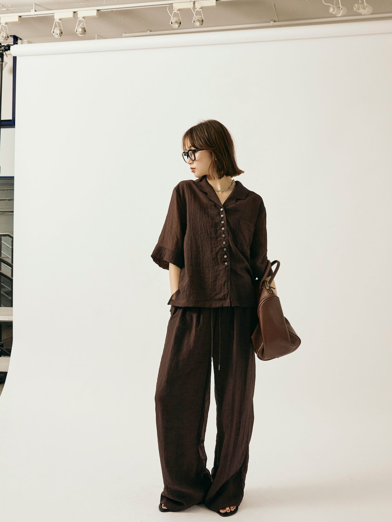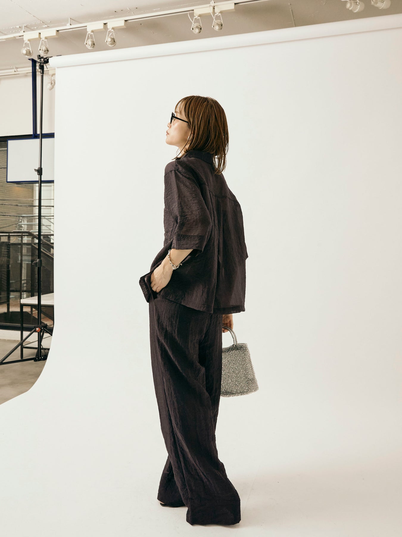 【Allure】[SET]シャイニースラブシアー開襟ハーフシャツ+シャイニースラブシアーワイドパンツ(2set)